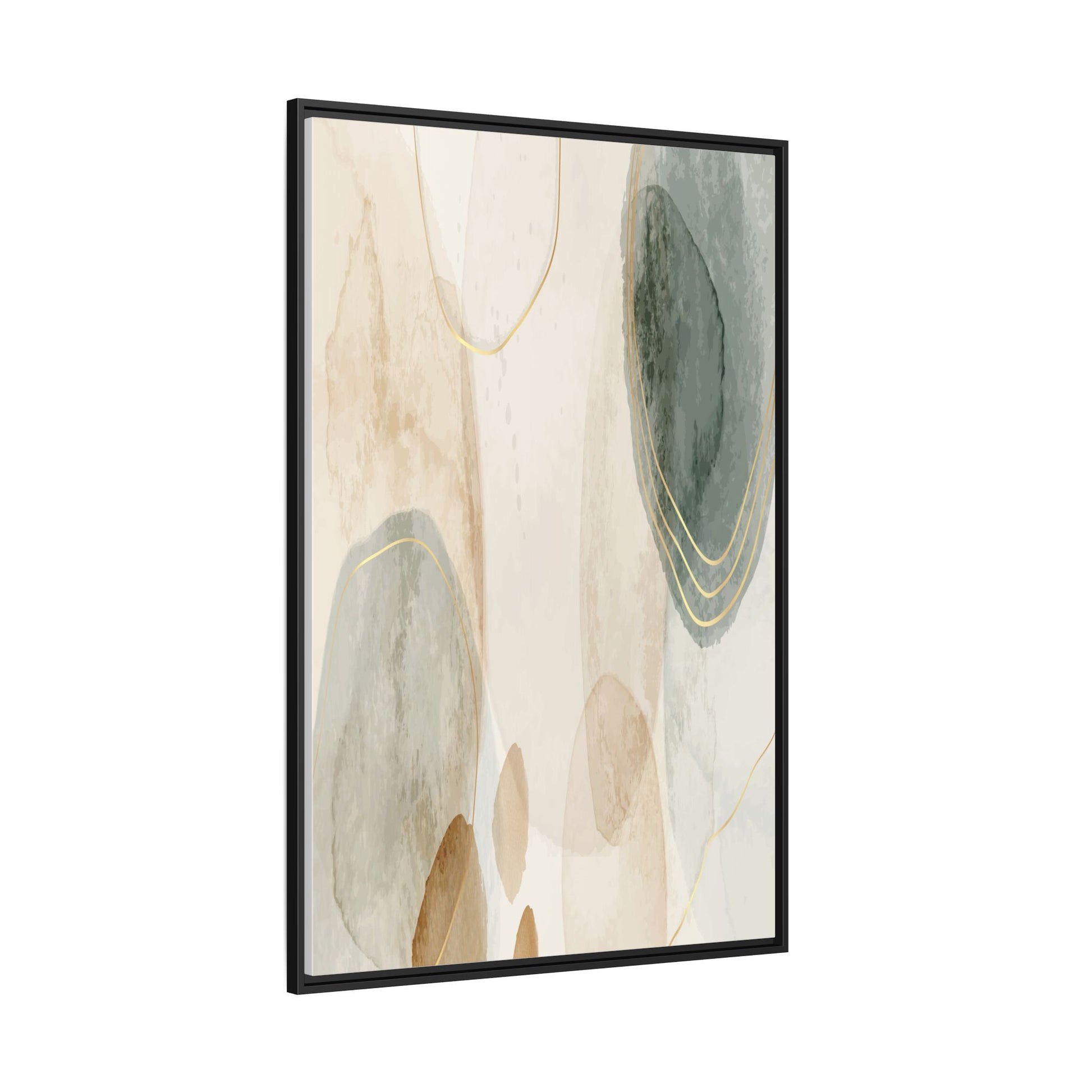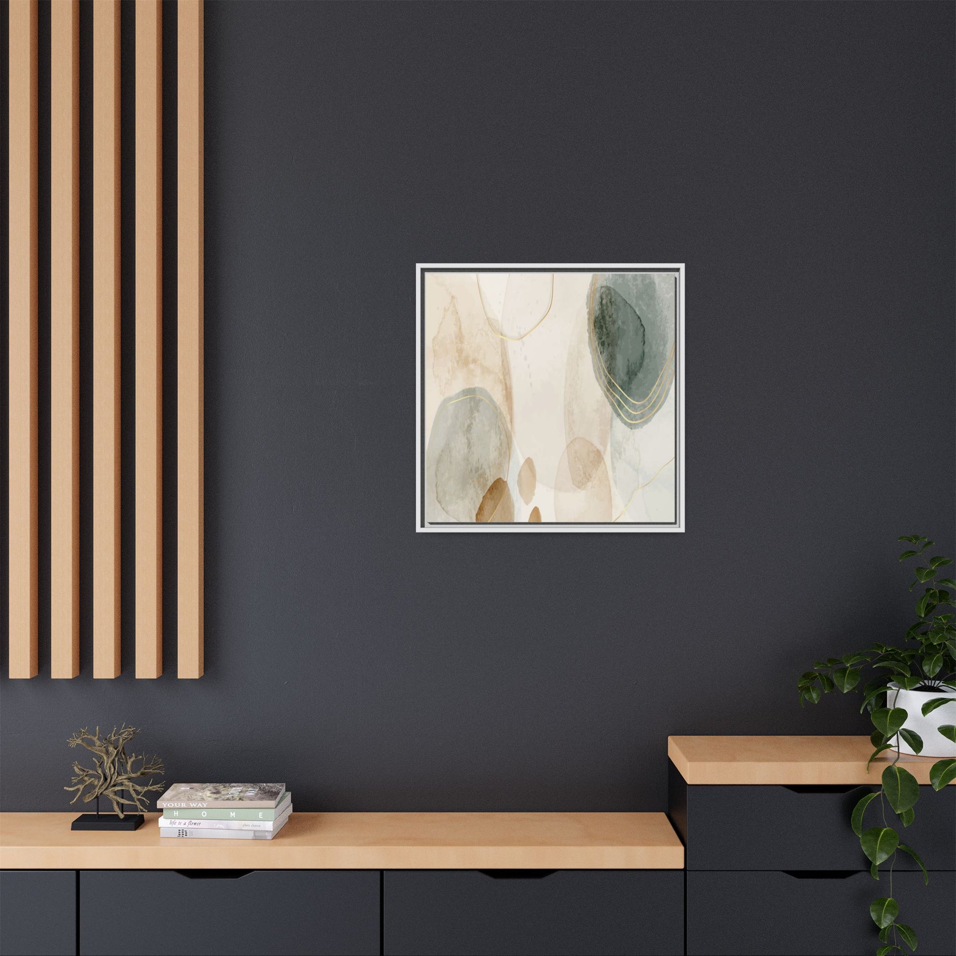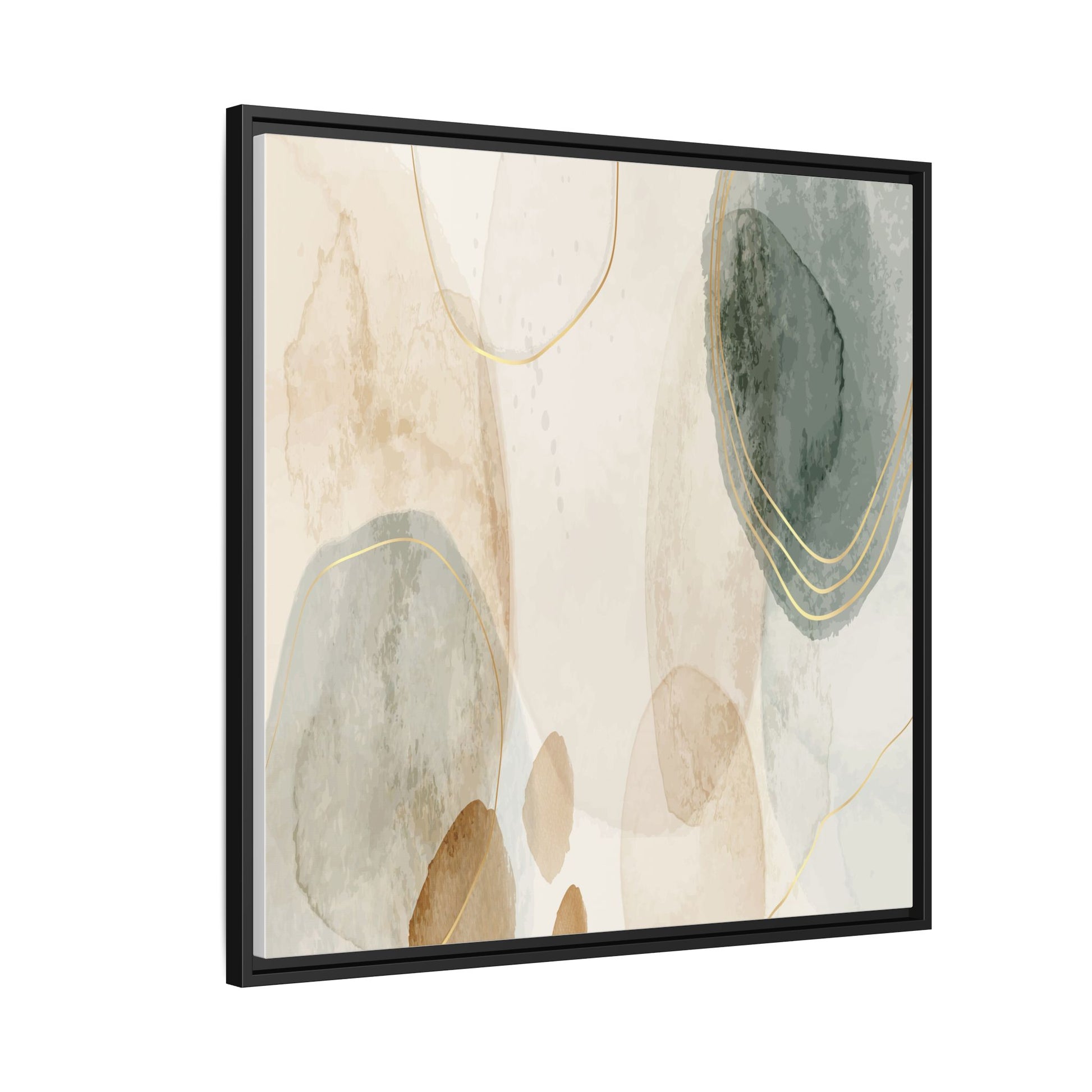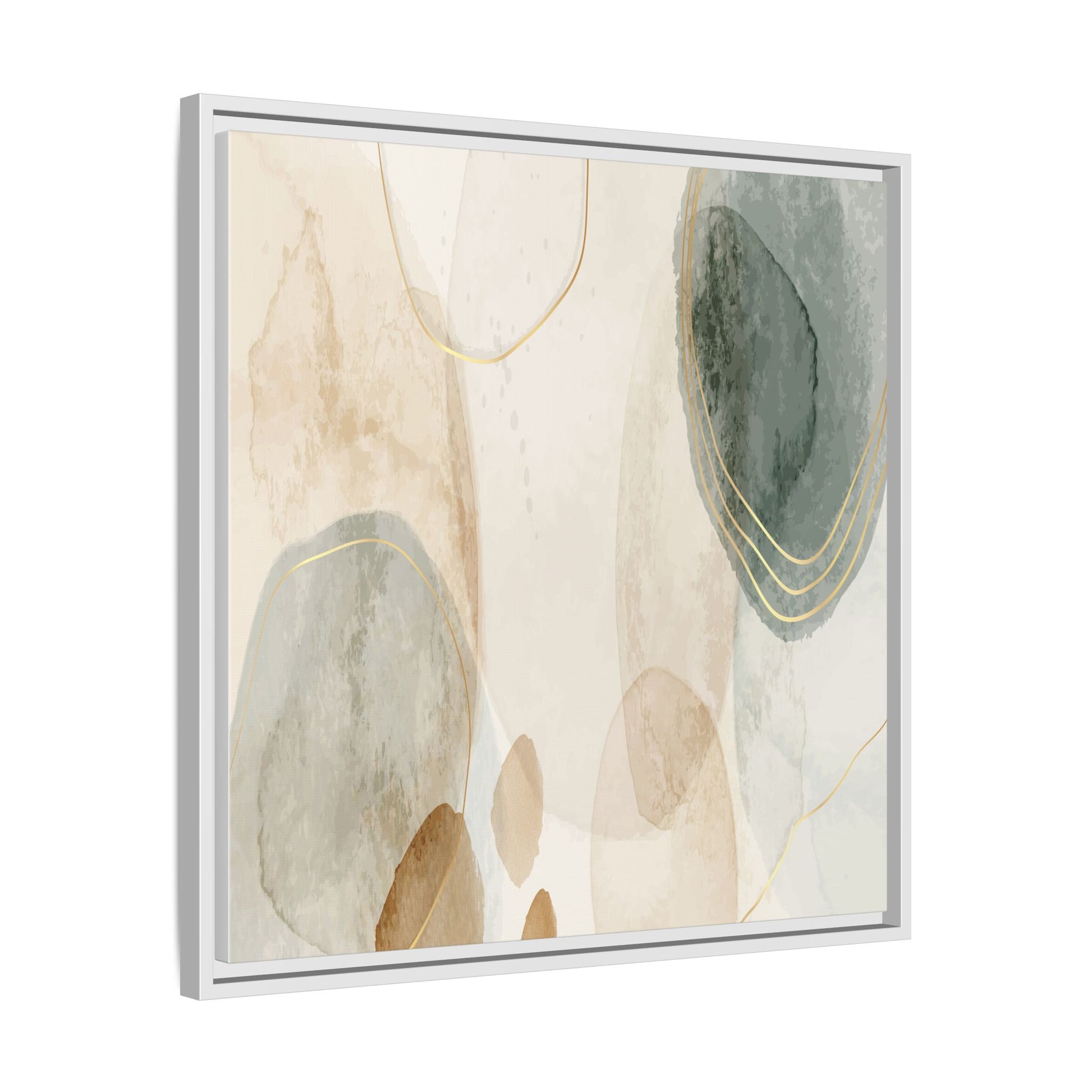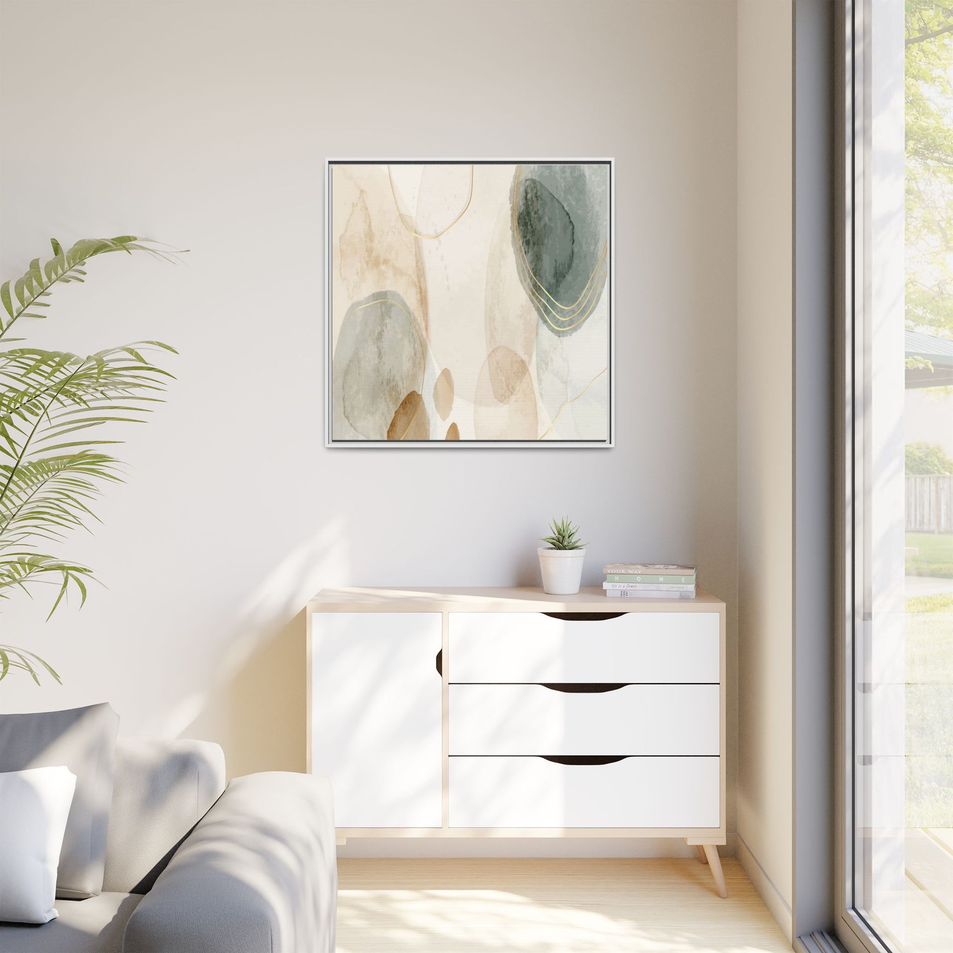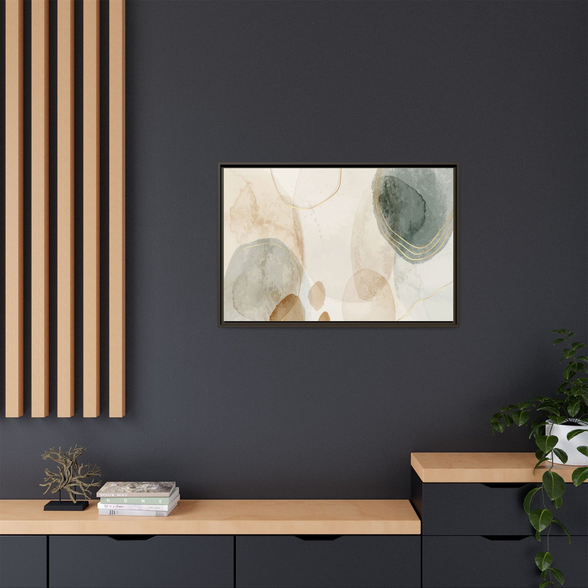 This abstract watercolor artwork features a soft, ethereal composition of organic shapes in muted tones of beige, green, and gray. Delicate golden lines weave through the image, creating elegant connections between translucent, stone-like forms that appear to float on a light background. The watercolor technique lends a dreamy, textured quality to each shape, with gentle gradients and subtle variations in color that evoke a sense of natural landscape or mineral formations. Circular and oval shapes of varying sizes are arranged in a balanced, asymmetrical layout, suggesting a modern and minimalist aesthetic. The color palette and fluid design create a sense of calm and sophistication, making this piece ideal for contemporary interior design and abstract art collections.
