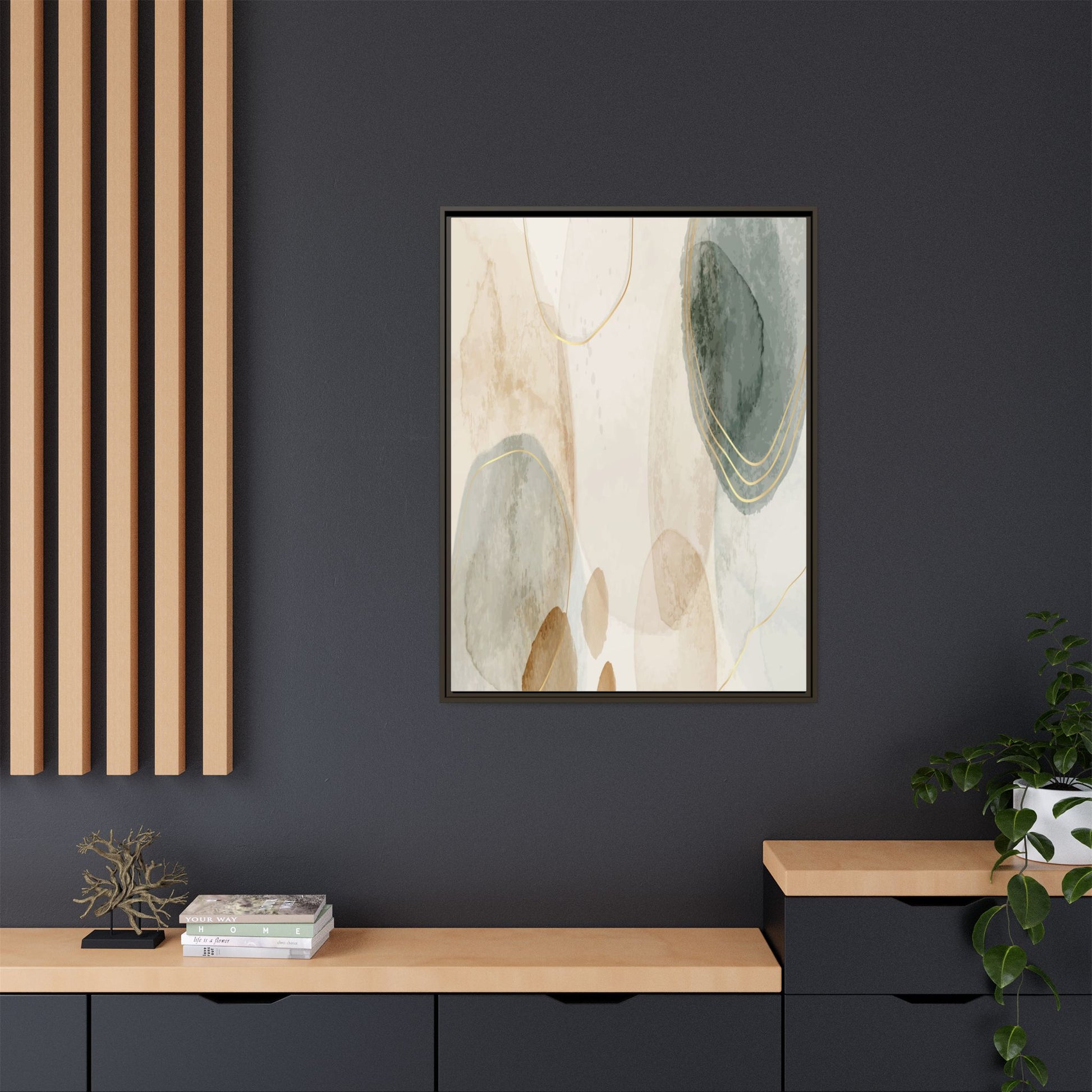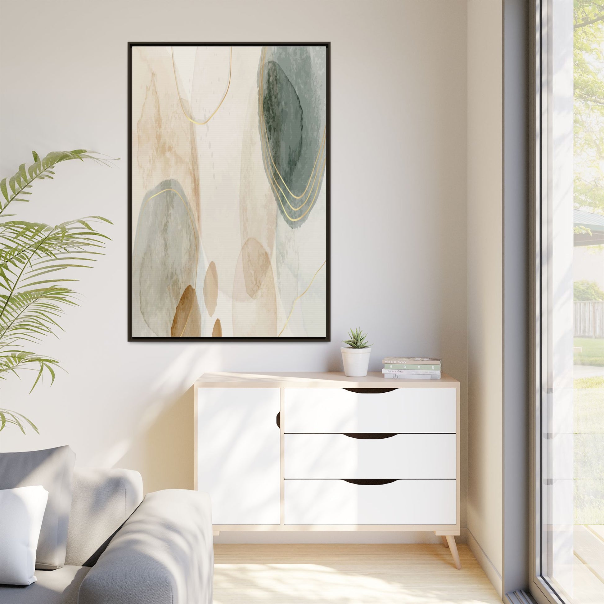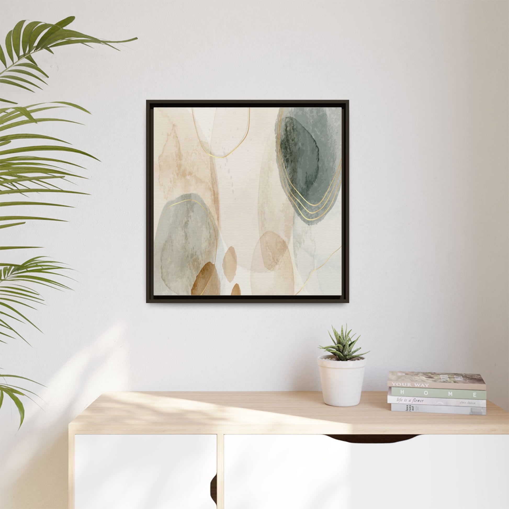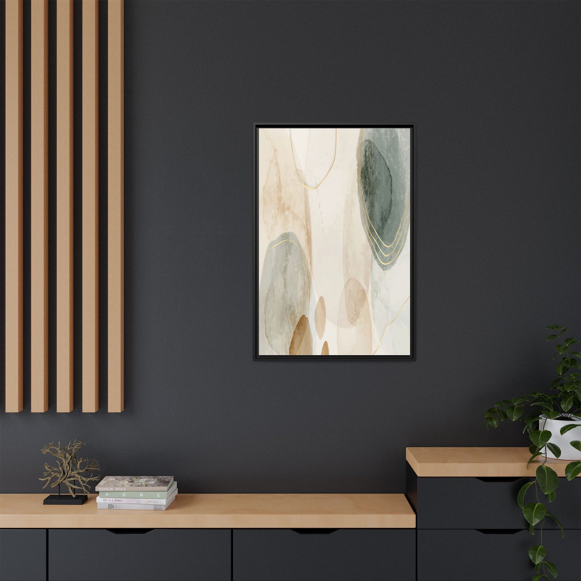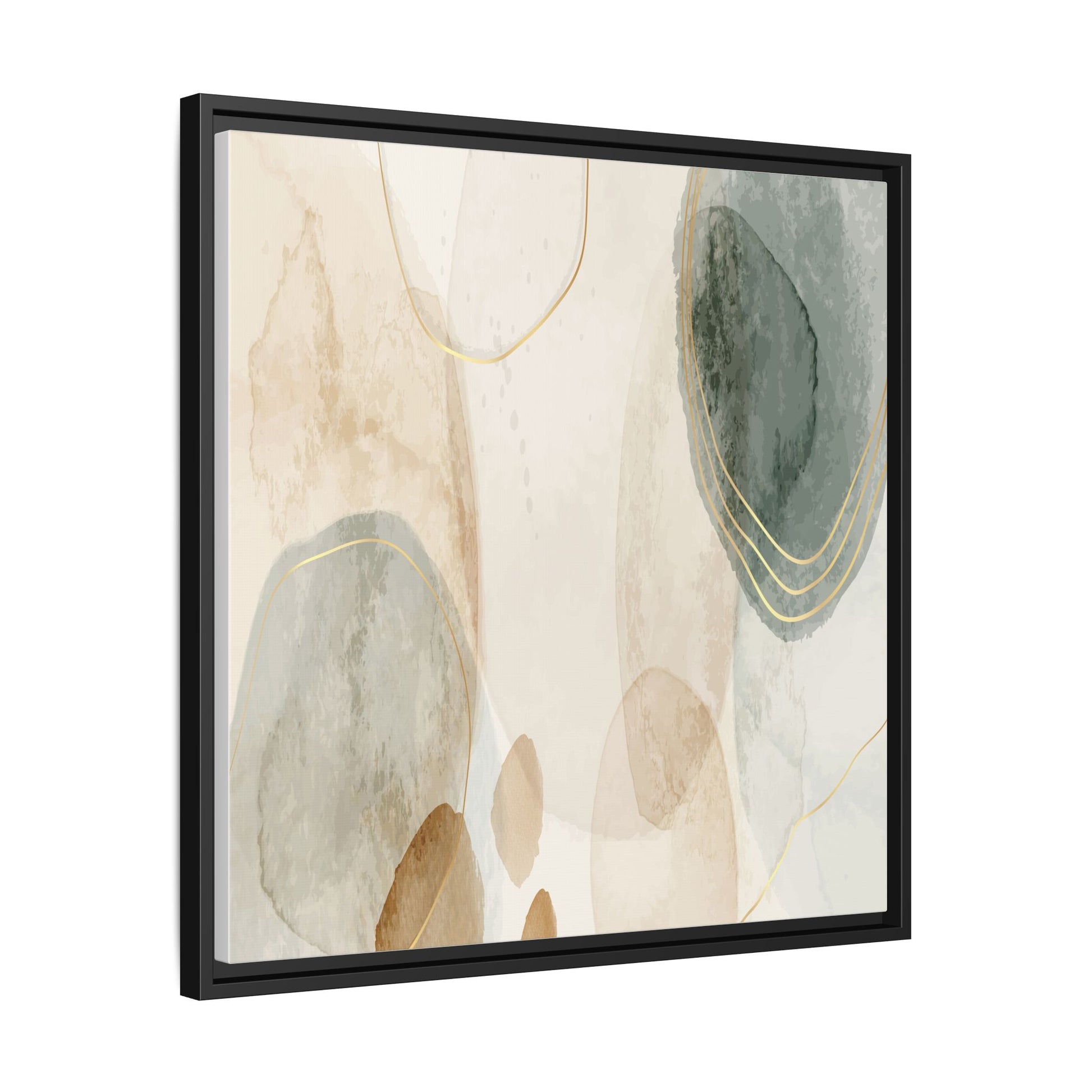This abstract watercolor artwork features a soft, ethereal composition of organic shapes in muted tones of beige, green, and gray. Delicate golden lines weave through the image, creating elegant connections between translucent, stone-like forms that appear to float on a light background. The watercolor technique lends a dreamy, textured quality to each shape, with gentle gradients and subtle variations in color that evoke a sense of natural landscape or mineral formations. Circular and oval shapes of varying sizes are arranged in a balanced, asymmetrical layout, suggesting a modern and minimalist aesthetic. The color palette and fluid design create a sense of calm and sophistication, making this piece ideal for contemporary interior design and abstract art collections.