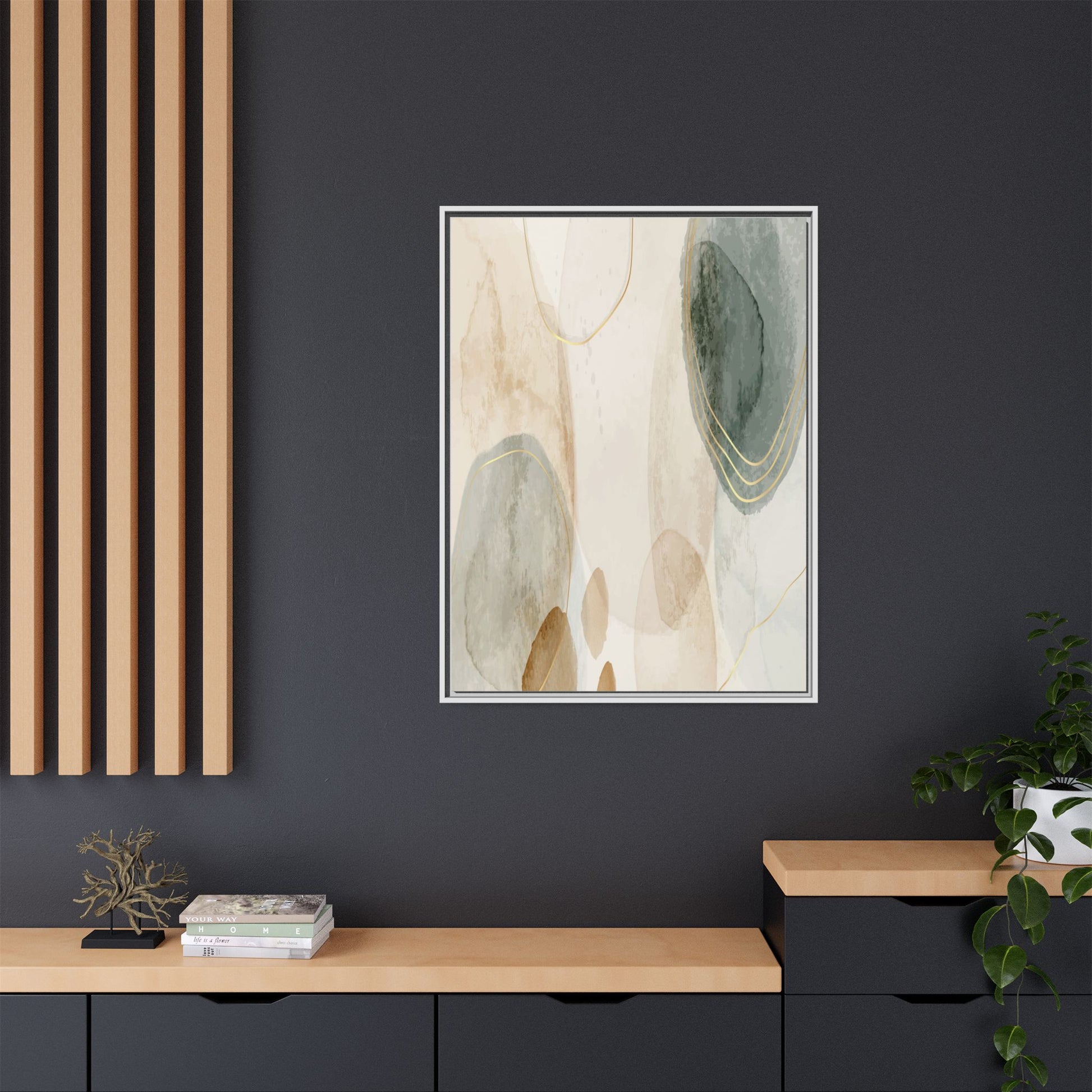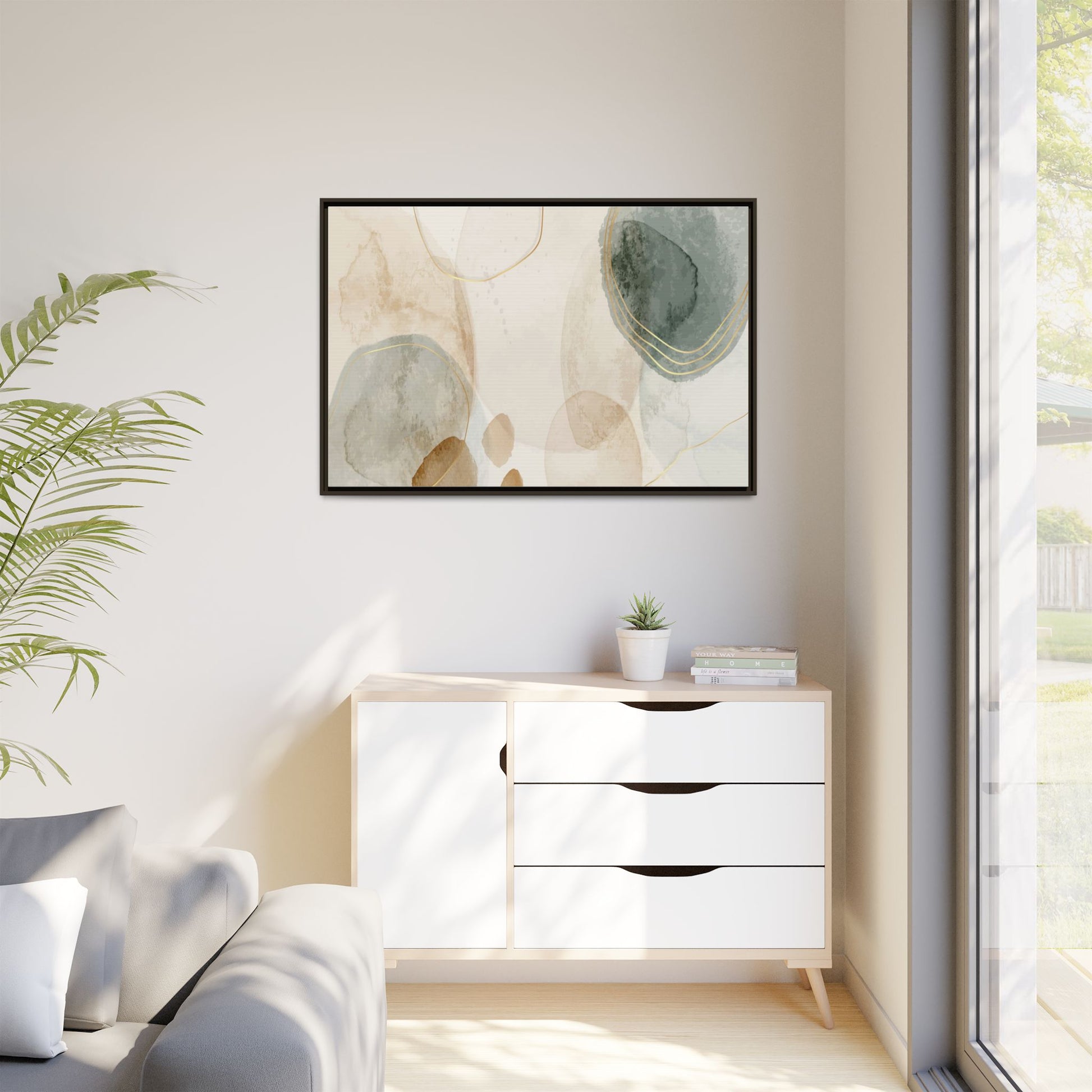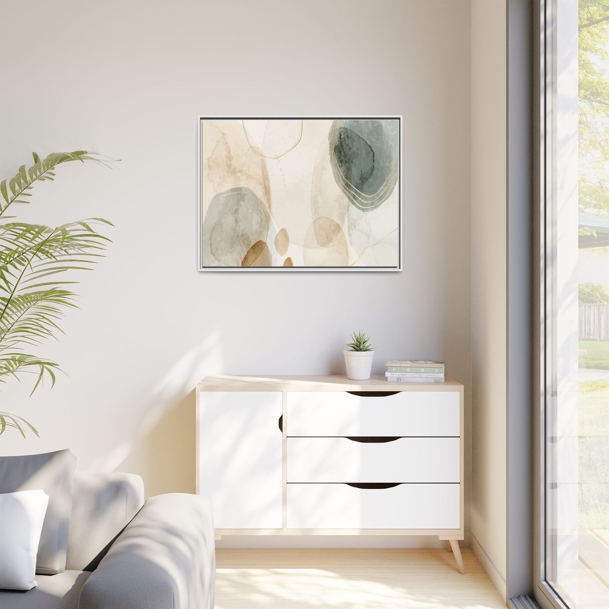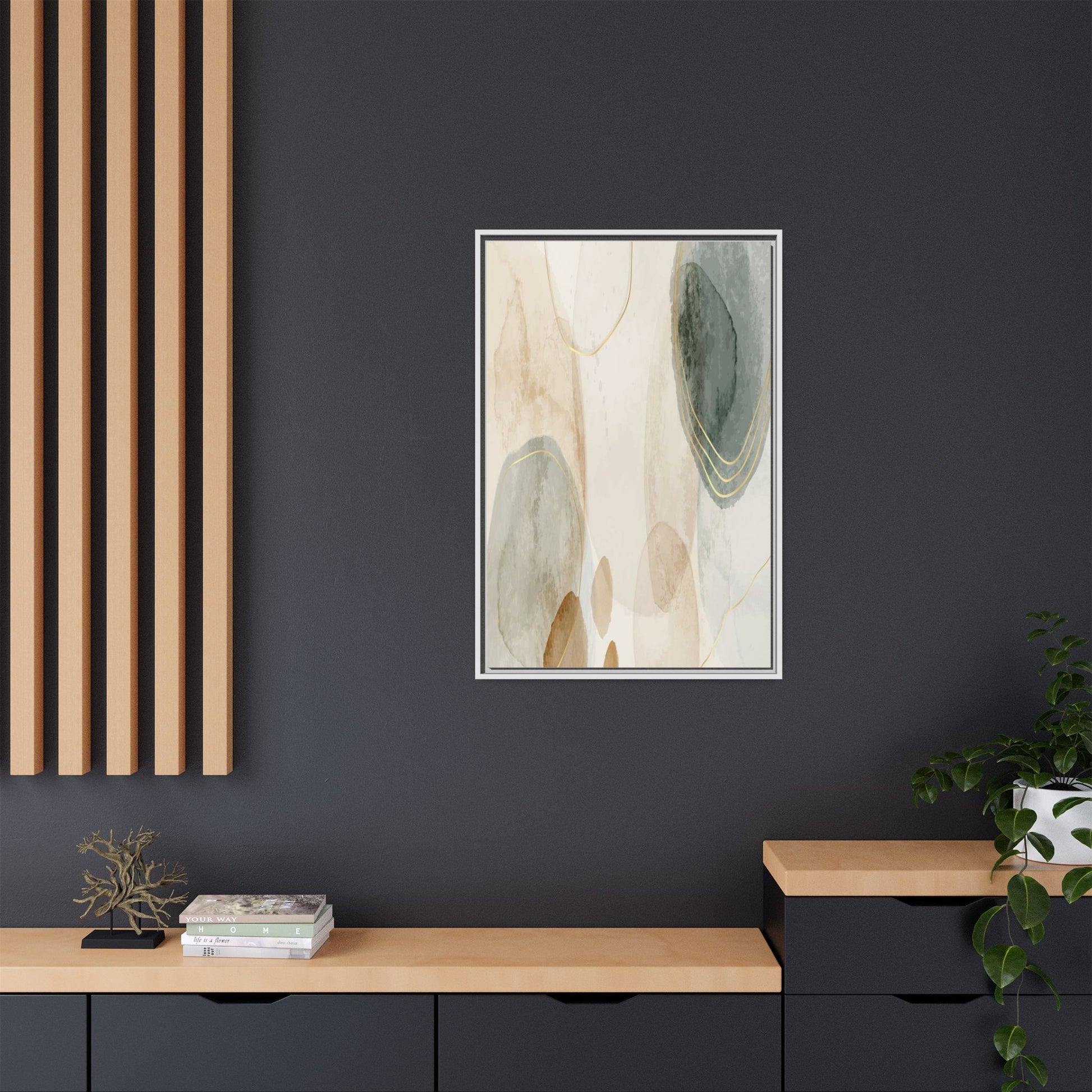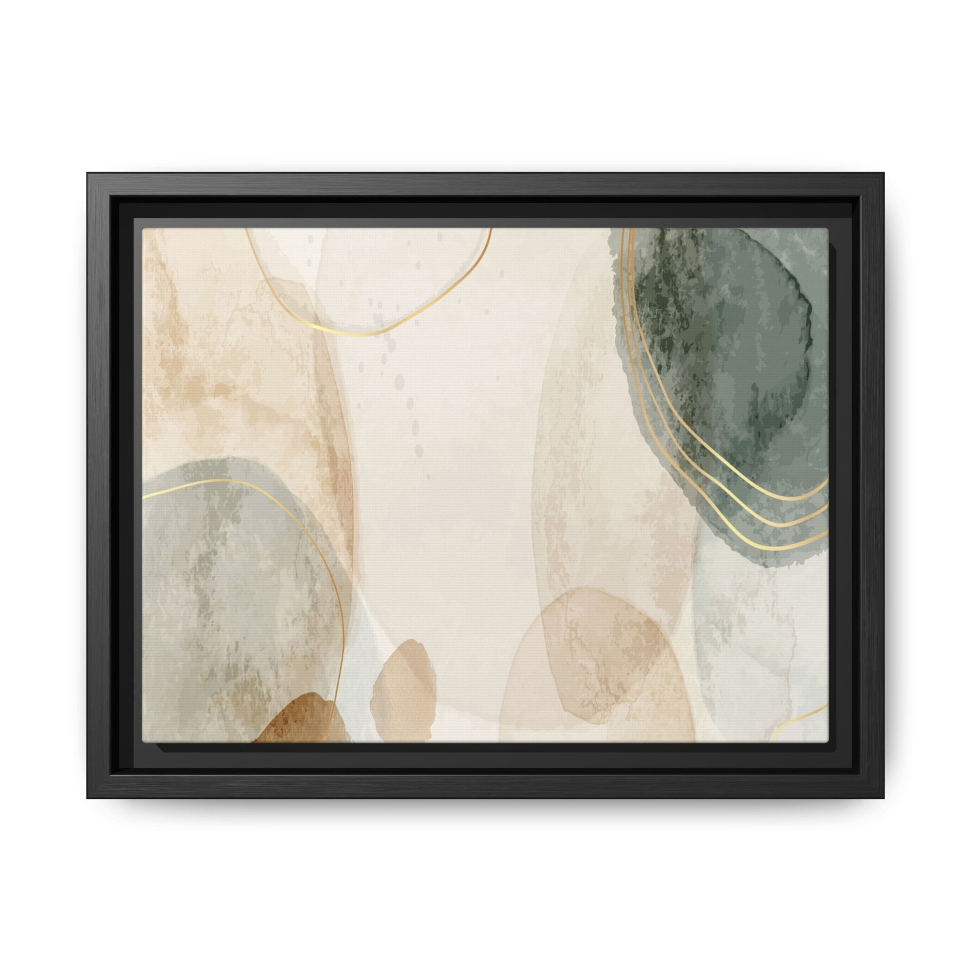This abstract watercolor artwork features a soft, ethereal composition of organic shapes in muted tones of beige, green, and gray. Delicate golden lines weave through the image, creating elegant connections between translucent, stone-like forms that appear to float on a light background. The watercolor technique lends a dreamy, textured quality to each shape, with gentle gradients and subtle variations in color that evoke a sense of natural landscape or mineral formations. Circular and oval shapes of varying sizes are arranged in a balanced, asymmetrical layout, suggesting a modern and minimalist aesthetic. The color palette and fluid design create a sense of calm and sophistication, making this piece ideal for contemporary interior design and abstract art collections.