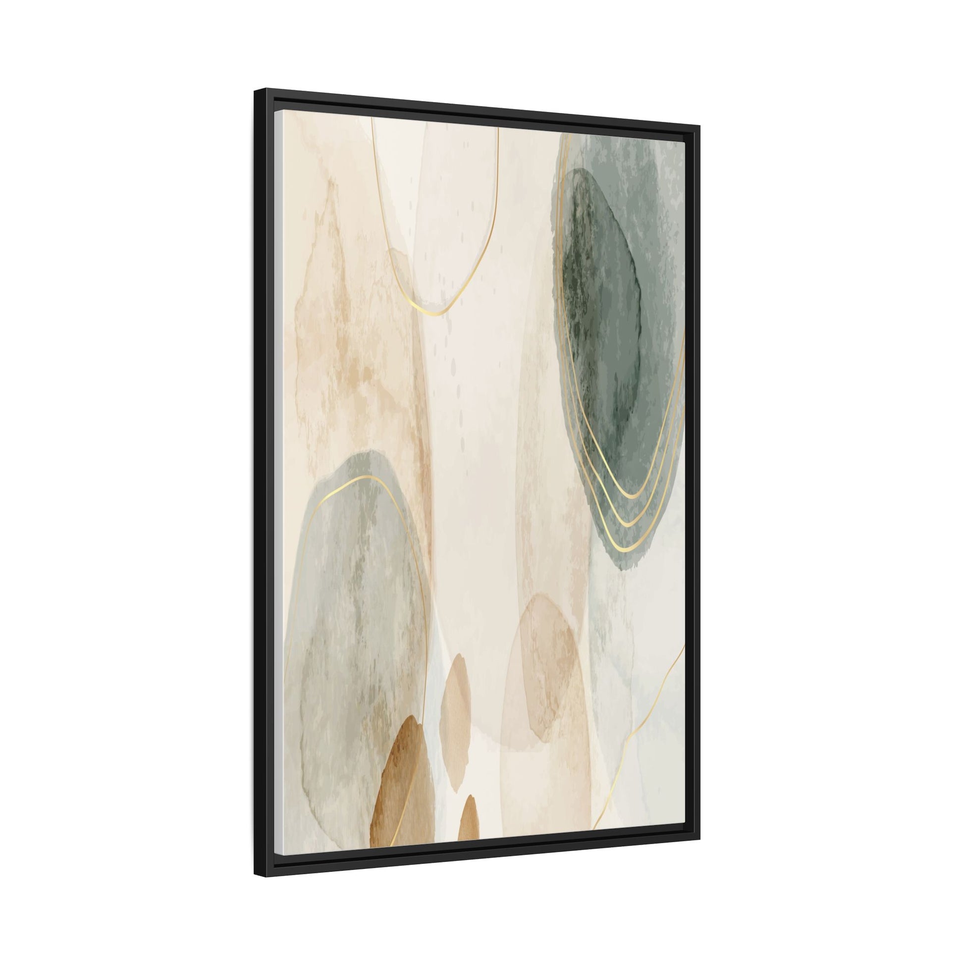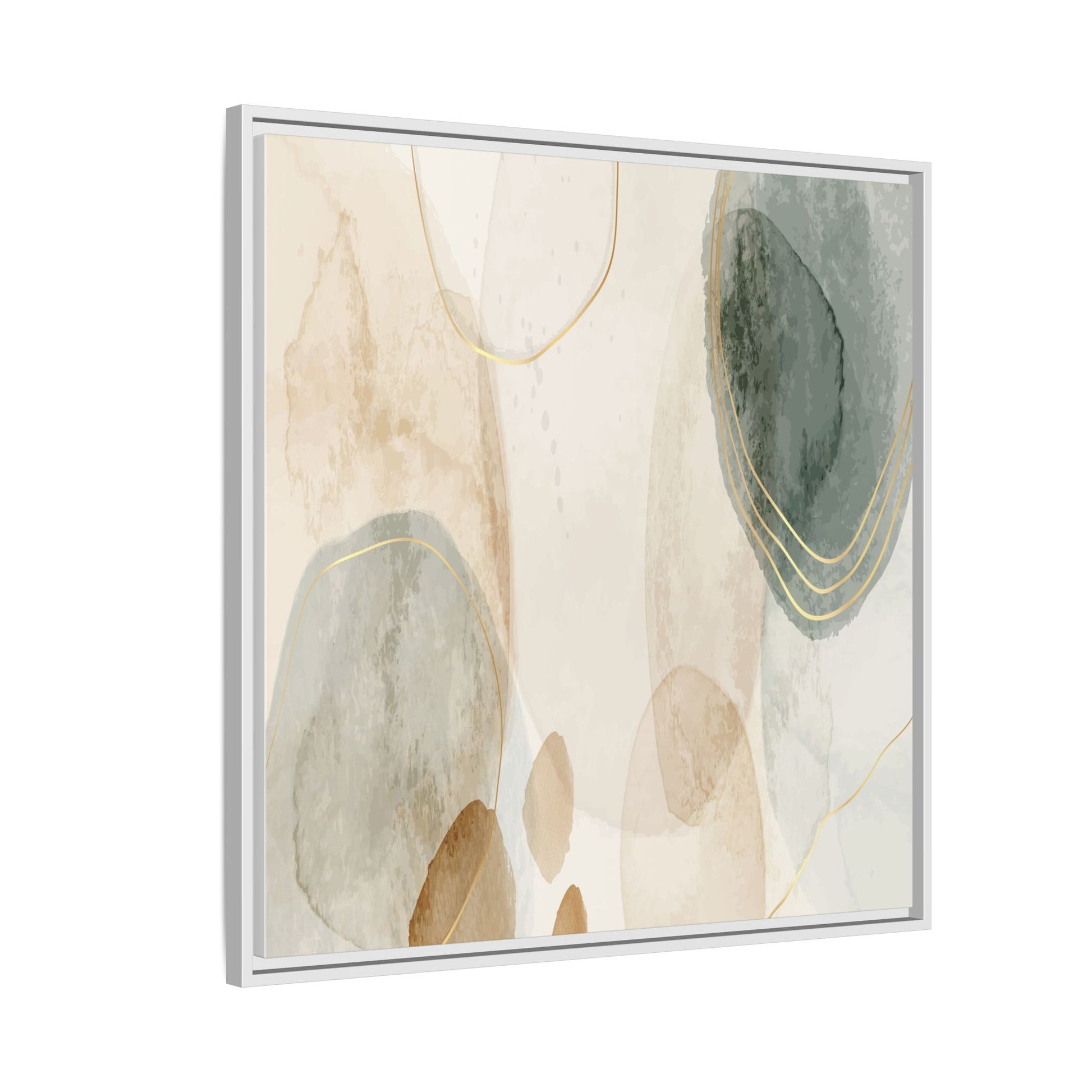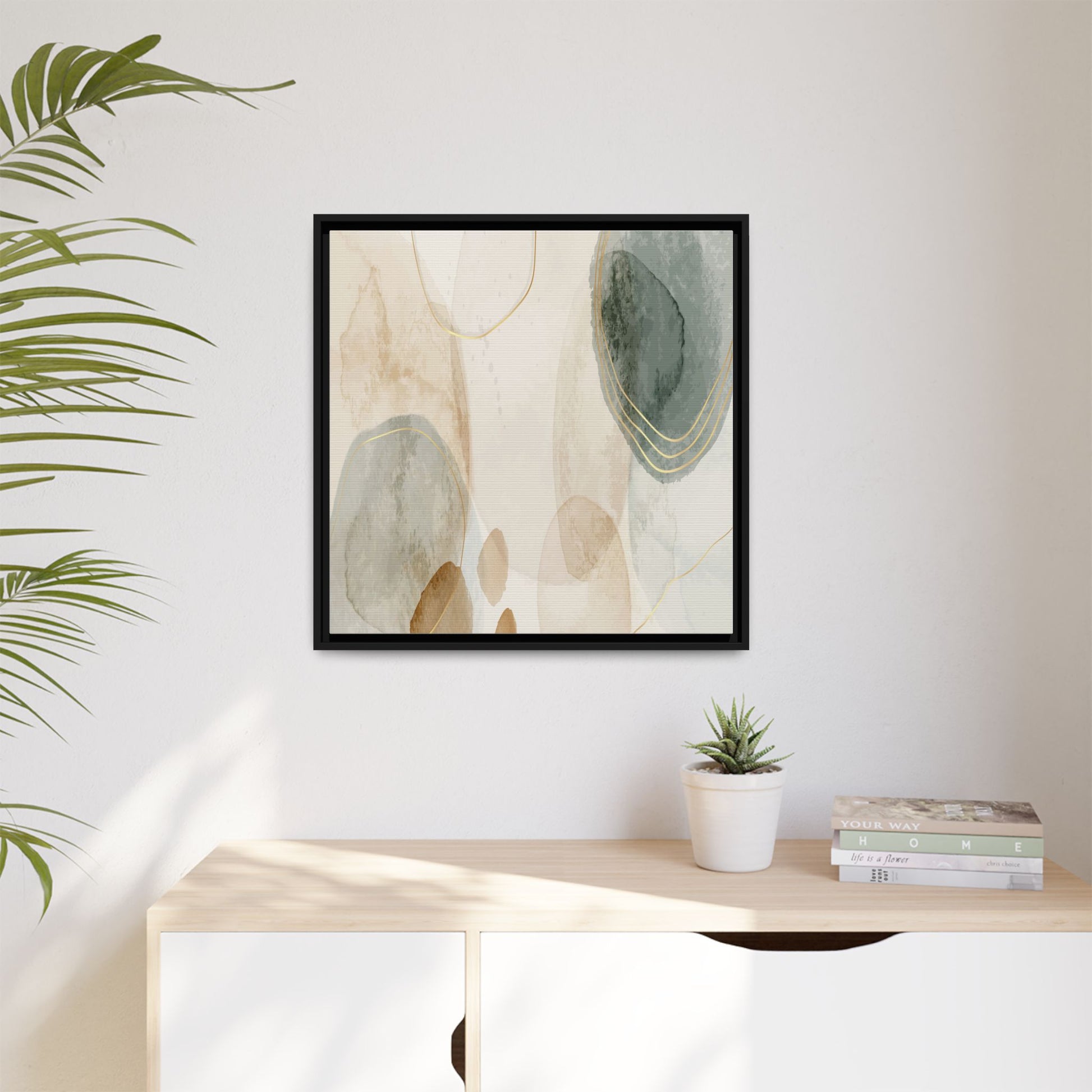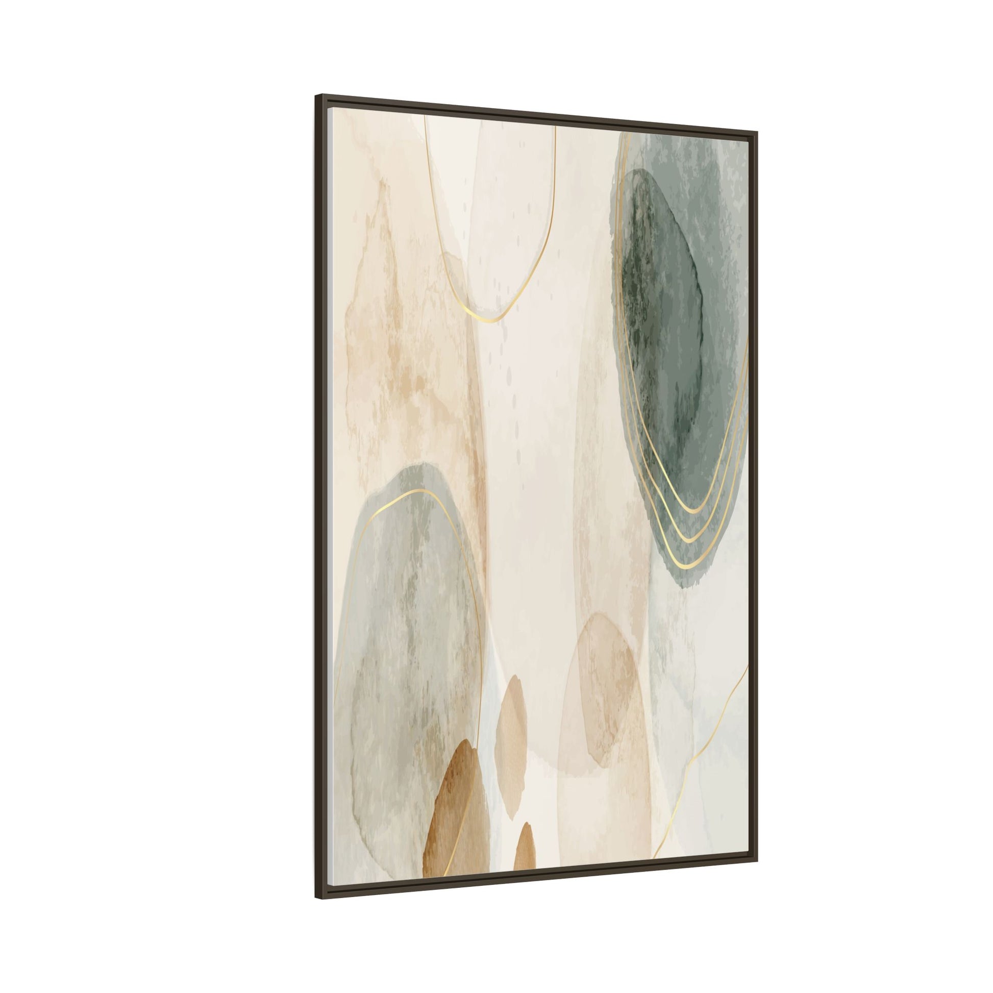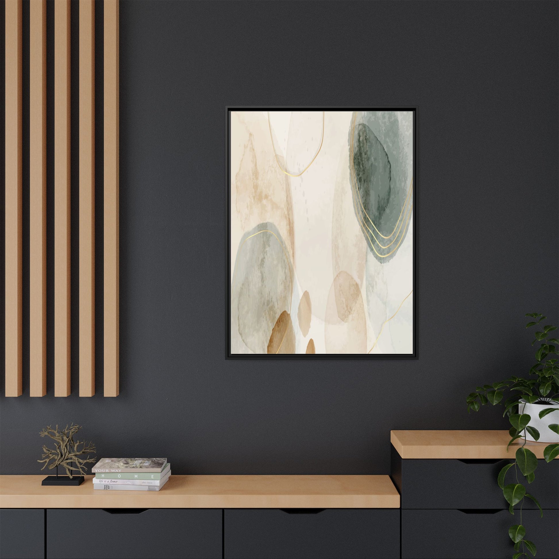 This abstract watercolor artwork features a soft, ethereal composition of organic shapes in muted tones of beige, green, and gray. Delicate golden lines weave through the image, creating elegant connections between translucent, stone-like forms that appear to float on a light background. The watercolor technique lends a dreamy, textured quality to each shape, with gentle gradients and subtle variations in color that evoke a sense of natural landscape or mineral formations. Circular and oval shapes of varying sizes are arranged in a balanced, asymmetrical layout, suggesting a modern and minimalist aesthetic. The color palette and fluid design create a sense of calm and sophistication, making this piece ideal for contemporary interior design and abstract art collections.