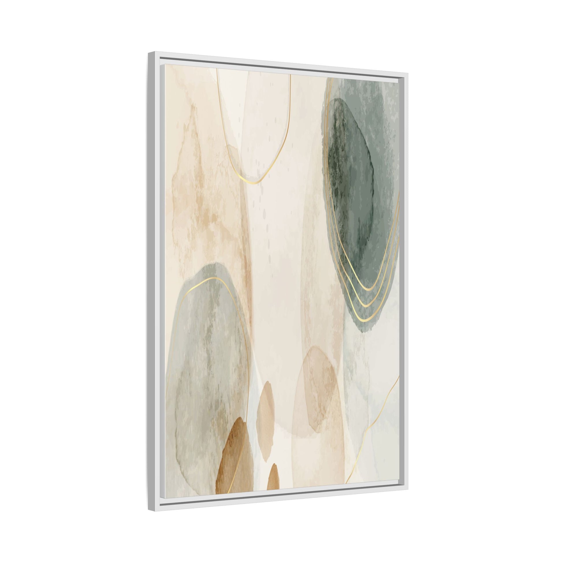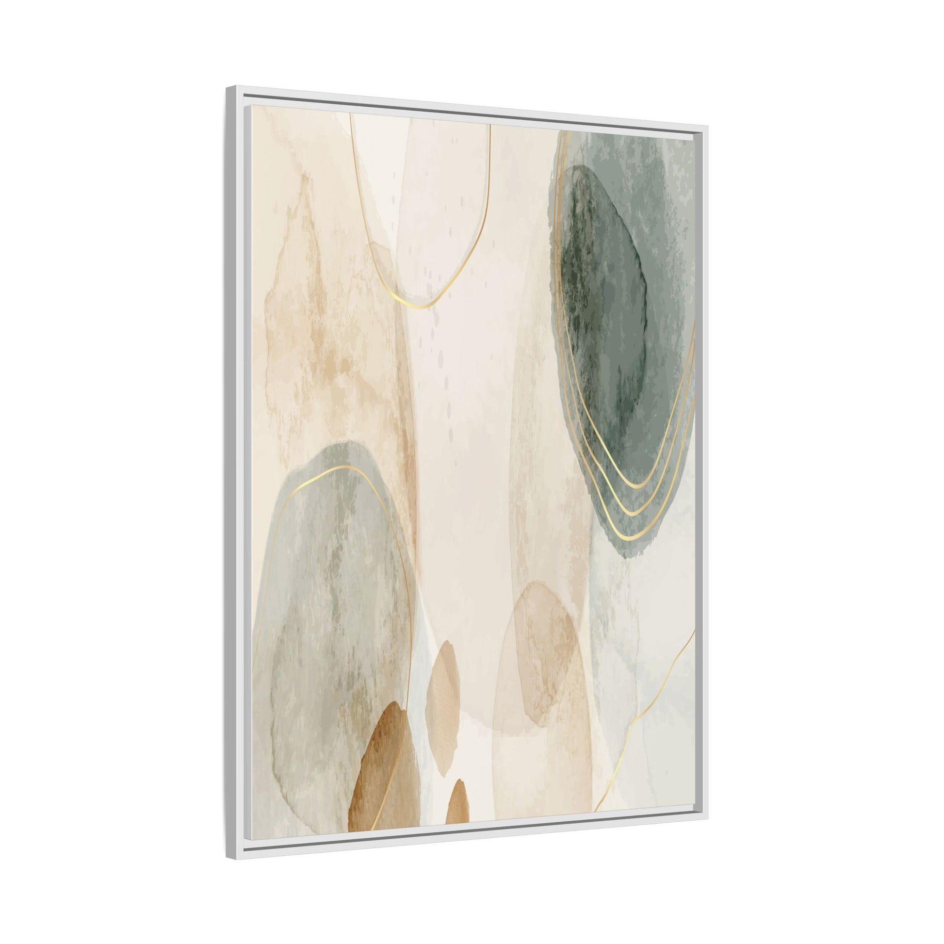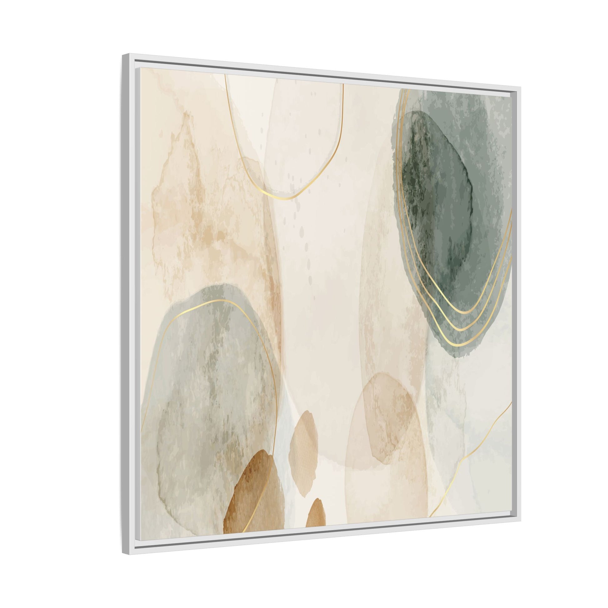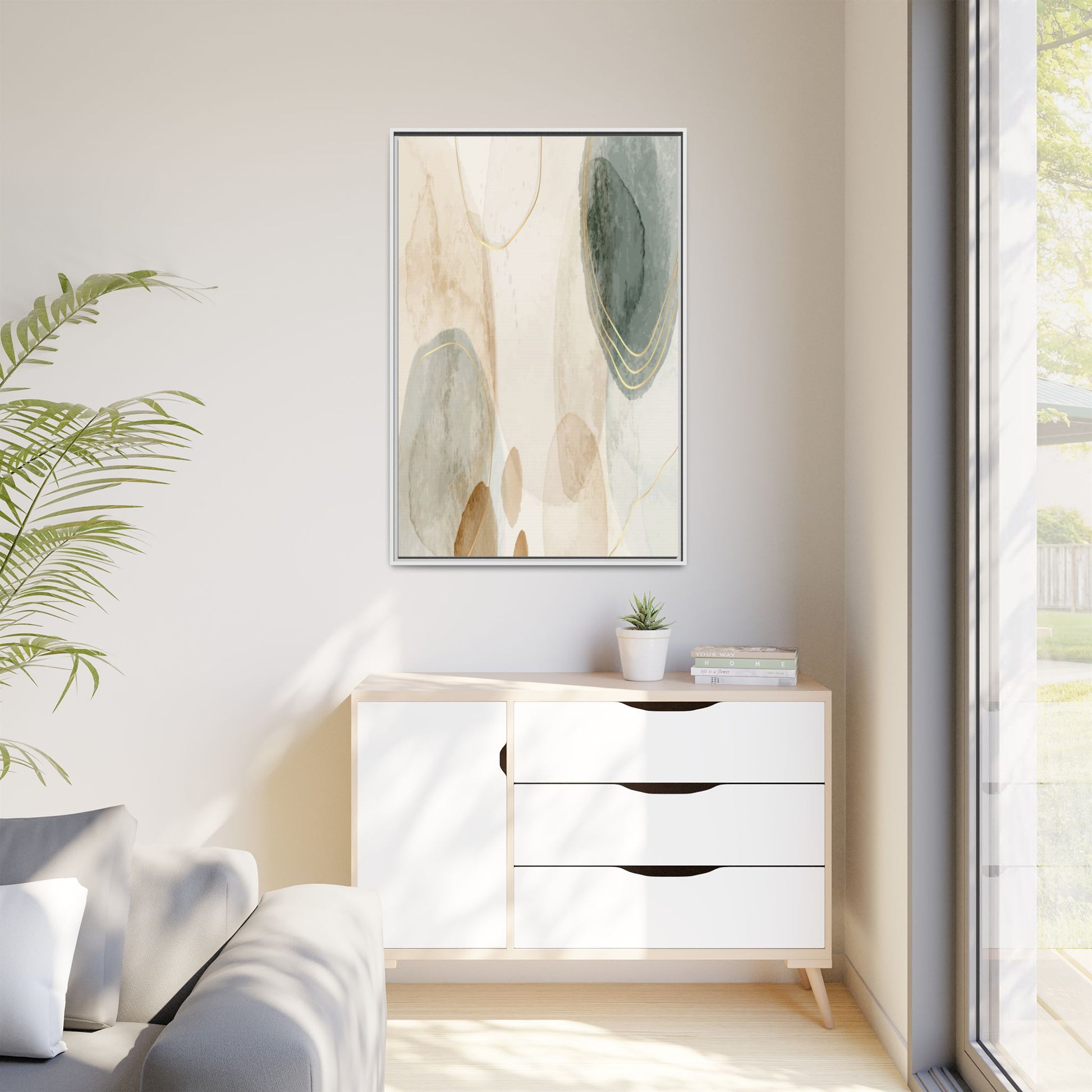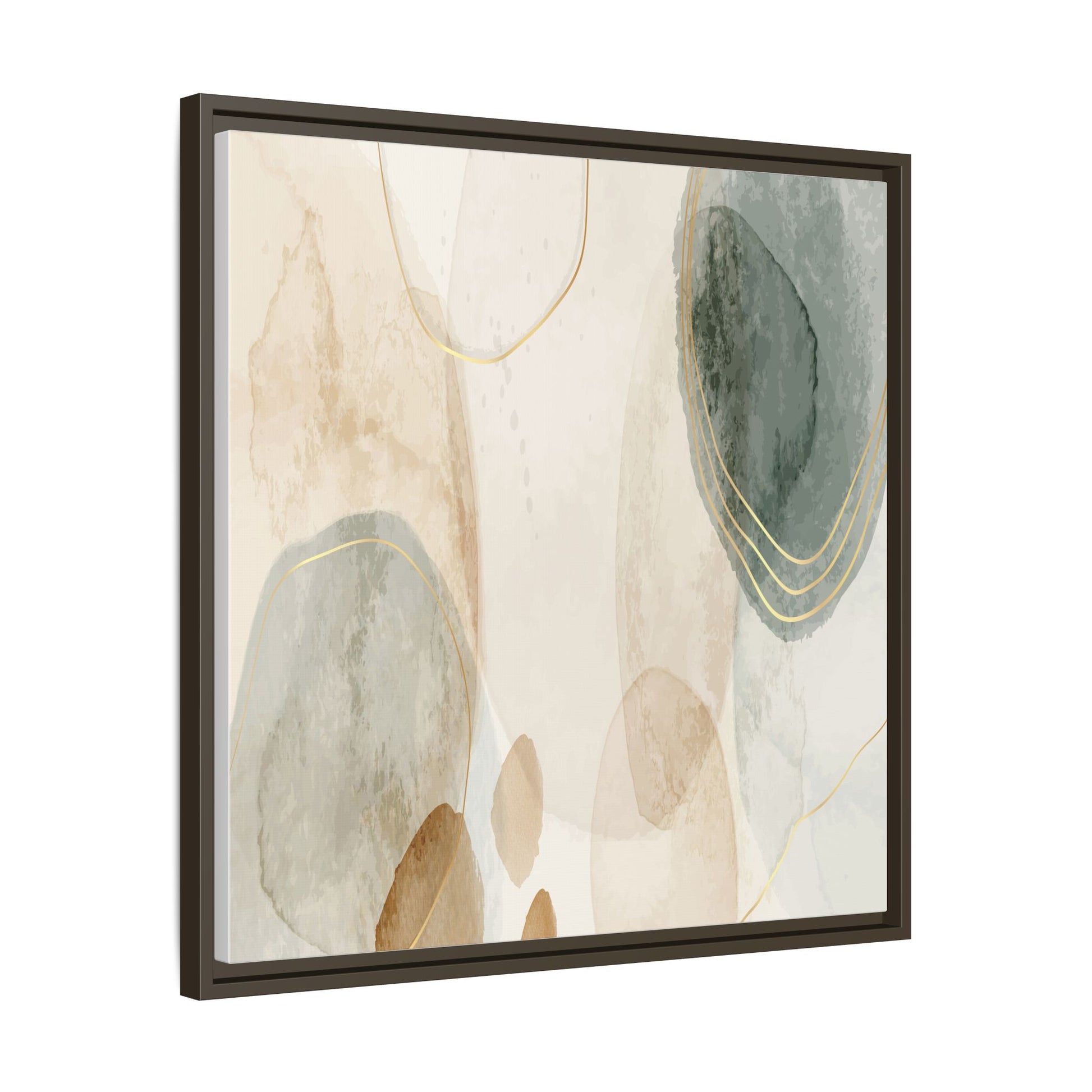This abstract watercolor artwork features a soft, ethereal composition of organic shapes in muted tones of beige, green, and gray. Delicate golden lines weave through the image, creating elegant connections between translucent, stone-like forms that appear to float on a light background. The watercolor technique lends a dreamy, textured quality to each shape, with gentle gradients and subtle variations in color that evoke a sense of natural landscape or mineral formations. Circular and oval shapes of varying sizes are arranged in a balanced, asymmetrical layout, suggesting a modern and minimalist aesthetic. The color palette and fluid design create a sense of calm and sophistication, making this piece ideal for contemporary interior design and abstract art collections.