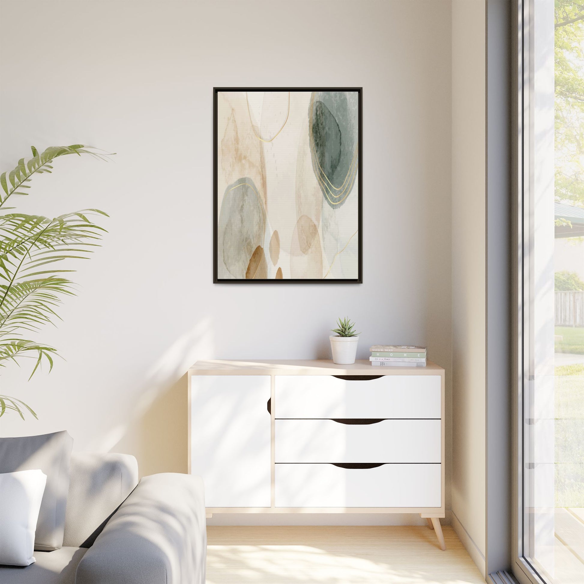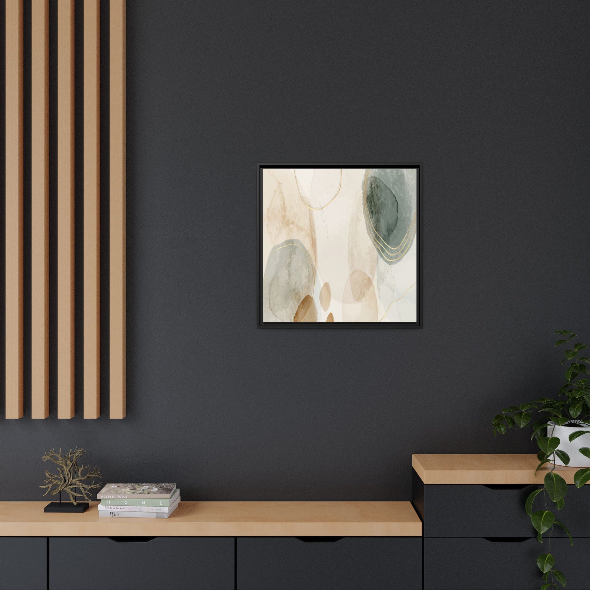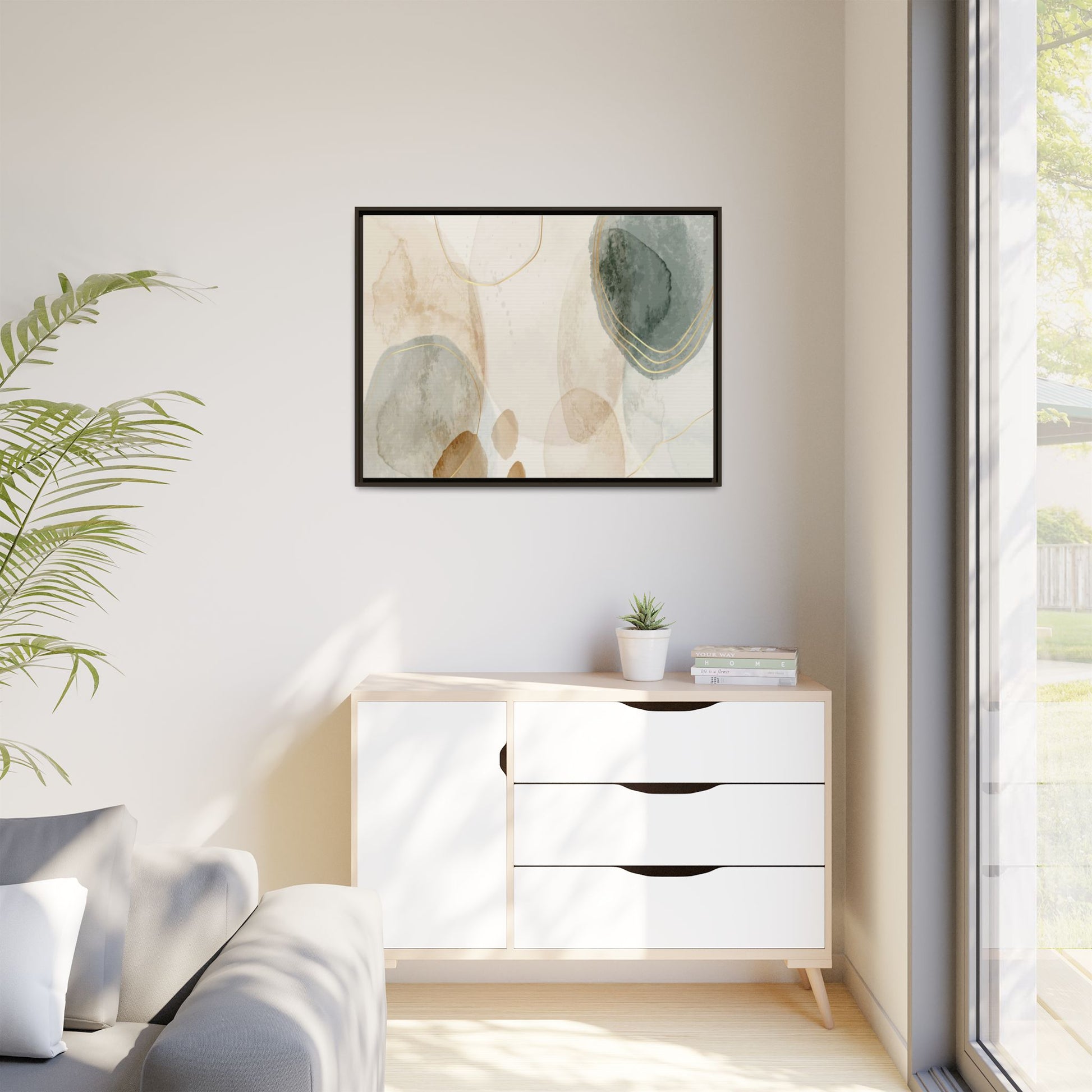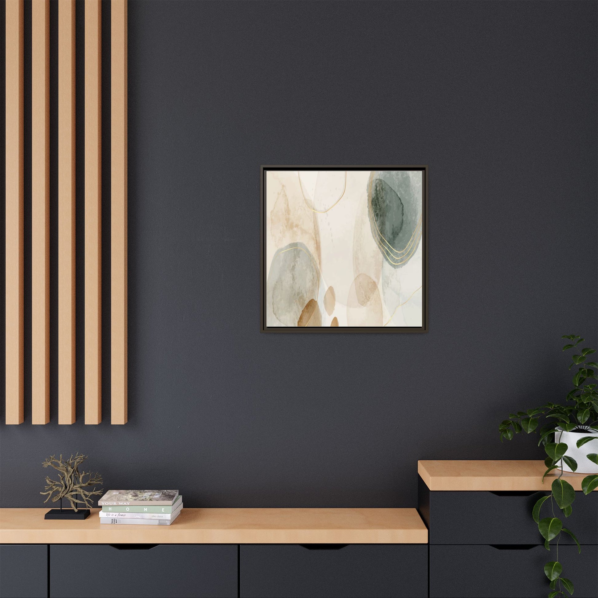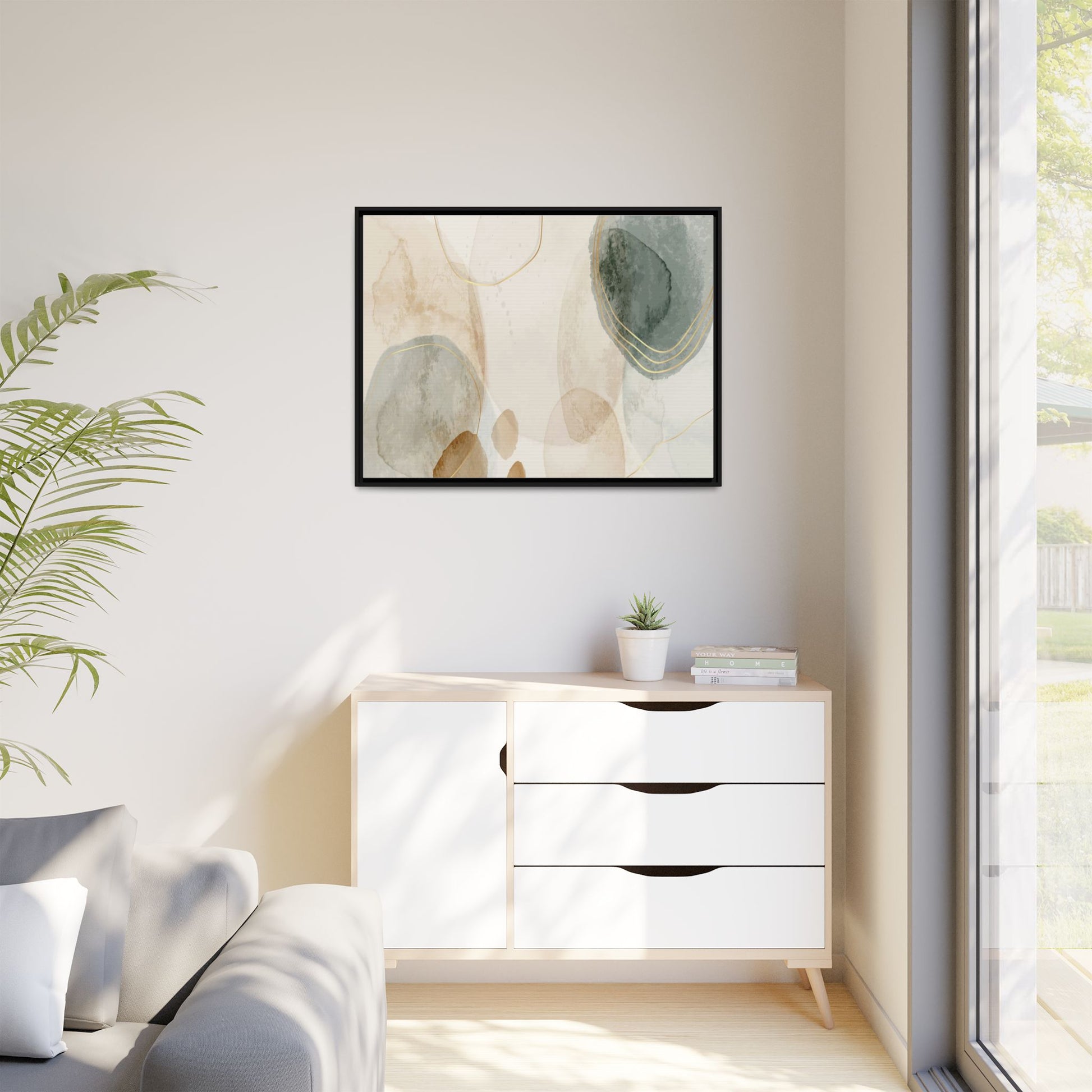 This abstract watercolor artwork features a soft, ethereal composition of organic shapes in muted tones of beige, green, and gray. Delicate golden lines weave through the image, creating elegant connections between translucent, stone-like forms that appear to float on a light background. The watercolor technique lends a dreamy, textured quality to each shape, with gentle gradients and subtle variations in color that evoke a sense of natural landscape or mineral formations. Circular and oval shapes of varying sizes are arranged in a balanced, asymmetrical layout, suggesting a modern and minimalist aesthetic. The color palette and fluid design create a sense of calm and sophistication, making this piece ideal for contemporary interior design and abstract art collections.