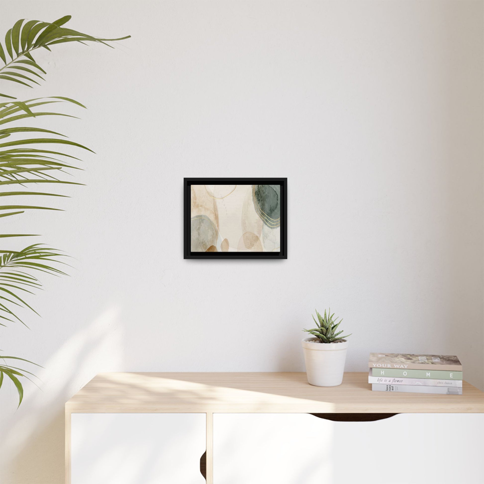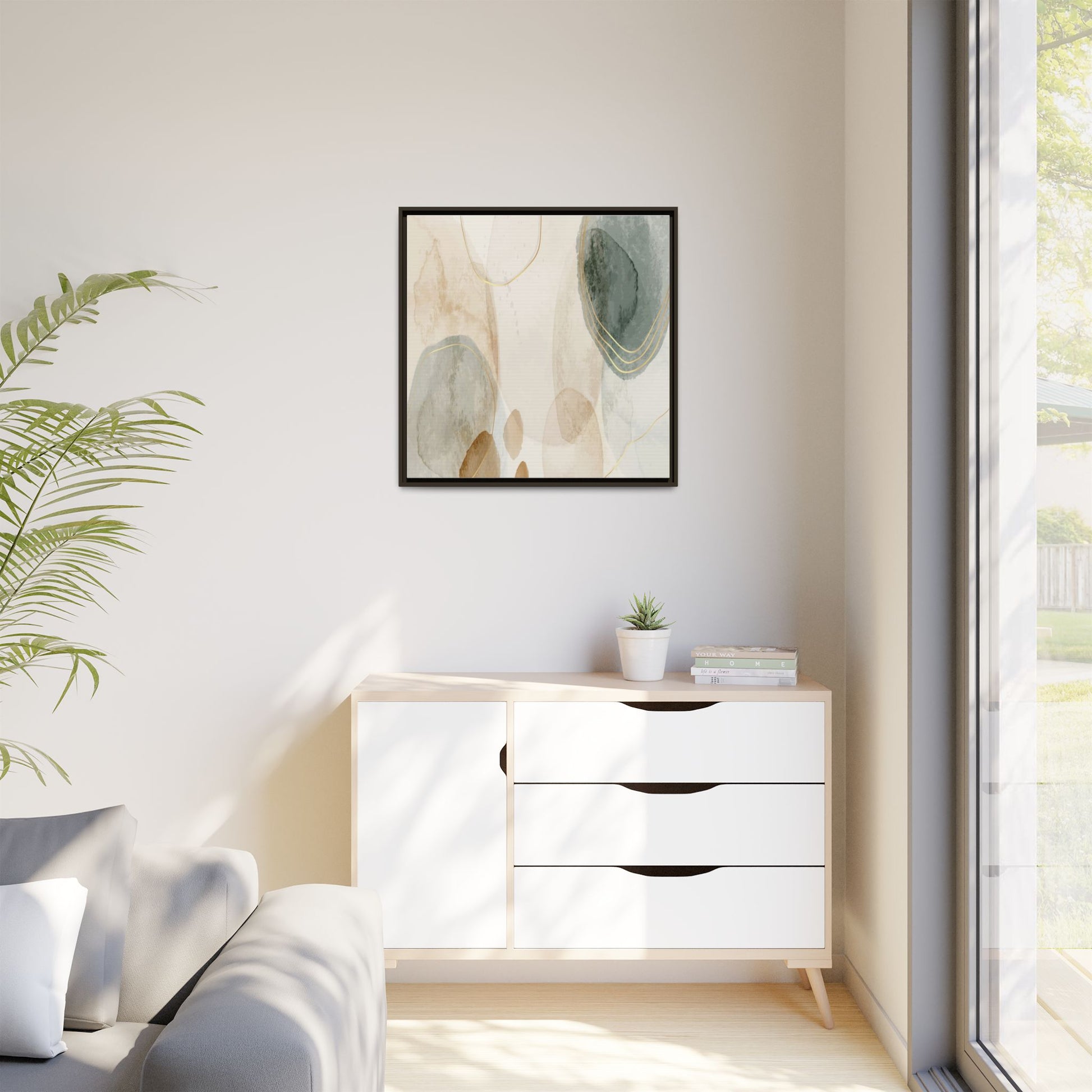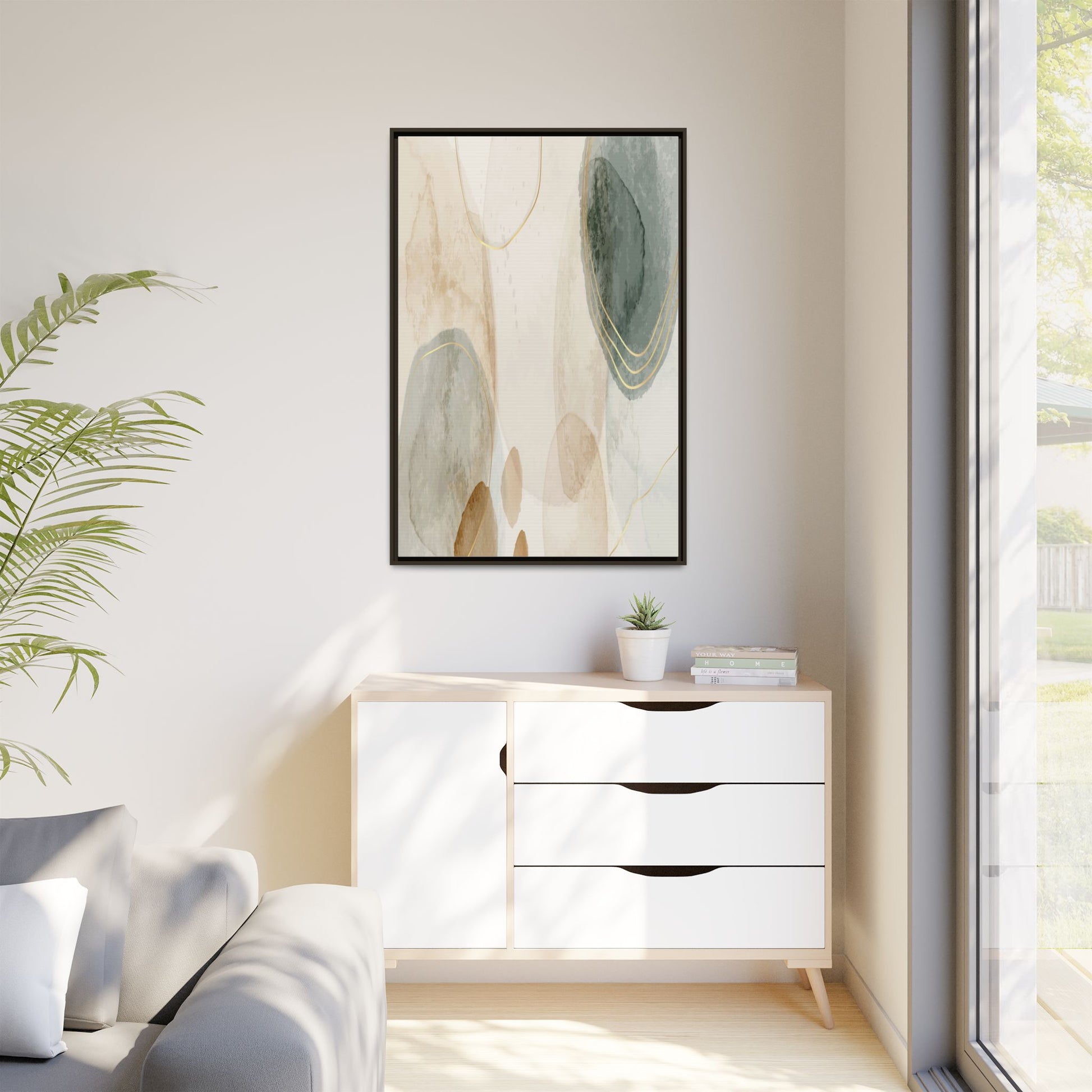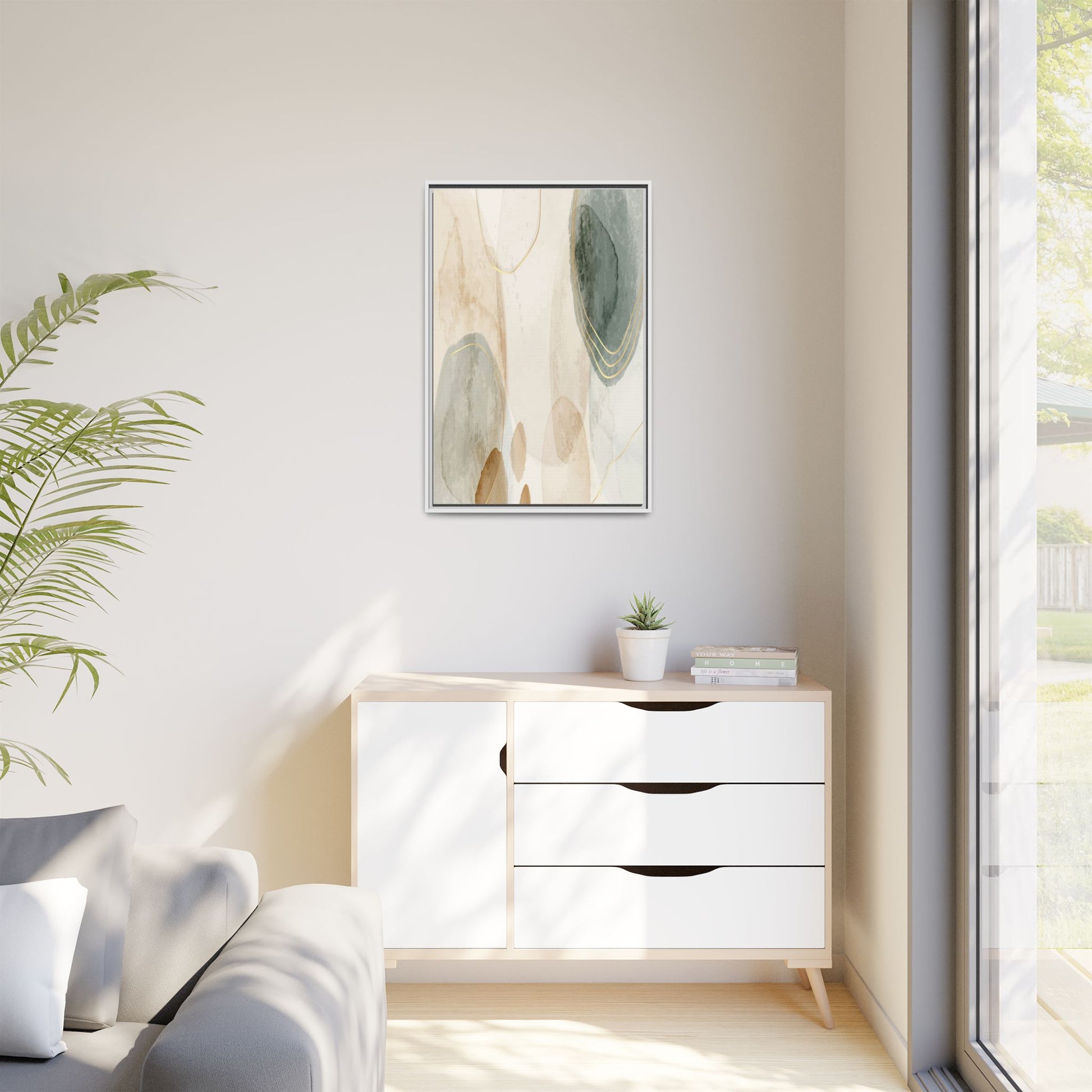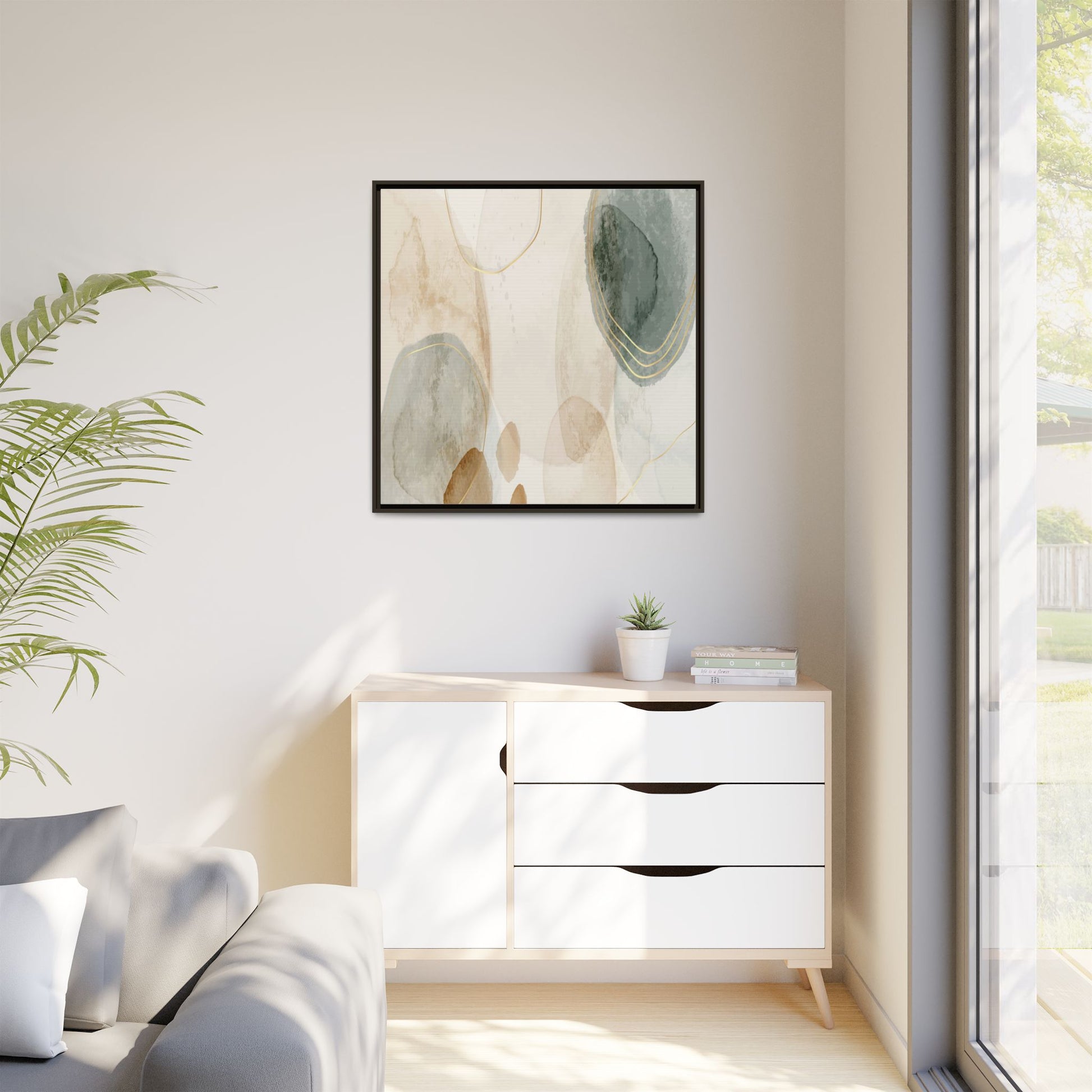 This abstract watercolor artwork features a soft, ethereal composition of organic shapes in muted tones of beige, green, and gray. Delicate golden lines weave through the image, creating elegant connections between translucent, stone-like forms that appear to float on a light background. The watercolor technique lends a dreamy, textured quality to each shape, with gentle gradients and subtle variations in color that evoke a sense of natural landscape or mineral formations. Circular and oval shapes of varying sizes are arranged in a balanced, asymmetrical layout, suggesting a modern and minimalist aesthetic. The color palette and fluid design create a sense of calm and sophistication, making this piece ideal for contemporary interior design and abstract art collections.