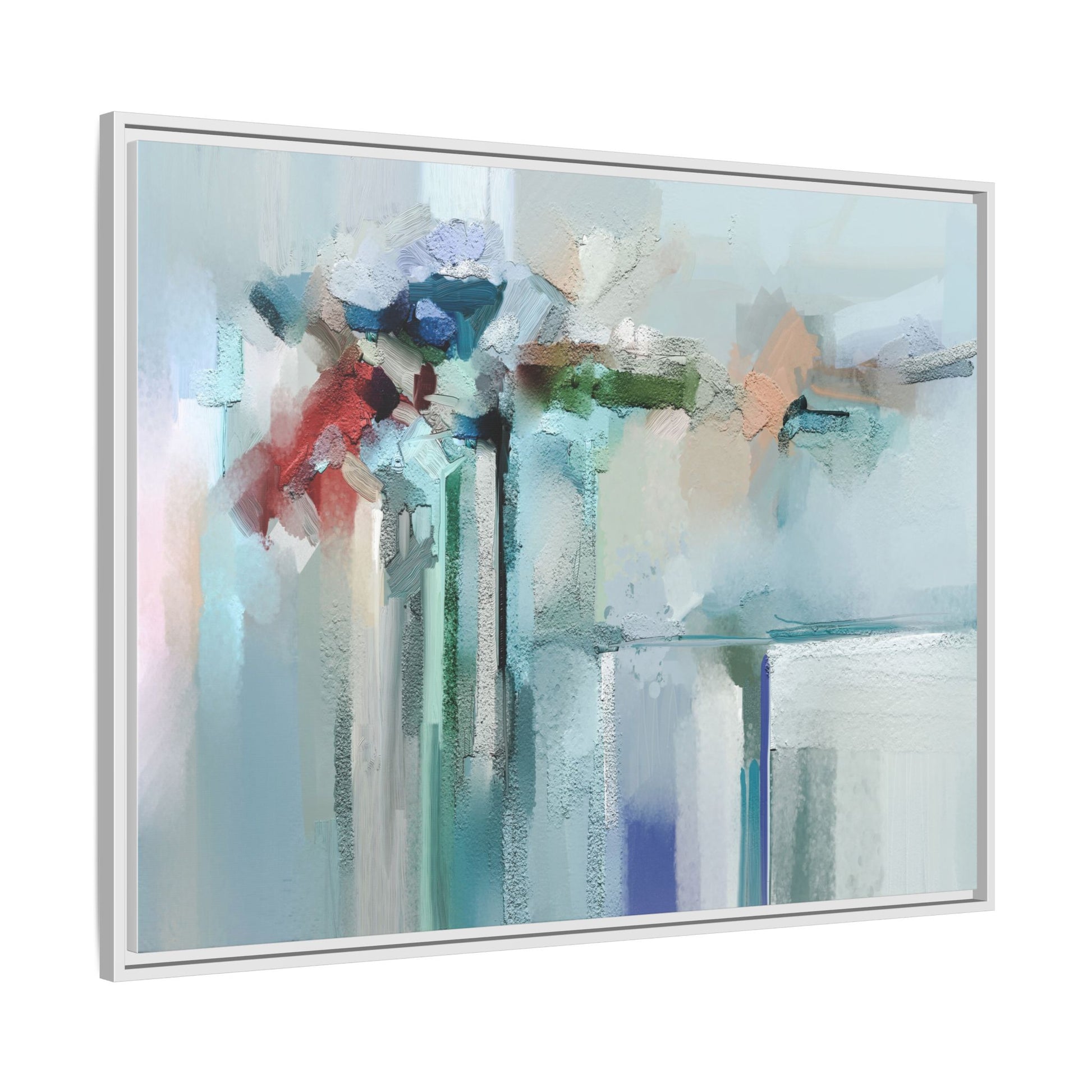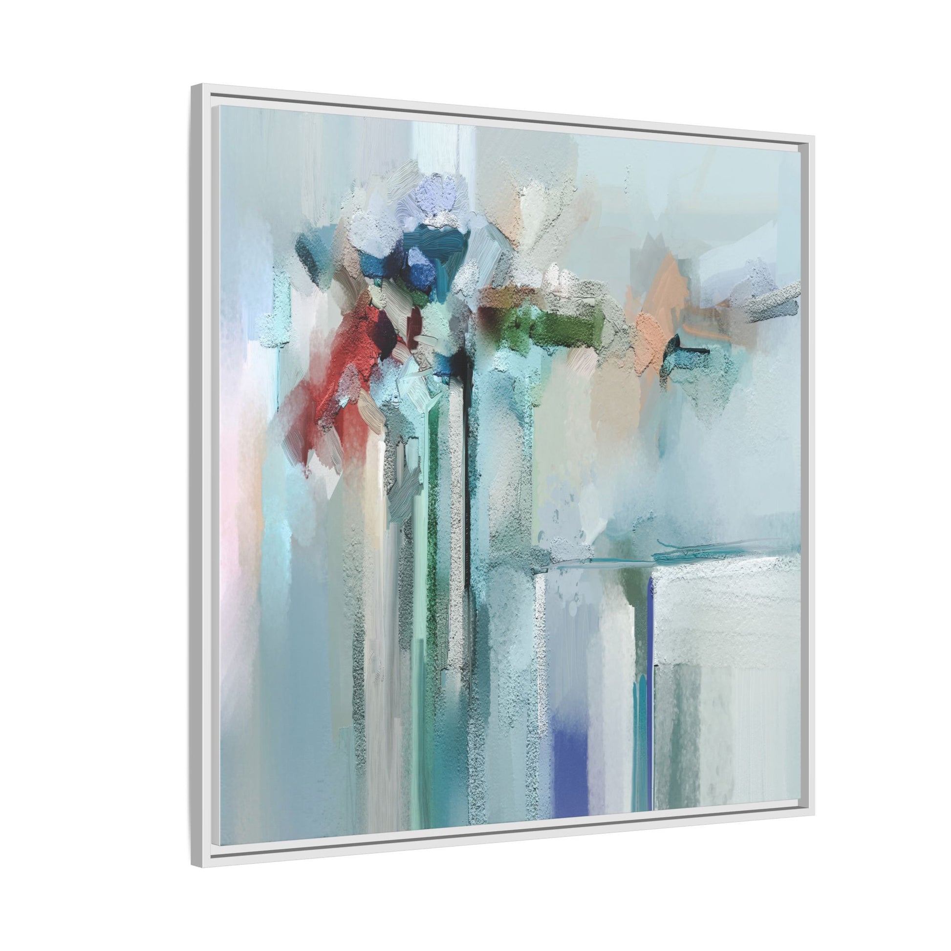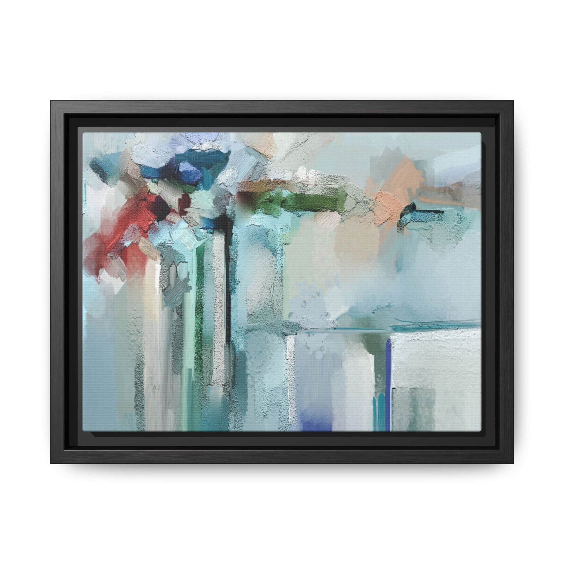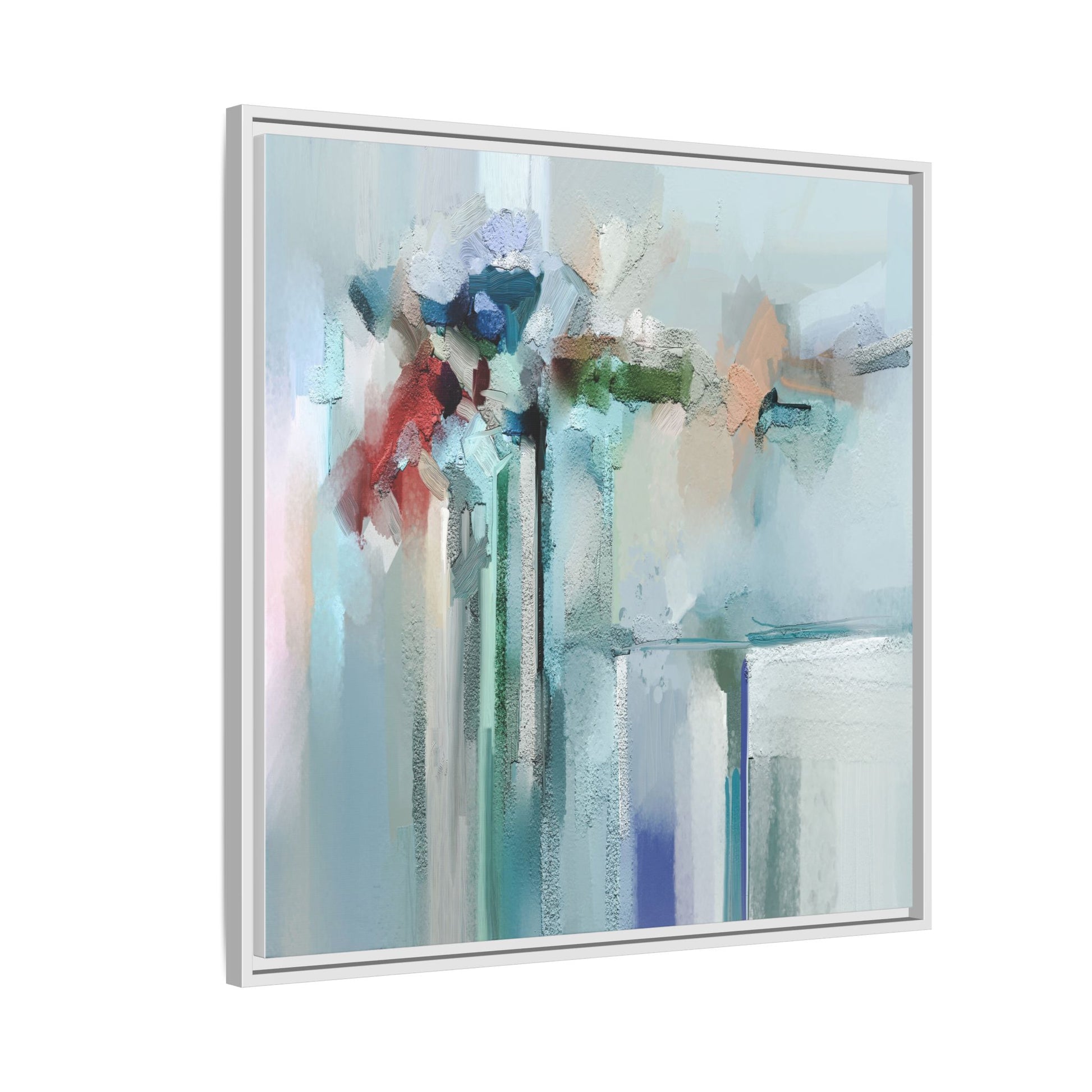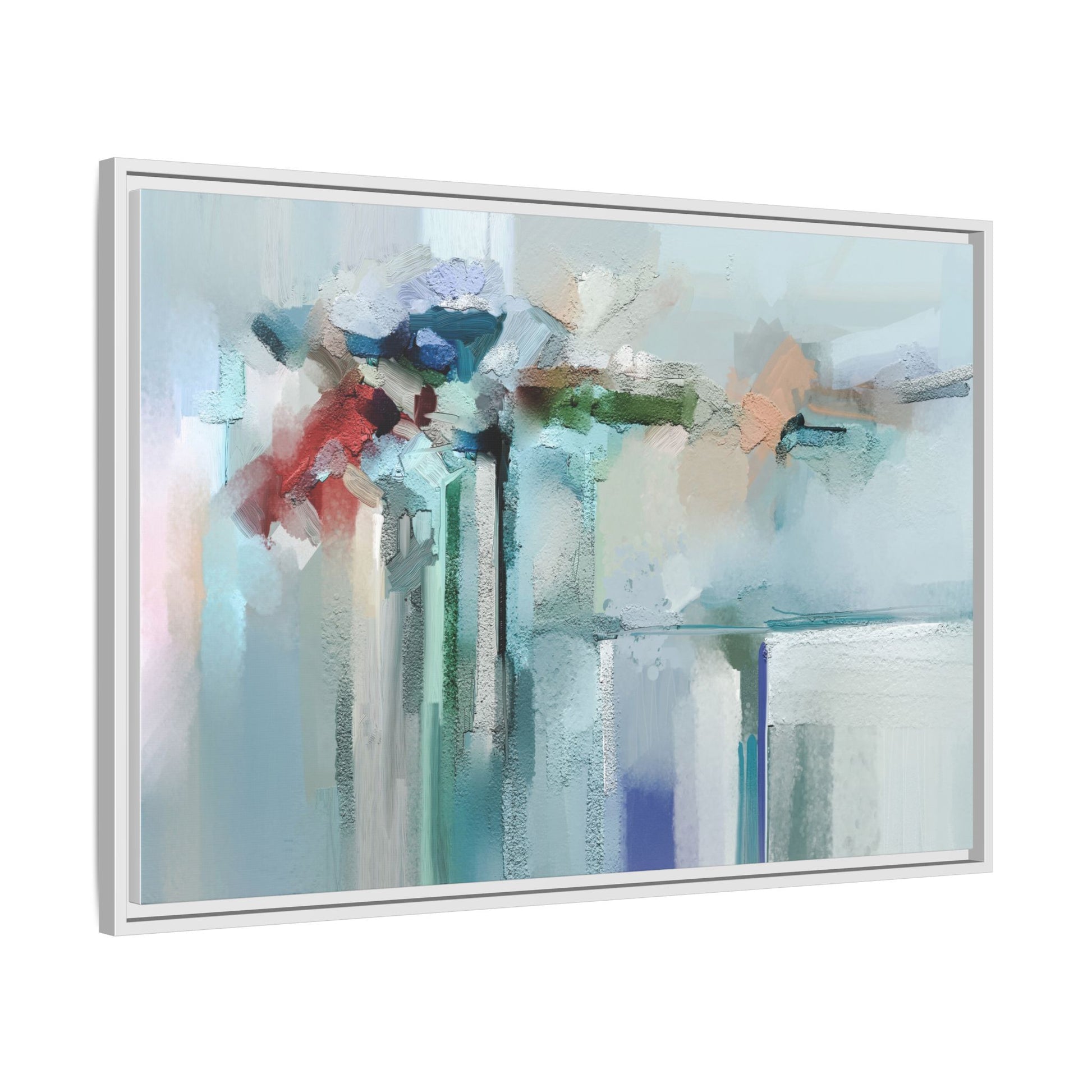 This captivating abstract painting features a soft, ethereal color palette dominated by soothing aqua, mint green, pale blue, and muted red tones. The artwork appears to be created with a textured, layered technique that creates depth and dimensionality, with visible brushstrokes and a slightly rough, impasto-like surface. Vertical elements suggest architectural or structural forms, with color blocks and vertical streams blending and intersecting across the canvas. The painting evokes a sense of tranquility and organic movement, reminiscent of a misty landscape or abstract architectural landscape. Subtle variations in texture and color create a dreamlike, contemplative atmosphere that invites viewers to explore the nuanced details and emotional resonance of the composition.