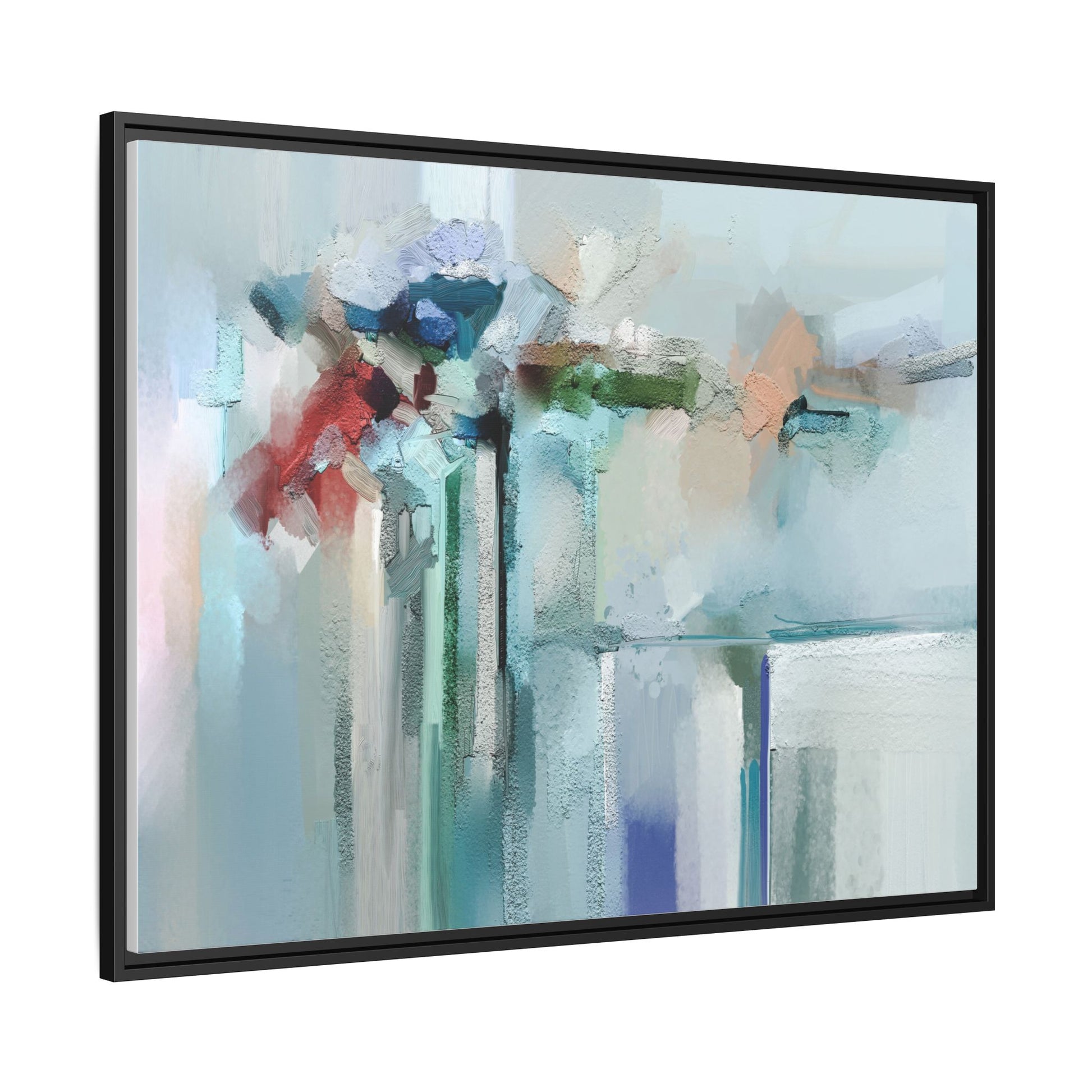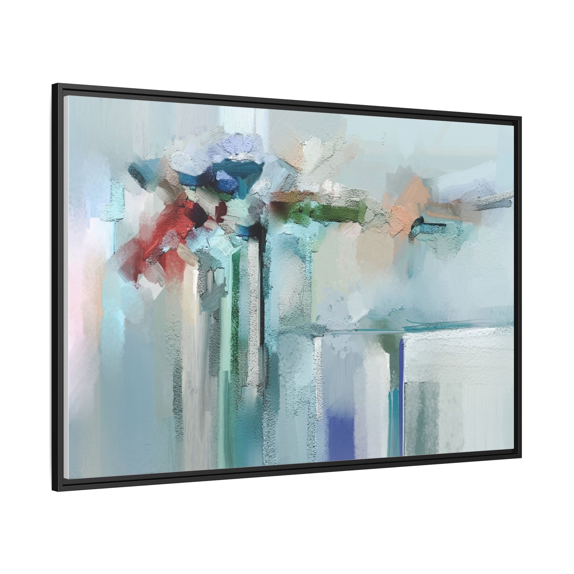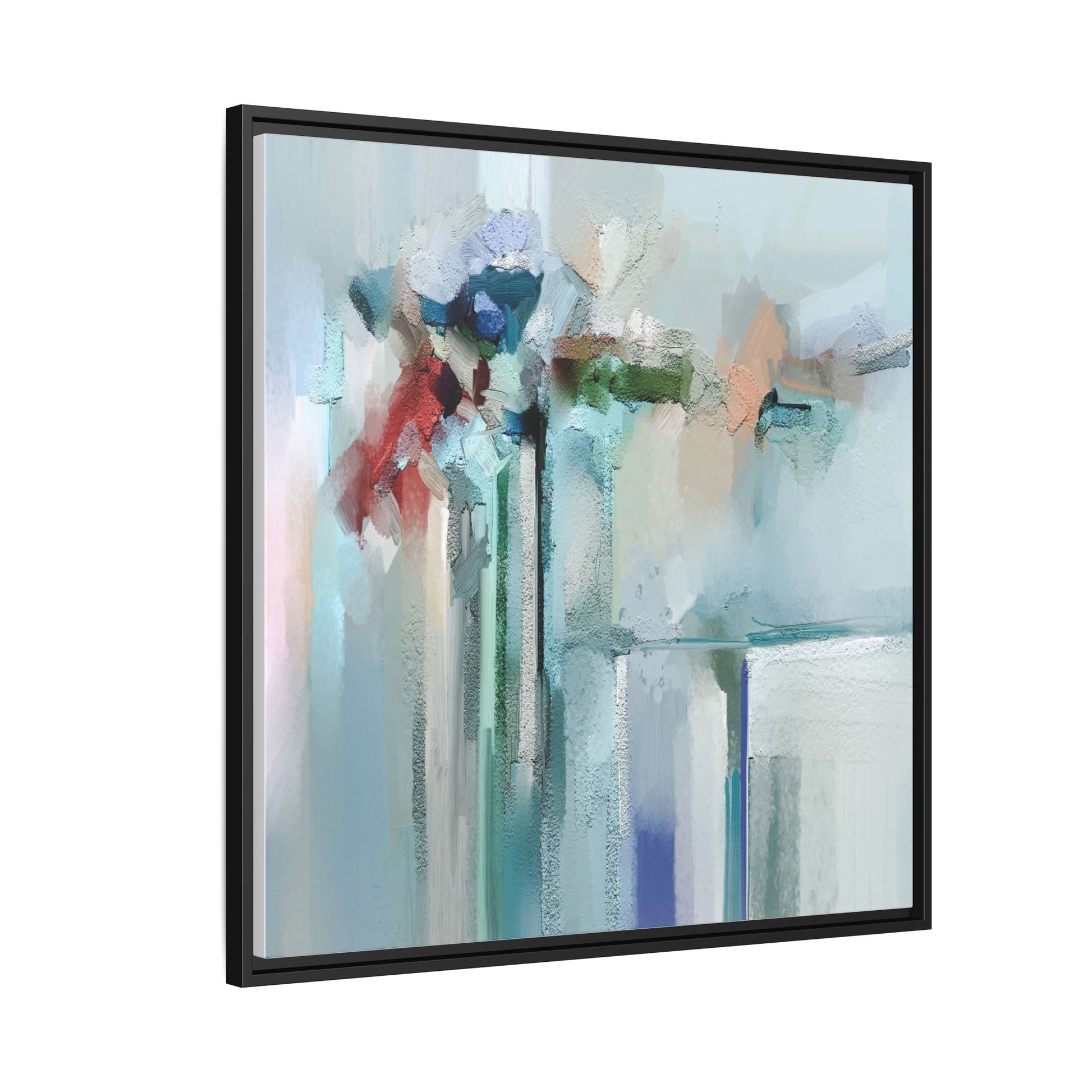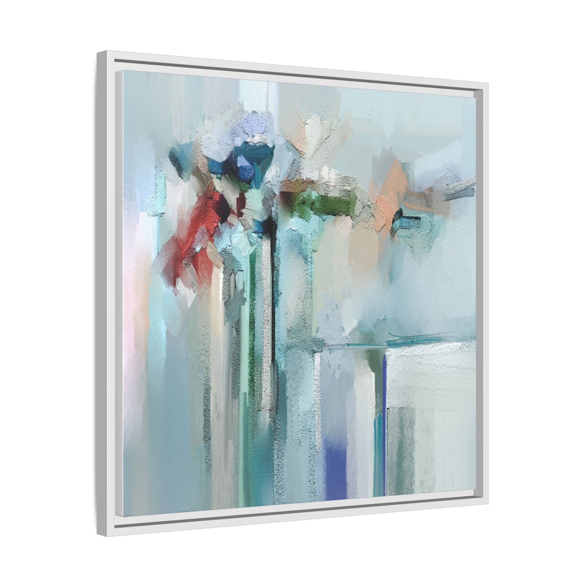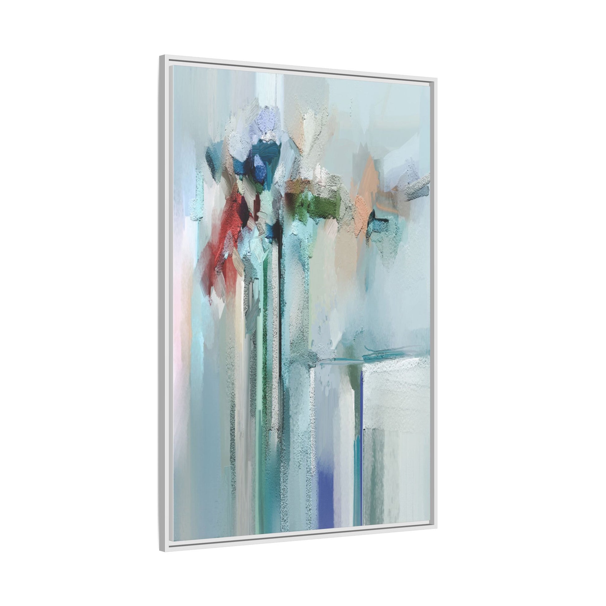 This captivating abstract painting features a soft, ethereal color palette dominated by soothing aqua, mint green, pale blue, and muted red tones. The artwork appears to be created with a textured, layered technique that creates depth and dimensionality, with visible brushstrokes and a slightly rough, impasto-like surface. Vertical elements suggest architectural or structural forms, with color blocks and vertical streams blending and intersecting across the canvas. The painting evokes a sense of tranquility and organic movement, reminiscent of a misty landscape or abstract architectural landscape. Subtle variations in texture and color create a dreamlike, contemplative atmosphere that invites viewers to explore the nuanced details and emotional resonance of the composition.
