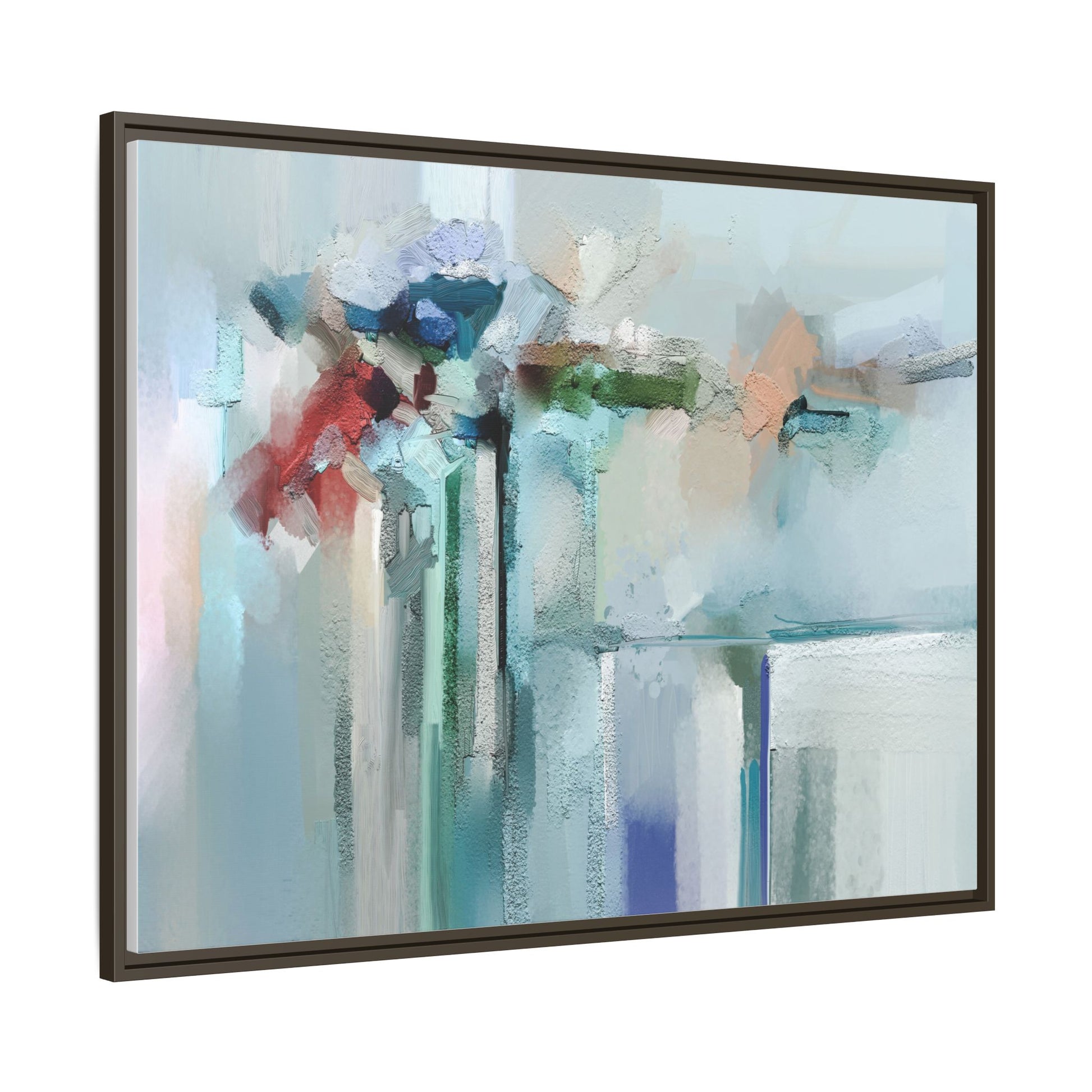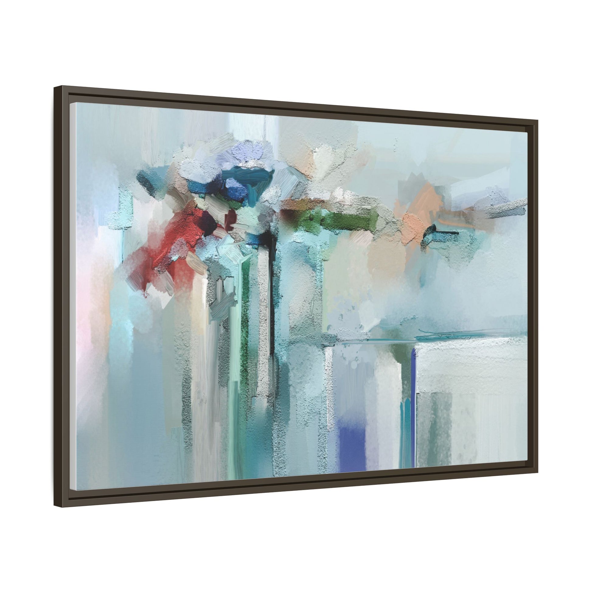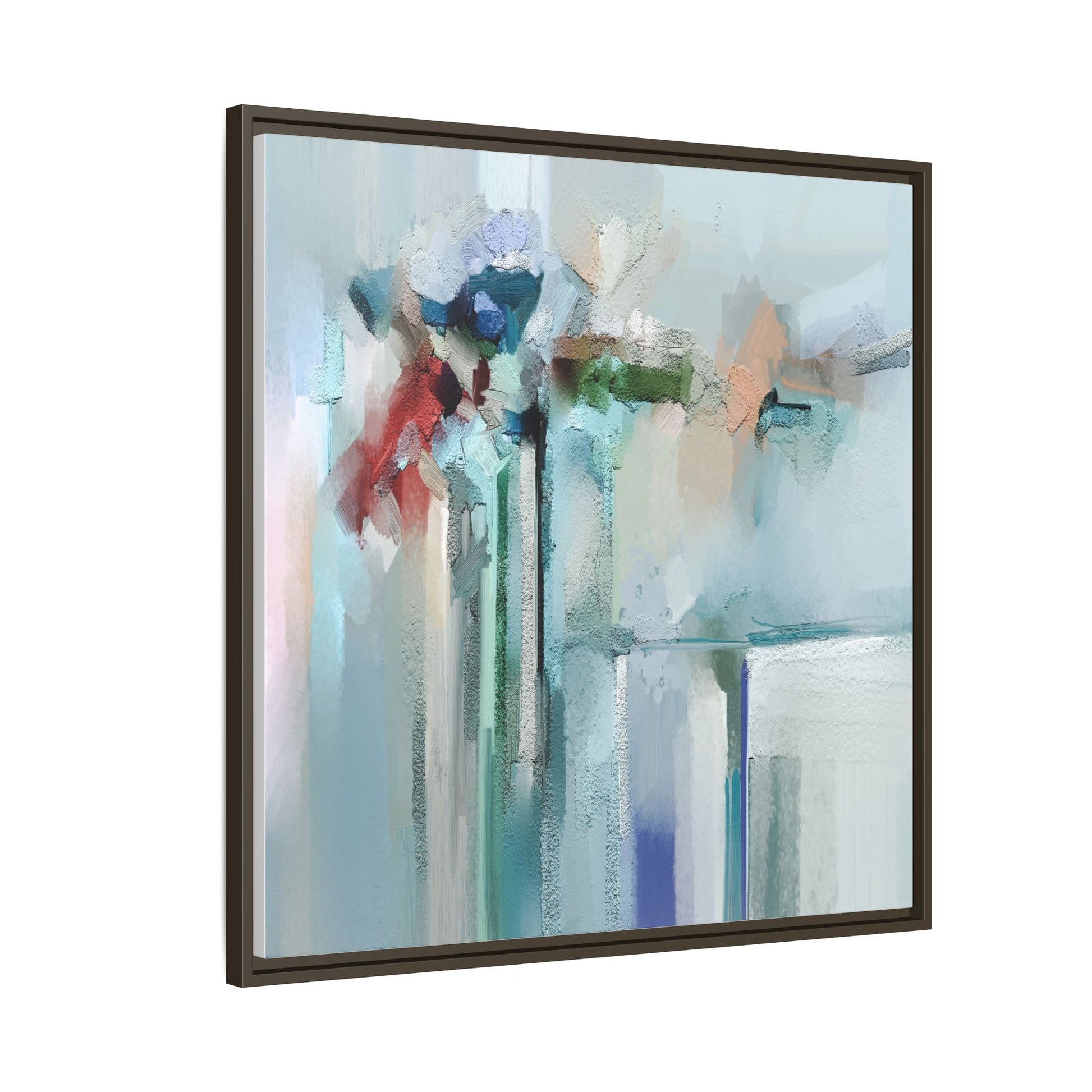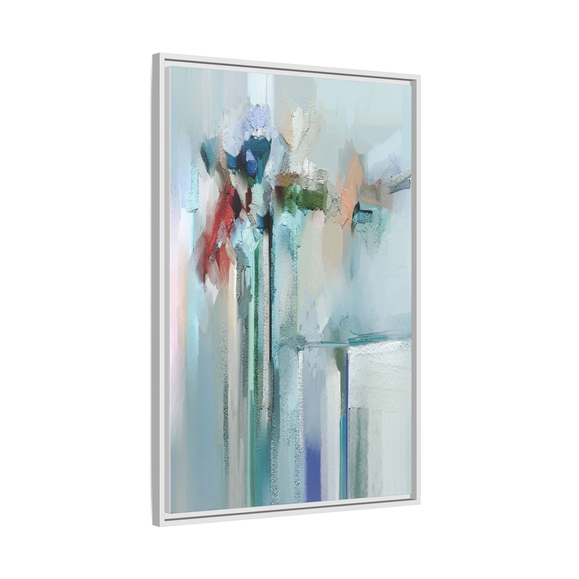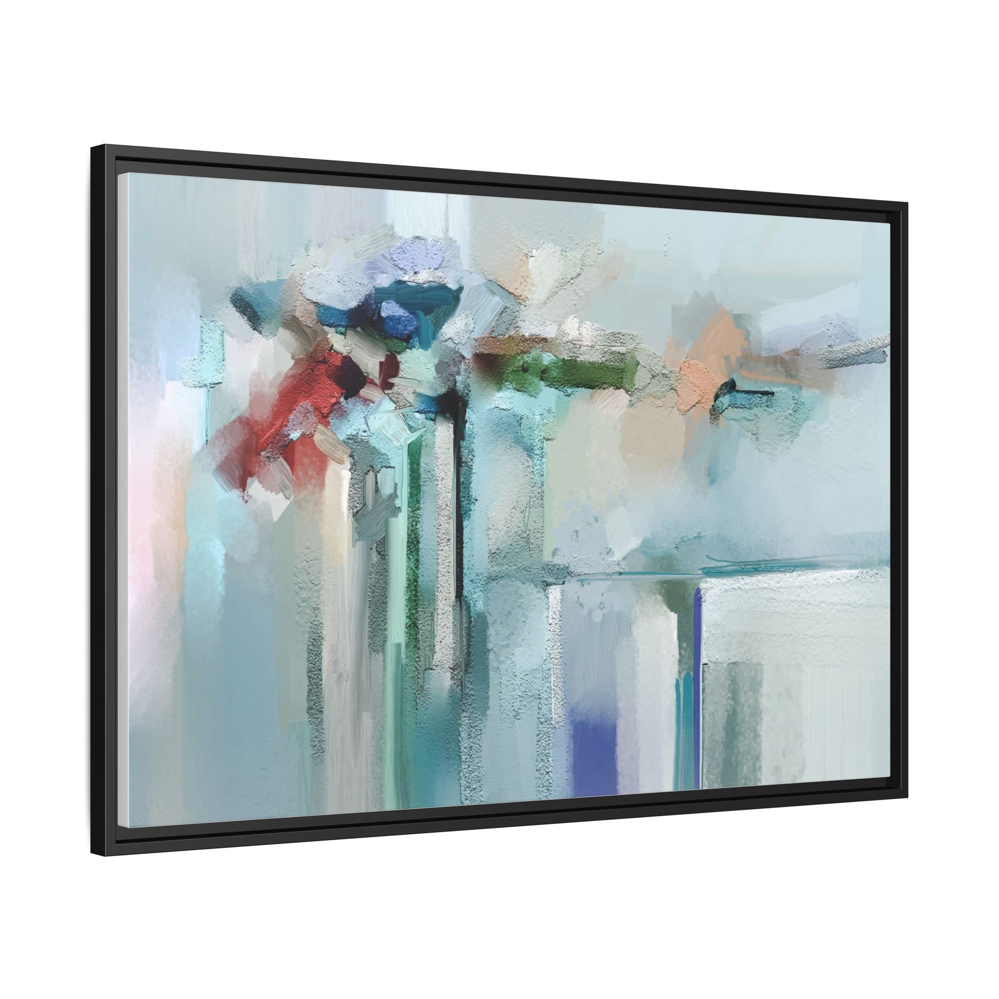 This captivating abstract painting features a soft, ethereal color palette dominated by soothing aqua, mint green, pale blue, and muted red tones. The artwork appears to be created with a textured, layered technique that creates depth and dimensionality, with visible brushstrokes and a slightly rough, impasto-like surface. Vertical elements suggest architectural or structural forms, with color blocks and vertical streams blending and intersecting across the canvas. The painting evokes a sense of tranquility and organic movement, reminiscent of a misty landscape or abstract architectural landscape. Subtle variations in texture and color create a dreamlike, contemplative atmosphere that invites viewers to explore the nuanced details and emotional resonance of the composition.