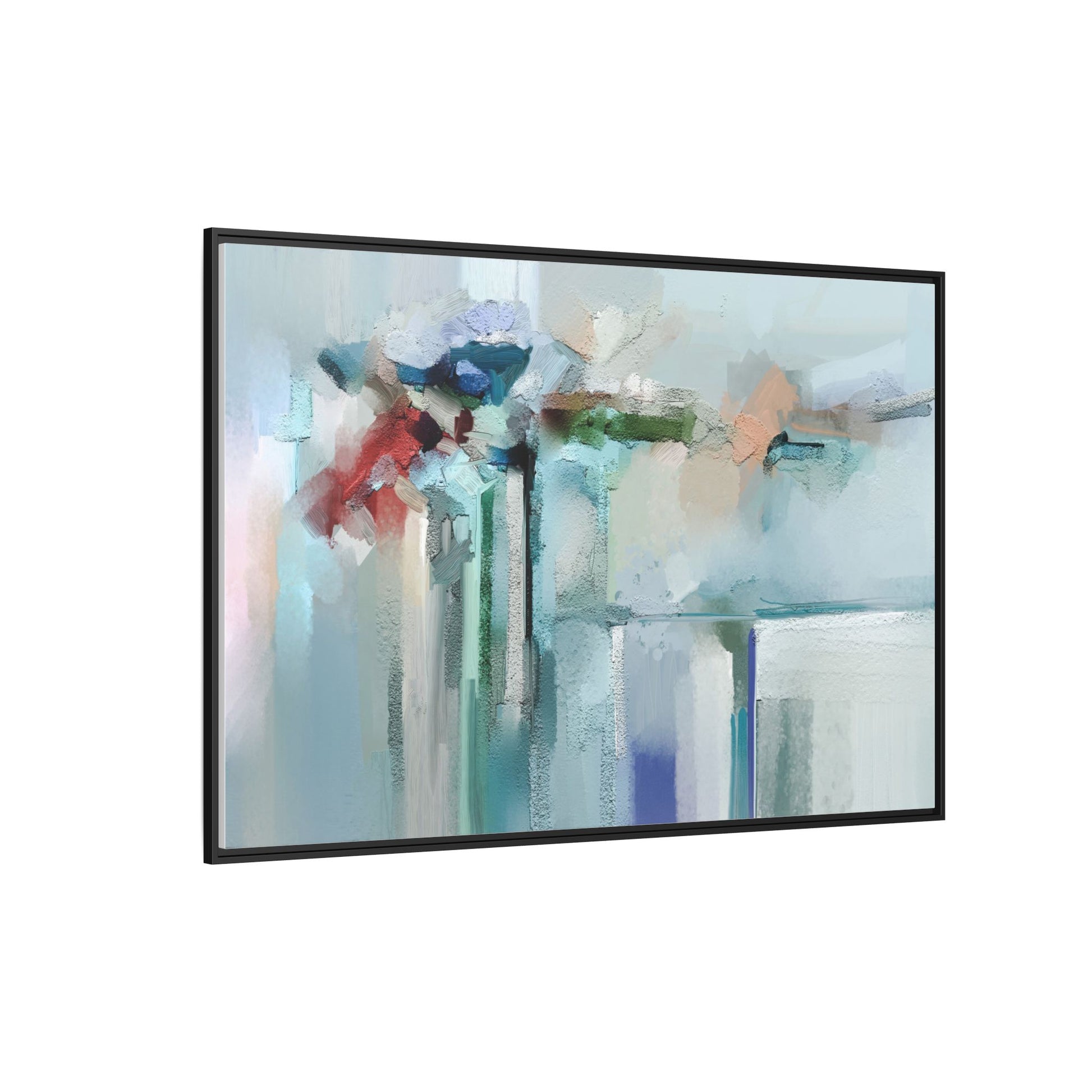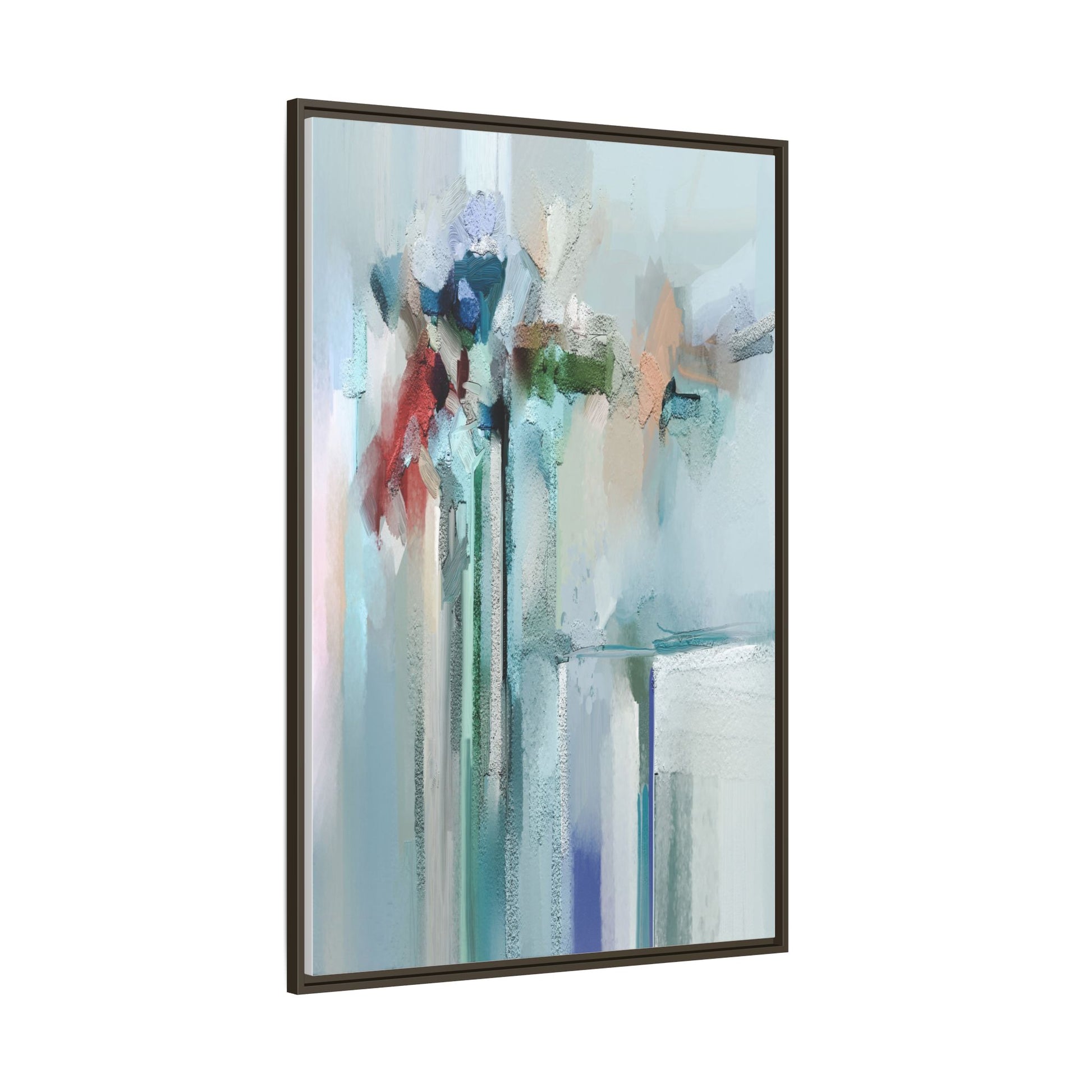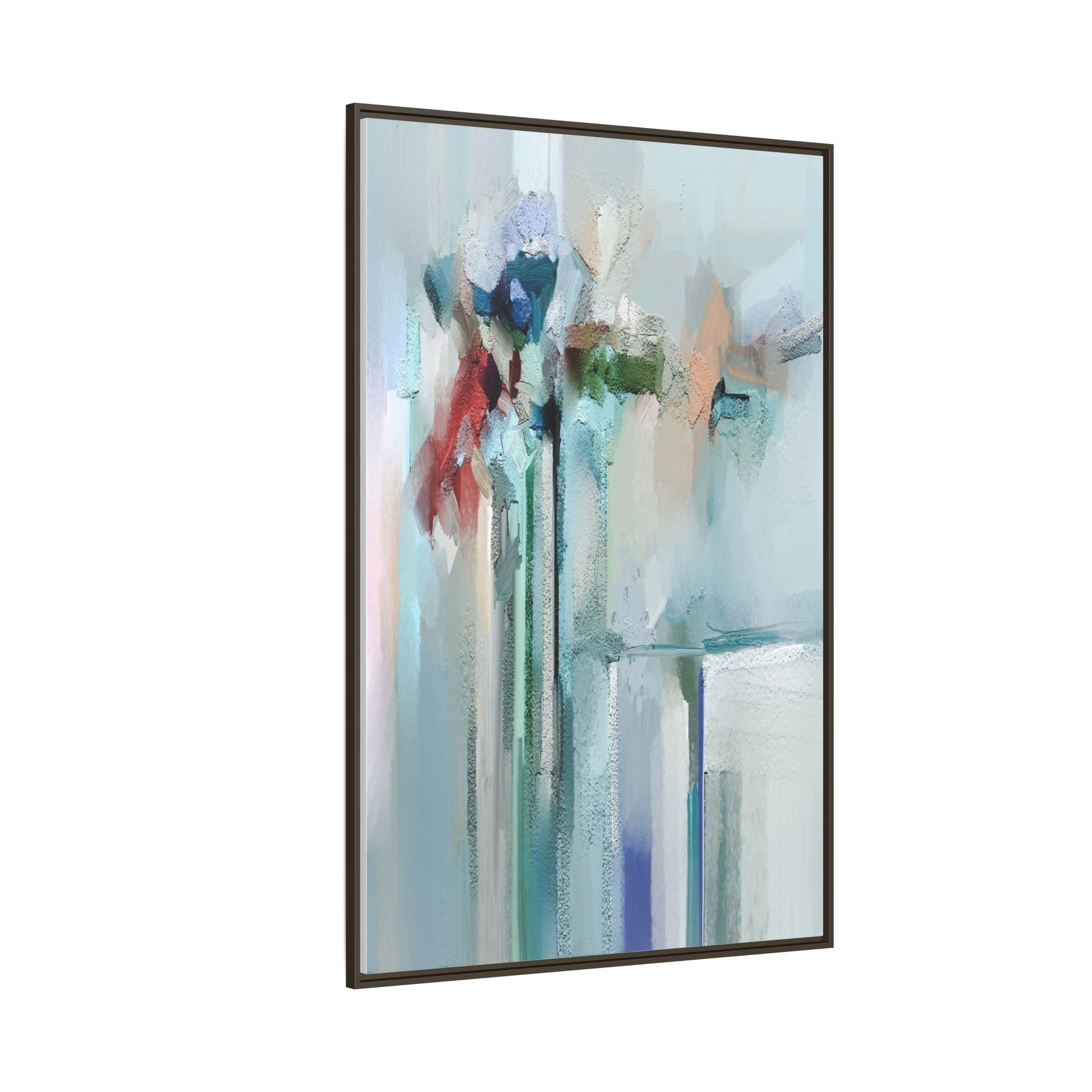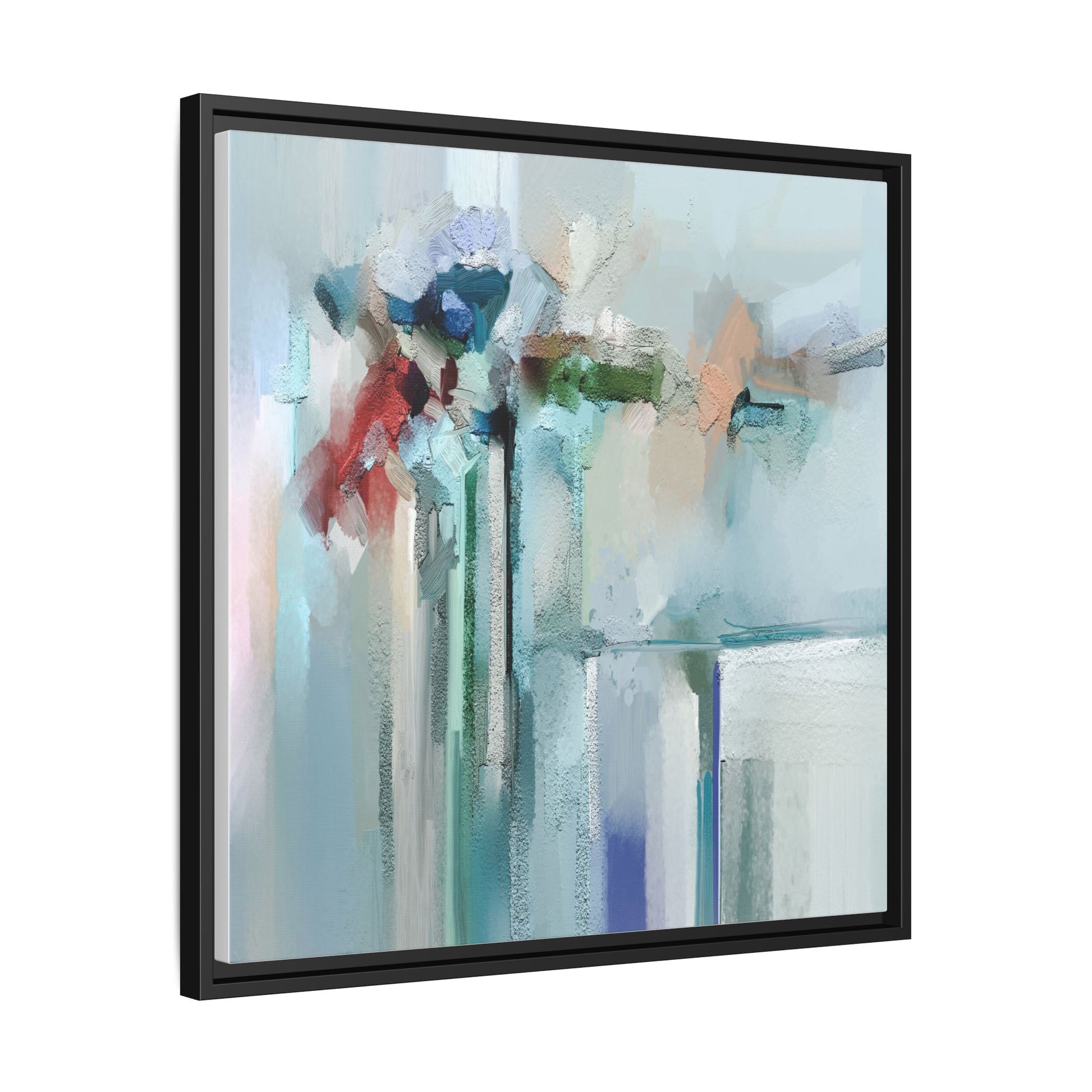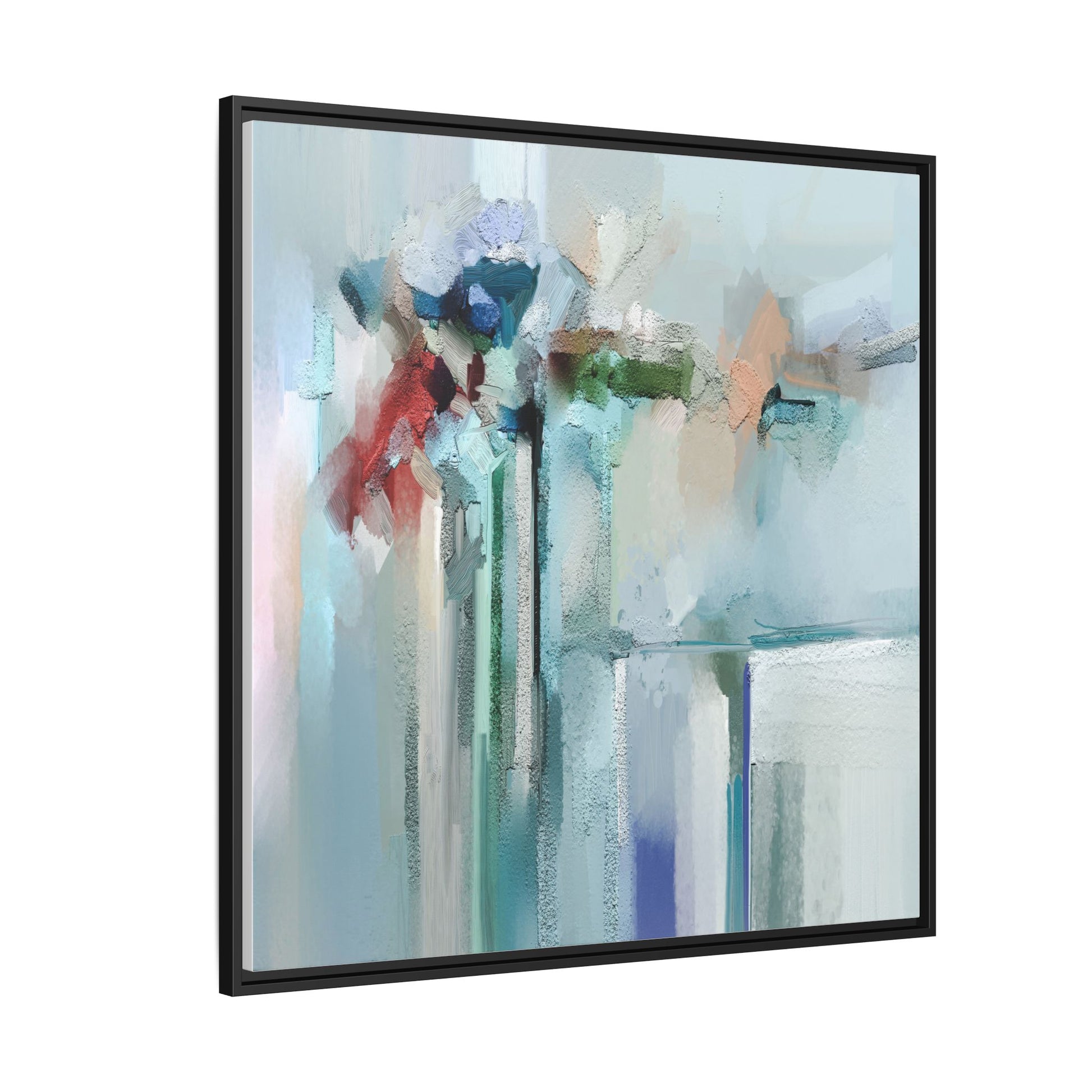 This captivating abstract painting features a soft, ethereal color palette dominated by soothing aqua, mint green, pale blue, and muted red tones. The artwork appears to be created with a textured, layered technique that creates depth and dimensionality, with visible brushstrokes and a slightly rough, impasto-like surface. Vertical elements suggest architectural or structural forms, with color blocks and vertical streams blending and intersecting across the canvas. The painting evokes a sense of tranquility and organic movement, reminiscent of a misty landscape or abstract architectural landscape. Subtle variations in texture and color create a dreamlike, contemplative atmosphere that invites viewers to explore the nuanced details and emotional resonance of the composition.
