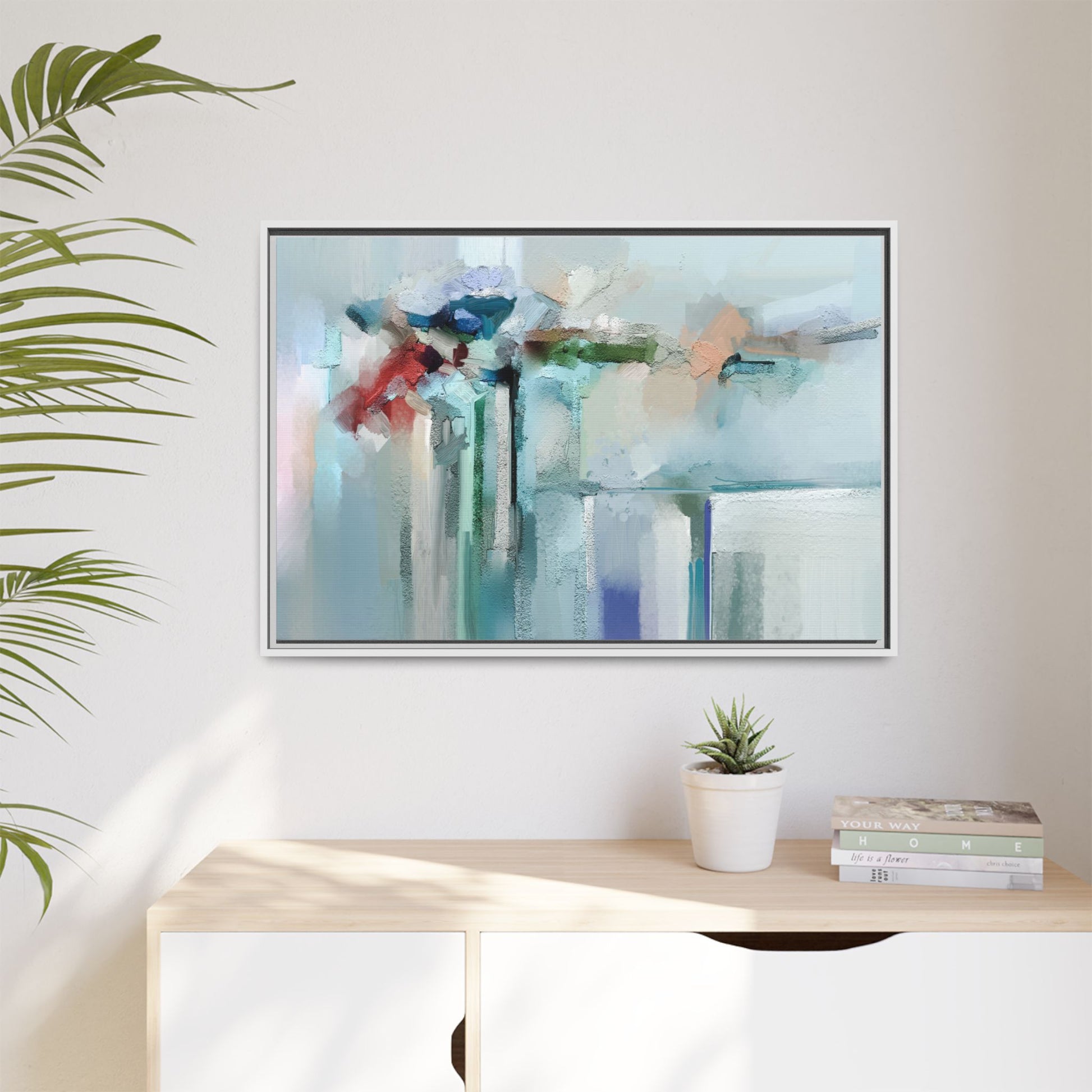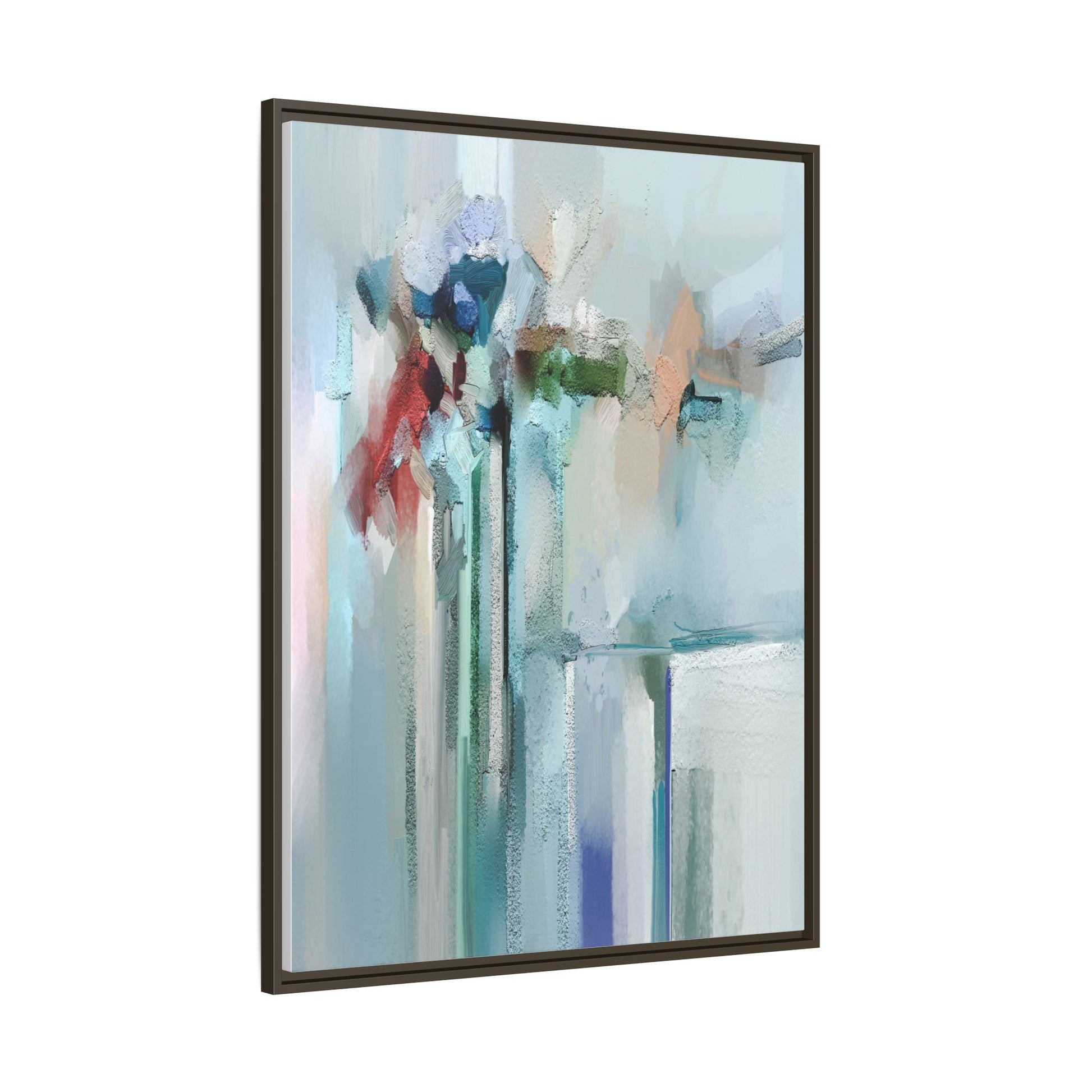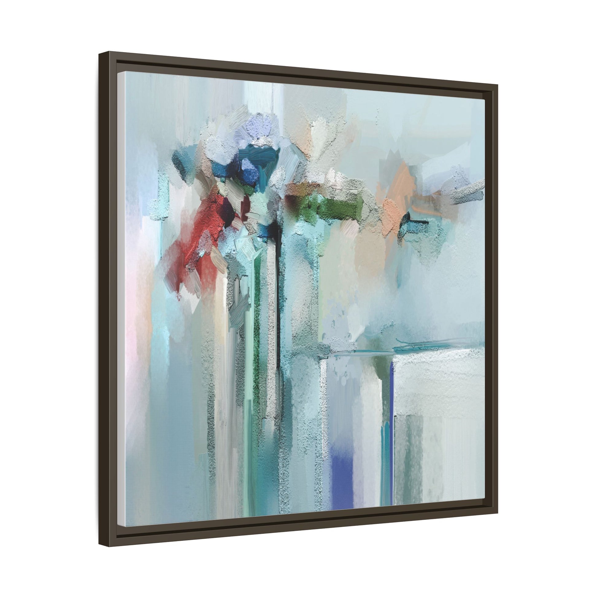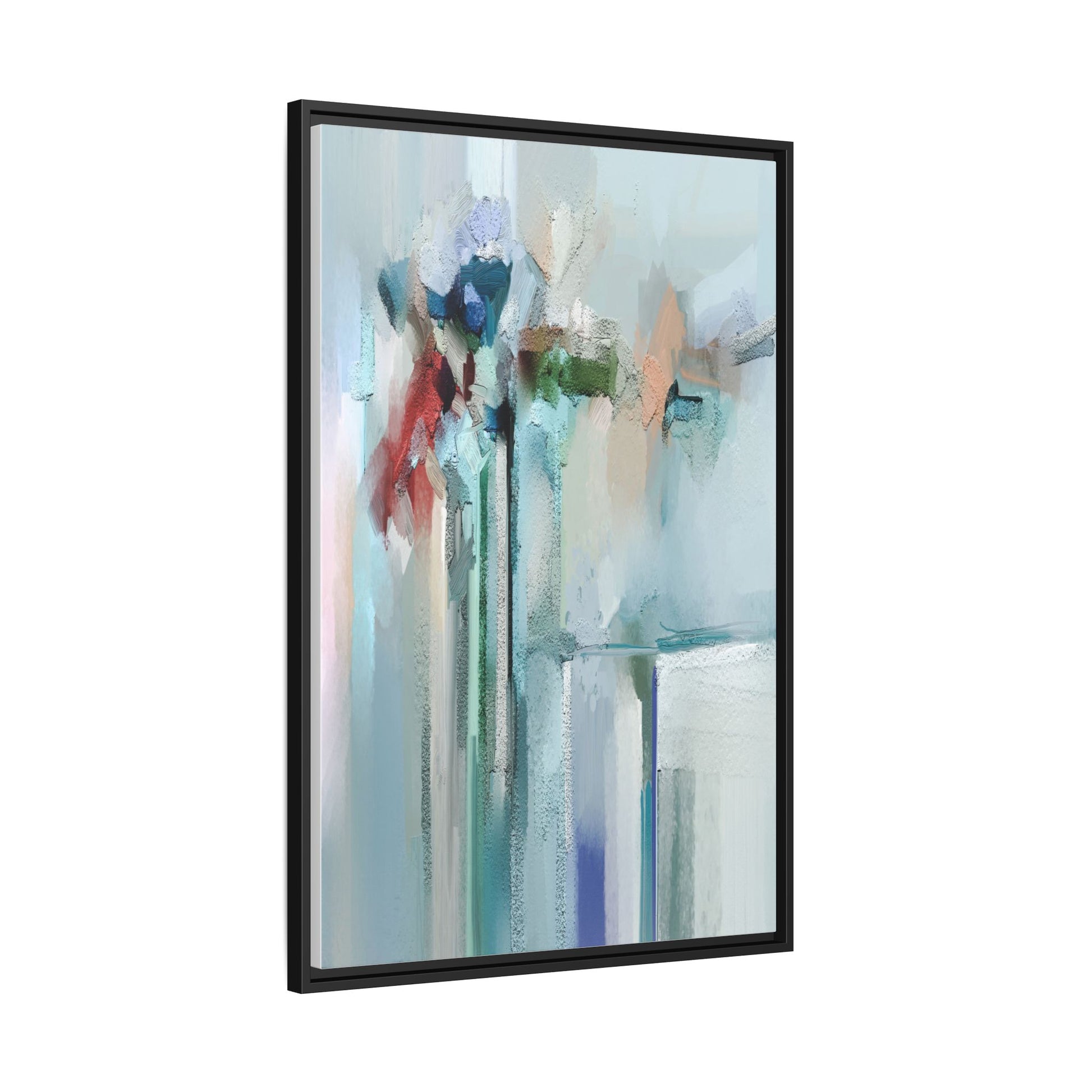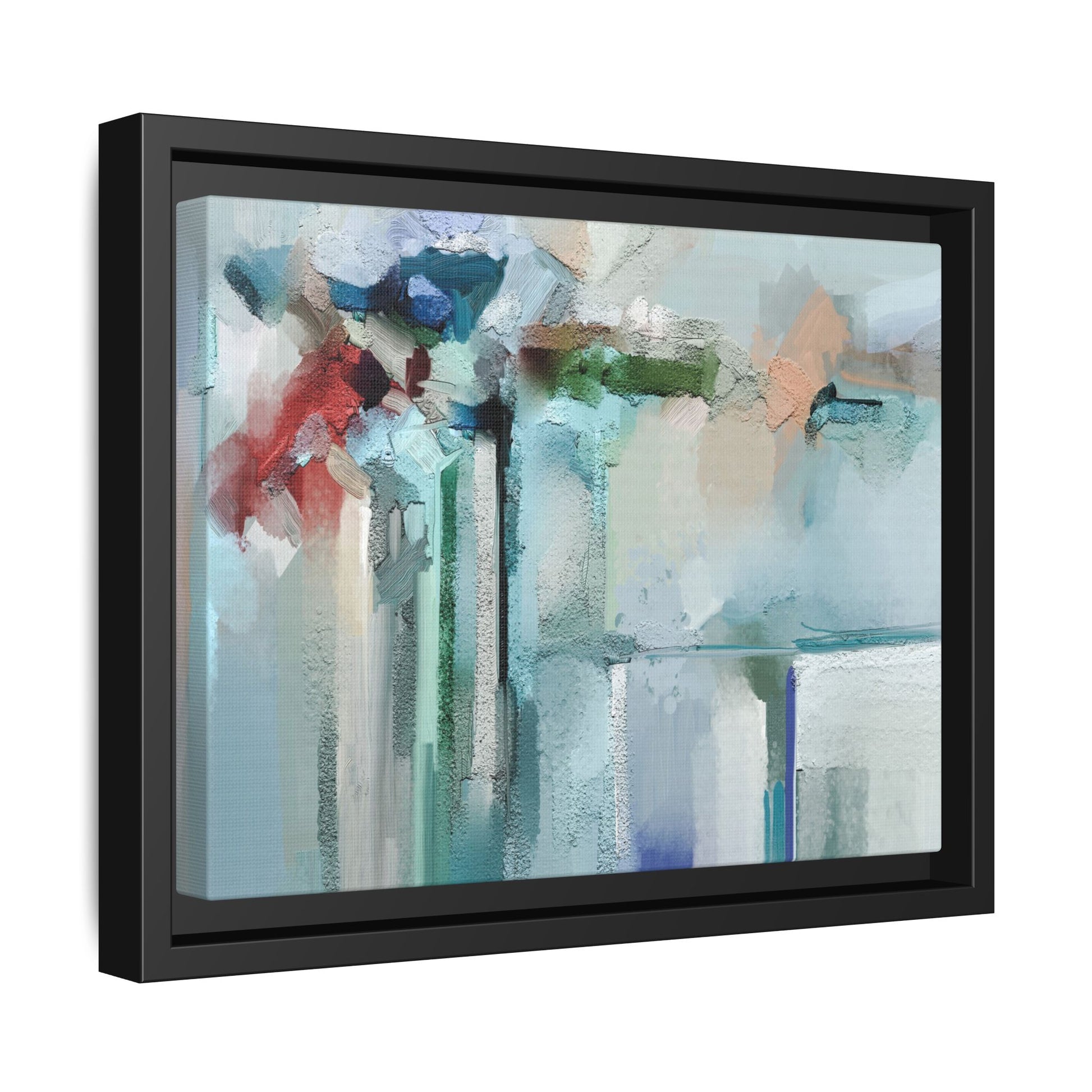 This captivating abstract painting features a soft, ethereal color palette dominated by soothing aqua, mint green, pale blue, and muted red tones. The artwork appears to be created with a textured, layered technique that creates depth and dimensionality, with visible brushstrokes and a slightly rough, impasto-like surface. Vertical elements suggest architectural or structural forms, with color blocks and vertical streams blending and intersecting across the canvas. The painting evokes a sense of tranquility and organic movement, reminiscent of a misty landscape or abstract architectural landscape. Subtle variations in texture and color create a dreamlike, contemplative atmosphere that invites viewers to explore the nuanced details and emotional resonance of the composition.