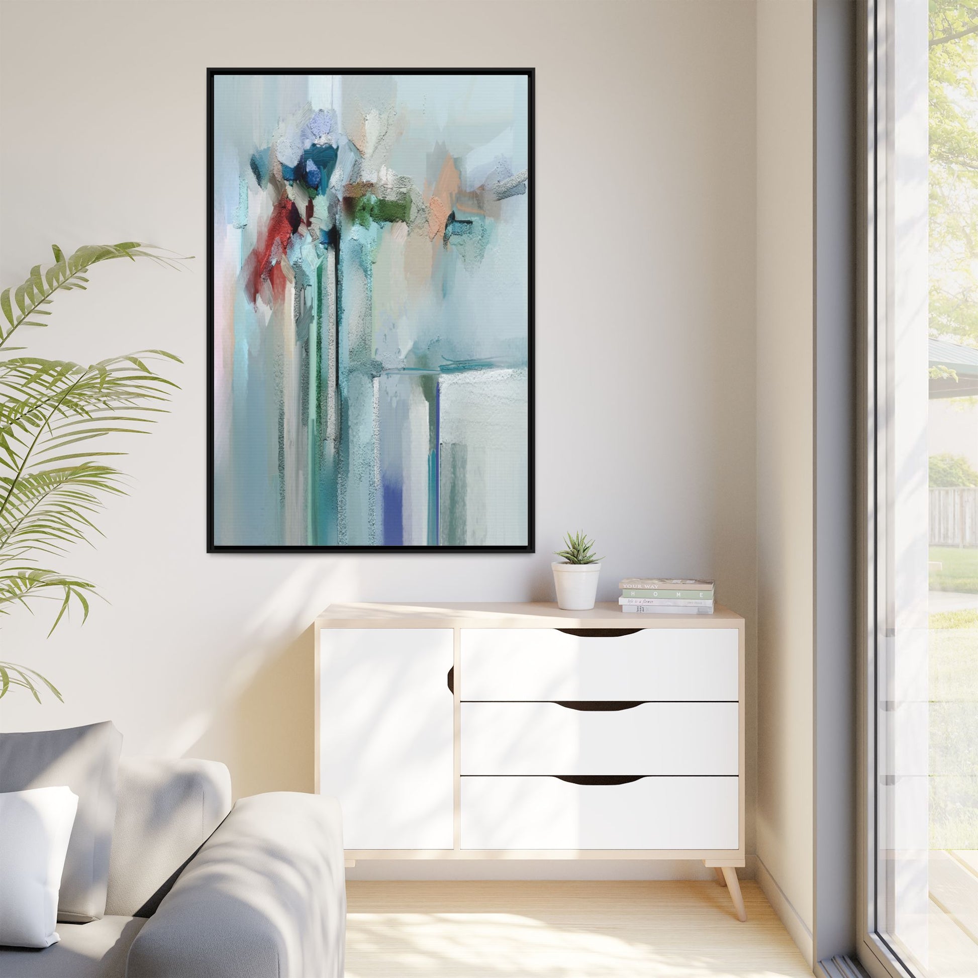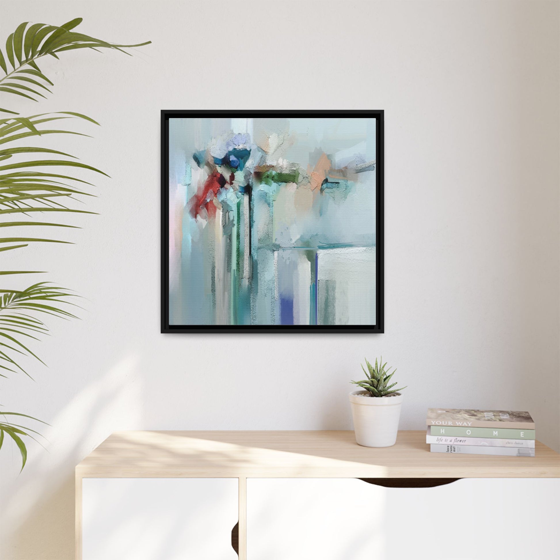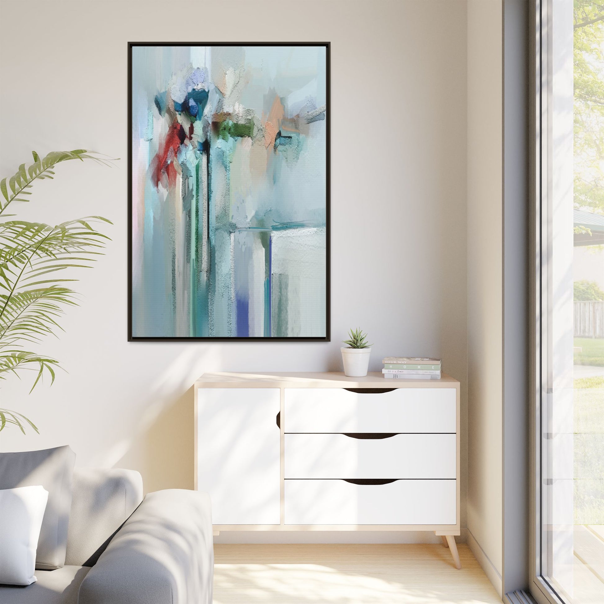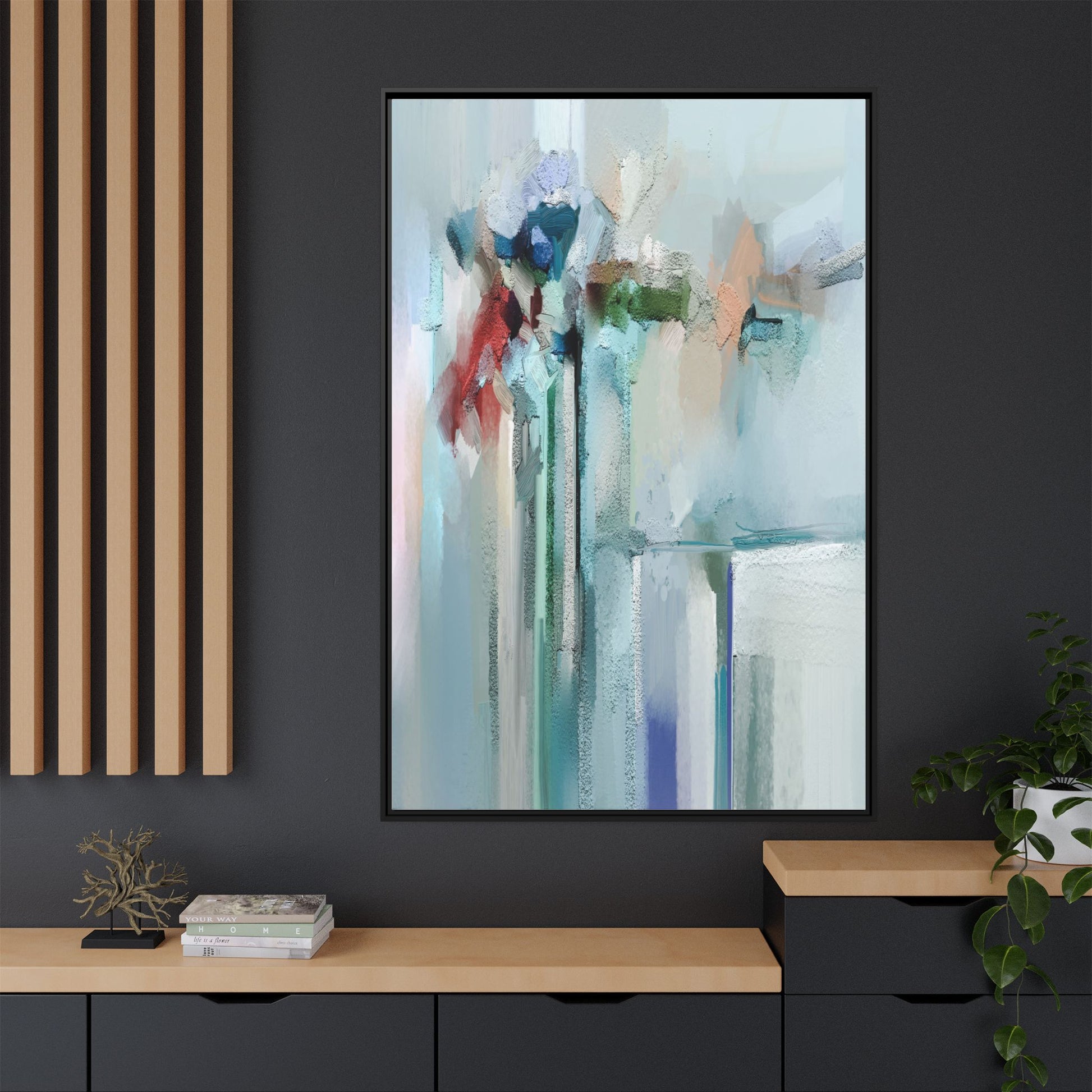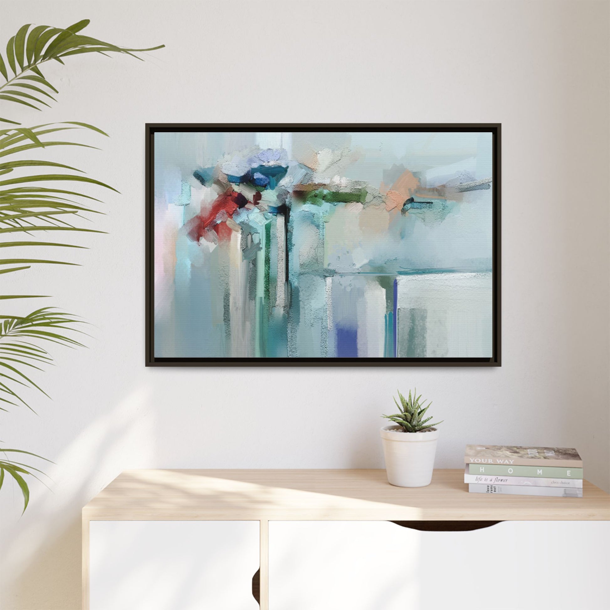 This captivating abstract painting features a soft, ethereal color palette dominated by soothing aqua, mint green, pale blue, and muted red tones. The artwork appears to be created with a textured, layered technique that creates depth and dimensionality, with visible brushstrokes and a slightly rough, impasto-like surface. Vertical elements suggest architectural or structural forms, with color blocks and vertical streams blending and intersecting across the canvas. The painting evokes a sense of tranquility and organic movement, reminiscent of a misty landscape or abstract architectural landscape. Subtle variations in texture and color create a dreamlike, contemplative atmosphere that invites viewers to explore the nuanced details and emotional resonance of the composition.