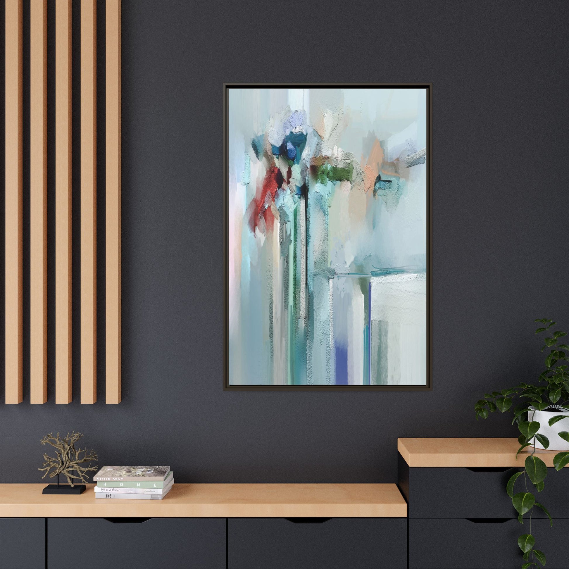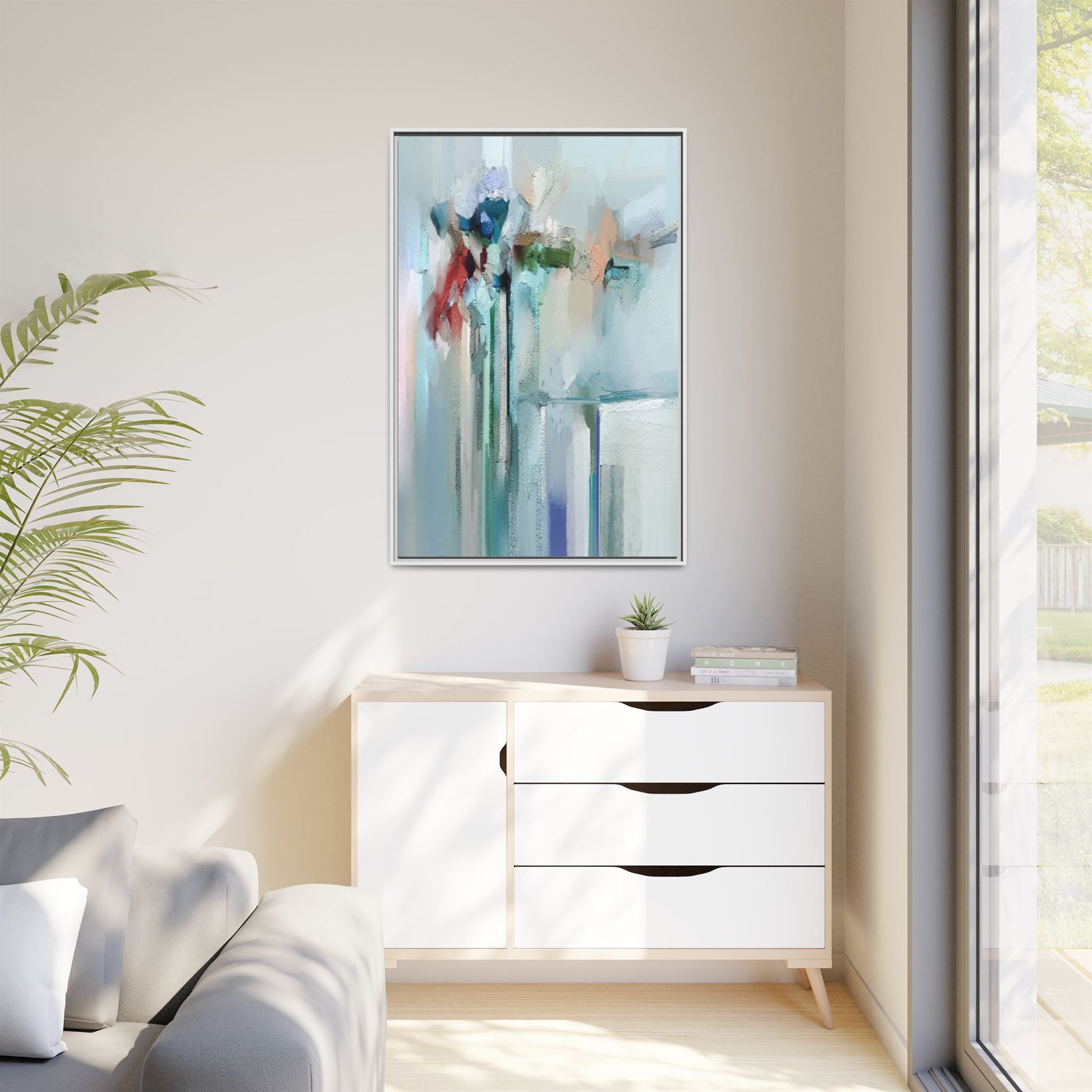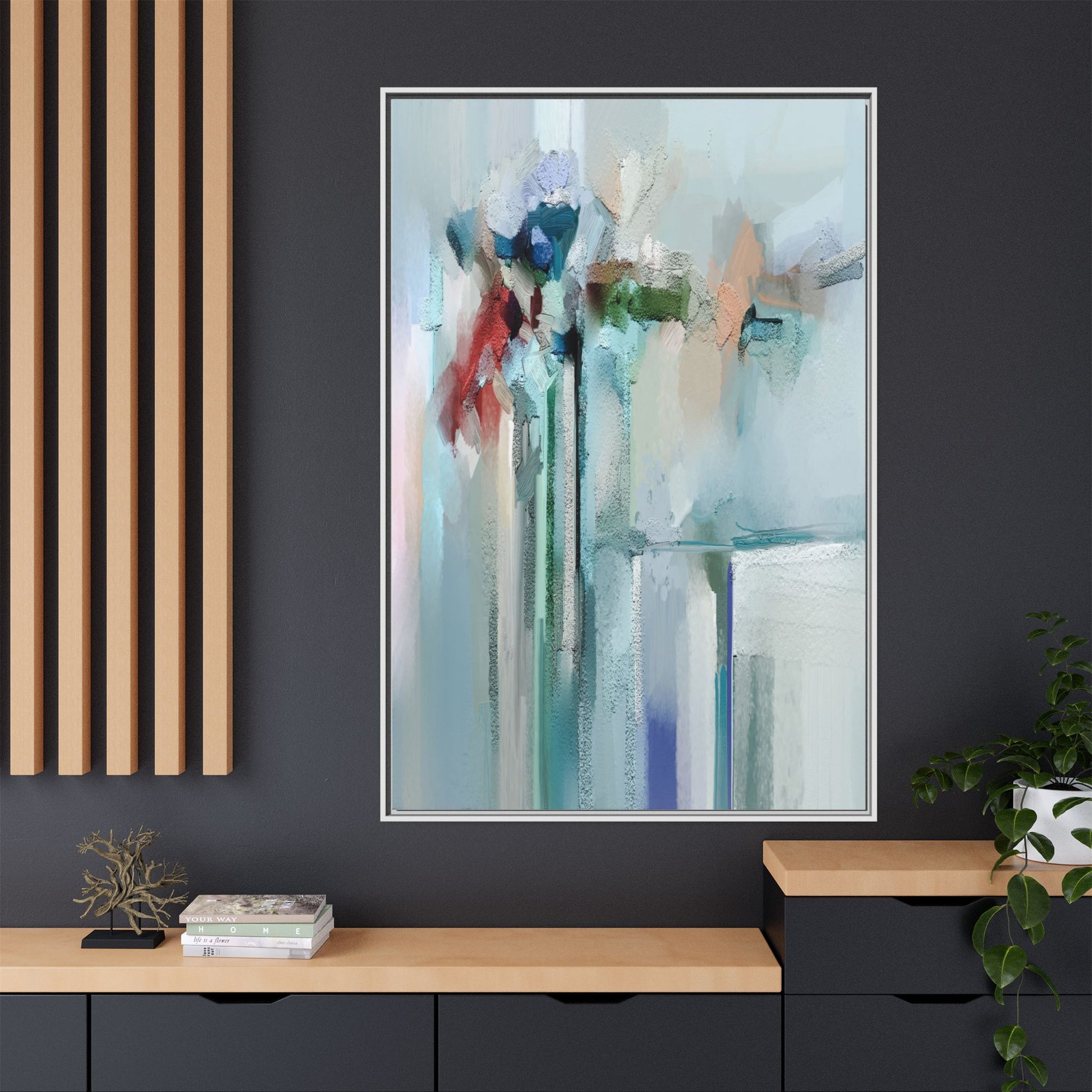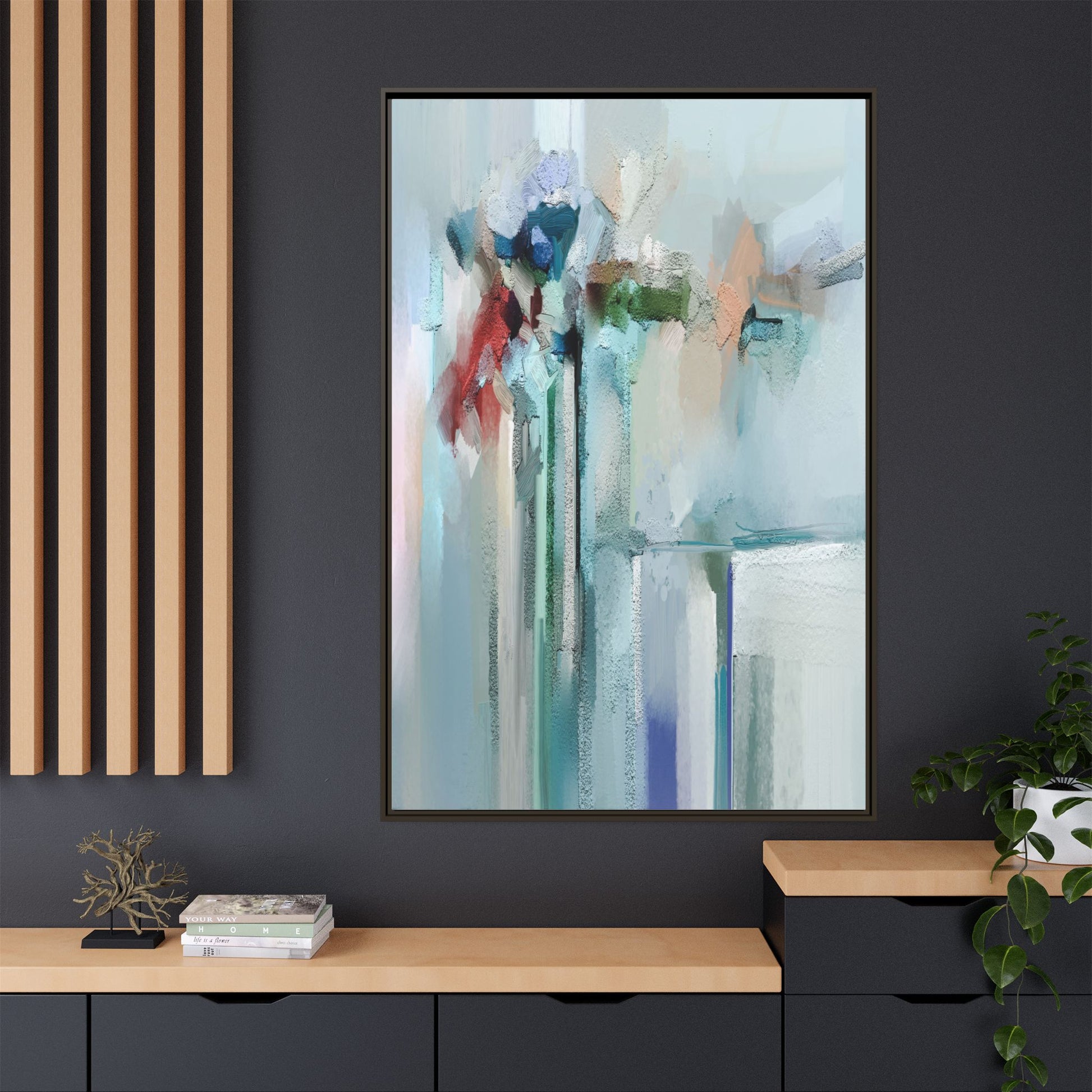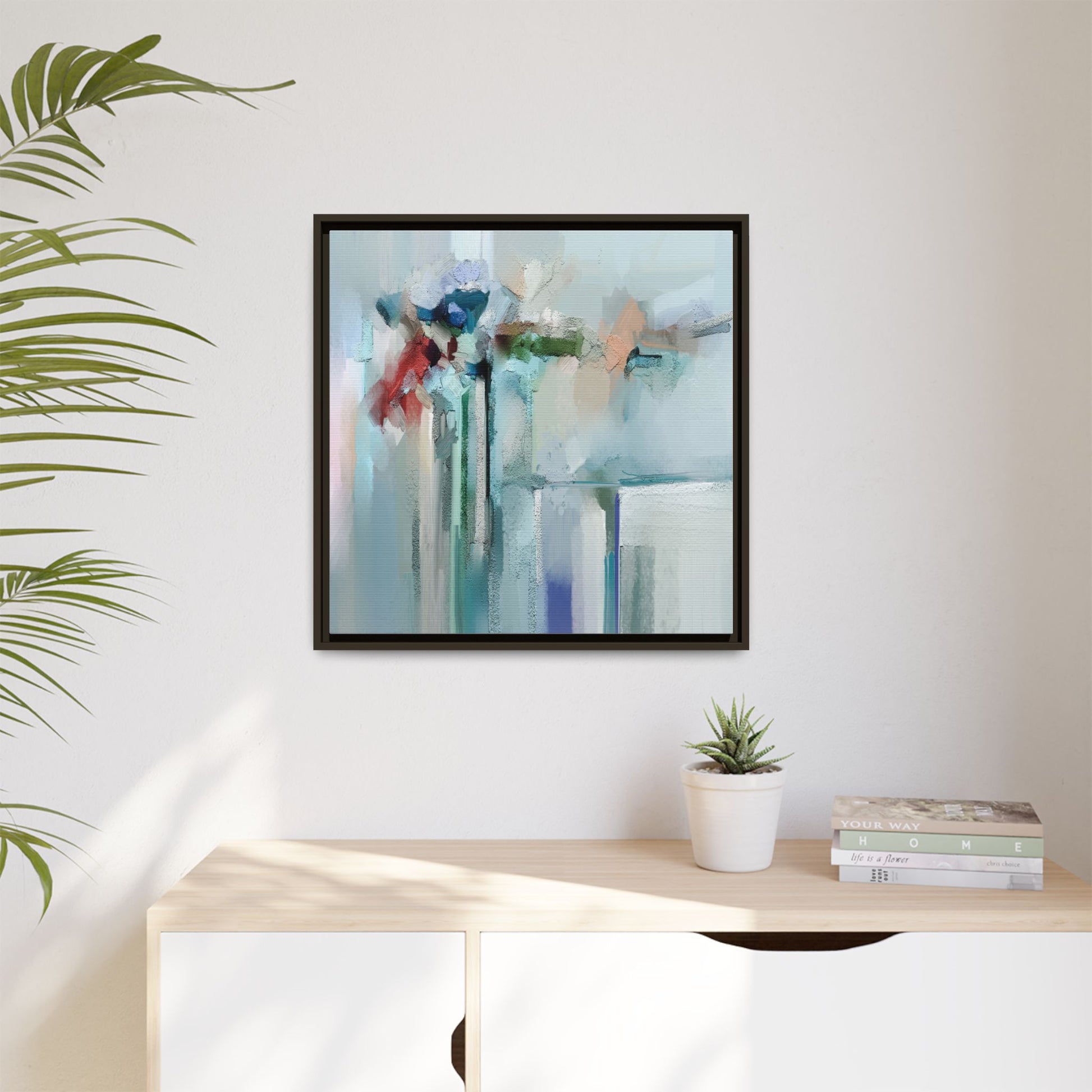 This captivating abstract painting features a soft, ethereal color palette dominated by soothing aqua, mint green, pale blue, and muted red tones. The artwork appears to be created with a textured, layered technique that creates depth and dimensionality, with visible brushstrokes and a slightly rough, impasto-like surface. Vertical elements suggest architectural or structural forms, with color blocks and vertical streams blending and intersecting across the canvas. The painting evokes a sense of tranquility and organic movement, reminiscent of a misty landscape or abstract architectural landscape. Subtle variations in texture and color create a dreamlike, contemplative atmosphere that invites viewers to explore the nuanced details and emotional resonance of the composition.