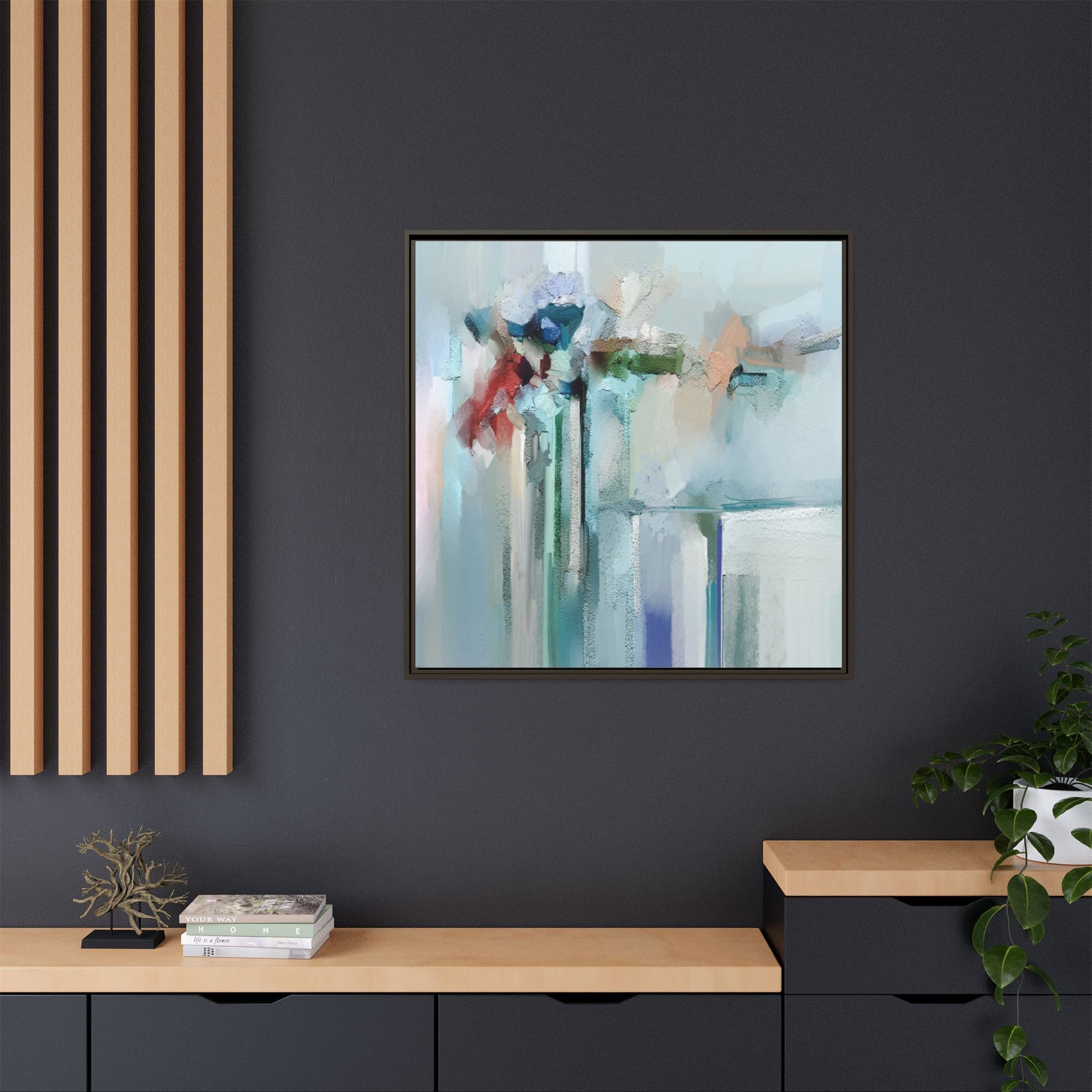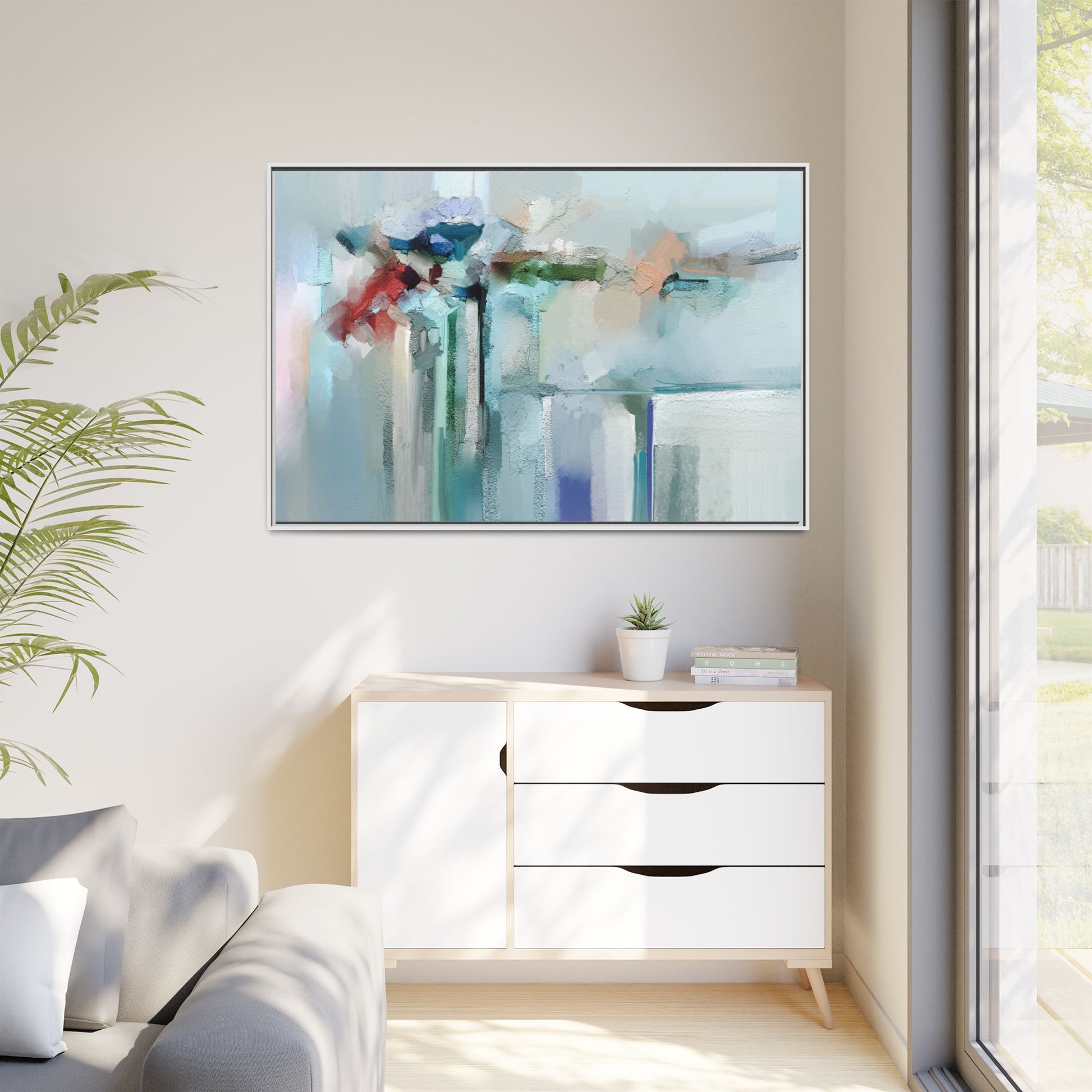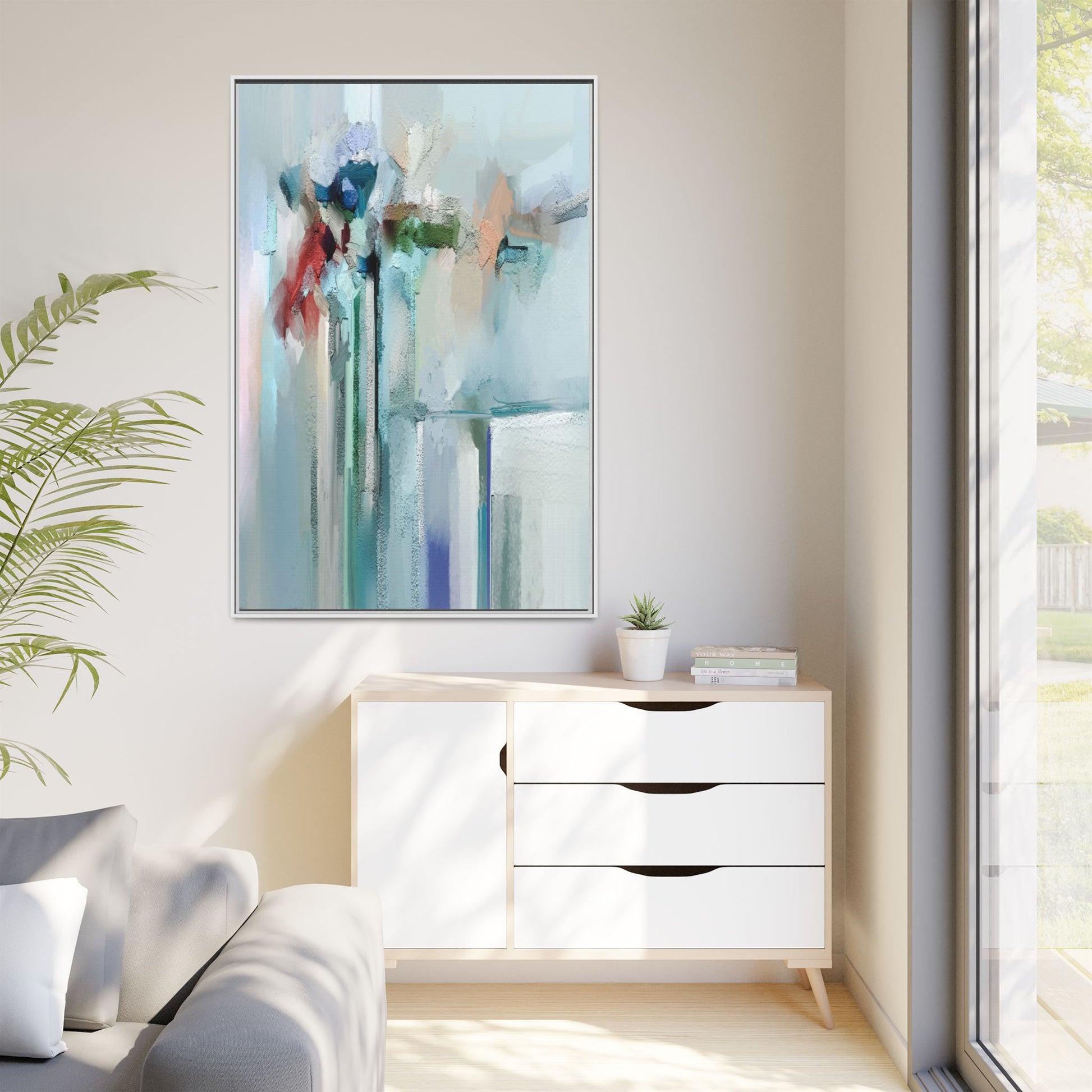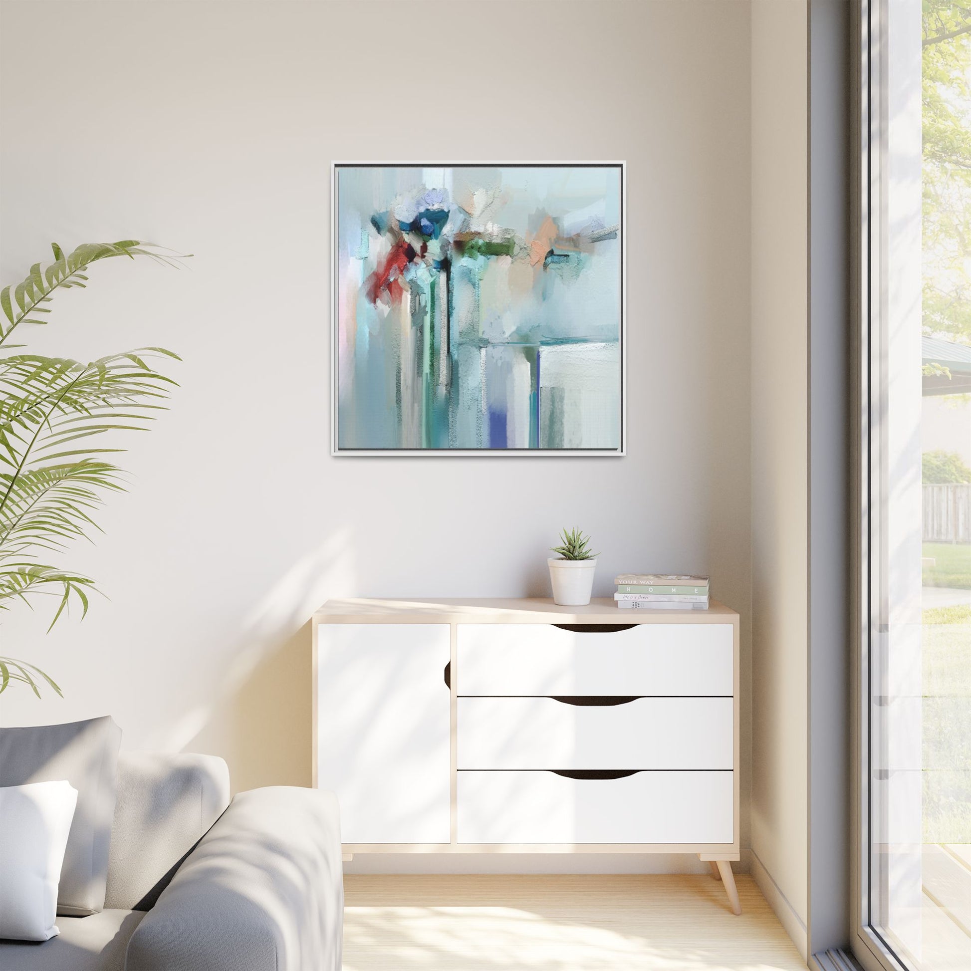 This captivating abstract painting features a soft, ethereal color palette dominated by soothing aqua, mint green, pale blue, and muted red tones. The artwork appears to be created with a textured, layered technique that creates depth and dimensionality, with visible brushstrokes and a slightly rough, impasto-like surface. Vertical elements suggest architectural or structural forms, with color blocks and vertical streams blending and intersecting across the canvas. The painting evokes a sense of tranquility and organic movement, reminiscent of a misty landscape or abstract architectural landscape. Subtle variations in texture and color create a dreamlike, contemplative atmosphere that invites viewers to explore the nuanced details and emotional resonance of the composition.