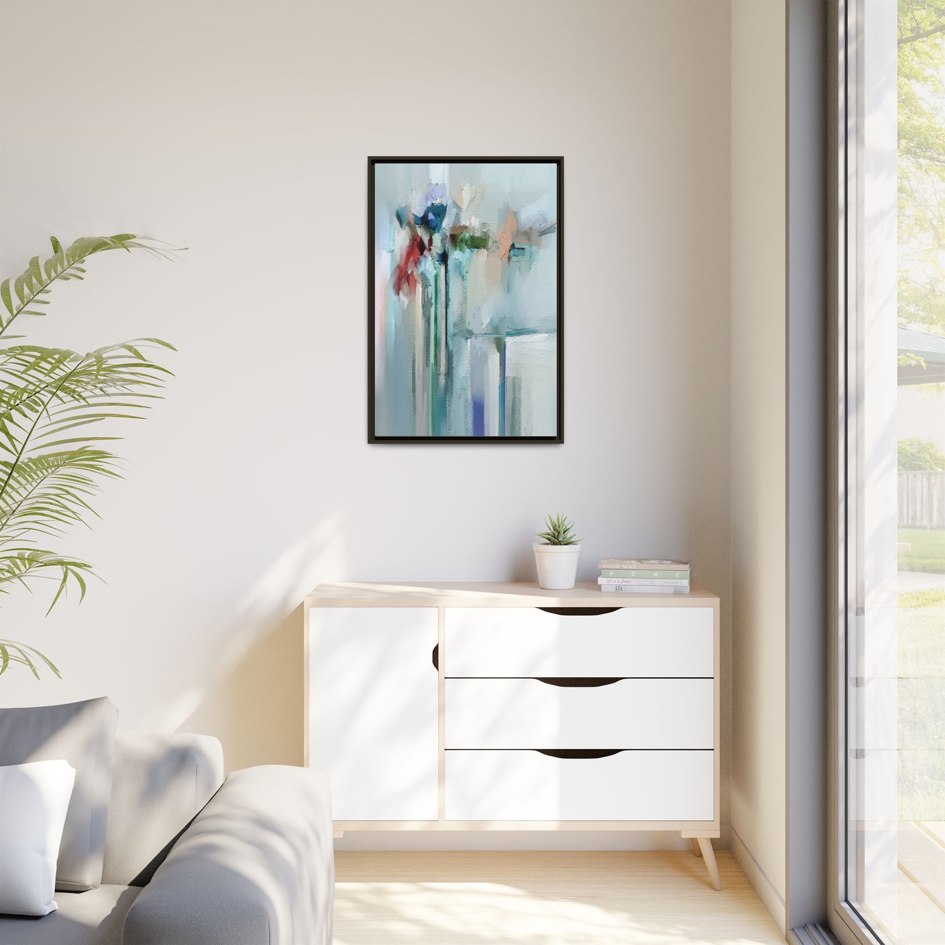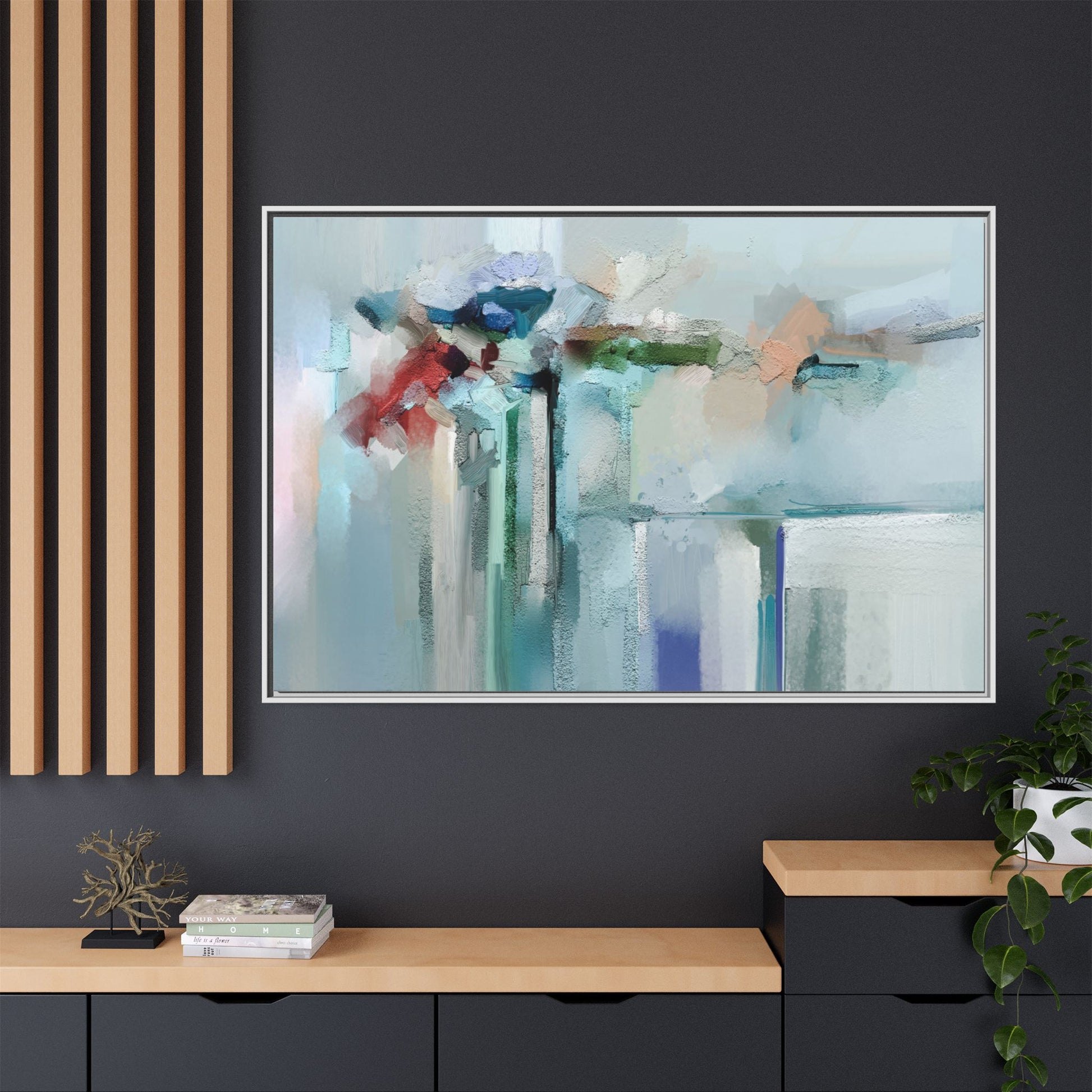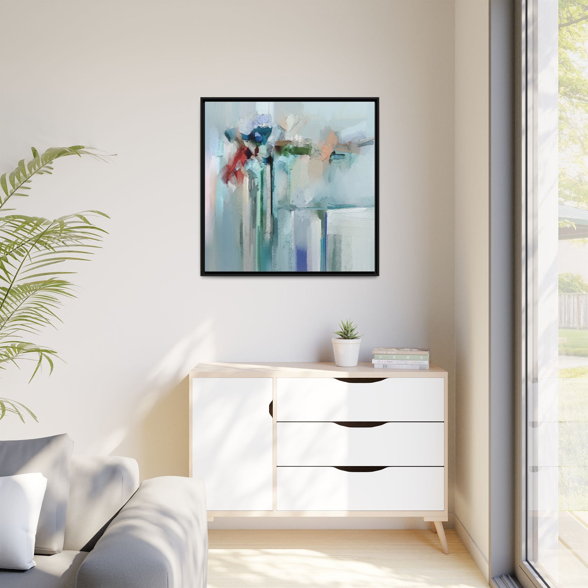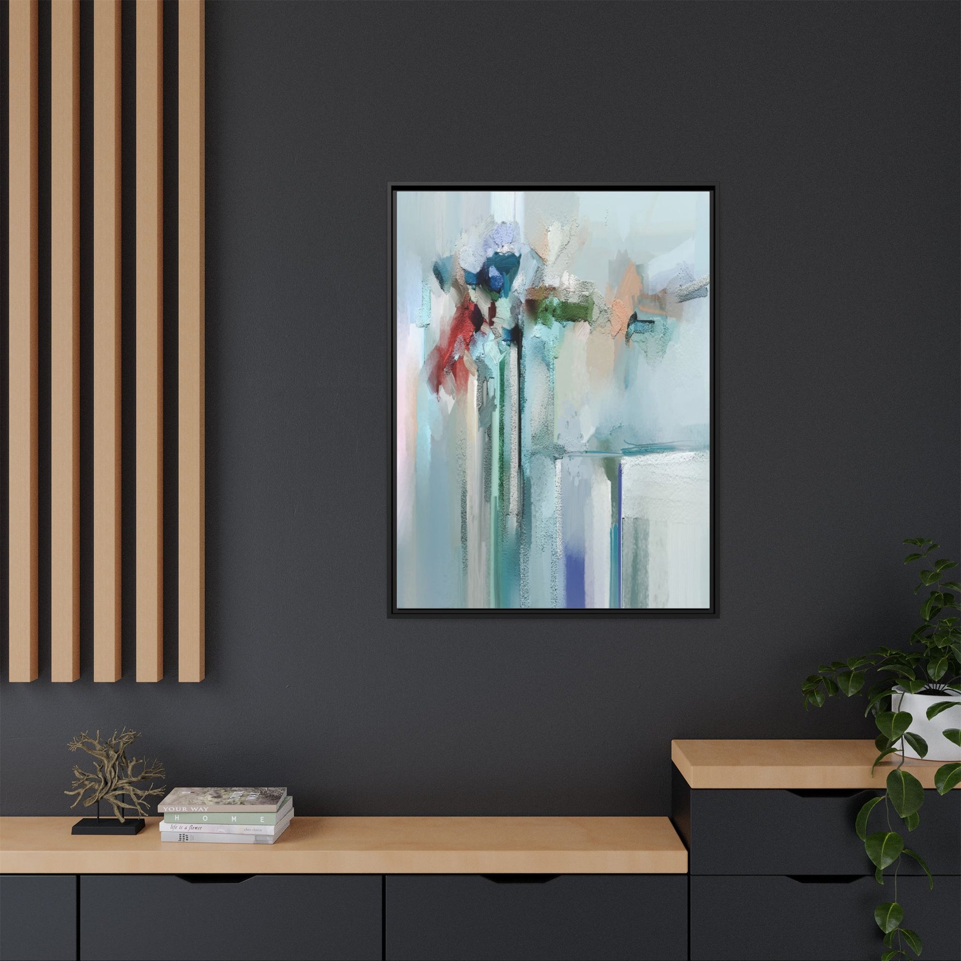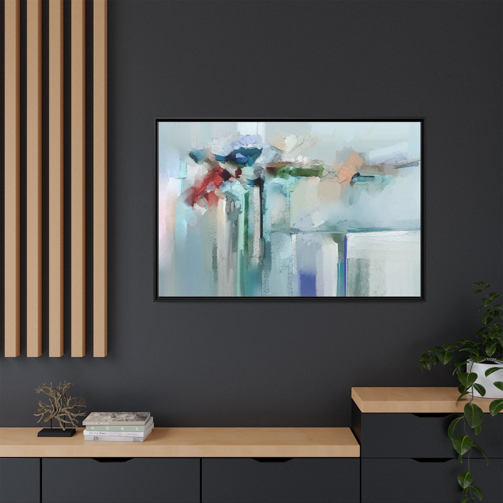 This captivating abstract painting features a soft, ethereal color palette dominated by soothing aqua, mint green, pale blue, and muted red tones. The artwork appears to be created with a textured, layered technique that creates depth and dimensionality, with visible brushstrokes and a slightly rough, impasto-like surface. Vertical elements suggest architectural or structural forms, with color blocks and vertical streams blending and intersecting across the canvas. The painting evokes a sense of tranquility and organic movement, reminiscent of a misty landscape or abstract architectural landscape. Subtle variations in texture and color create a dreamlike, contemplative atmosphere that invites viewers to explore the nuanced details and emotional resonance of the composition.