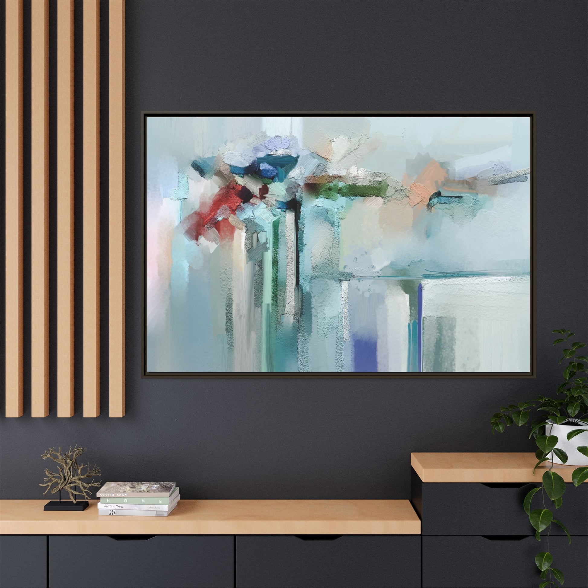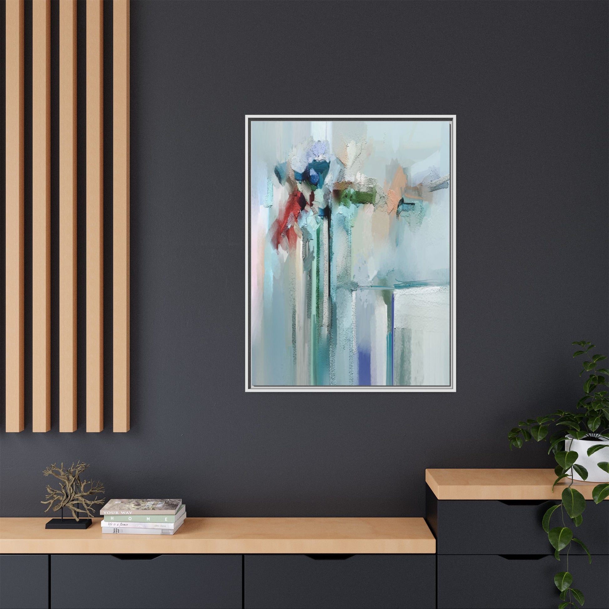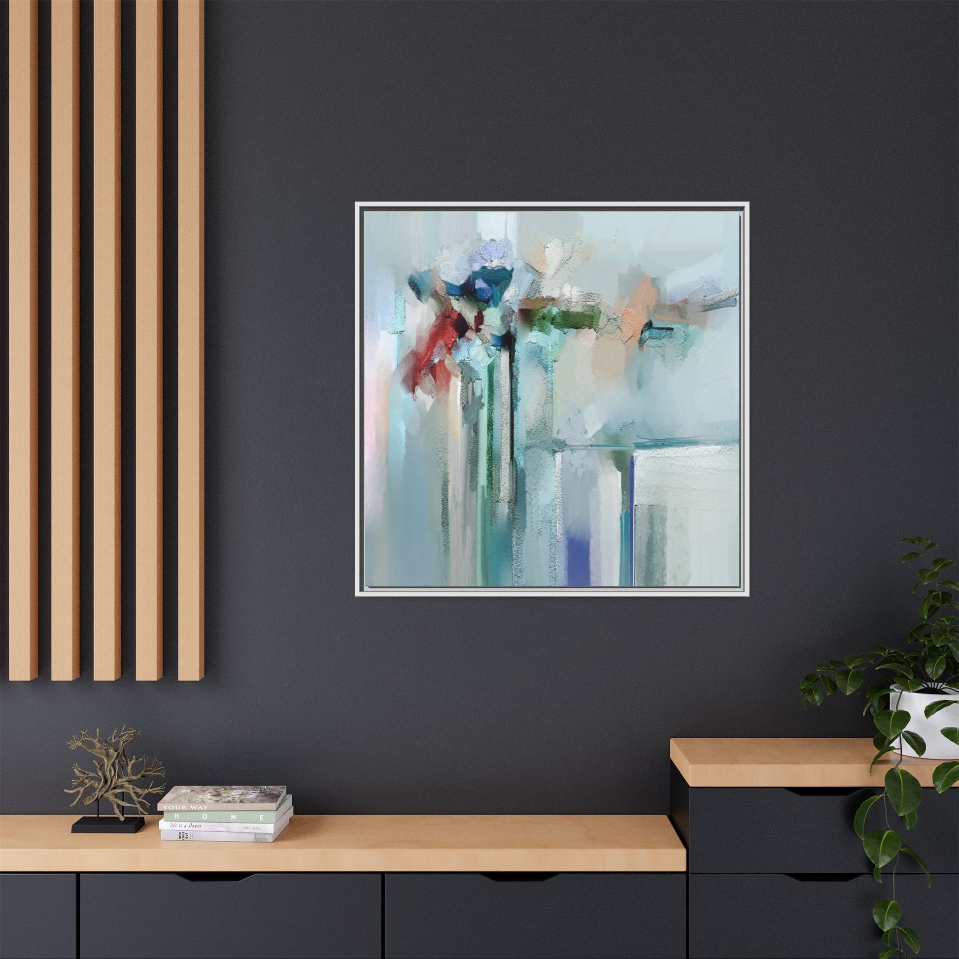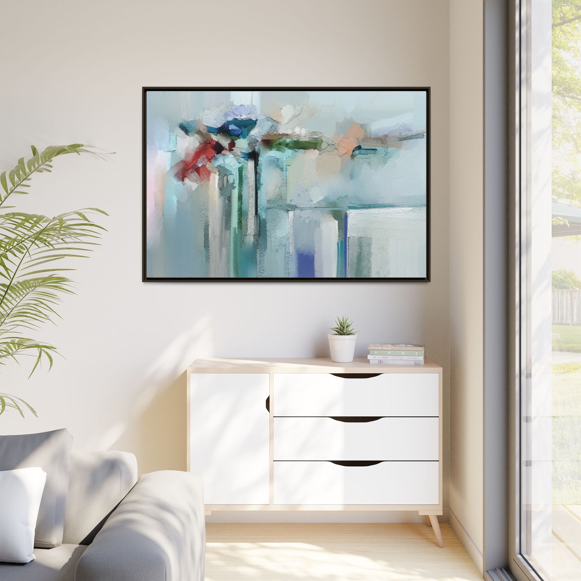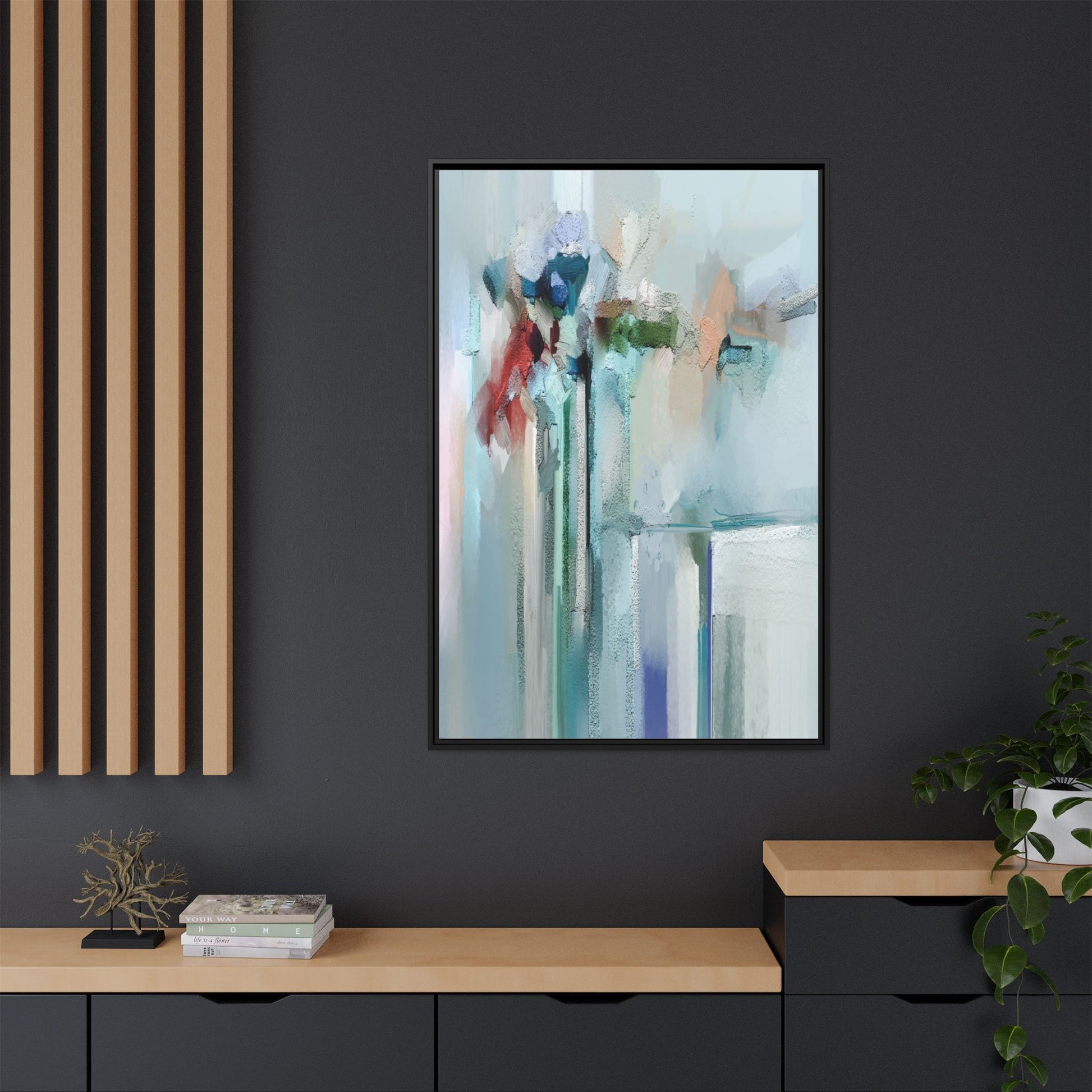 This captivating abstract painting features a soft, ethereal color palette dominated by soothing aqua, mint green, pale blue, and muted red tones. The artwork appears to be created with a textured, layered technique that creates depth and dimensionality, with visible brushstrokes and a slightly rough, impasto-like surface. Vertical elements suggest architectural or structural forms, with color blocks and vertical streams blending and intersecting across the canvas. The painting evokes a sense of tranquility and organic movement, reminiscent of a misty landscape or abstract architectural landscape. Subtle variations in texture and color create a dreamlike, contemplative atmosphere that invites viewers to explore the nuanced details and emotional resonance of the composition.