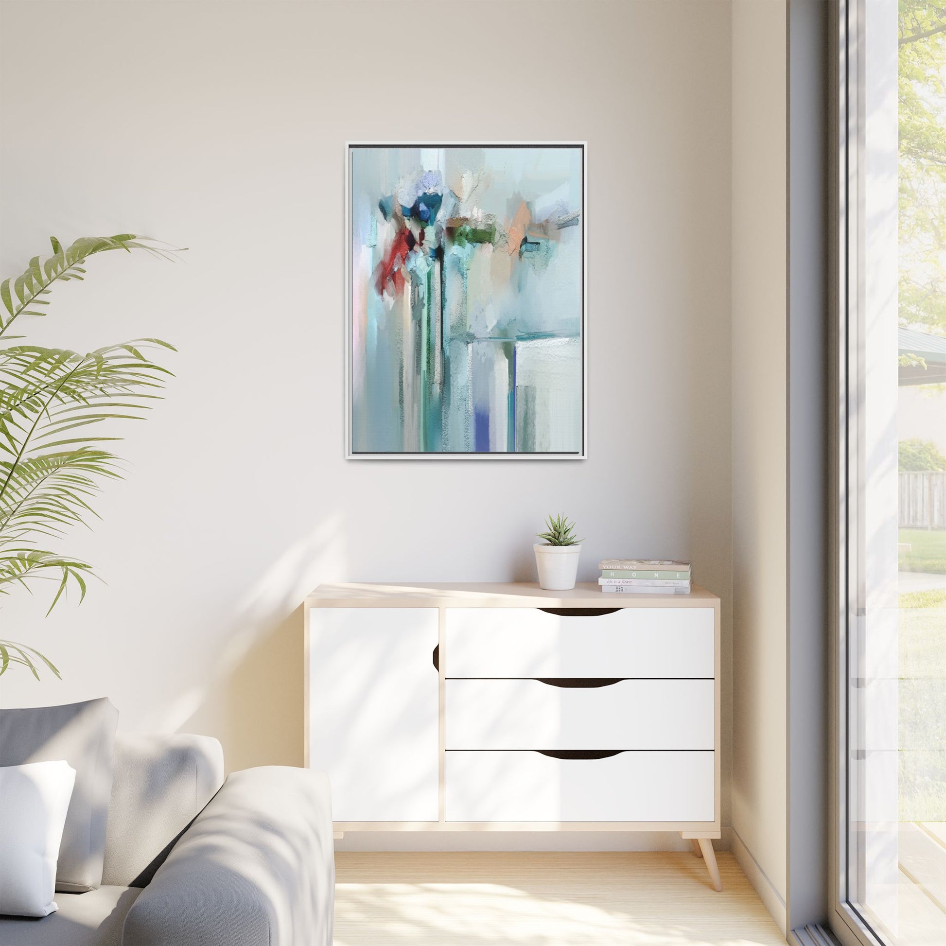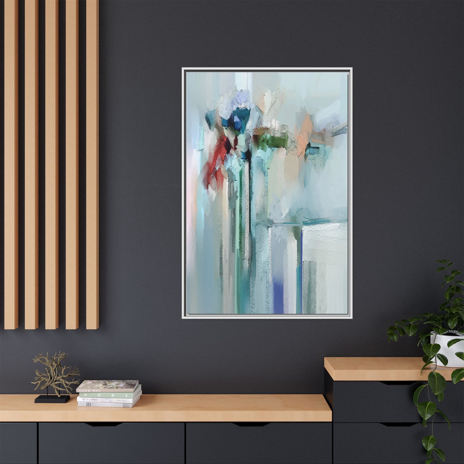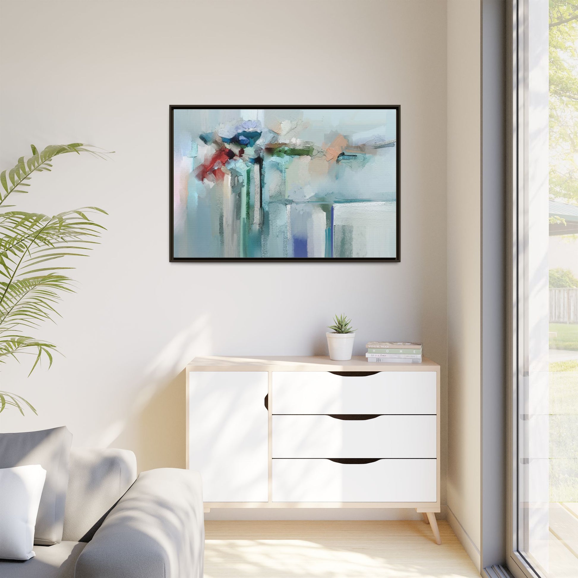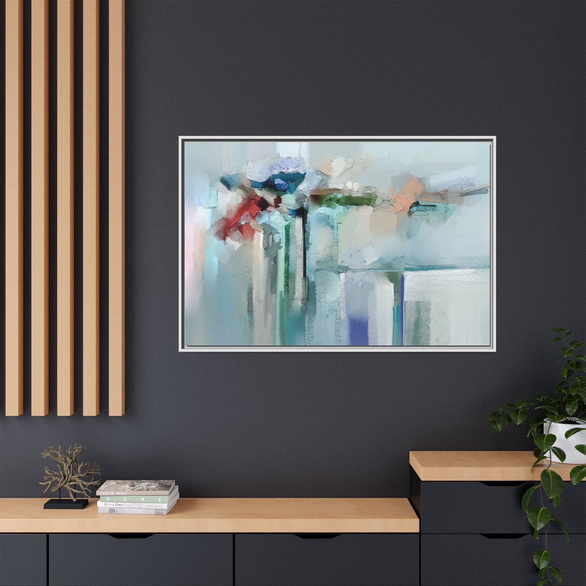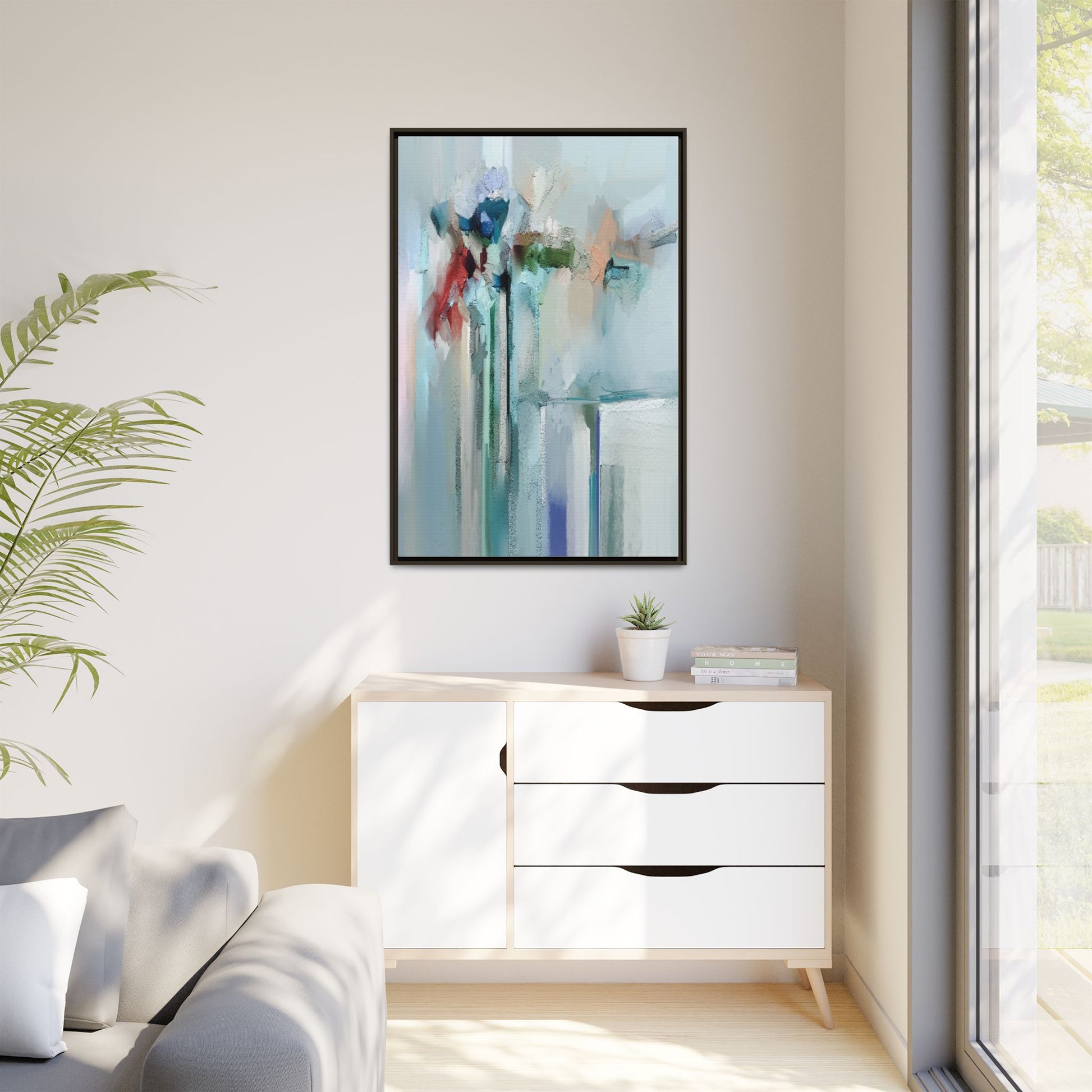 This captivating abstract painting features a soft, ethereal color palette dominated by soothing aqua, mint green, pale blue, and muted red tones. The artwork appears to be created with a textured, layered technique that creates depth and dimensionality, with visible brushstrokes and a slightly rough, impasto-like surface. Vertical elements suggest architectural or structural forms, with color blocks and vertical streams blending and intersecting across the canvas. The painting evokes a sense of tranquility and organic movement, reminiscent of a misty landscape or abstract architectural landscape. Subtle variations in texture and color create a dreamlike, contemplative atmosphere that invites viewers to explore the nuanced details and emotional resonance of the composition.