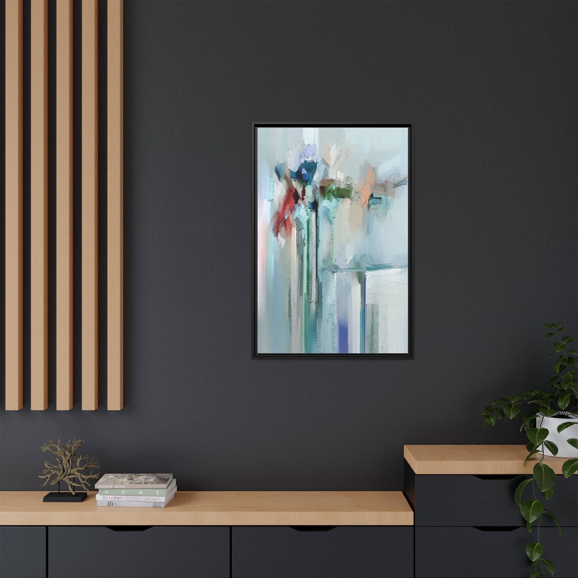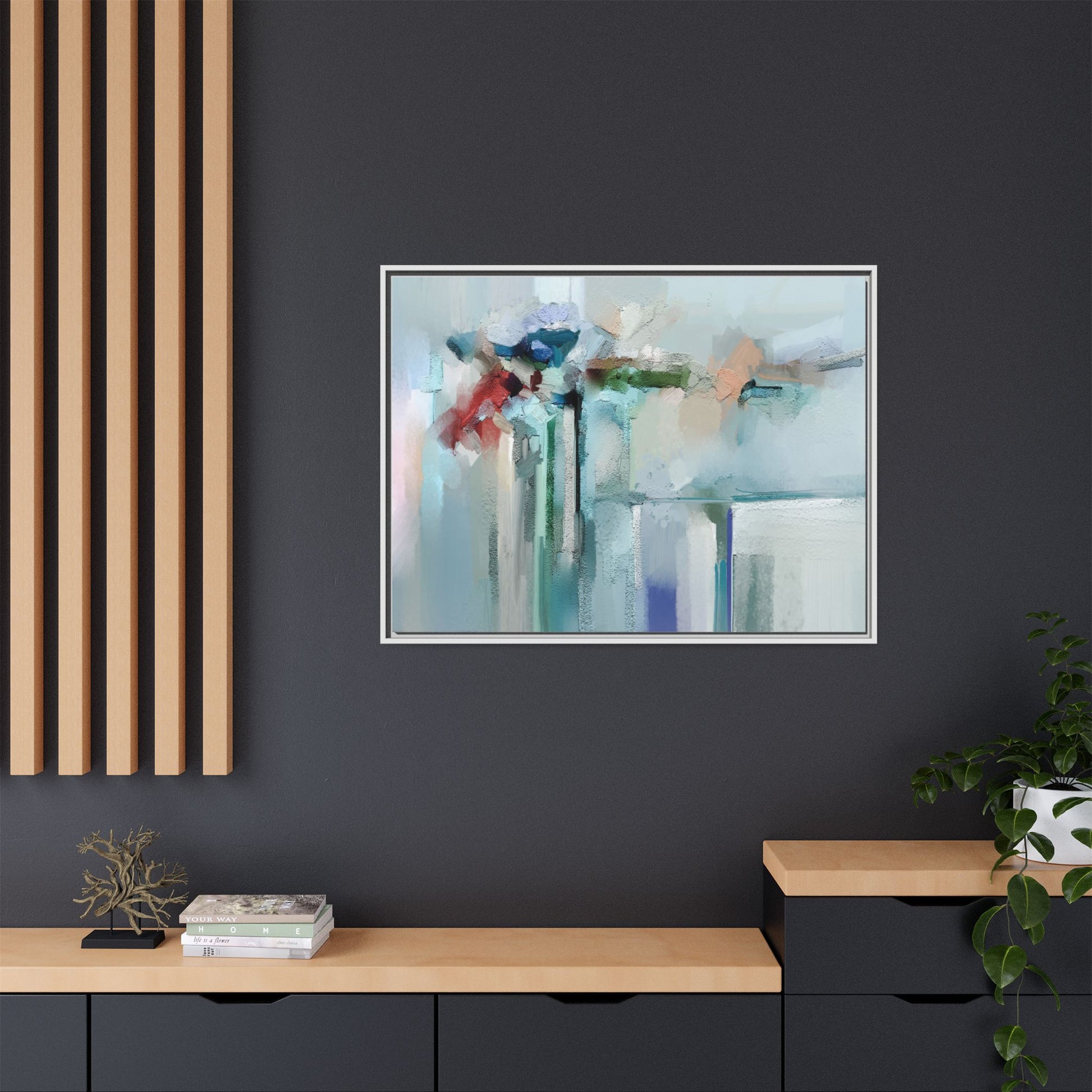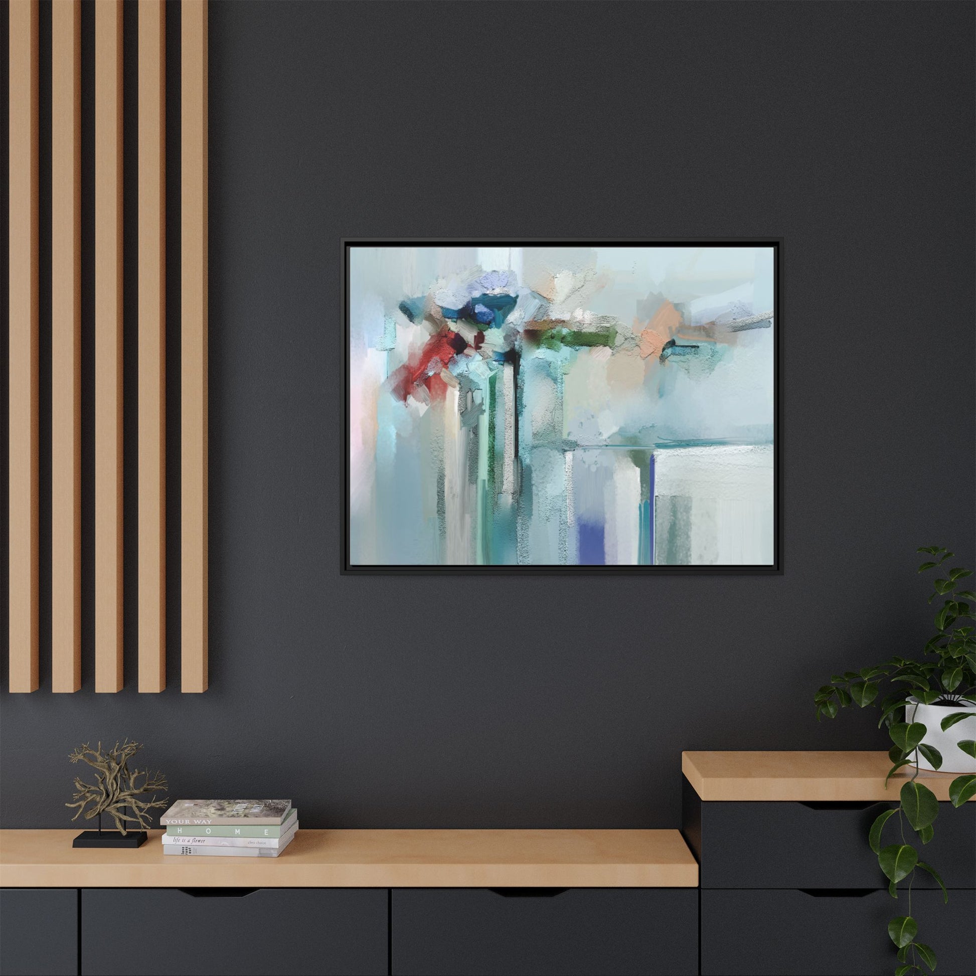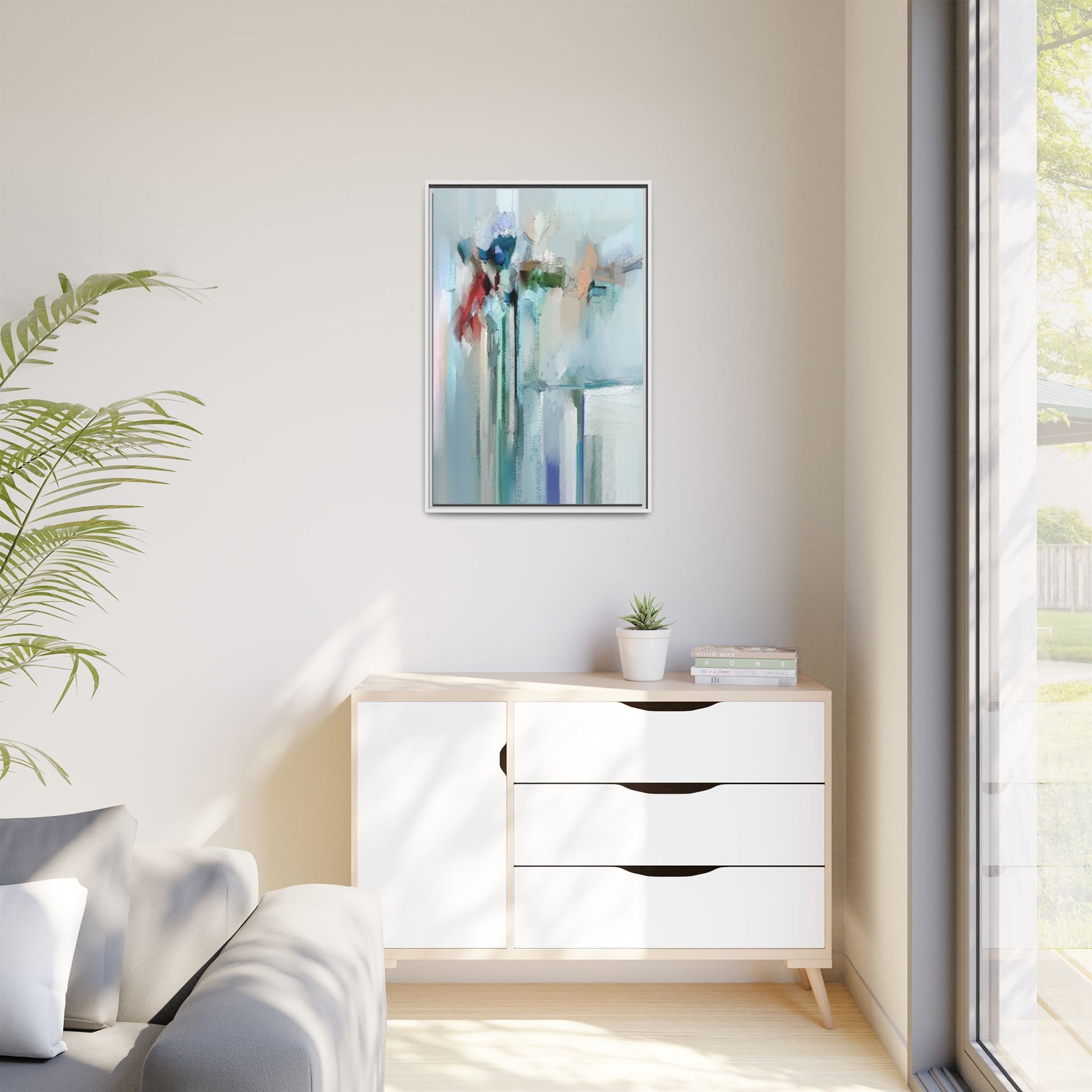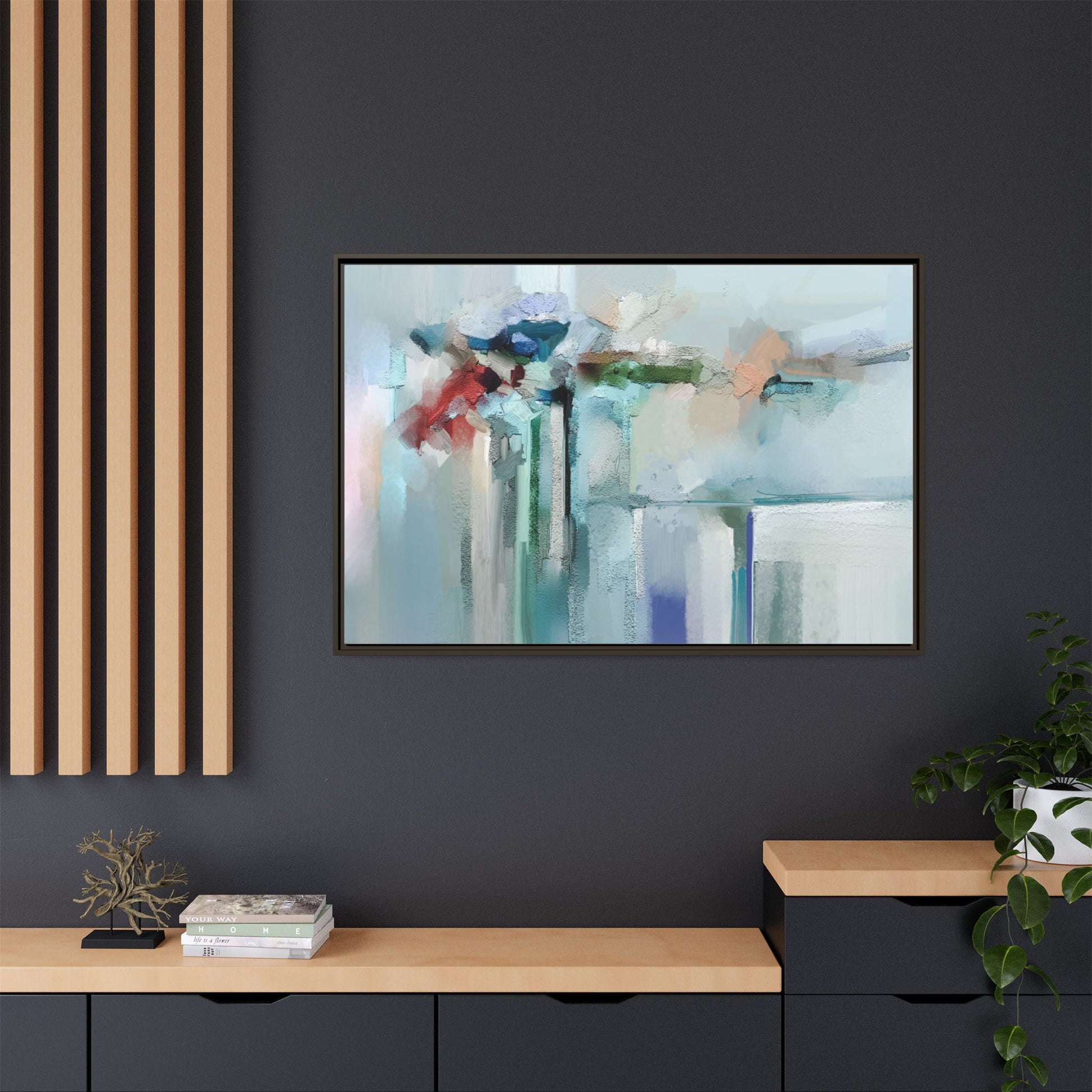 This captivating abstract painting features a soft, ethereal color palette dominated by soothing aqua, mint green, pale blue, and muted red tones. The artwork appears to be created with a textured, layered technique that creates depth and dimensionality, with visible brushstrokes and a slightly rough, impasto-like surface. Vertical elements suggest architectural or structural forms, with color blocks and vertical streams blending and intersecting across the canvas. The painting evokes a sense of tranquility and organic movement, reminiscent of a misty landscape or abstract architectural landscape. Subtle variations in texture and color create a dreamlike, contemplative atmosphere that invites viewers to explore the nuanced details and emotional resonance of the composition.