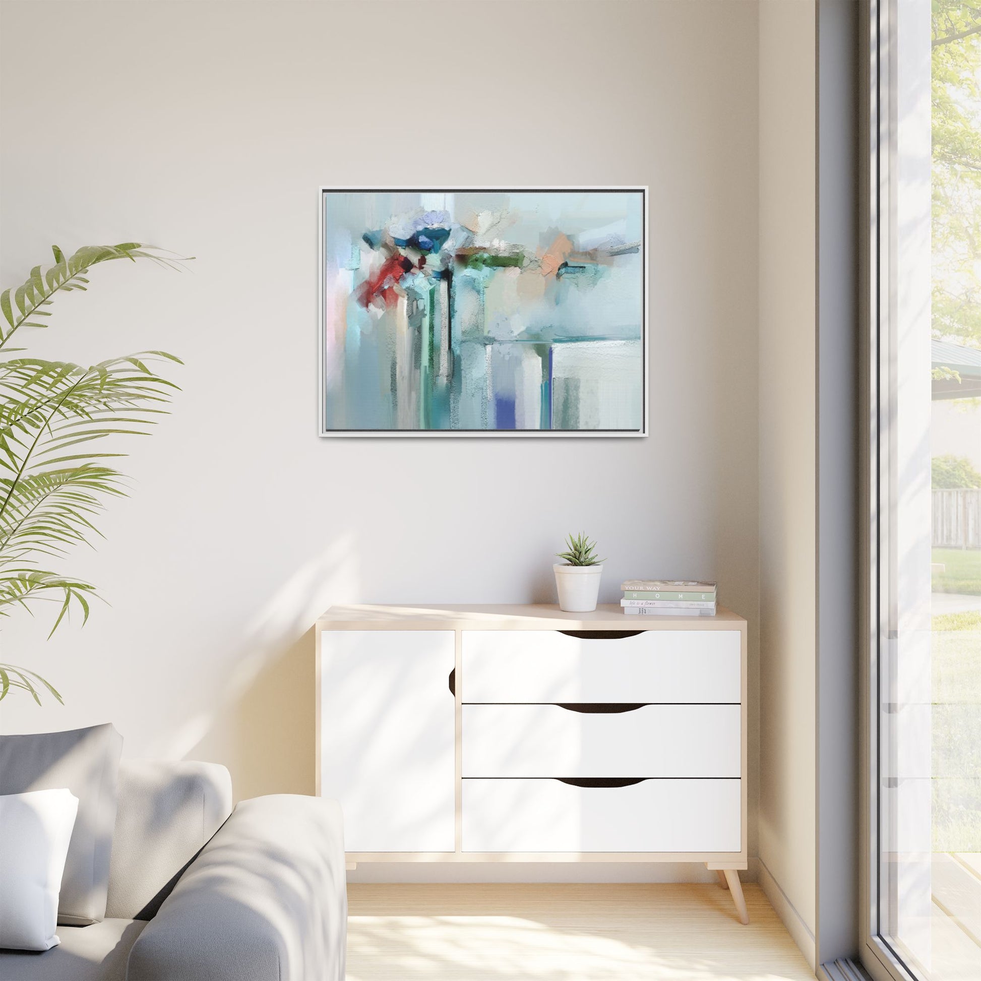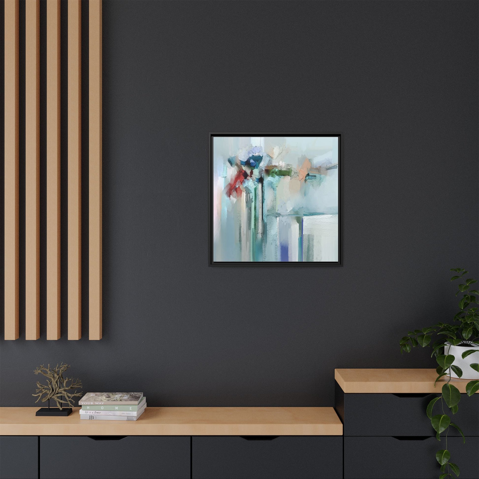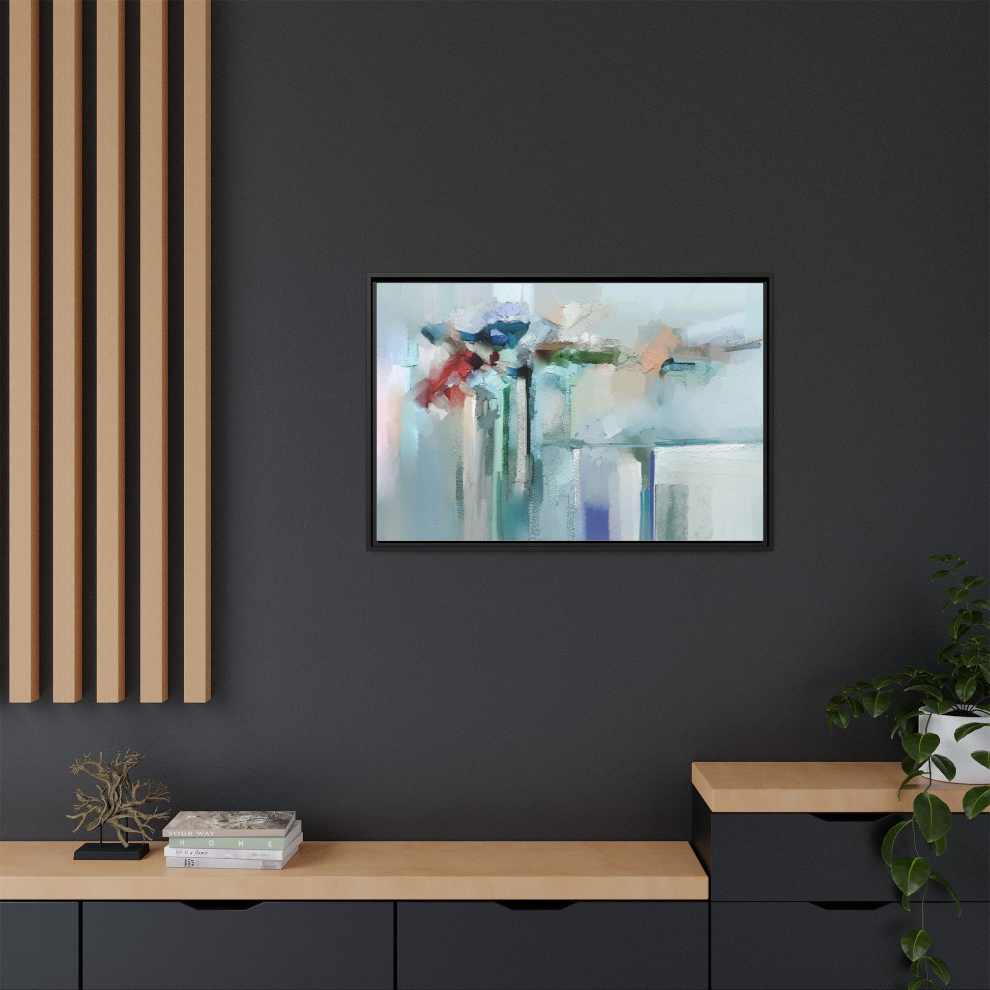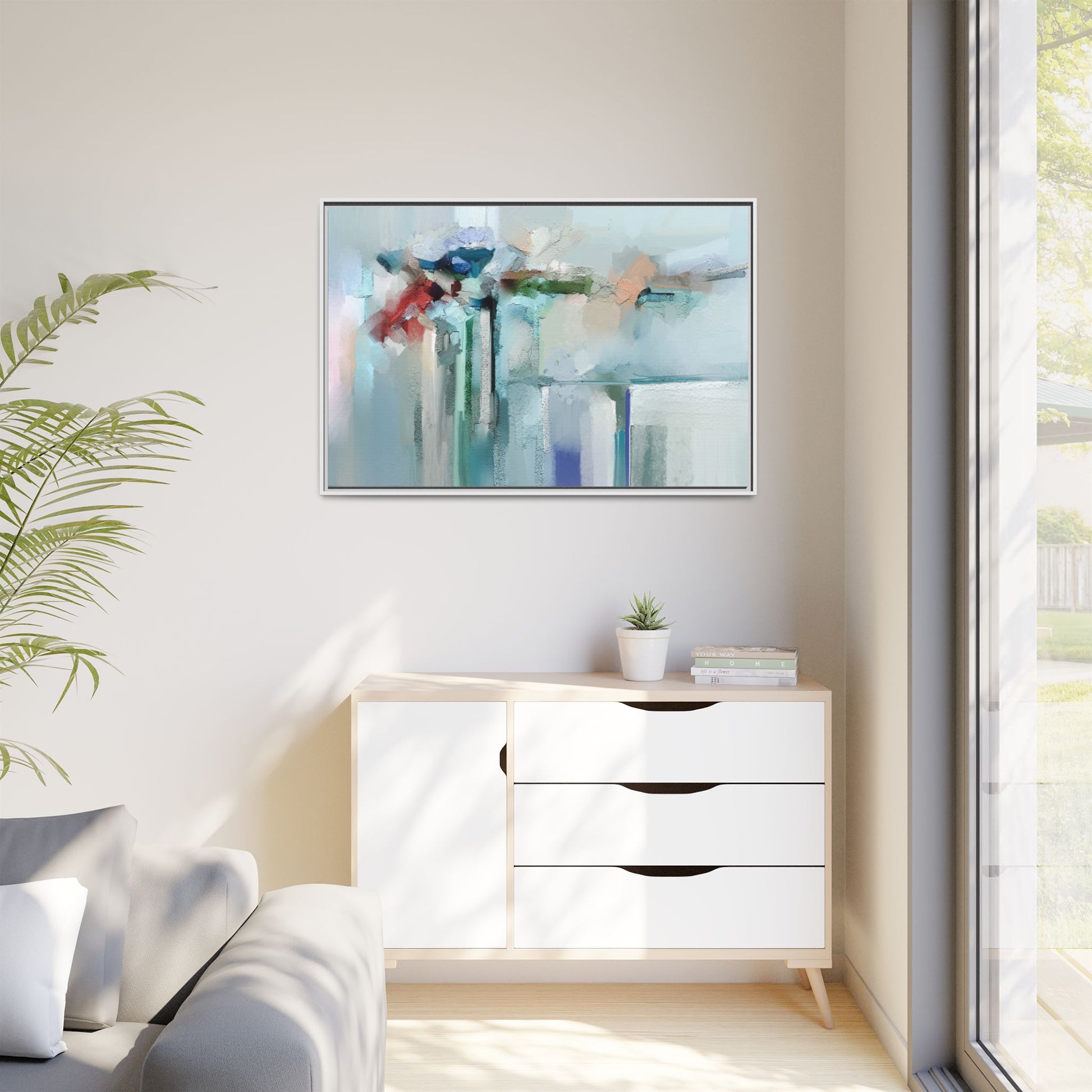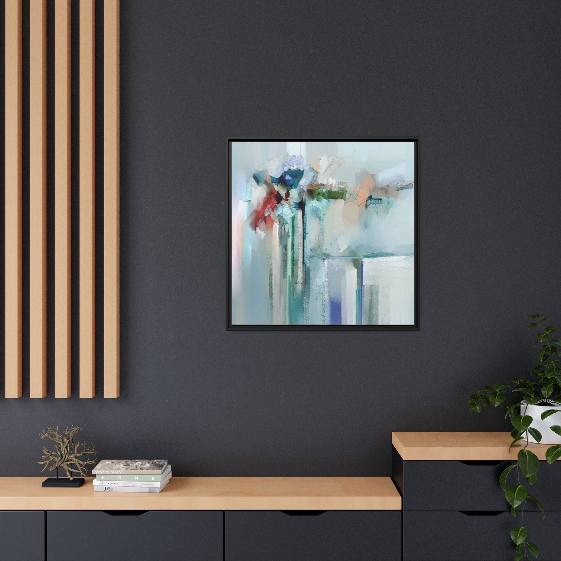 This captivating abstract painting features a soft, ethereal color palette dominated by soothing aqua, mint green, pale blue, and muted red tones. The artwork appears to be created with a textured, layered technique that creates depth and dimensionality, with visible brushstrokes and a slightly rough, impasto-like surface. Vertical elements suggest architectural or structural forms, with color blocks and vertical streams blending and intersecting across the canvas. The painting evokes a sense of tranquility and organic movement, reminiscent of a misty landscape or abstract architectural landscape. Subtle variations in texture and color create a dreamlike, contemplative atmosphere that invites viewers to explore the nuanced details and emotional resonance of the composition.