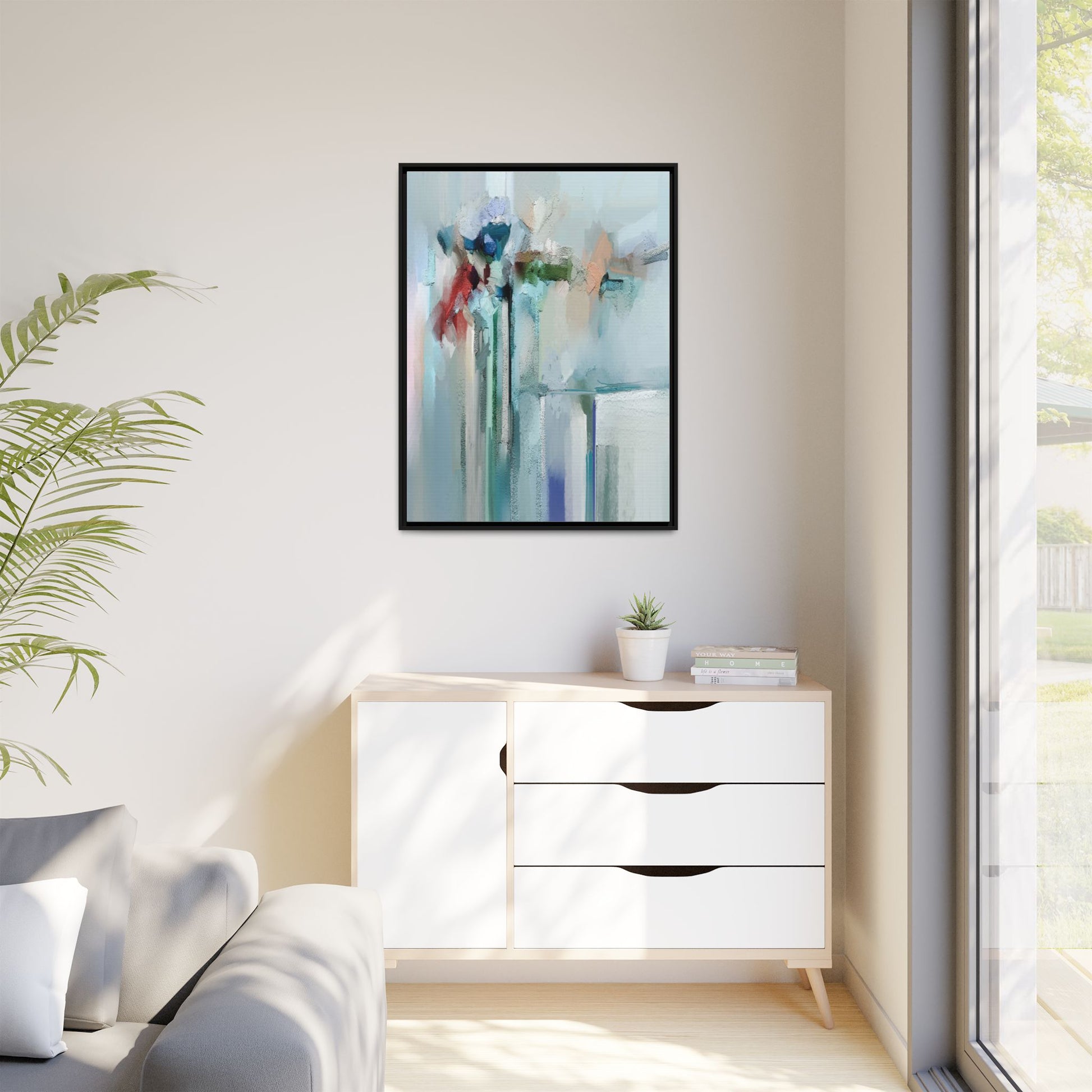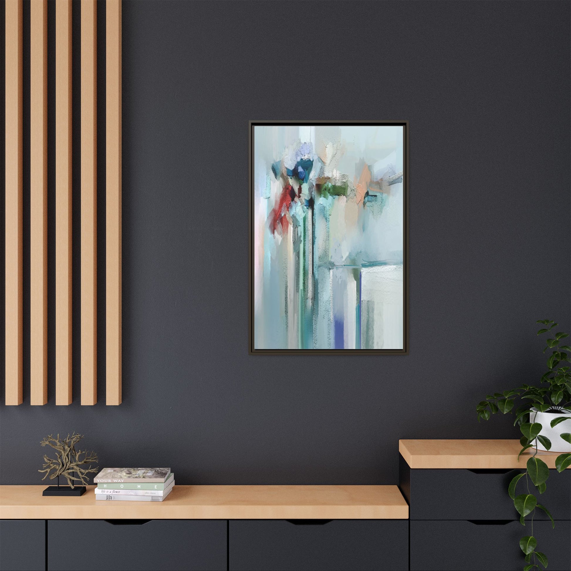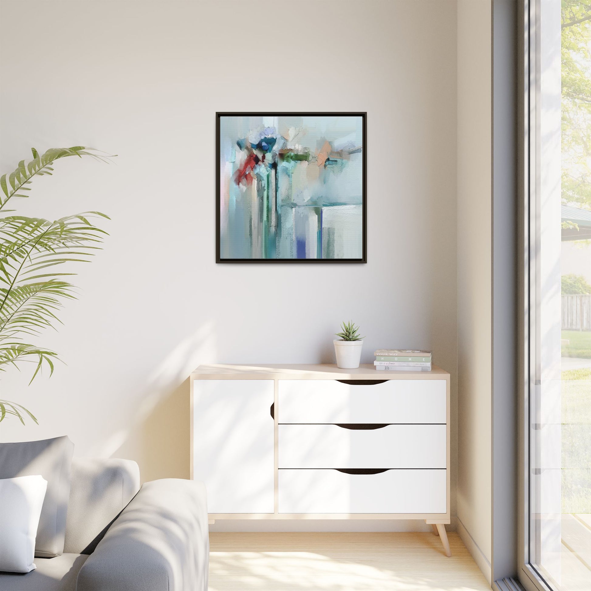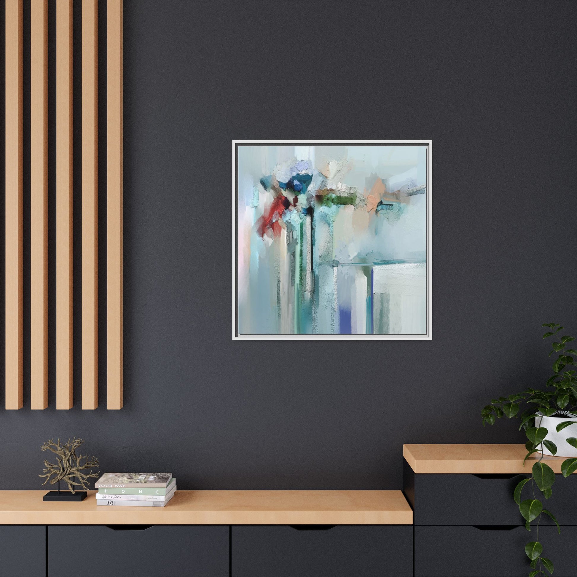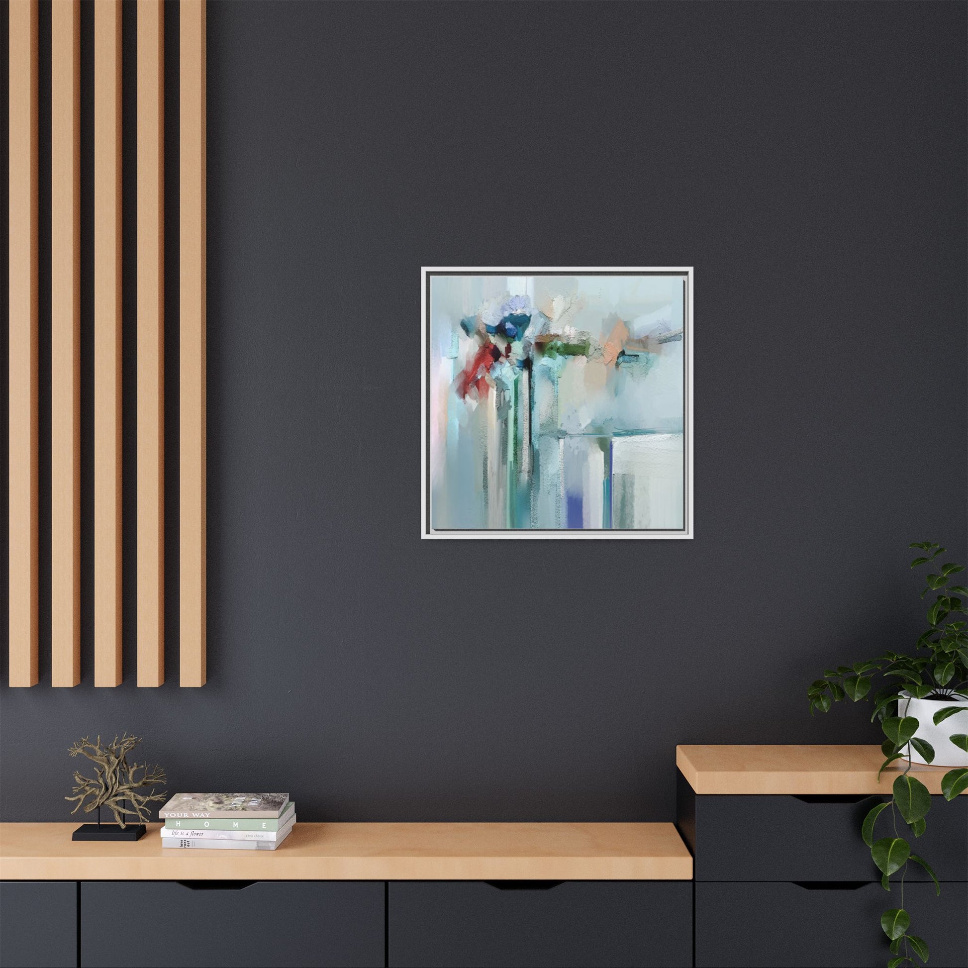 This captivating abstract painting features a soft, ethereal color palette dominated by soothing aqua, mint green, pale blue, and muted red tones. The artwork appears to be created with a textured, layered technique that creates depth and dimensionality, with visible brushstrokes and a slightly rough, impasto-like surface. Vertical elements suggest architectural or structural forms, with color blocks and vertical streams blending and intersecting across the canvas. The painting evokes a sense of tranquility and organic movement, reminiscent of a misty landscape or abstract architectural landscape. Subtle variations in texture and color create a dreamlike, contemplative atmosphere that invites viewers to explore the nuanced details and emotional resonance of the composition.