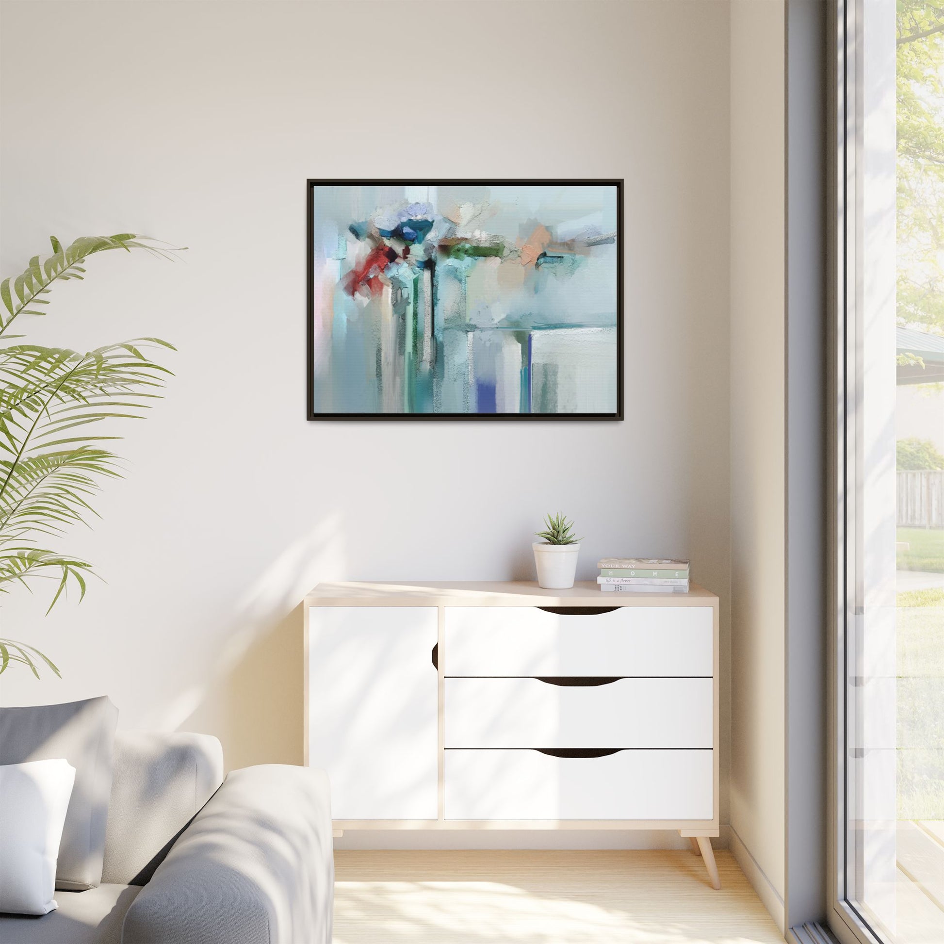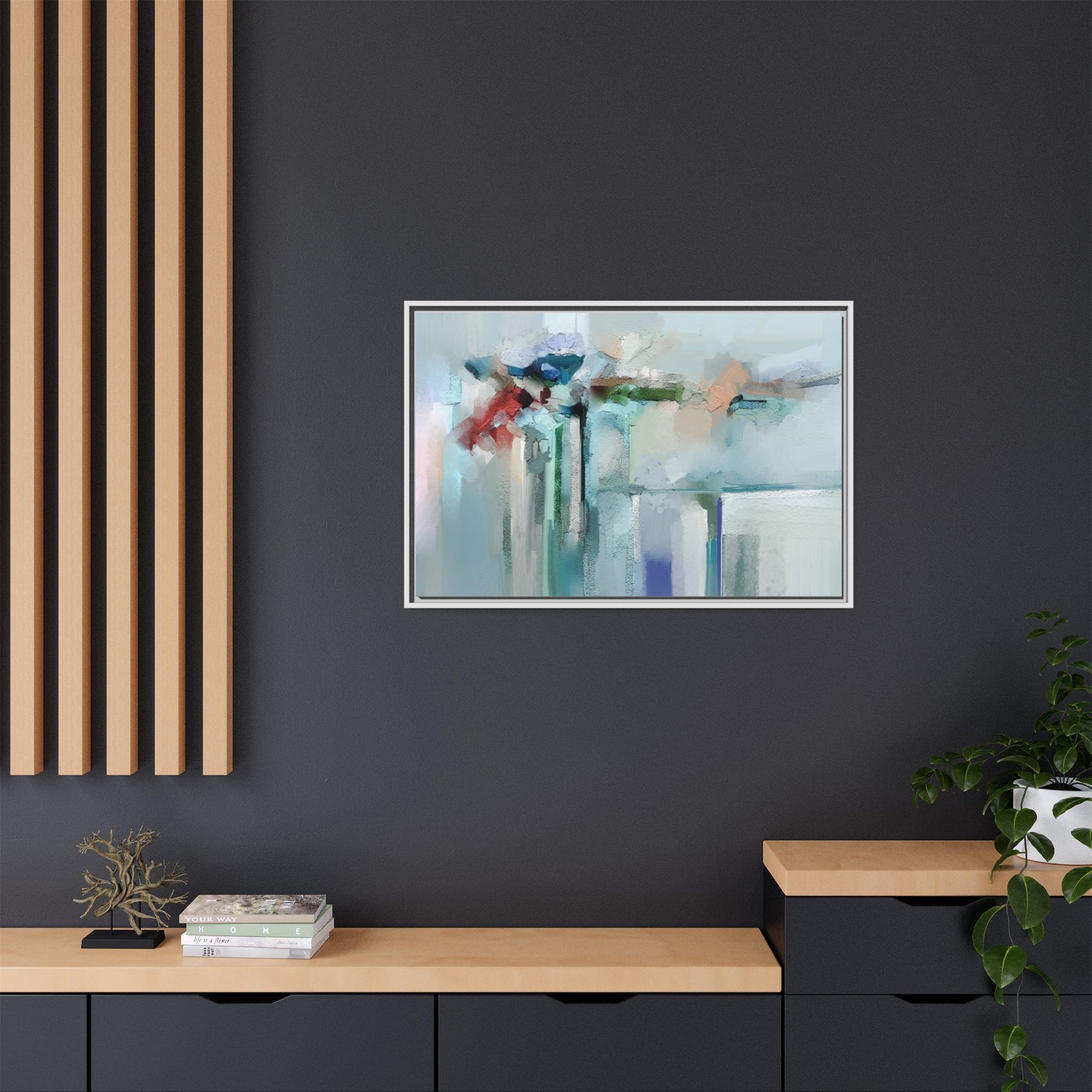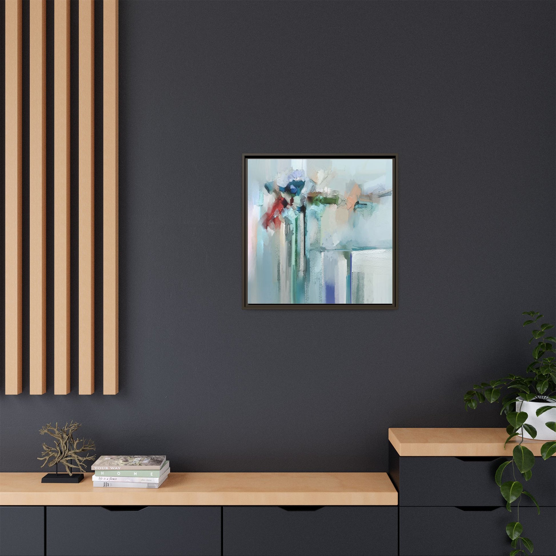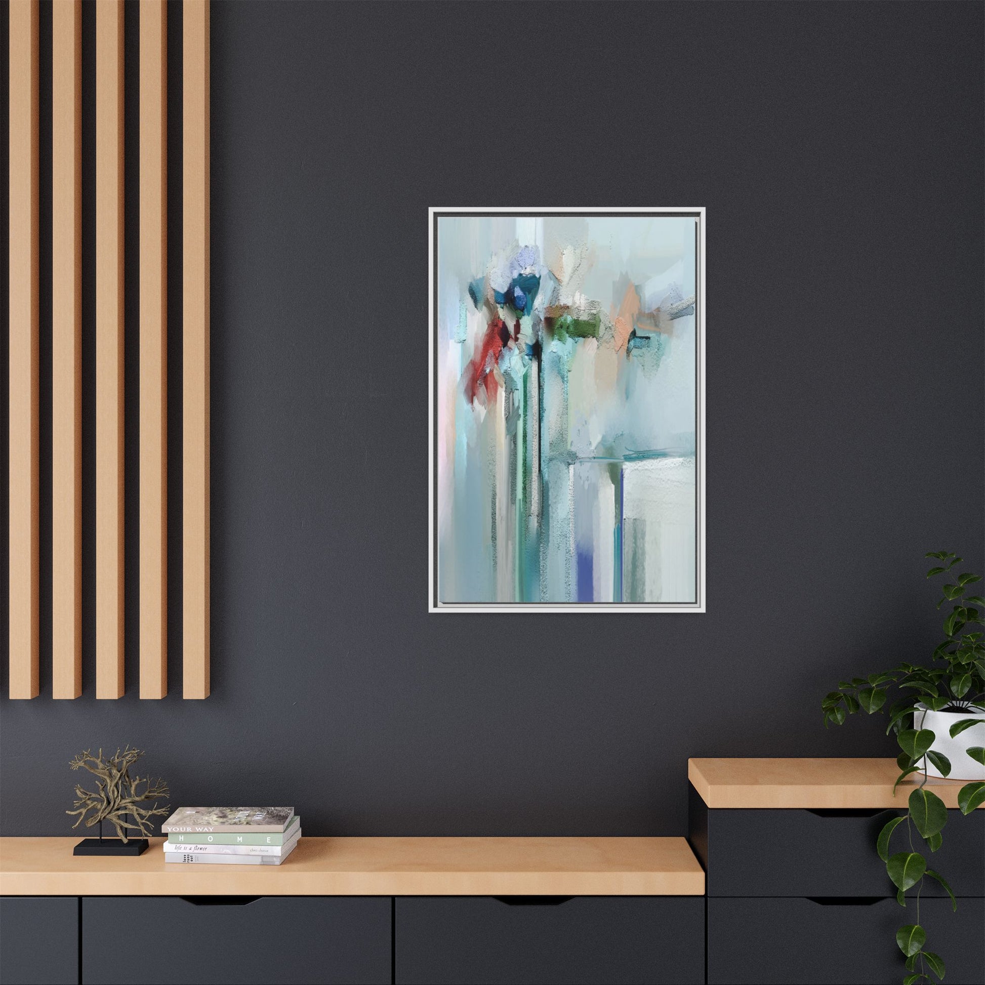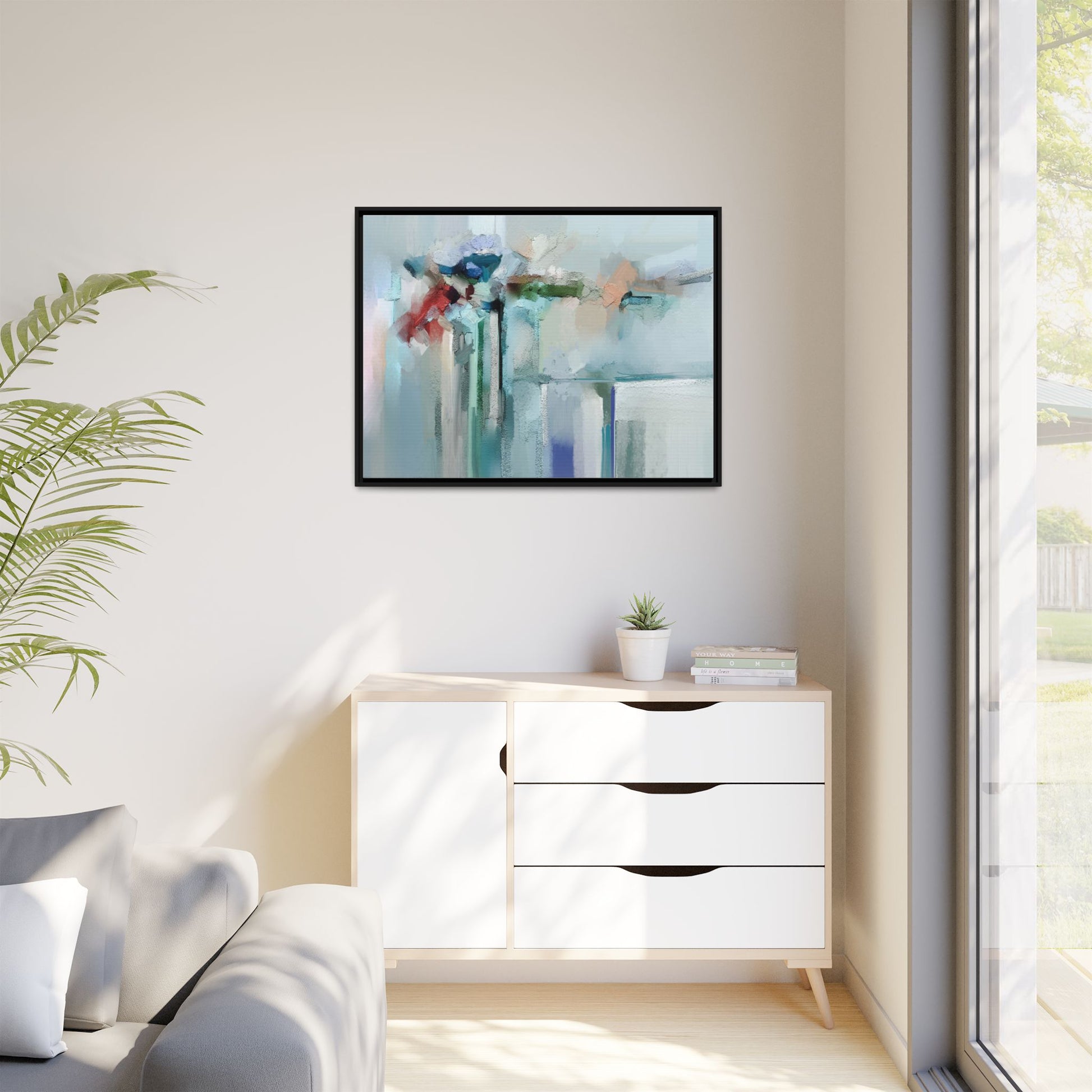 This captivating abstract painting features a soft, ethereal color palette dominated by soothing aqua, mint green, pale blue, and muted red tones. The artwork appears to be created with a textured, layered technique that creates depth and dimensionality, with visible brushstrokes and a slightly rough, impasto-like surface. Vertical elements suggest architectural or structural forms, with color blocks and vertical streams blending and intersecting across the canvas. The painting evokes a sense of tranquility and organic movement, reminiscent of a misty landscape or abstract architectural landscape. Subtle variations in texture and color create a dreamlike, contemplative atmosphere that invites viewers to explore the nuanced details and emotional resonance of the composition.