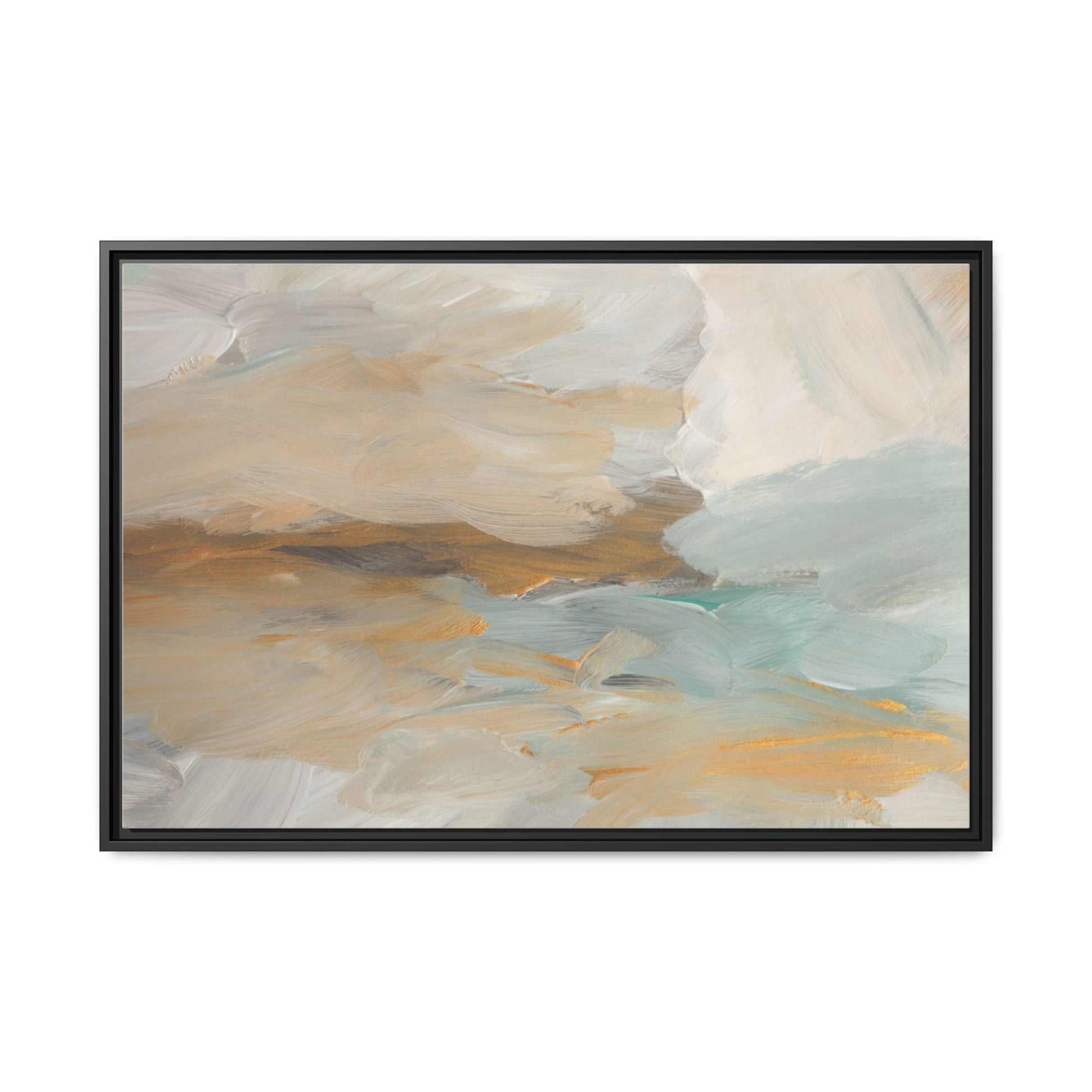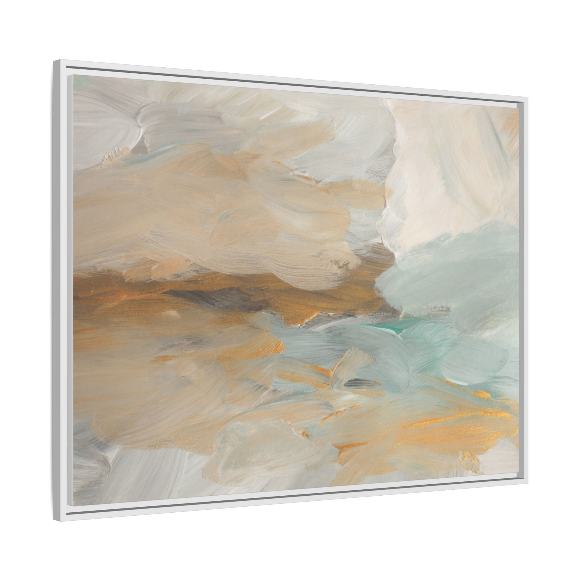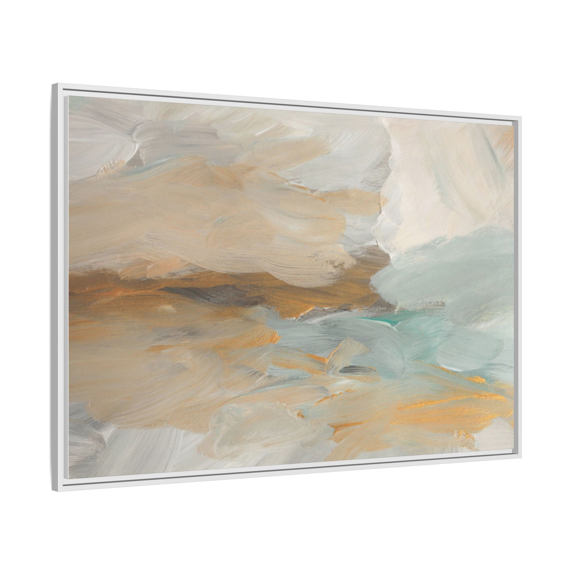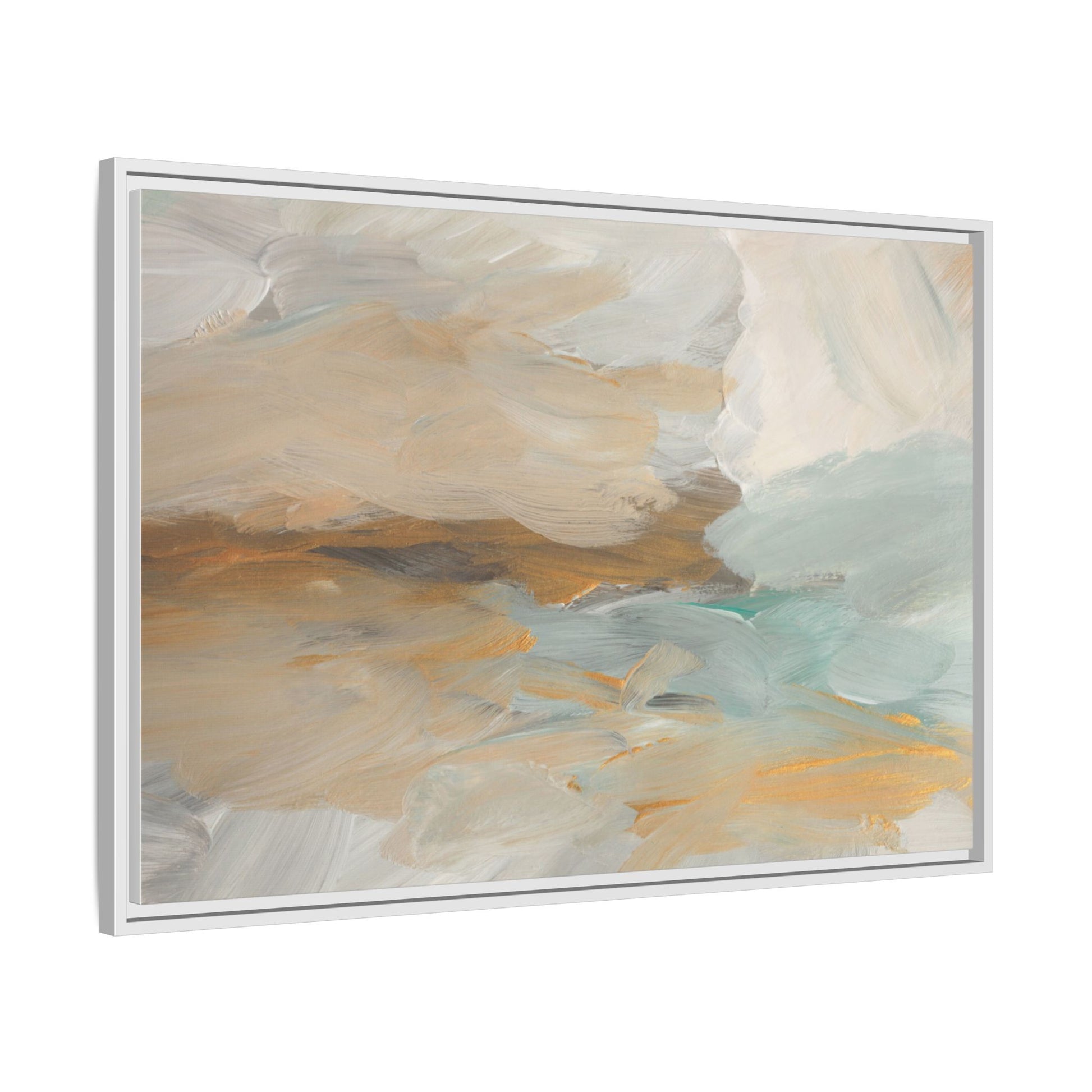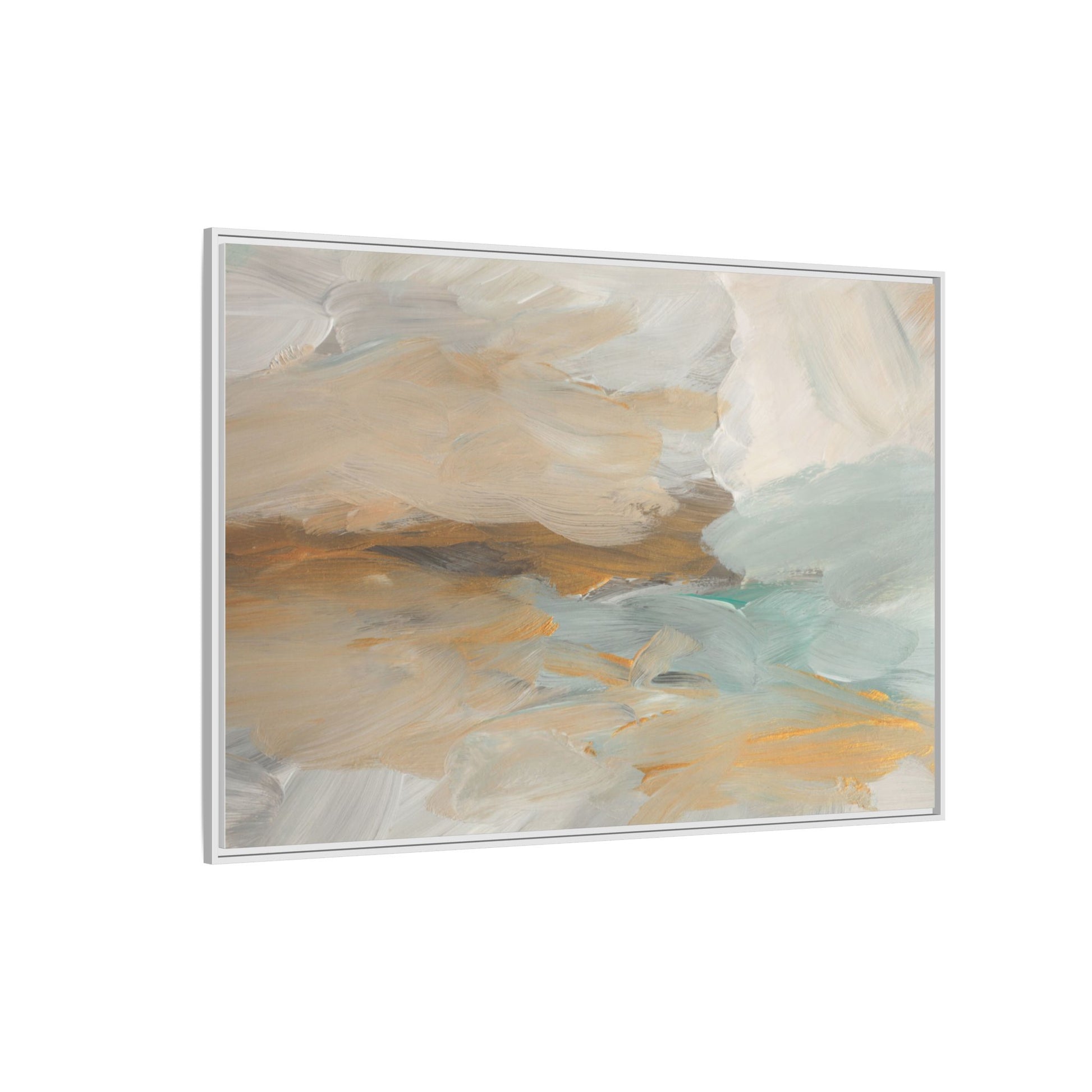 This abstract landscape painting showcases a serene and ethereal composition of soft, blended colors. Sweeping brushstrokes in muted tones of beige, white, golden yellow, and seafoam green create a dreamy, atmospheric effect reminiscent of a misty horizon or distant landscape. The painting's fluid technique allows colors to blend and flow into each other, creating subtle transitions and depth that evoke a sense of tranquility and natural movement. Textural brushwork adds dimension and visual interest, with each stroke revealing layers of color and creating a sense of organic, almost geological formation. The artwork's gentle color palette and abstract style invite viewers to interpret the scene through their own emotional and visual lens, suggesting a meditative and expansive landscape.