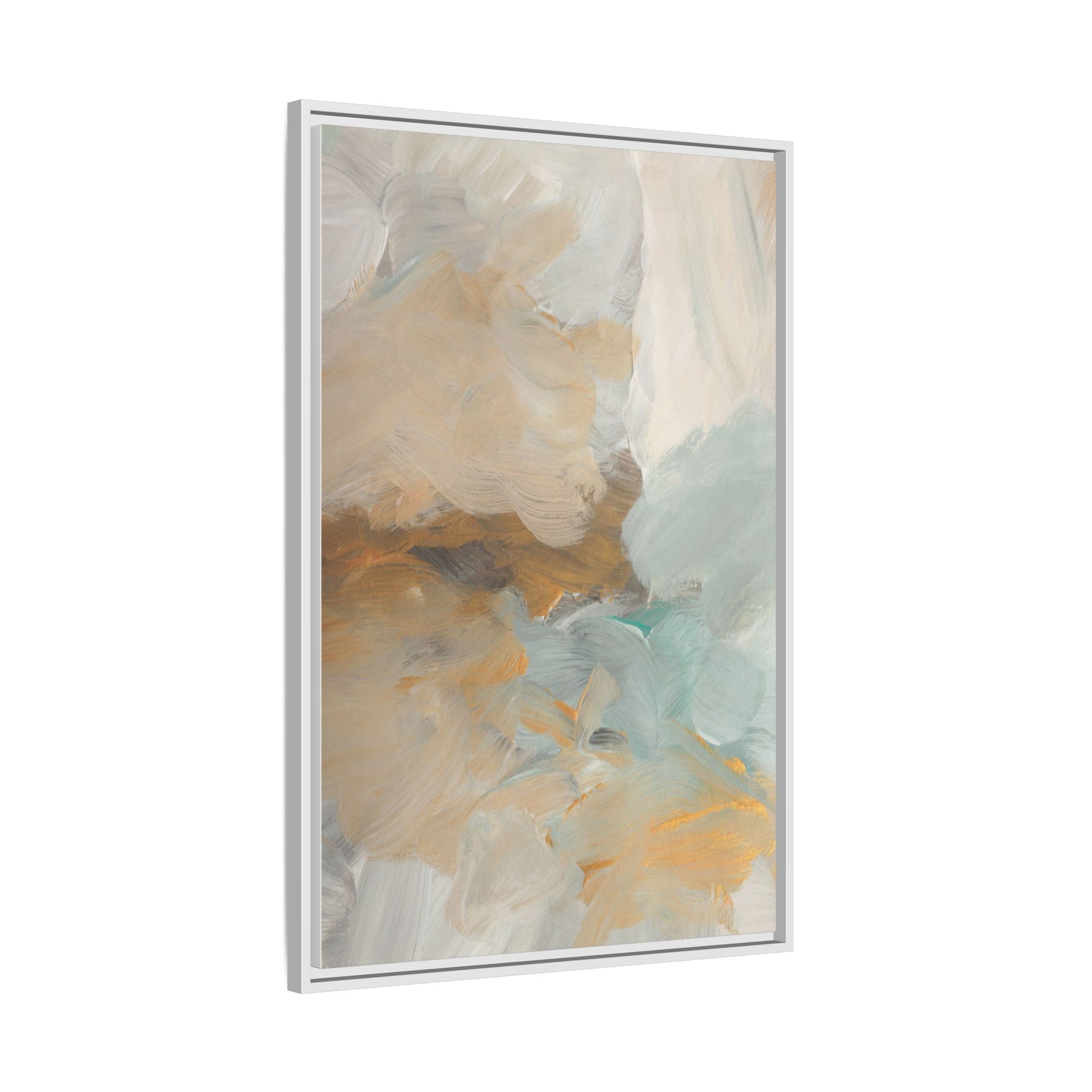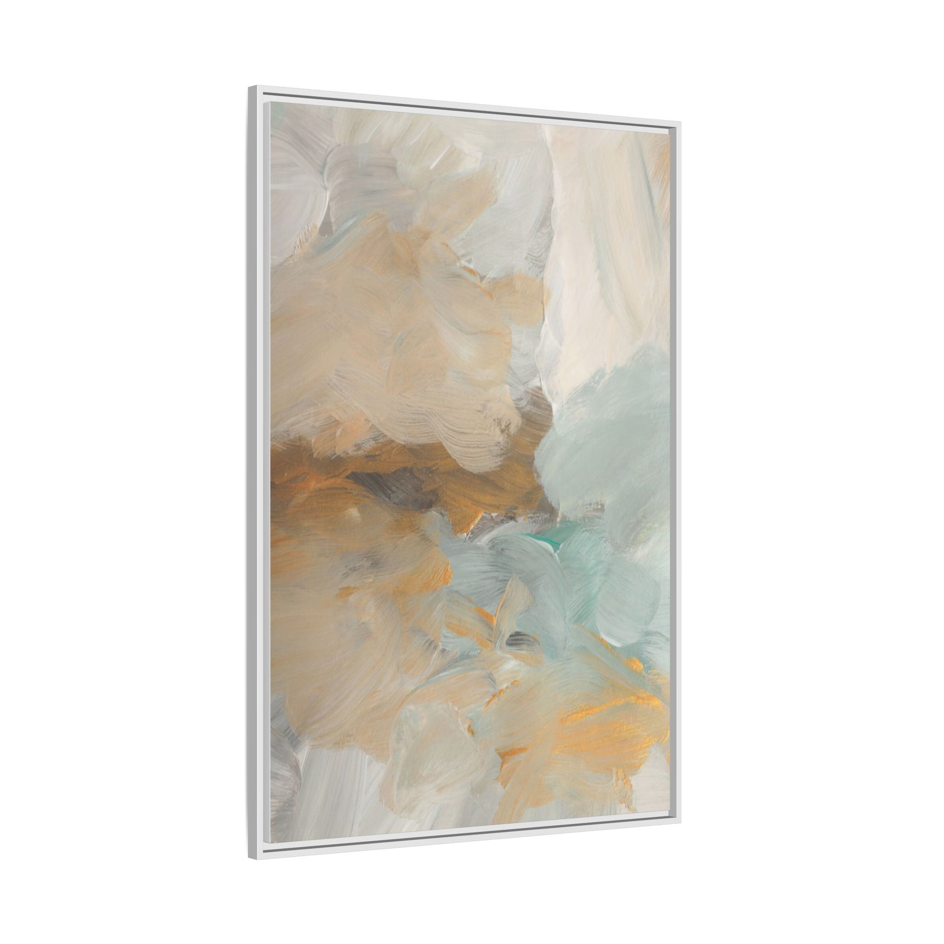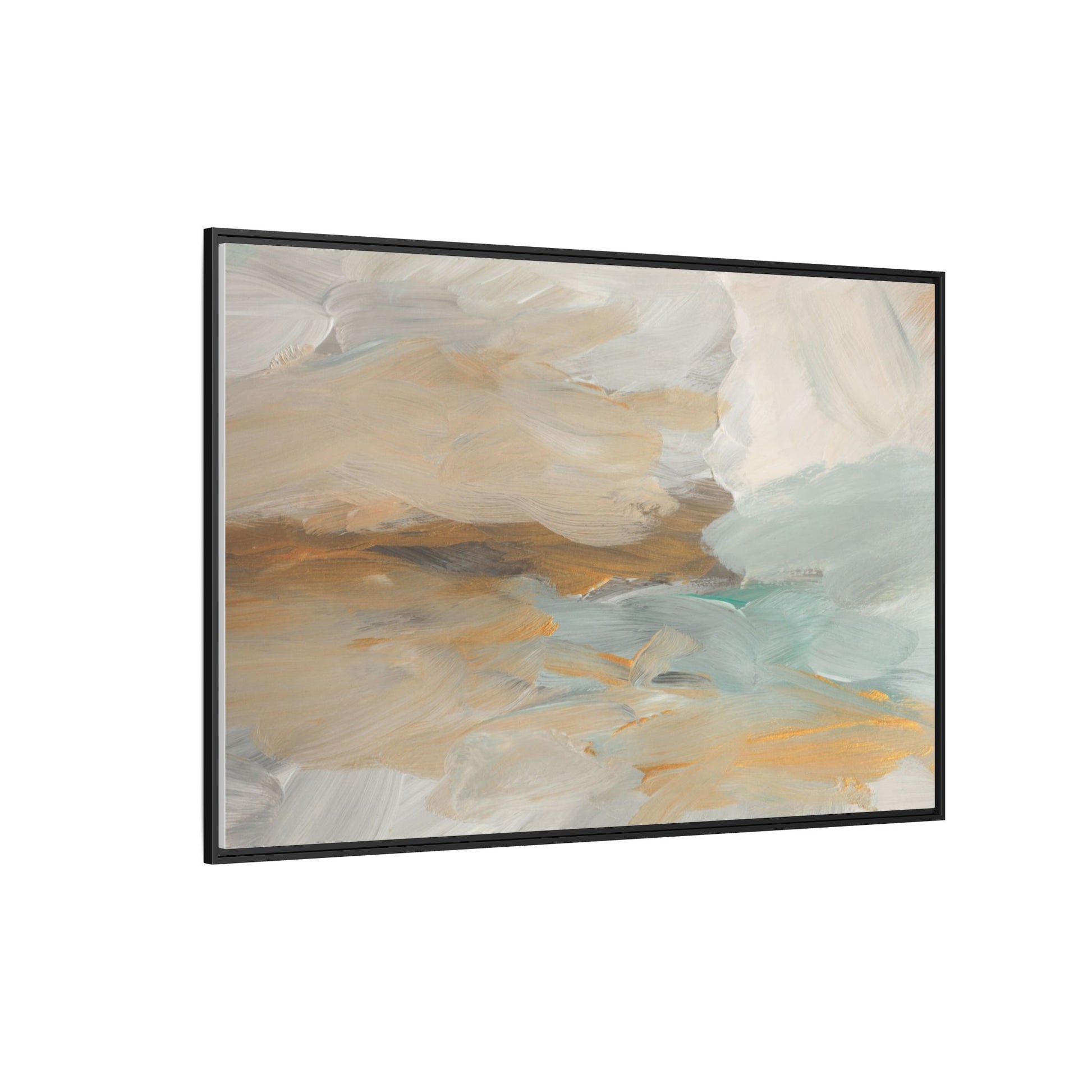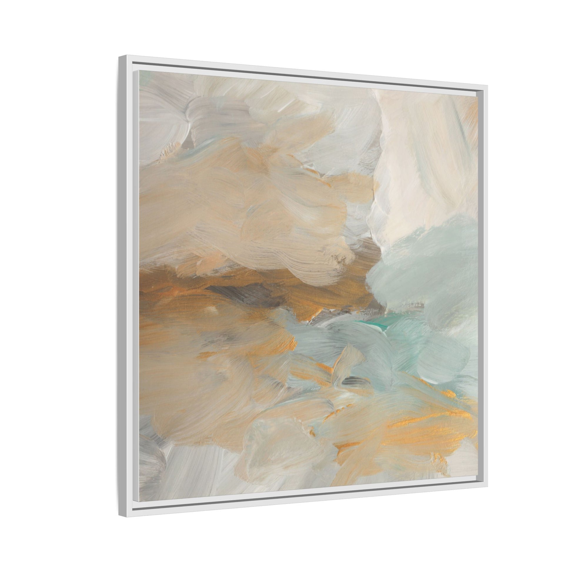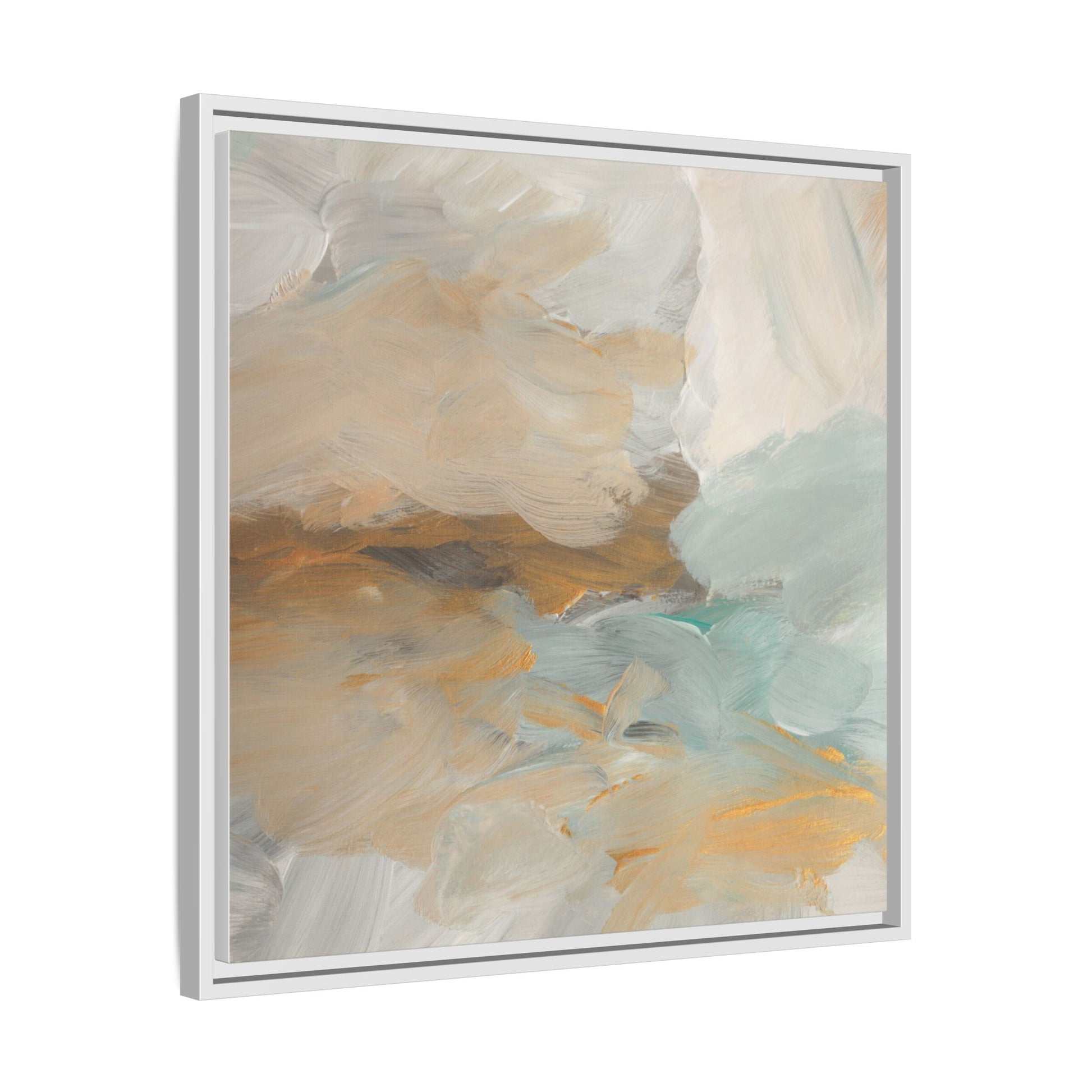 This abstract landscape painting showcases a serene and ethereal composition of soft, blended colors. Sweeping brushstrokes in muted tones of beige, white, golden yellow, and seafoam green create a dreamy, atmospheric effect reminiscent of a misty horizon or distant landscape. The painting's fluid technique allows colors to blend and flow into each other, creating subtle transitions and depth that evoke a sense of tranquility and natural movement. Textural brushwork adds dimension and visual interest, with each stroke revealing layers of color and creating a sense of organic, almost geological formation. The artwork's gentle color palette and abstract style invite viewers to interpret the scene through their own emotional and visual lens, suggesting a meditative and expansive landscape.