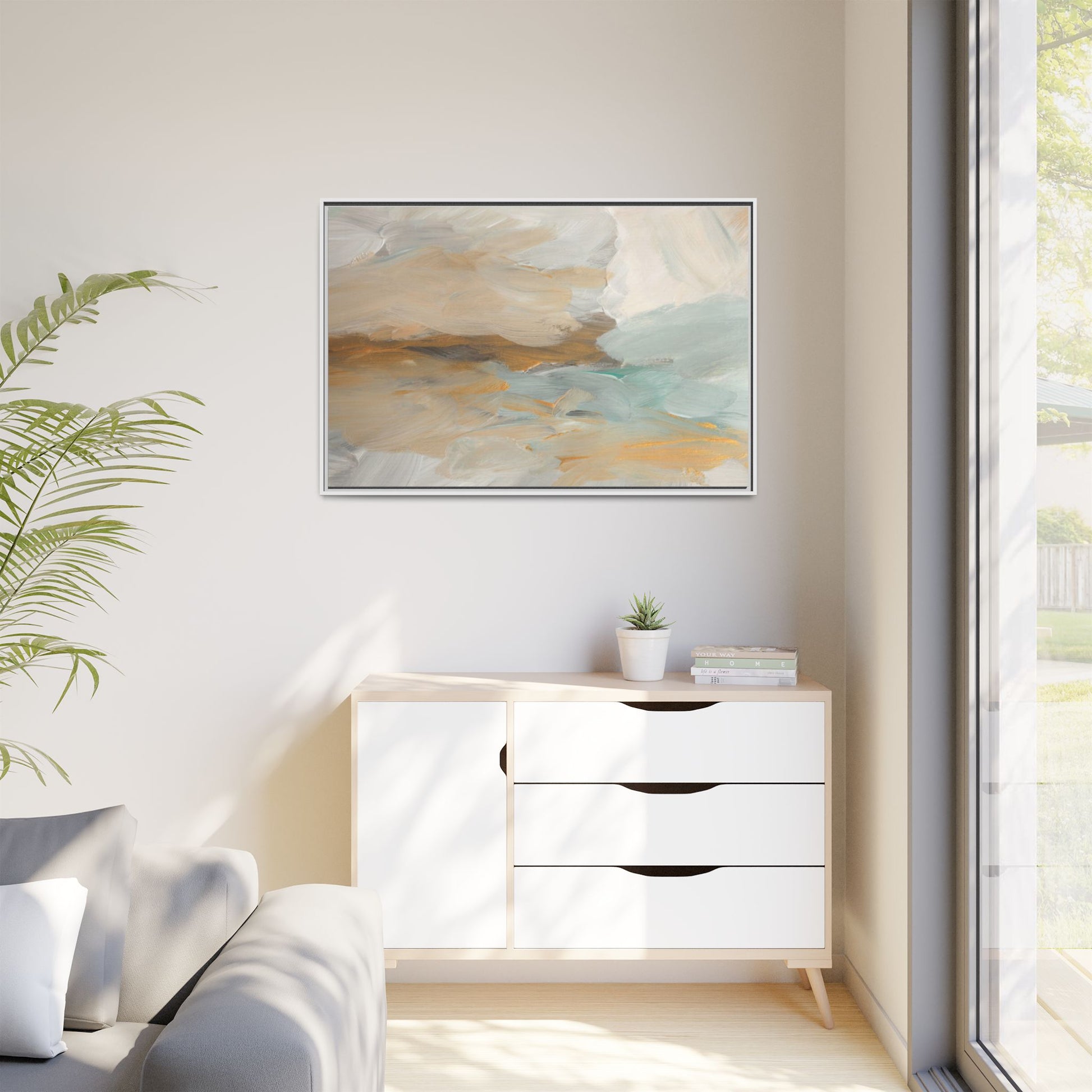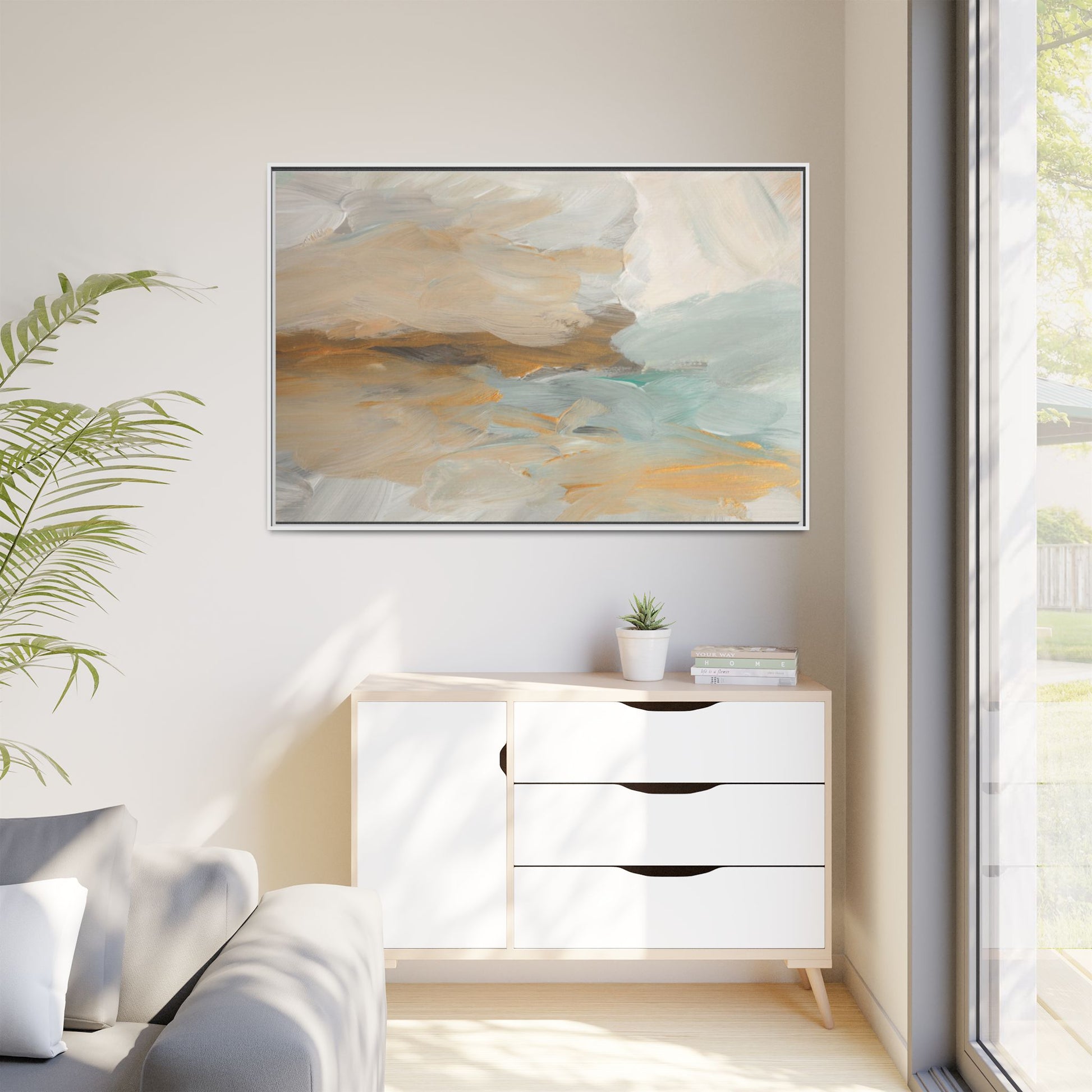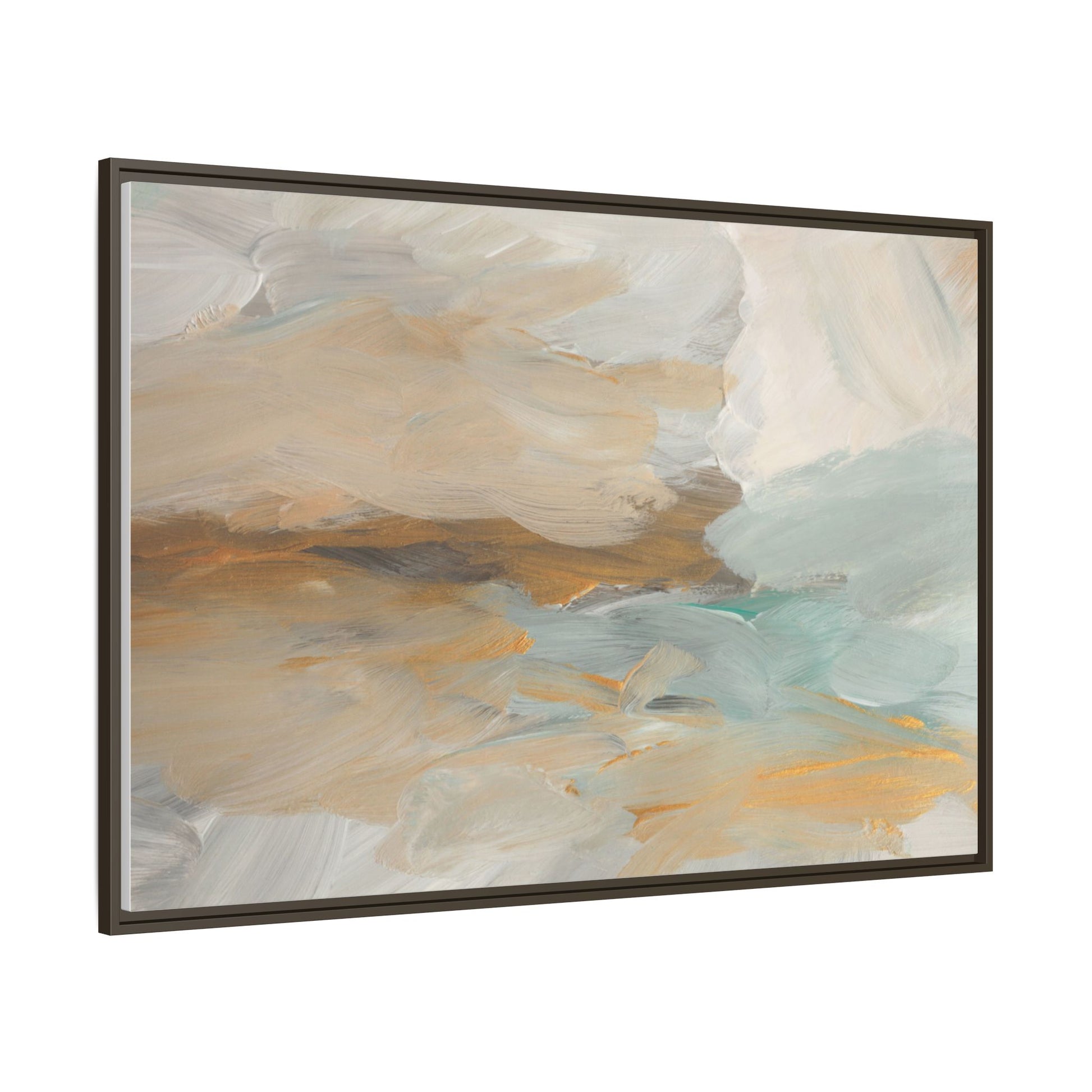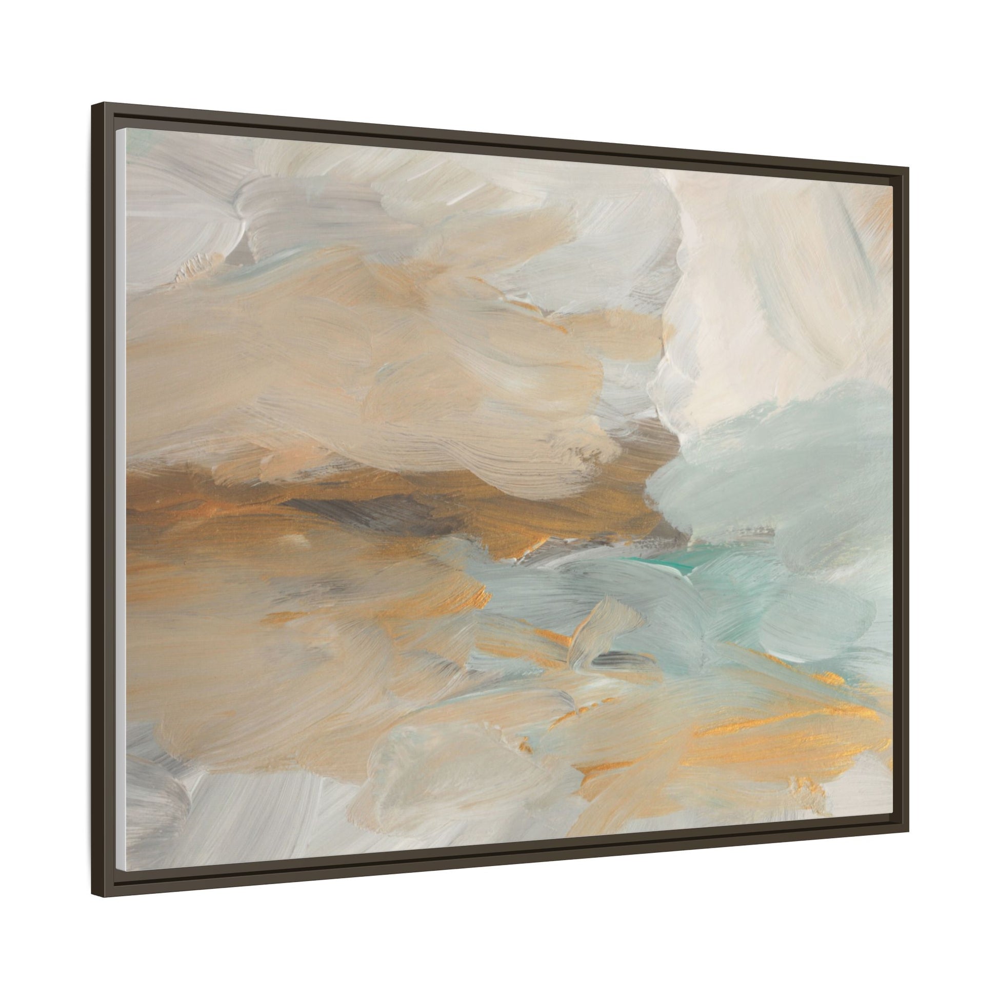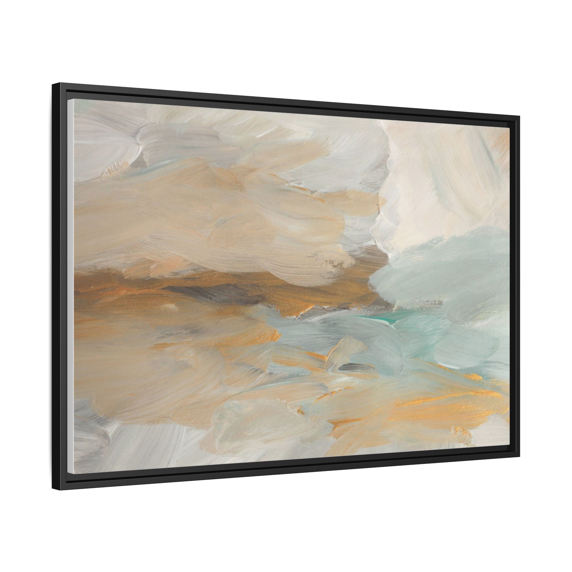 This abstract landscape painting showcases a serene and ethereal composition of soft, blended colors. Sweeping brushstrokes in muted tones of beige, white, golden yellow, and seafoam green create a dreamy, atmospheric effect reminiscent of a misty horizon or distant landscape. The painting's fluid technique allows colors to blend and flow into each other, creating subtle transitions and depth that evoke a sense of tranquility and natural movement. Textural brushwork adds dimension and visual interest, with each stroke revealing layers of color and creating a sense of organic, almost geological formation. The artwork's gentle color palette and abstract style invite viewers to interpret the scene through their own emotional and visual lens, suggesting a meditative and expansive landscape.