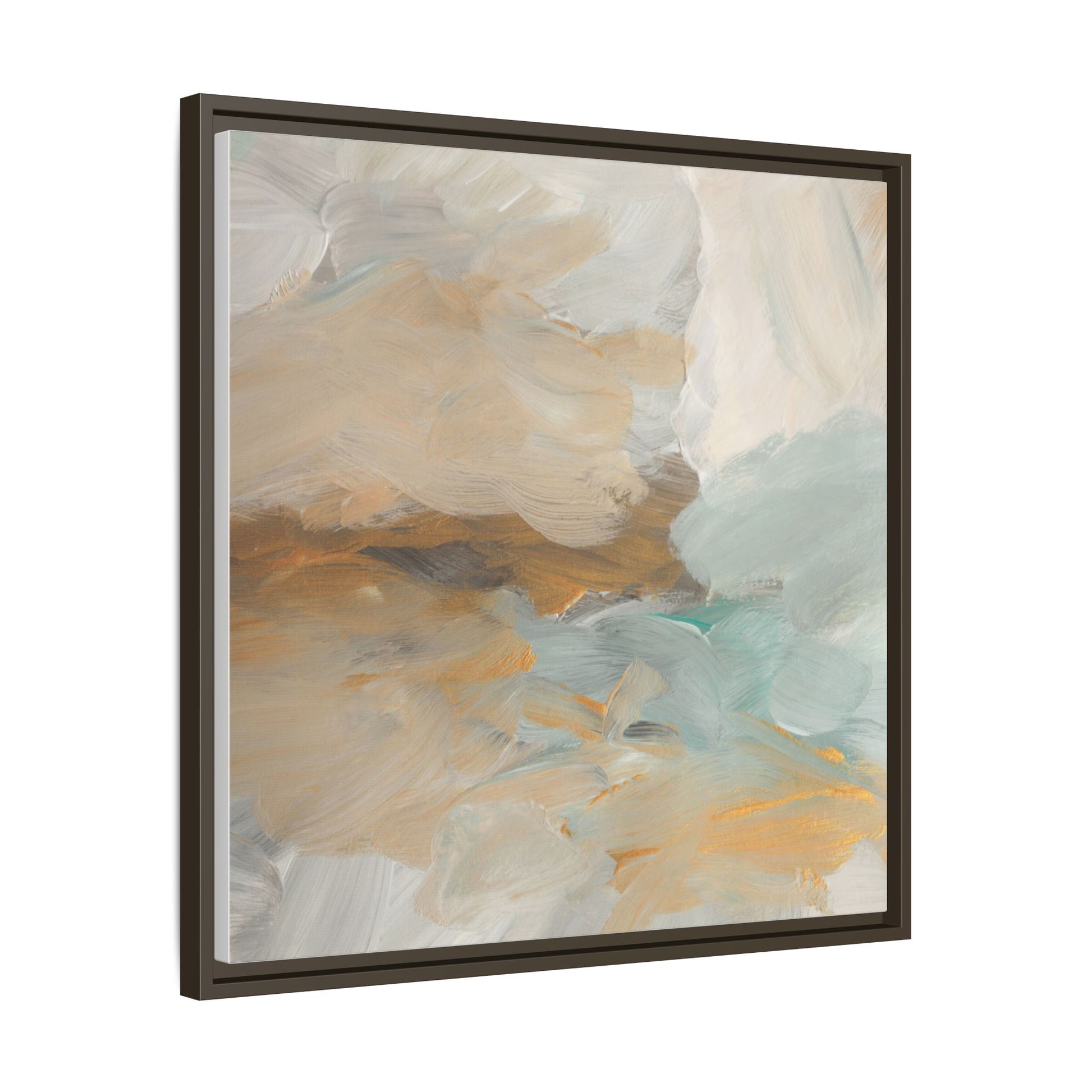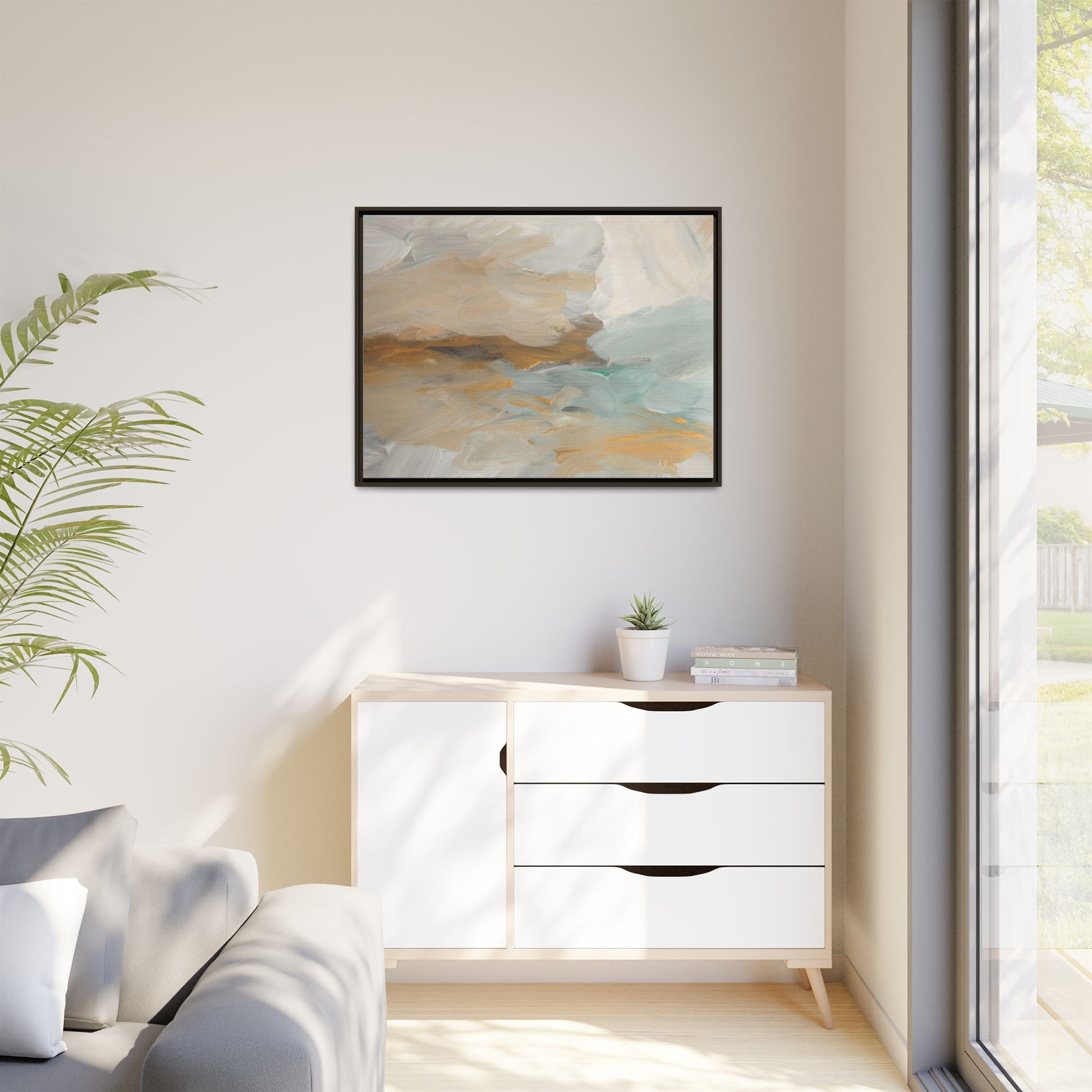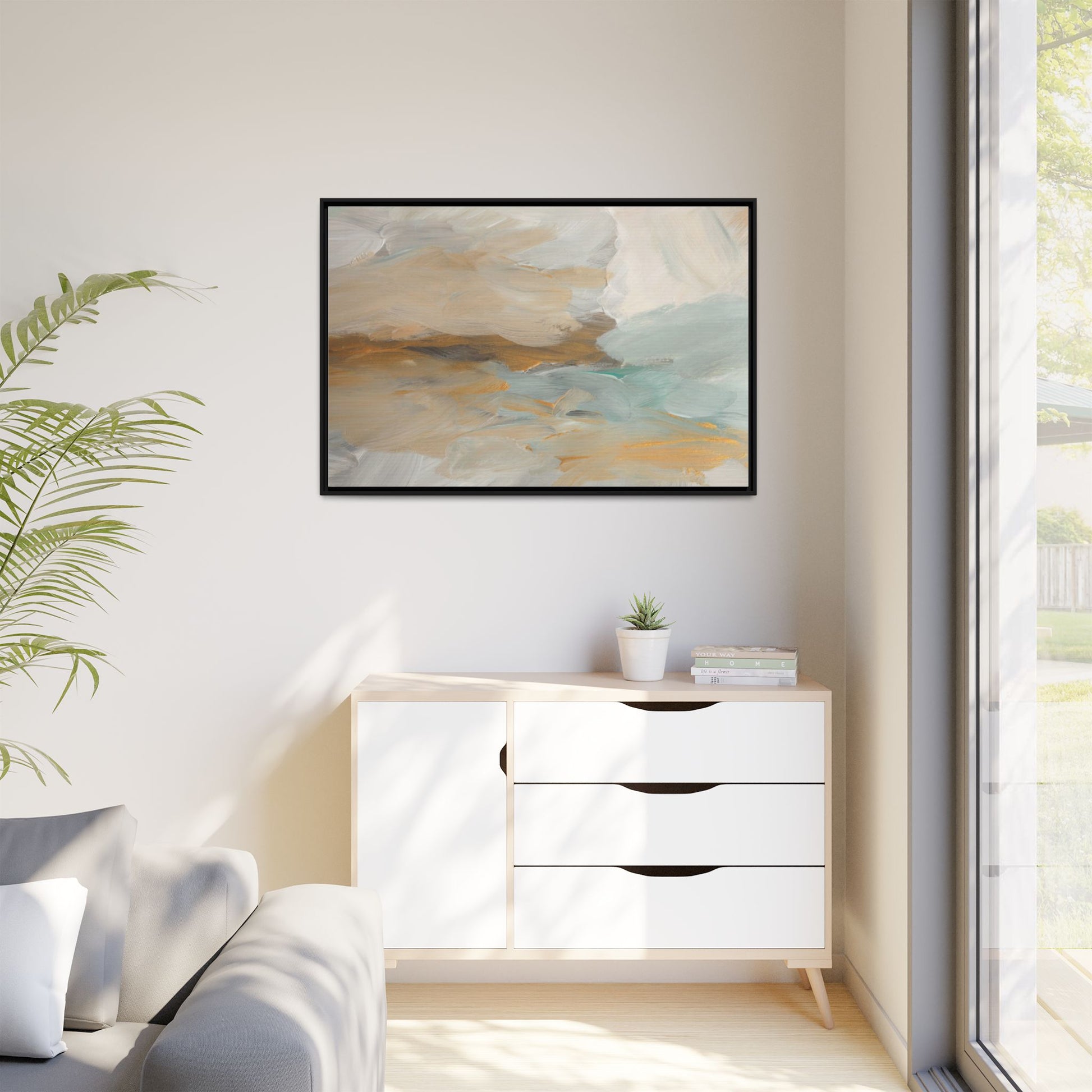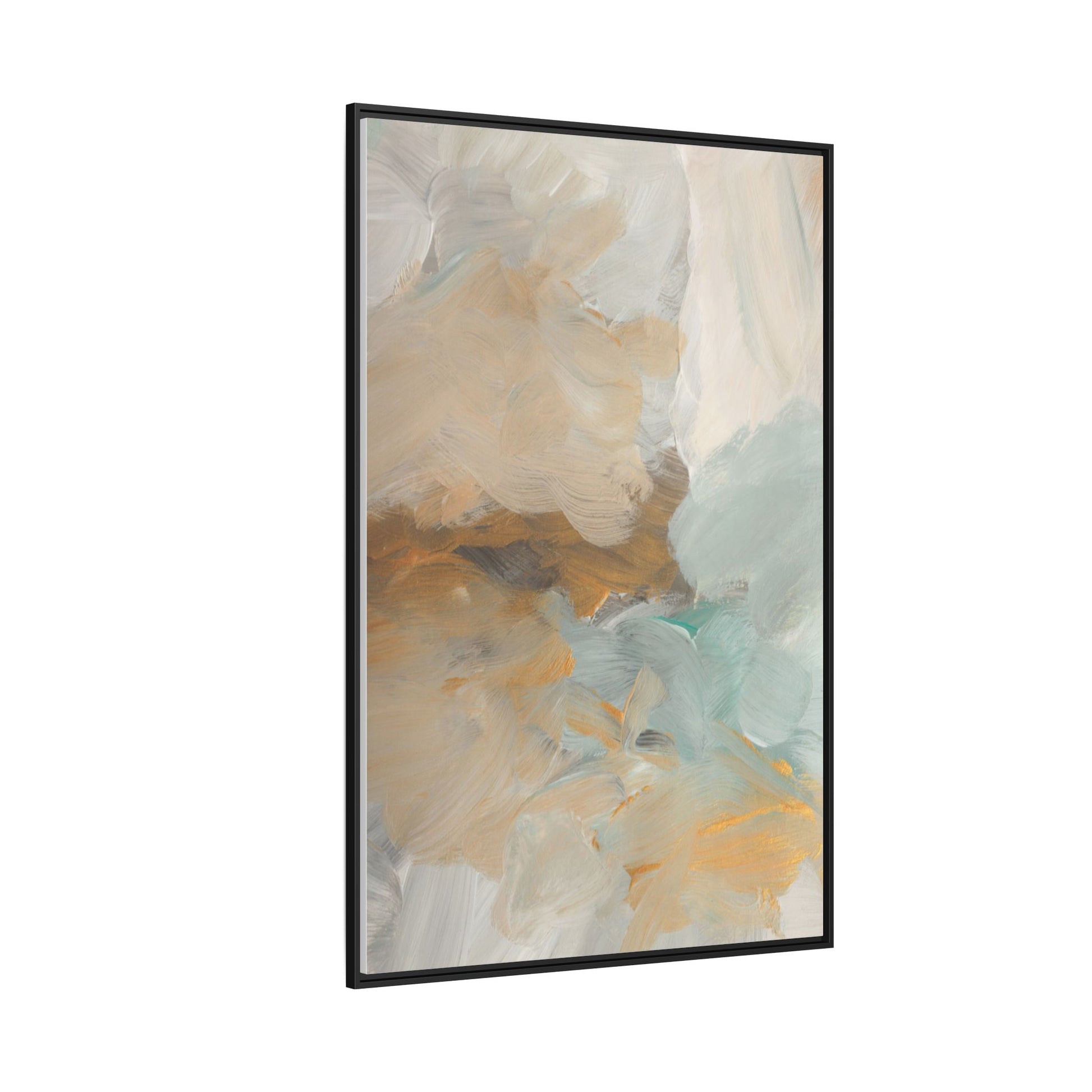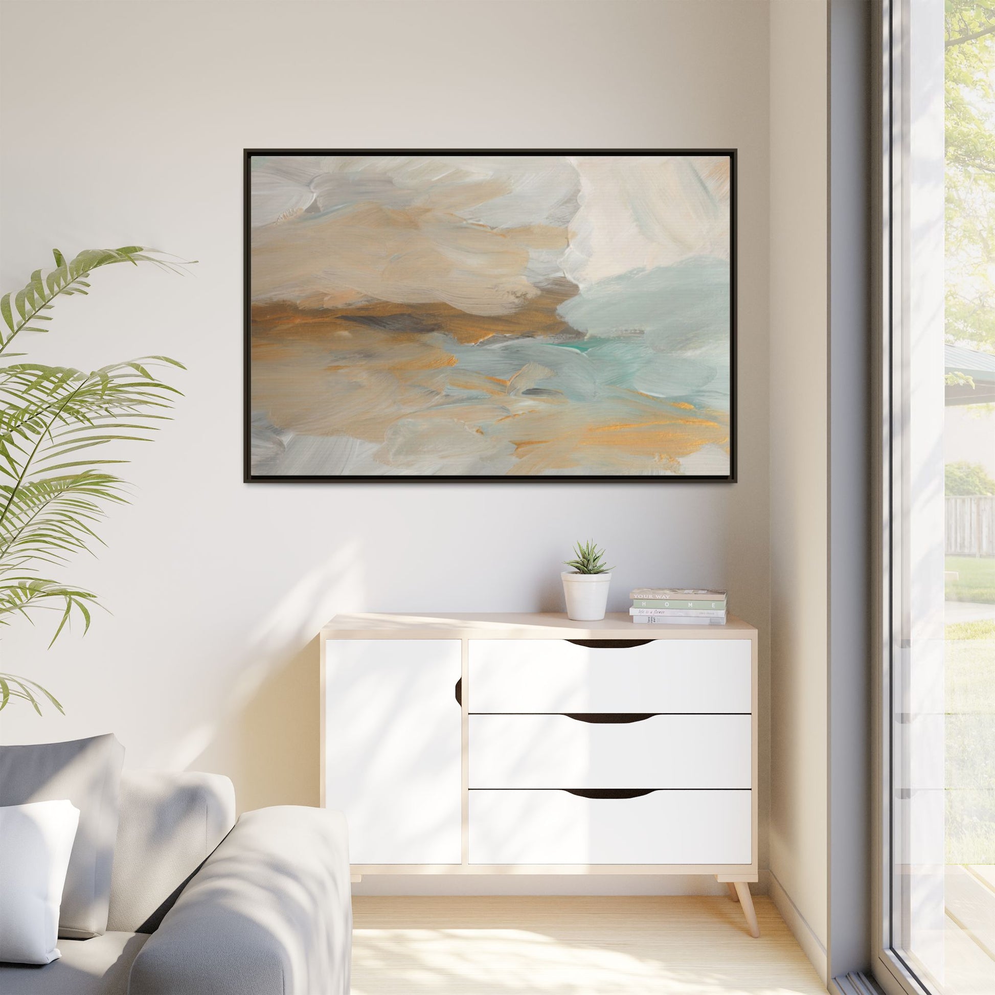 This abstract landscape painting showcases a serene and ethereal composition of soft, blended colors. Sweeping brushstrokes in muted tones of beige, white, golden yellow, and seafoam green create a dreamy, atmospheric effect reminiscent of a misty horizon or distant landscape. The painting's fluid technique allows colors to blend and flow into each other, creating subtle transitions and depth that evoke a sense of tranquility and natural movement. Textural brushwork adds dimension and visual interest, with each stroke revealing layers of color and creating a sense of organic, almost geological formation. The artwork's gentle color palette and abstract style invite viewers to interpret the scene through their own emotional and visual lens, suggesting a meditative and expansive landscape.