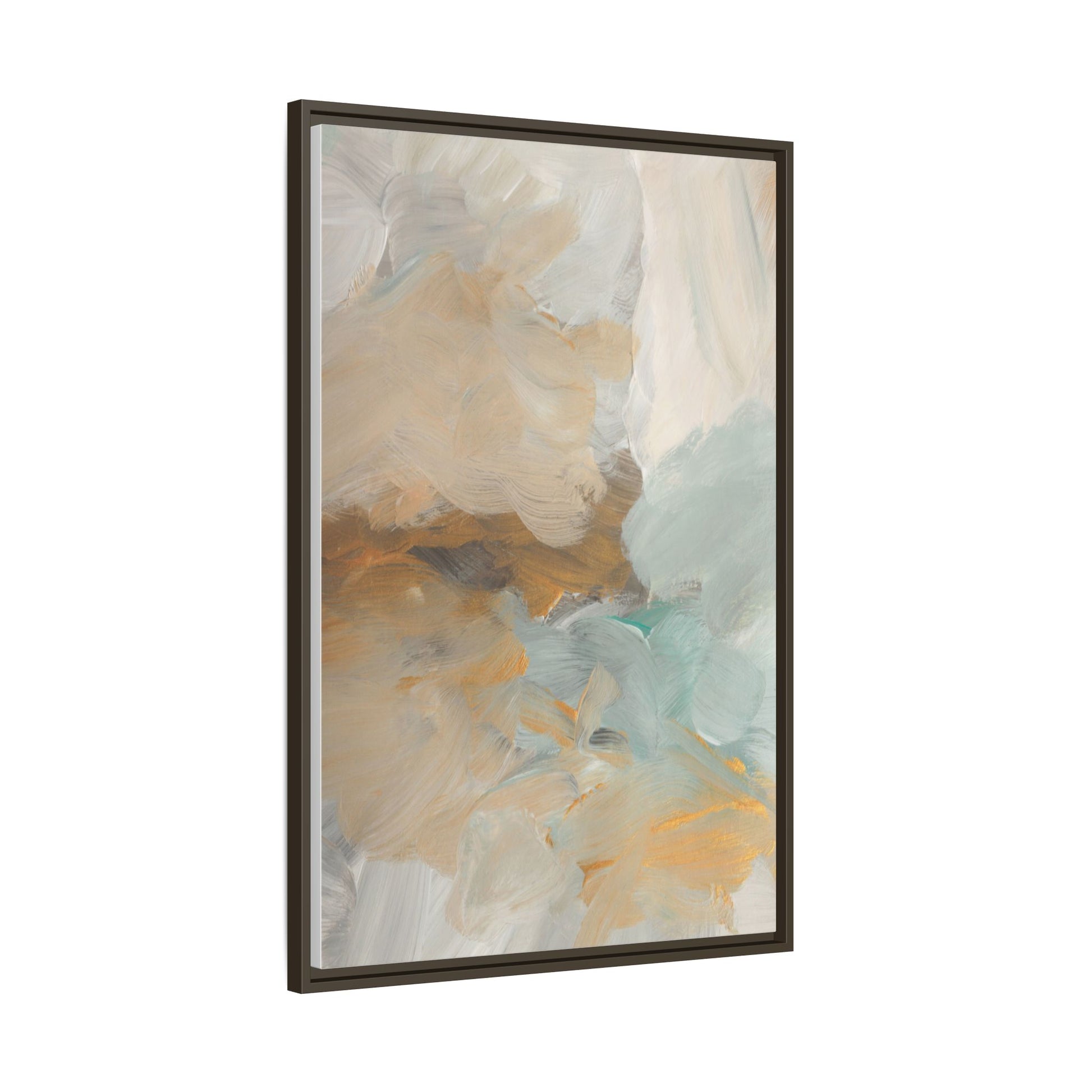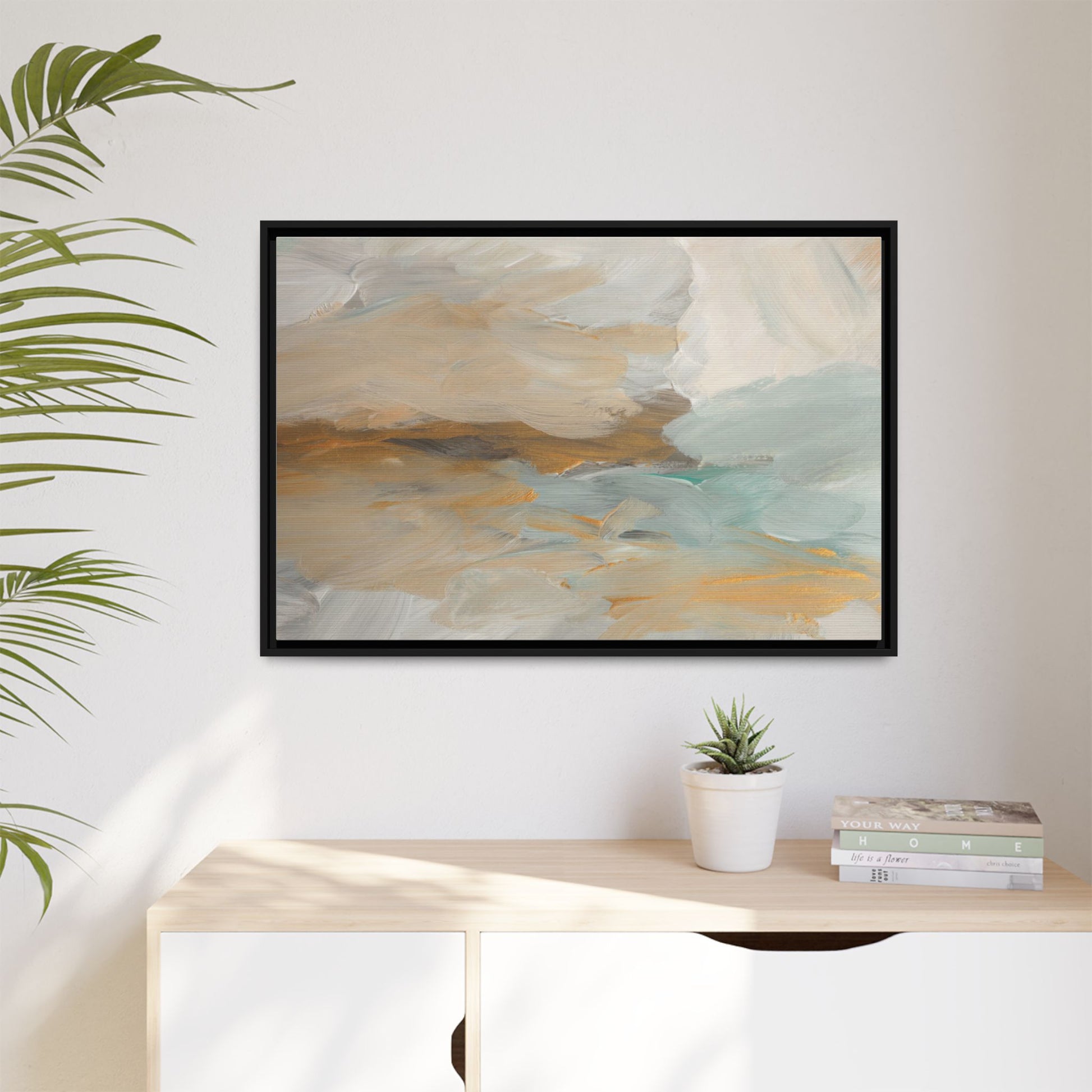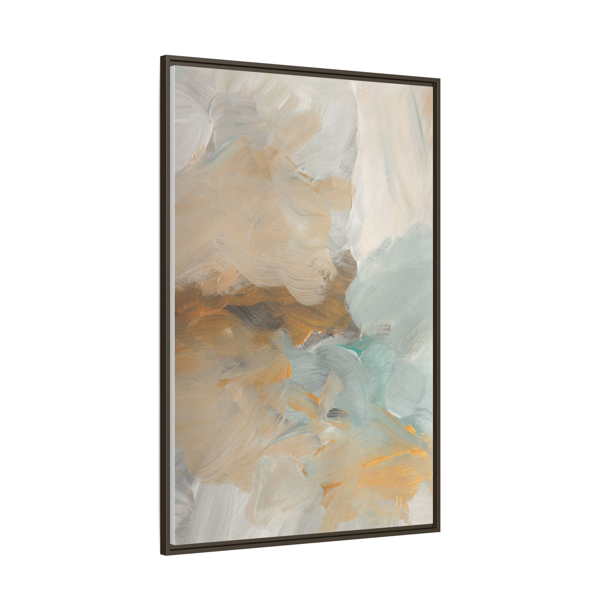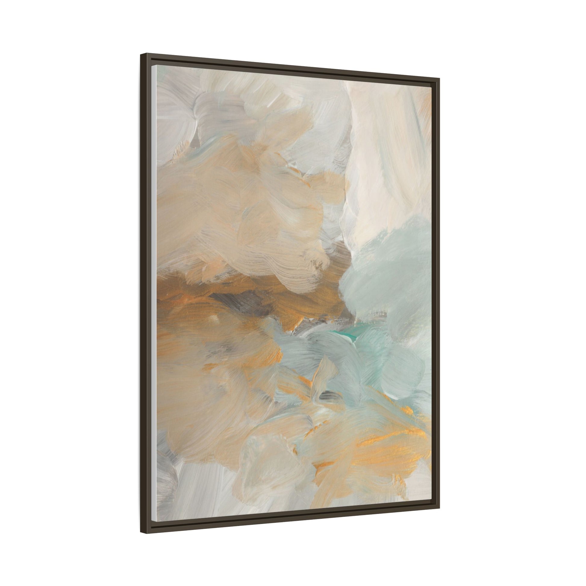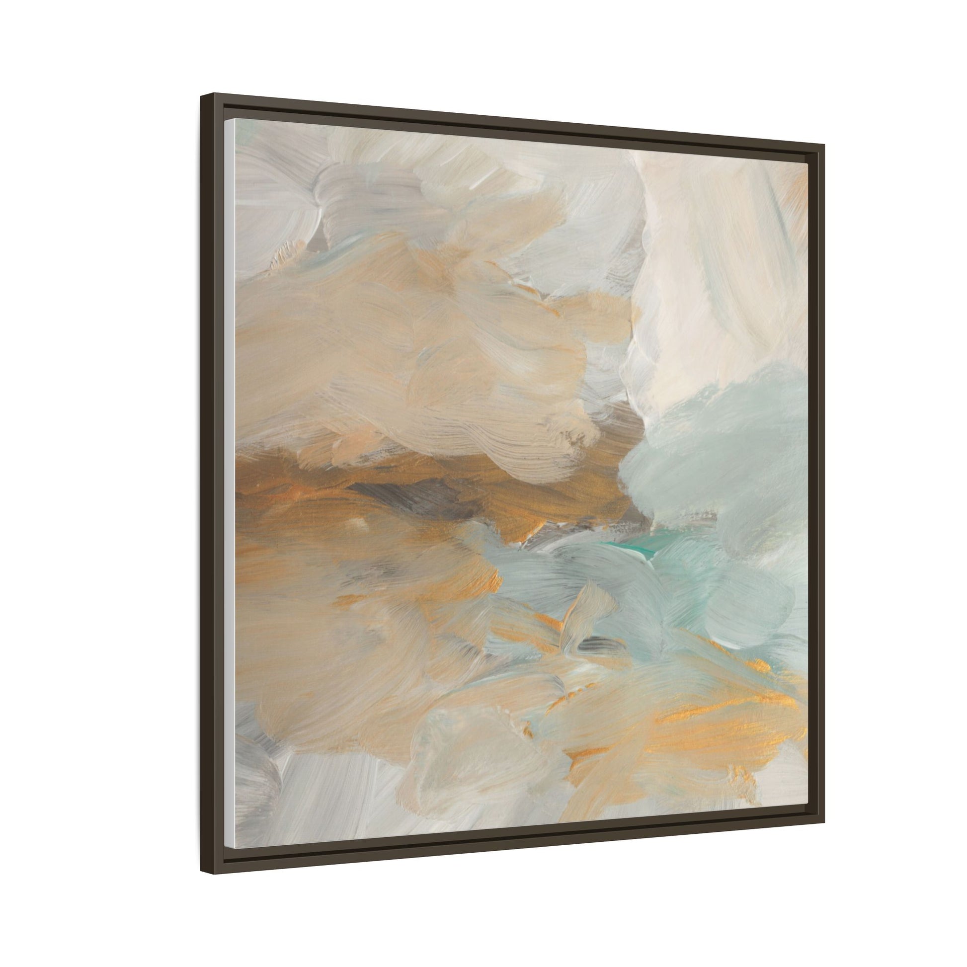 This abstract landscape painting showcases a serene and ethereal composition of soft, blended colors. Sweeping brushstrokes in muted tones of beige, white, golden yellow, and seafoam green create a dreamy, atmospheric effect reminiscent of a misty horizon or distant landscape. The painting's fluid technique allows colors to blend and flow into each other, creating subtle transitions and depth that evoke a sense of tranquility and natural movement. Textural brushwork adds dimension and visual interest, with each stroke revealing layers of color and creating a sense of organic, almost geological formation. The artwork's gentle color palette and abstract style invite viewers to interpret the scene through their own emotional and visual lens, suggesting a meditative and expansive landscape.