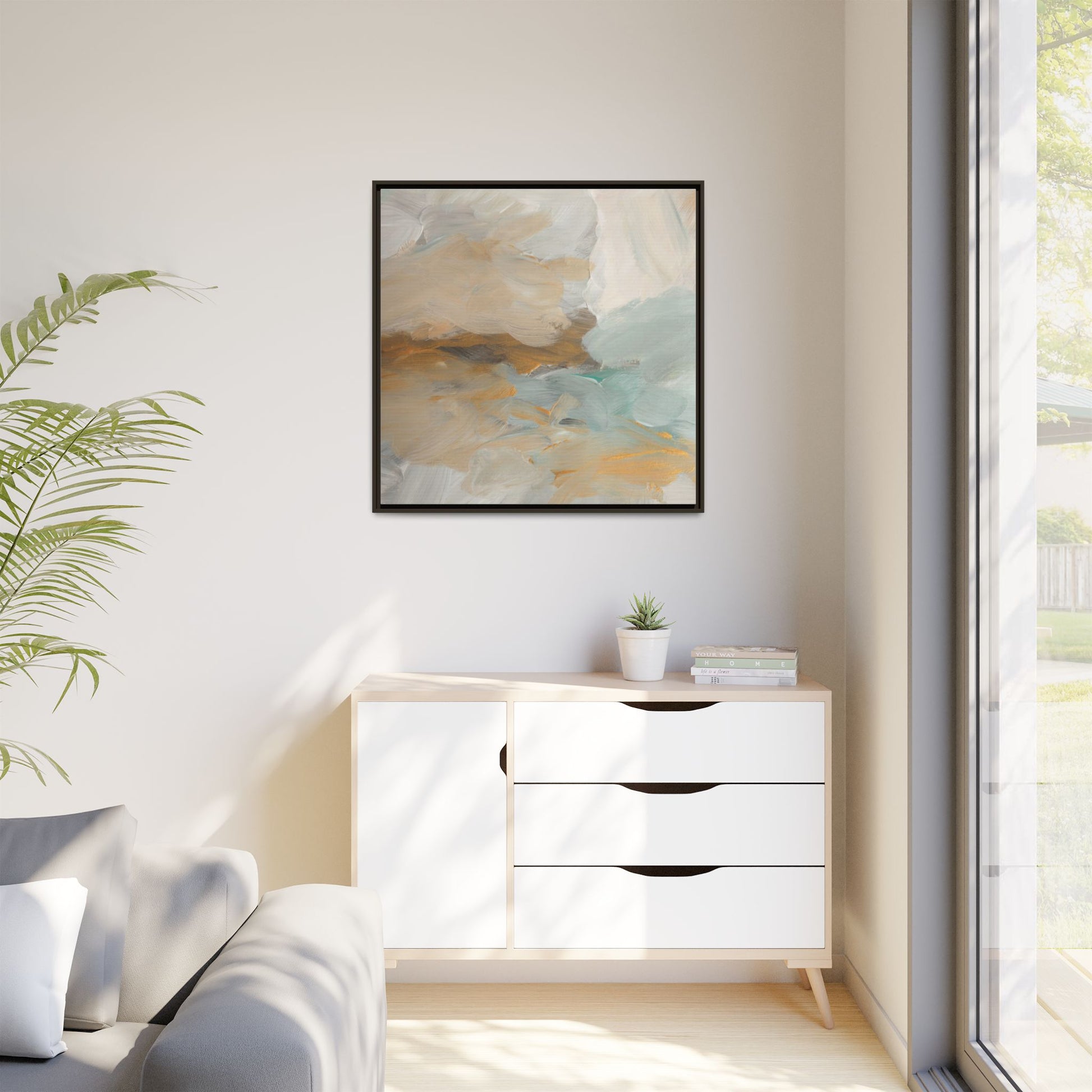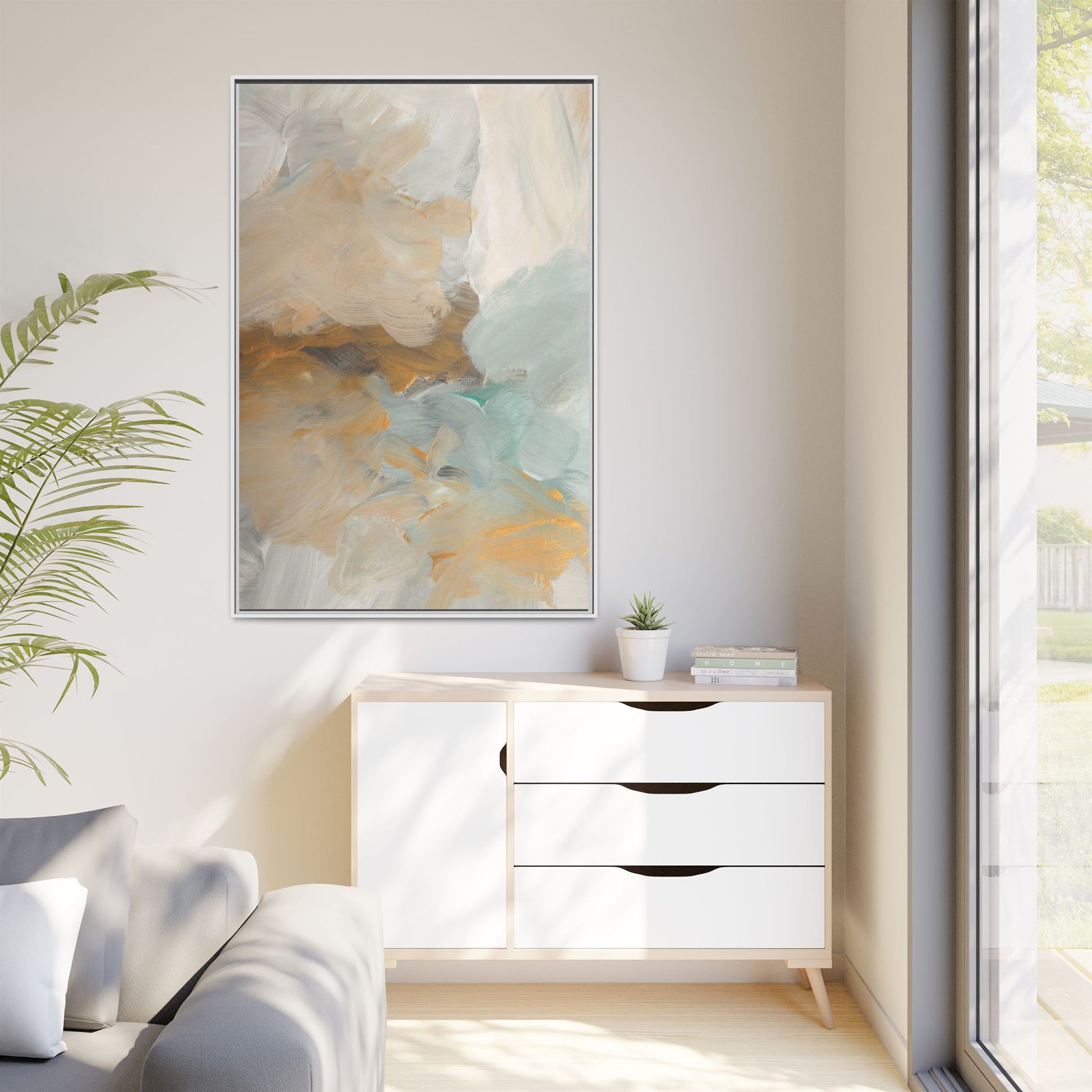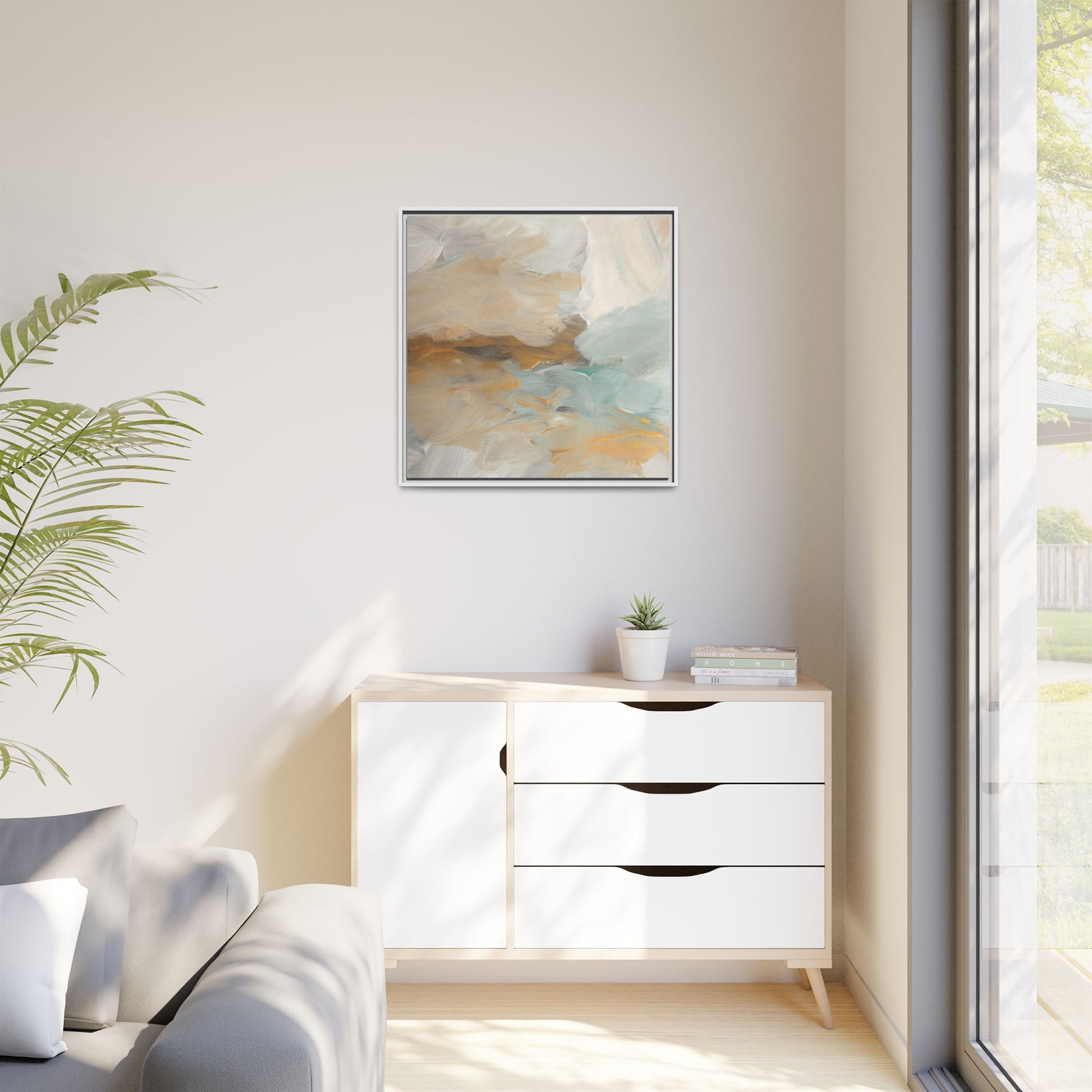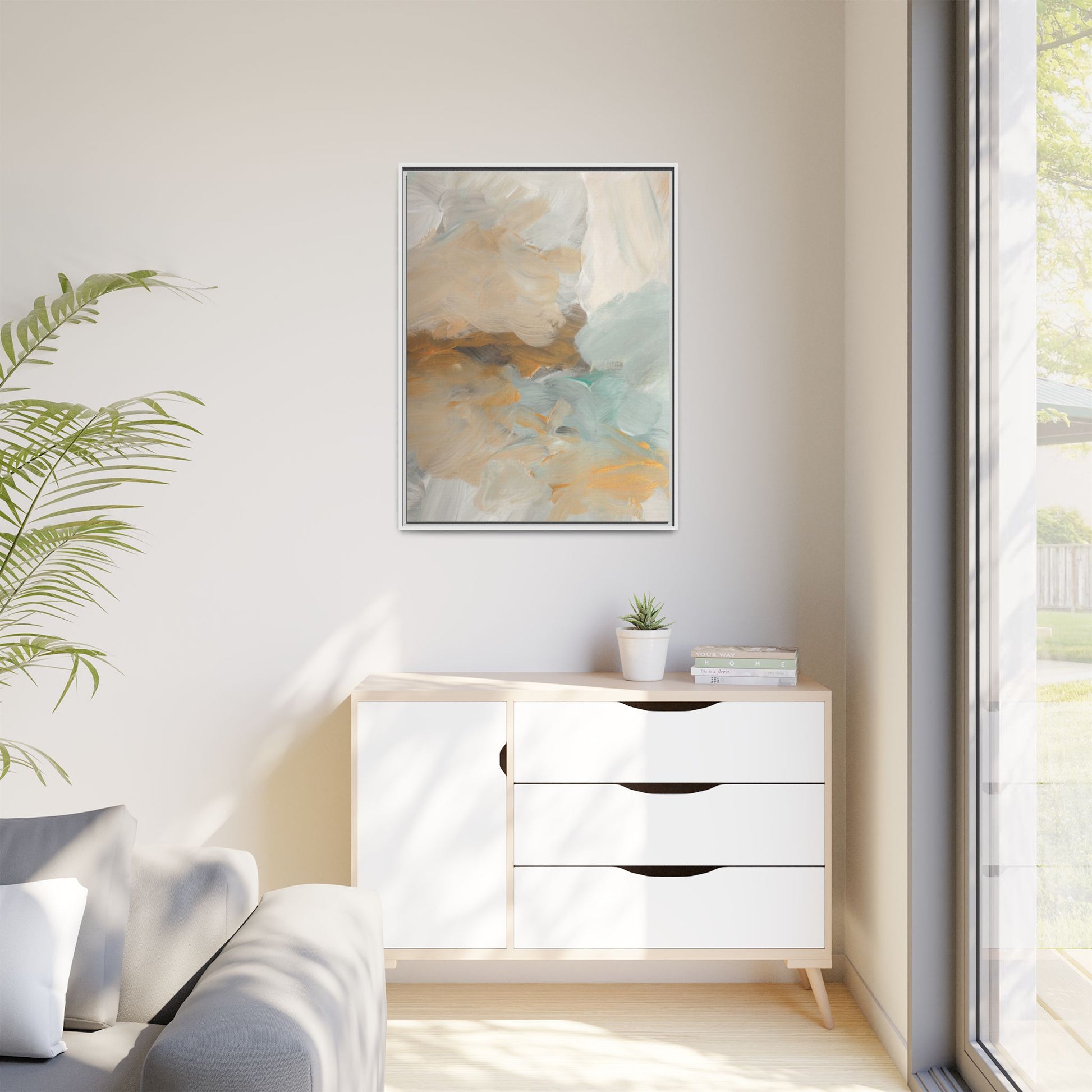 This abstract landscape painting showcases a serene and ethereal composition of soft, blended colors. Sweeping brushstrokes in muted tones of beige, white, golden yellow, and seafoam green create a dreamy, atmospheric effect reminiscent of a misty horizon or distant landscape. The painting's fluid technique allows colors to blend and flow into each other, creating subtle transitions and depth that evoke a sense of tranquility and natural movement. Textural brushwork adds dimension and visual interest, with each stroke revealing layers of color and creating a sense of organic, almost geological formation. The artwork's gentle color palette and abstract style invite viewers to interpret the scene through their own emotional and visual lens, suggesting a meditative and expansive landscape.
