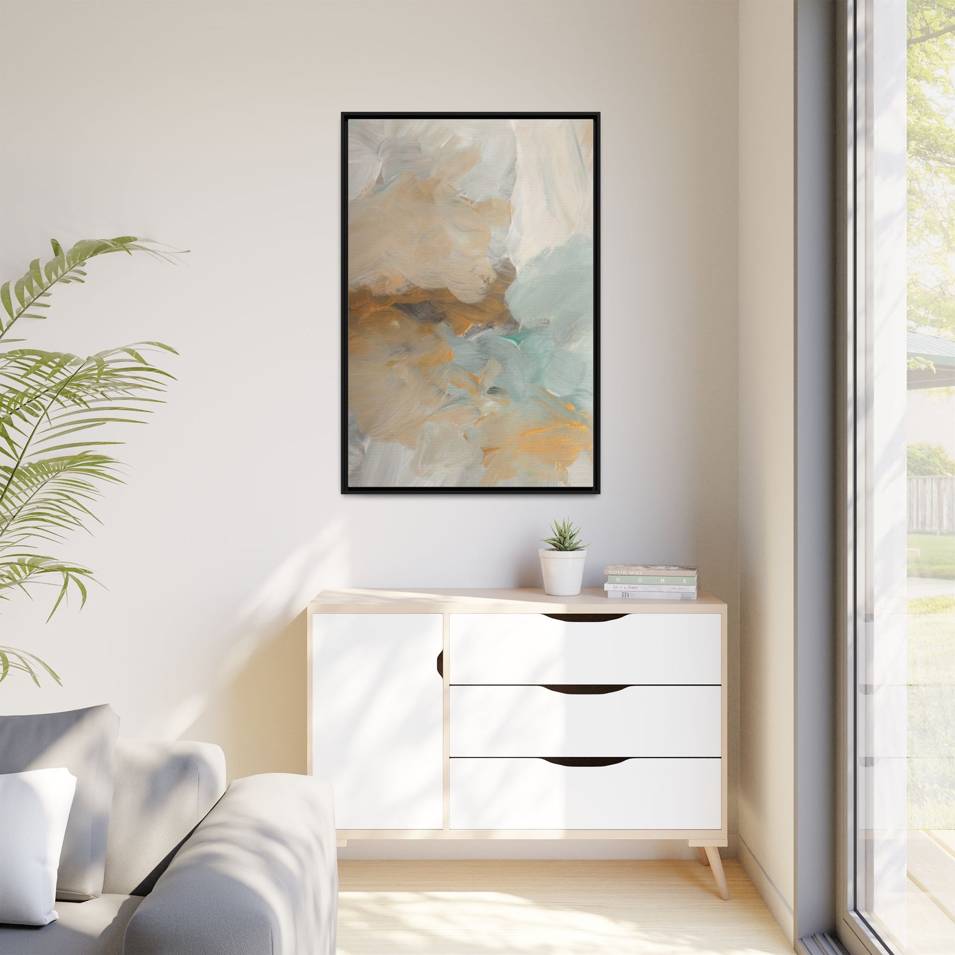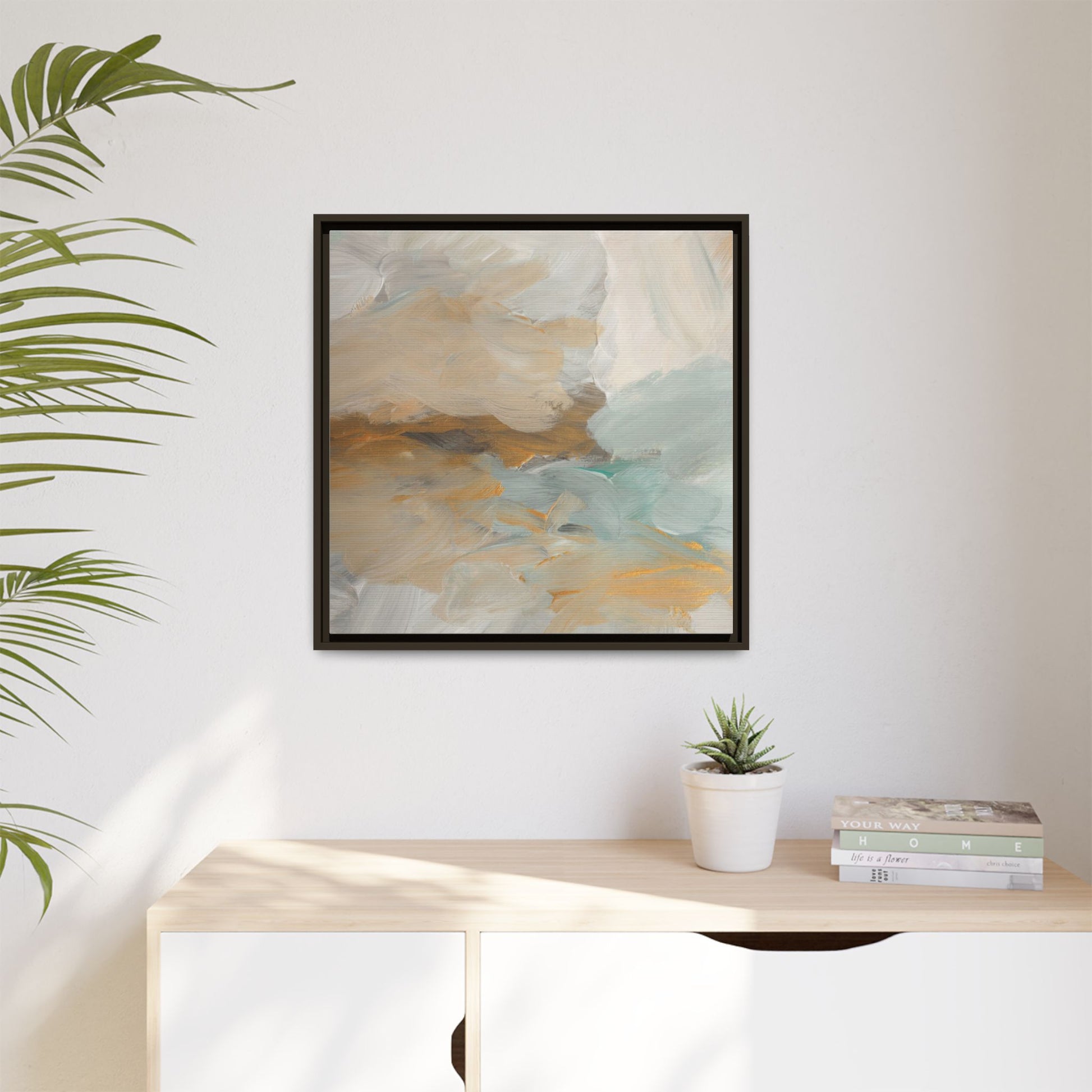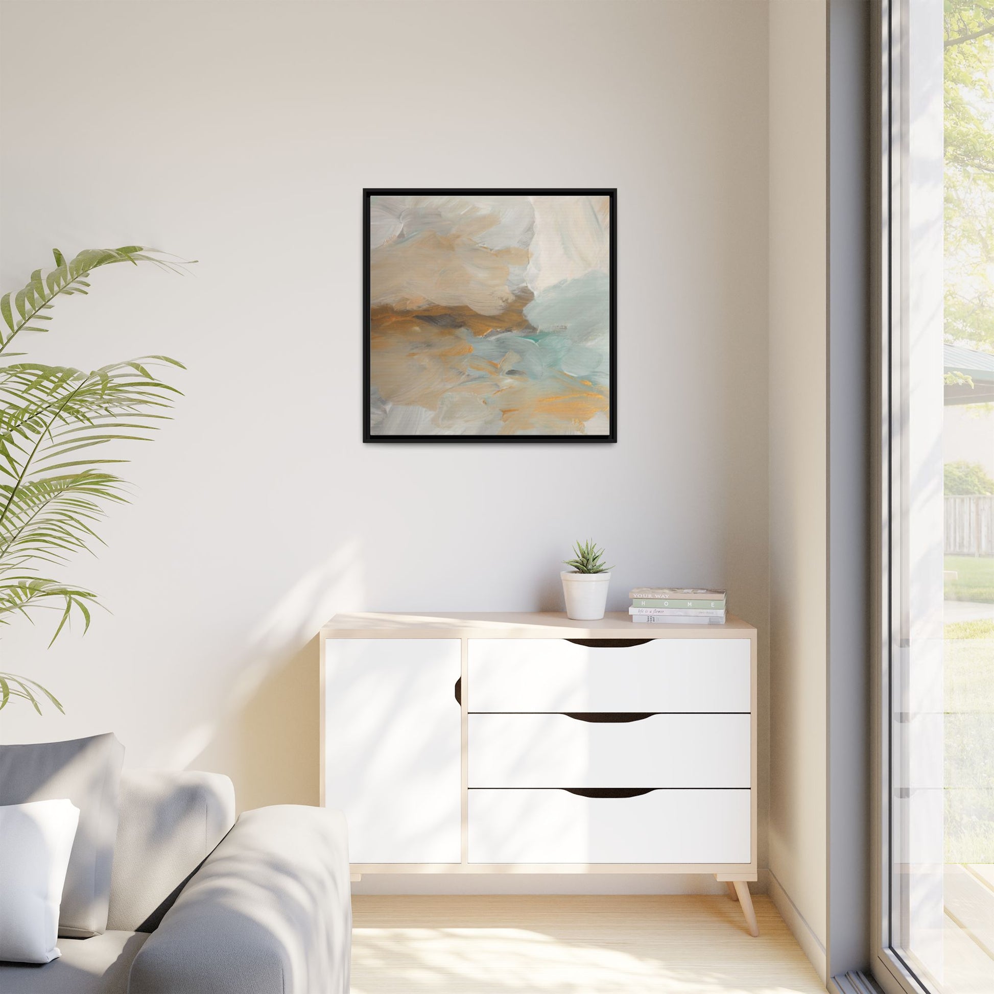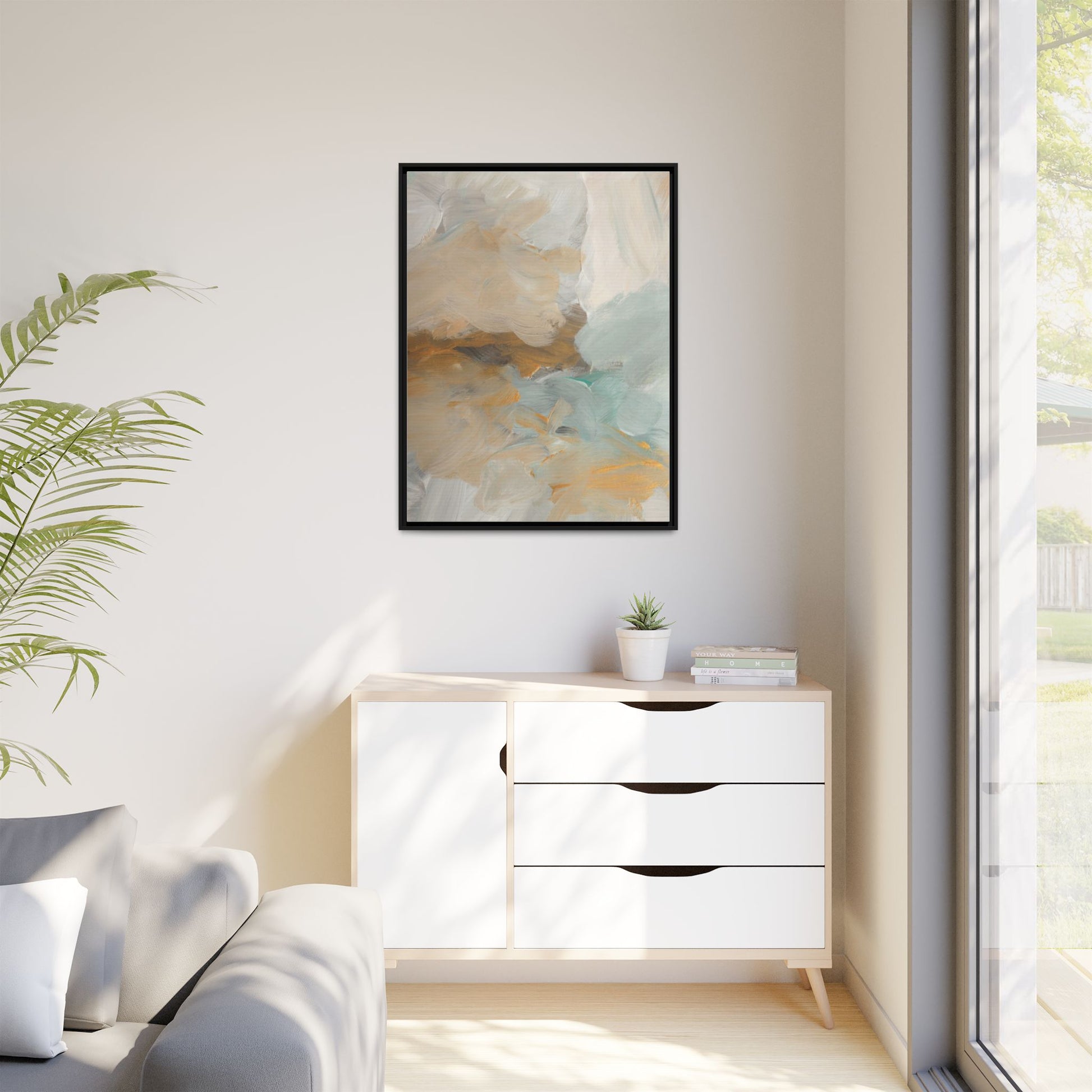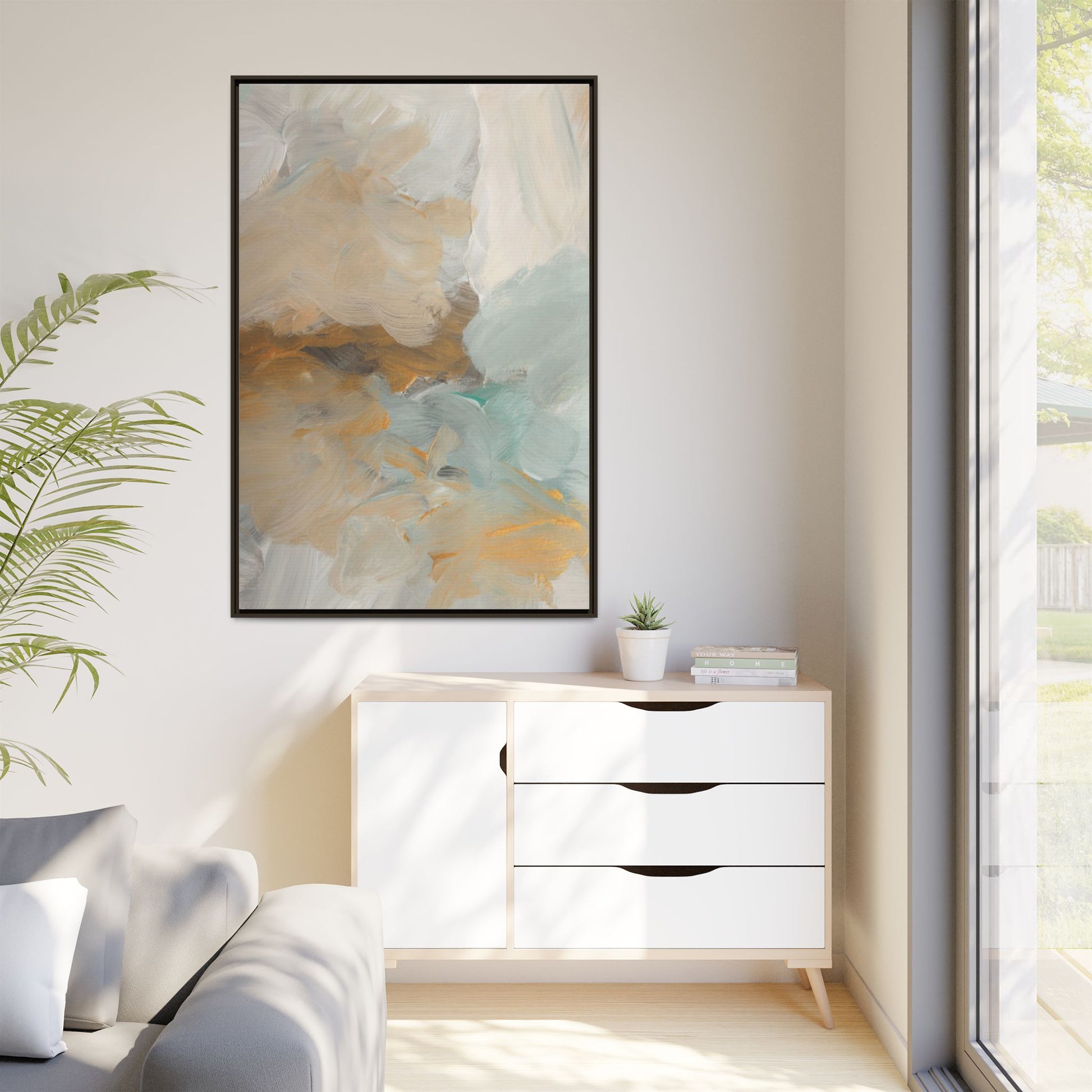 This abstract landscape painting showcases a serene and ethereal composition of soft, blended colors. Sweeping brushstrokes in muted tones of beige, white, golden yellow, and seafoam green create a dreamy, atmospheric effect reminiscent of a misty horizon or distant landscape. The painting's fluid technique allows colors to blend and flow into each other, creating subtle transitions and depth that evoke a sense of tranquility and natural movement. Textural brushwork adds dimension and visual interest, with each stroke revealing layers of color and creating a sense of organic, almost geological formation. The artwork's gentle color palette and abstract style invite viewers to interpret the scene through their own emotional and visual lens, suggesting a meditative and expansive landscape.