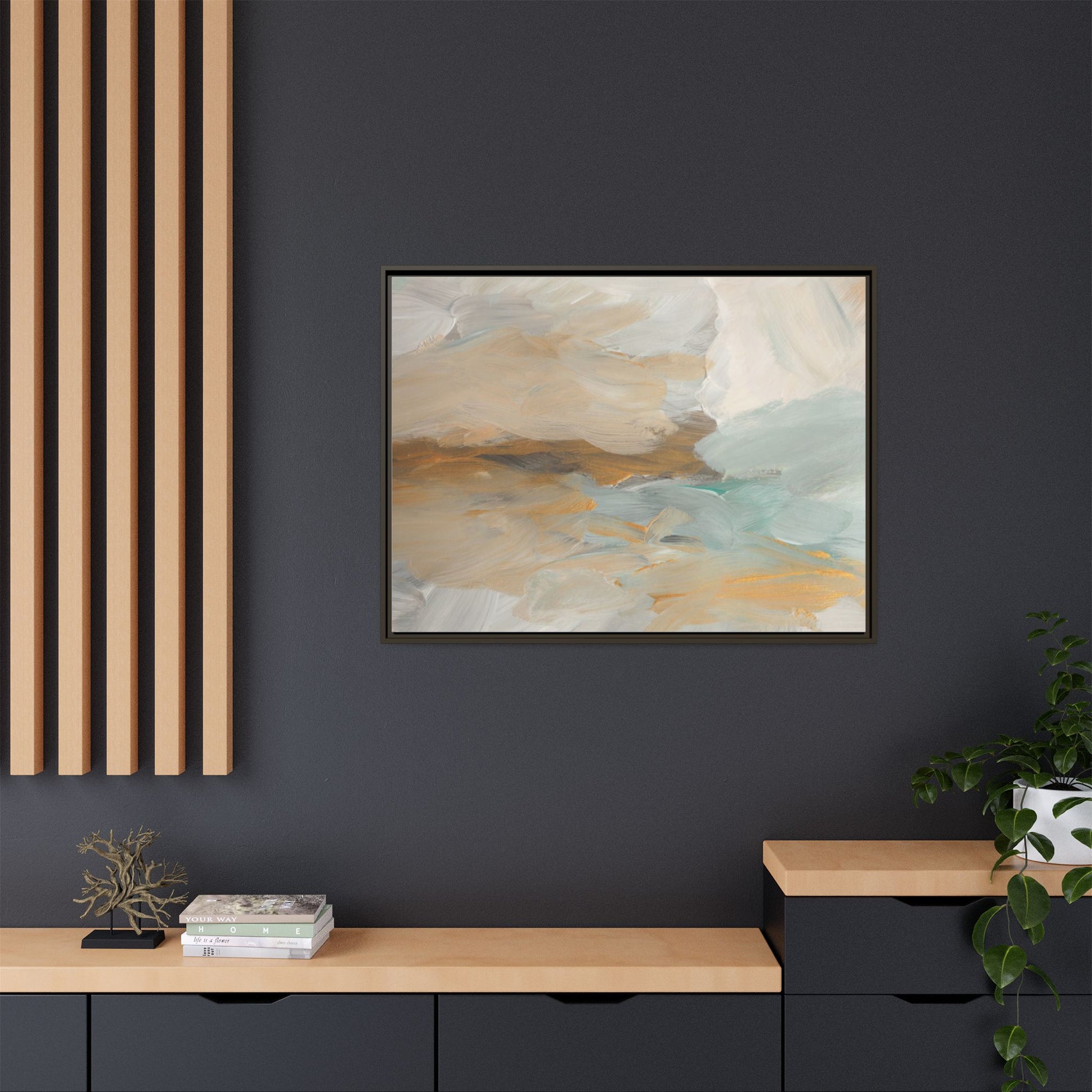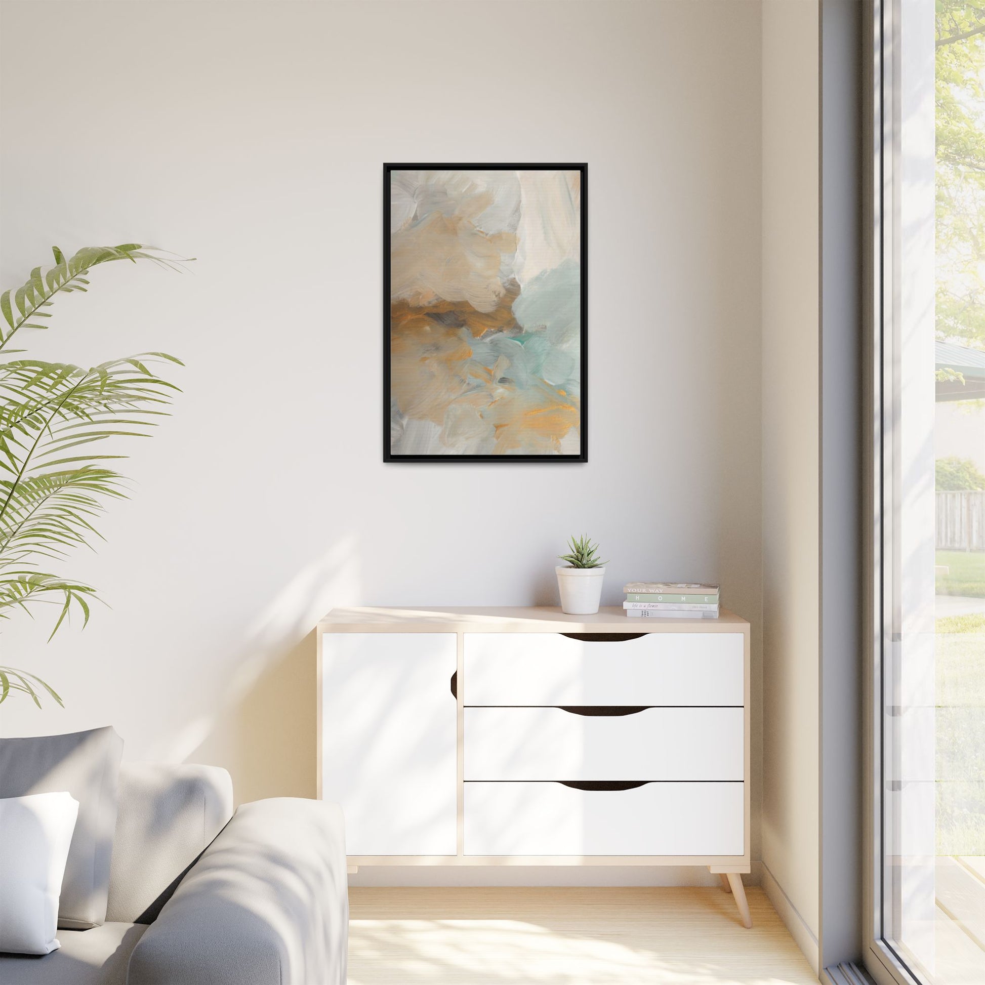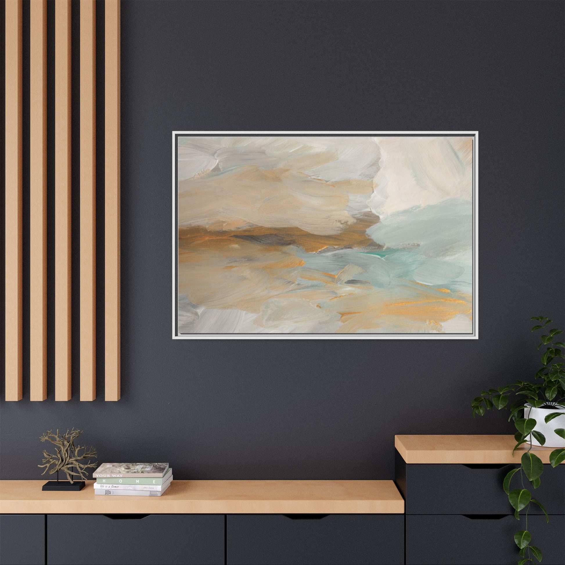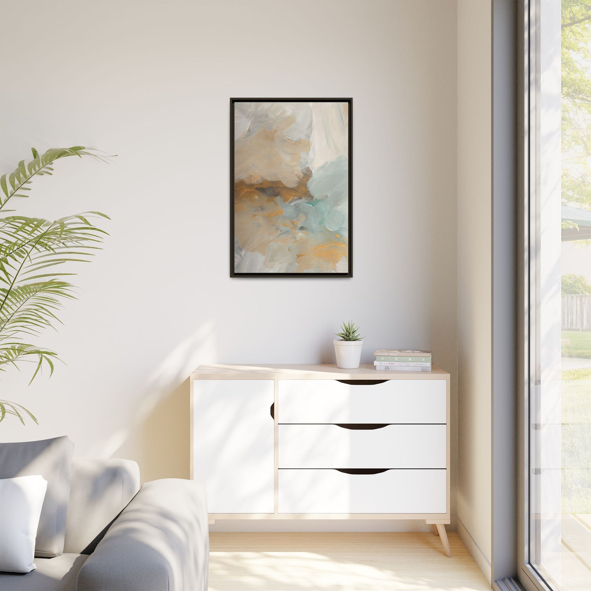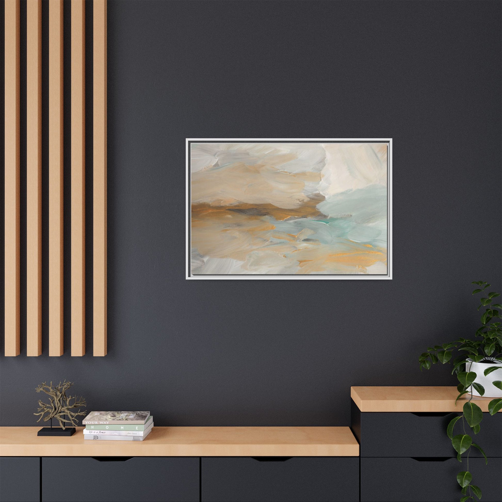 This abstract landscape painting showcases a serene and ethereal composition of soft, blended colors. Sweeping brushstrokes in muted tones of beige, white, golden yellow, and seafoam green create a dreamy, atmospheric effect reminiscent of a misty horizon or distant landscape. The painting's fluid technique allows colors to blend and flow into each other, creating subtle transitions and depth that evoke a sense of tranquility and natural movement. Textural brushwork adds dimension and visual interest, with each stroke revealing layers of color and creating a sense of organic, almost geological formation. The artwork's gentle color palette and abstract style invite viewers to interpret the scene through their own emotional and visual lens, suggesting a meditative and expansive landscape.