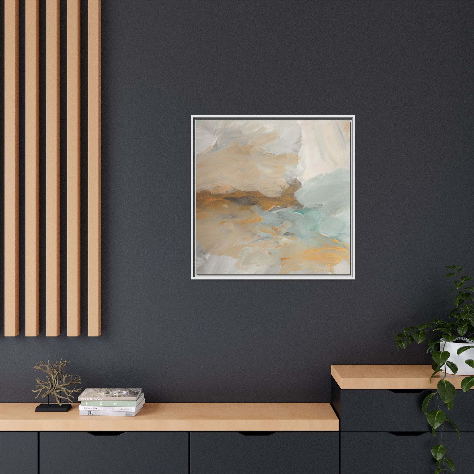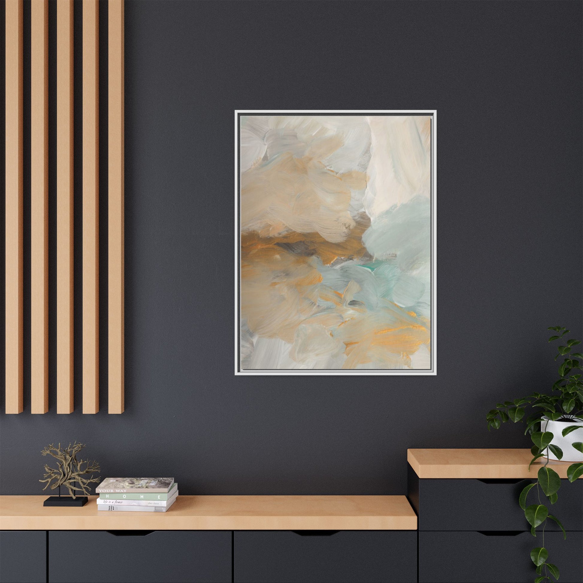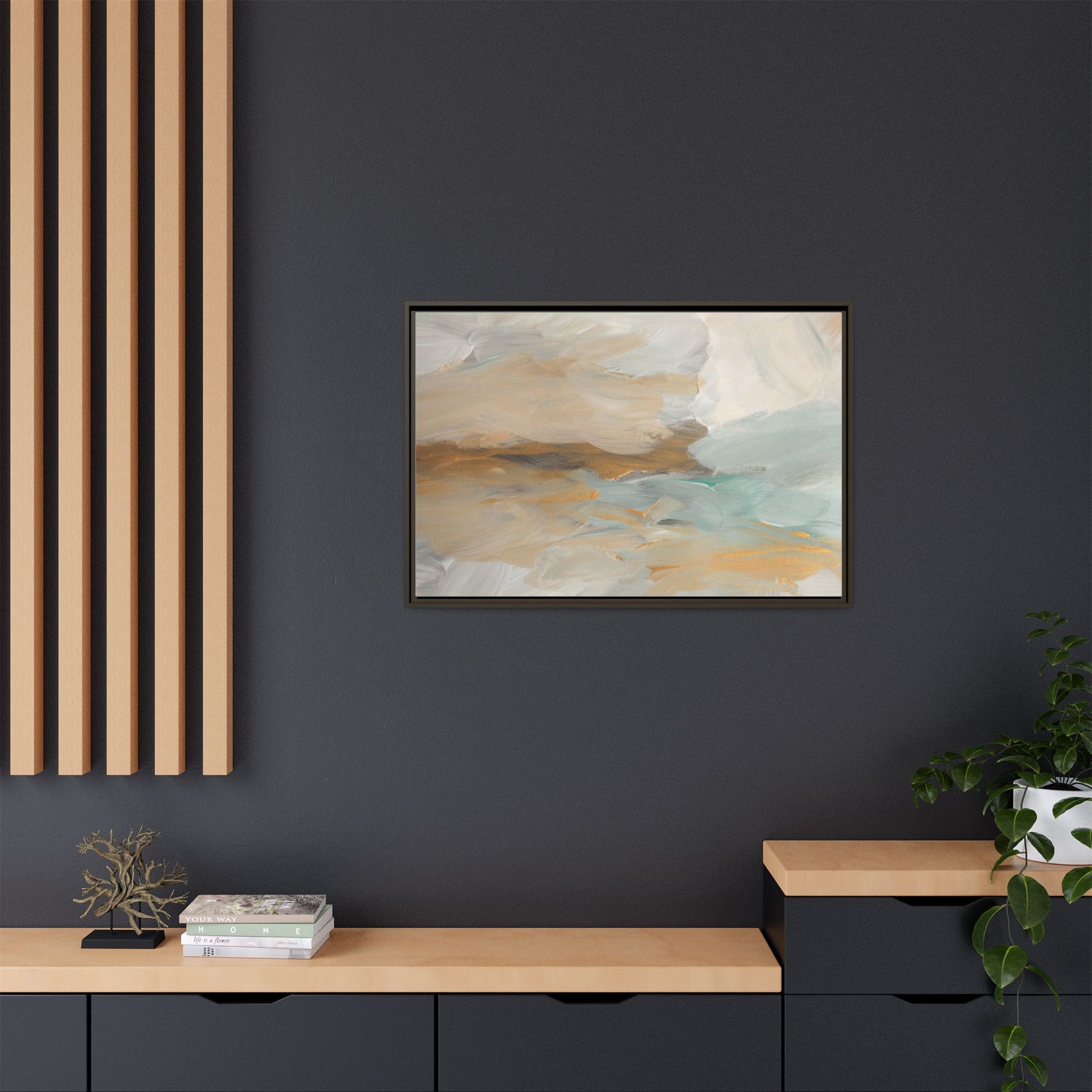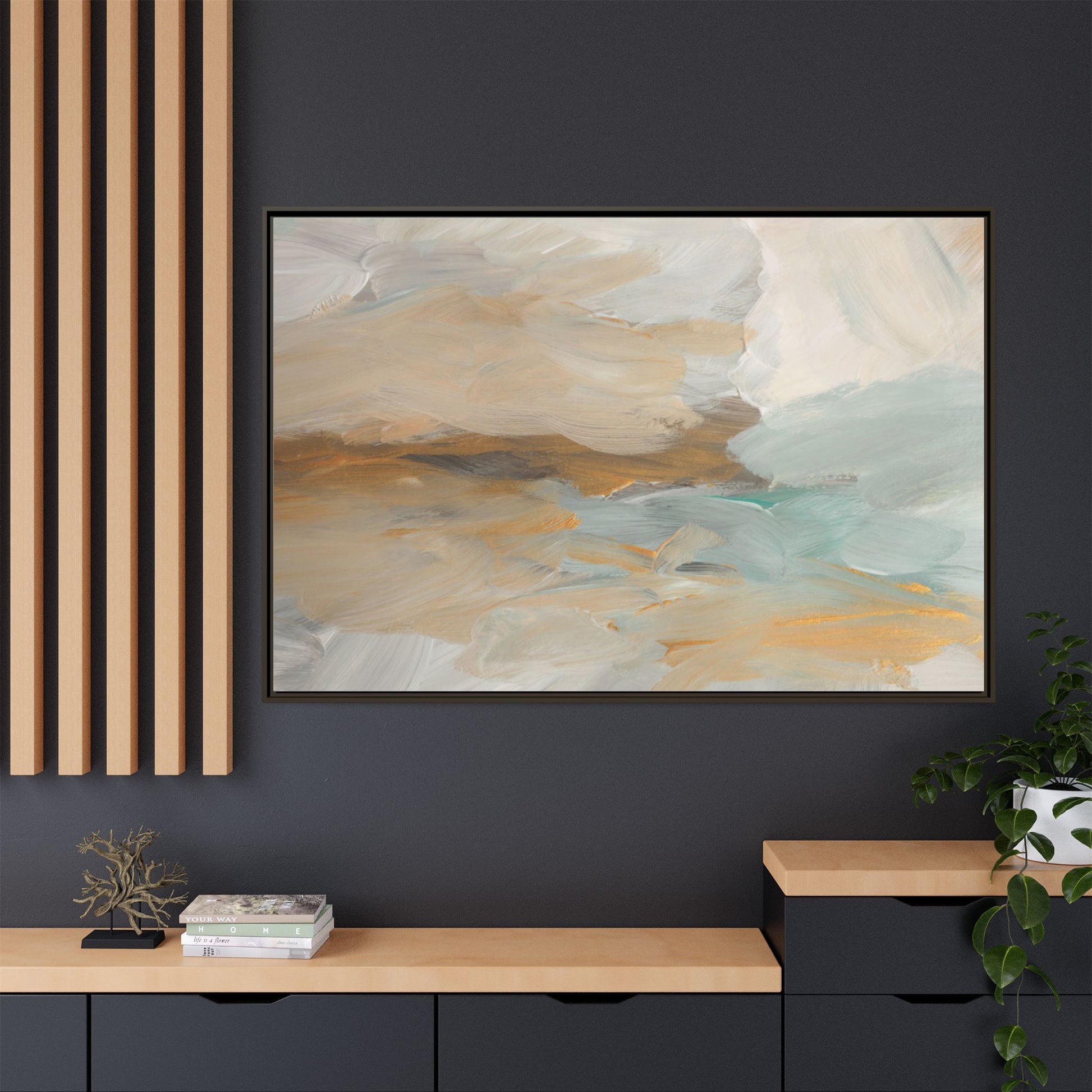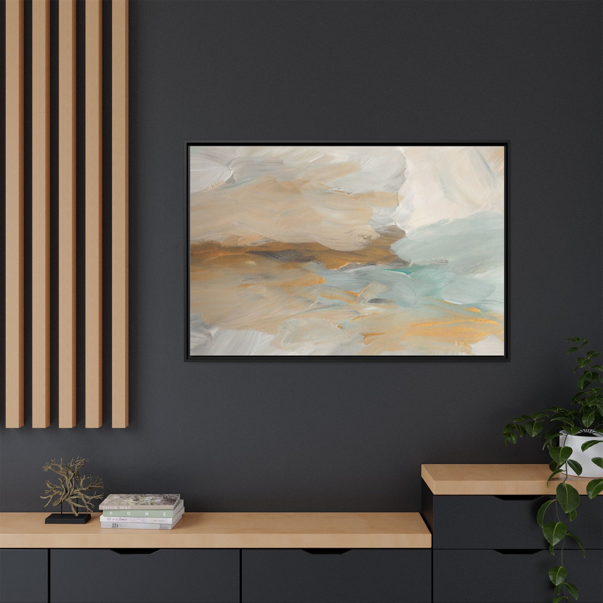 This abstract landscape painting showcases a serene and ethereal composition of soft, blended colors. Sweeping brushstrokes in muted tones of beige, white, golden yellow, and seafoam green create a dreamy, atmospheric effect reminiscent of a misty horizon or distant landscape. The painting's fluid technique allows colors to blend and flow into each other, creating subtle transitions and depth that evoke a sense of tranquility and natural movement. Textural brushwork adds dimension and visual interest, with each stroke revealing layers of color and creating a sense of organic, almost geological formation. The artwork's gentle color palette and abstract style invite viewers to interpret the scene through their own emotional and visual lens, suggesting a meditative and expansive landscape.