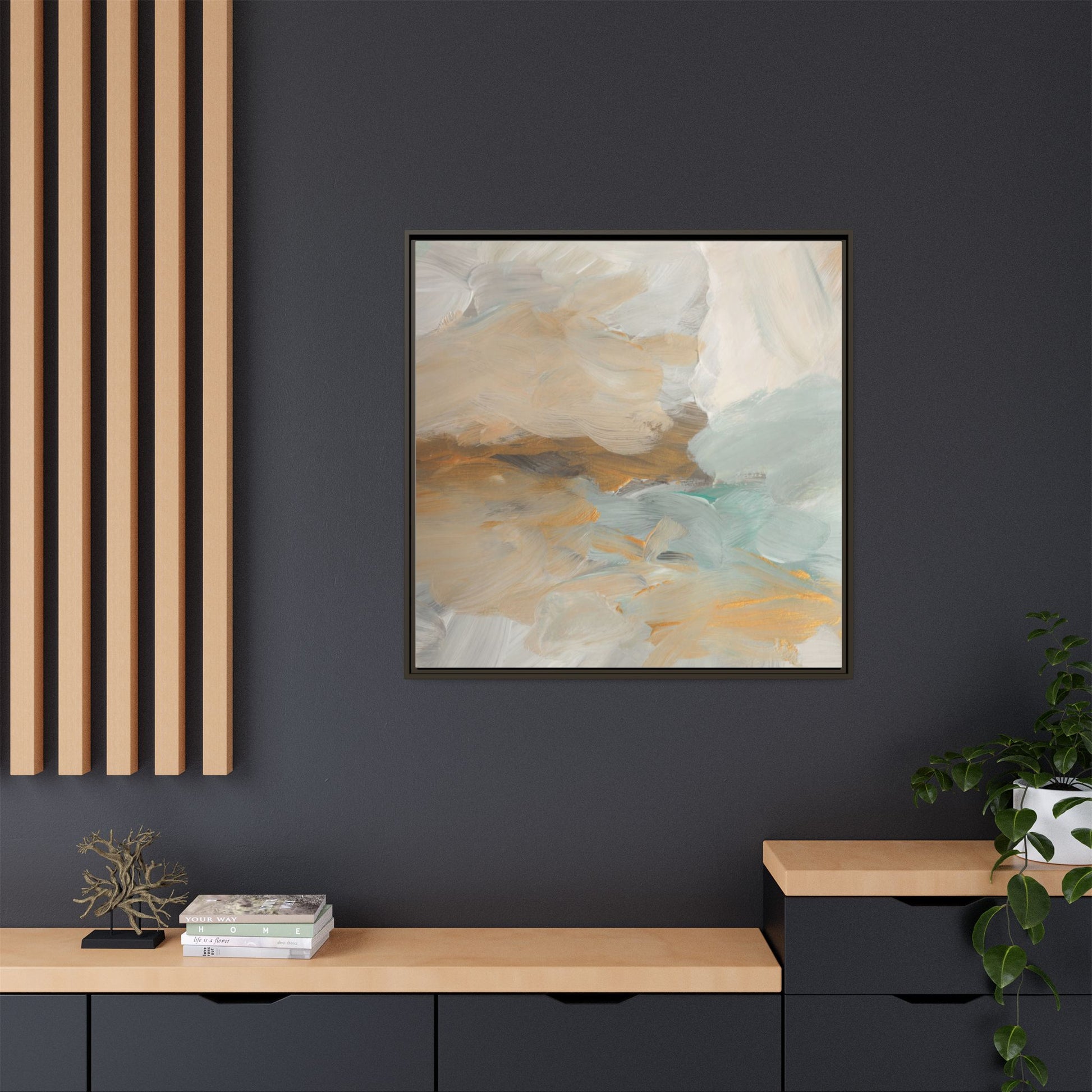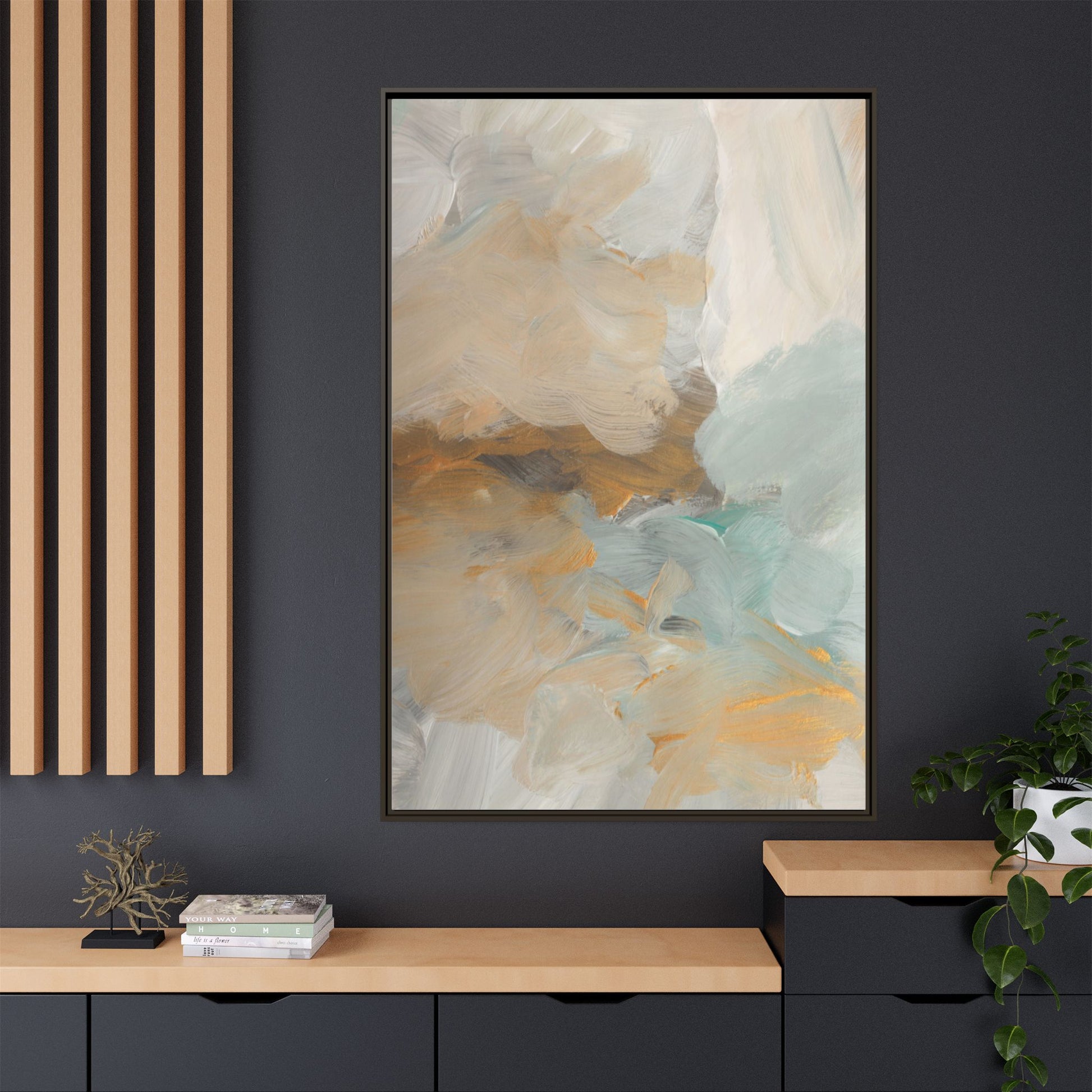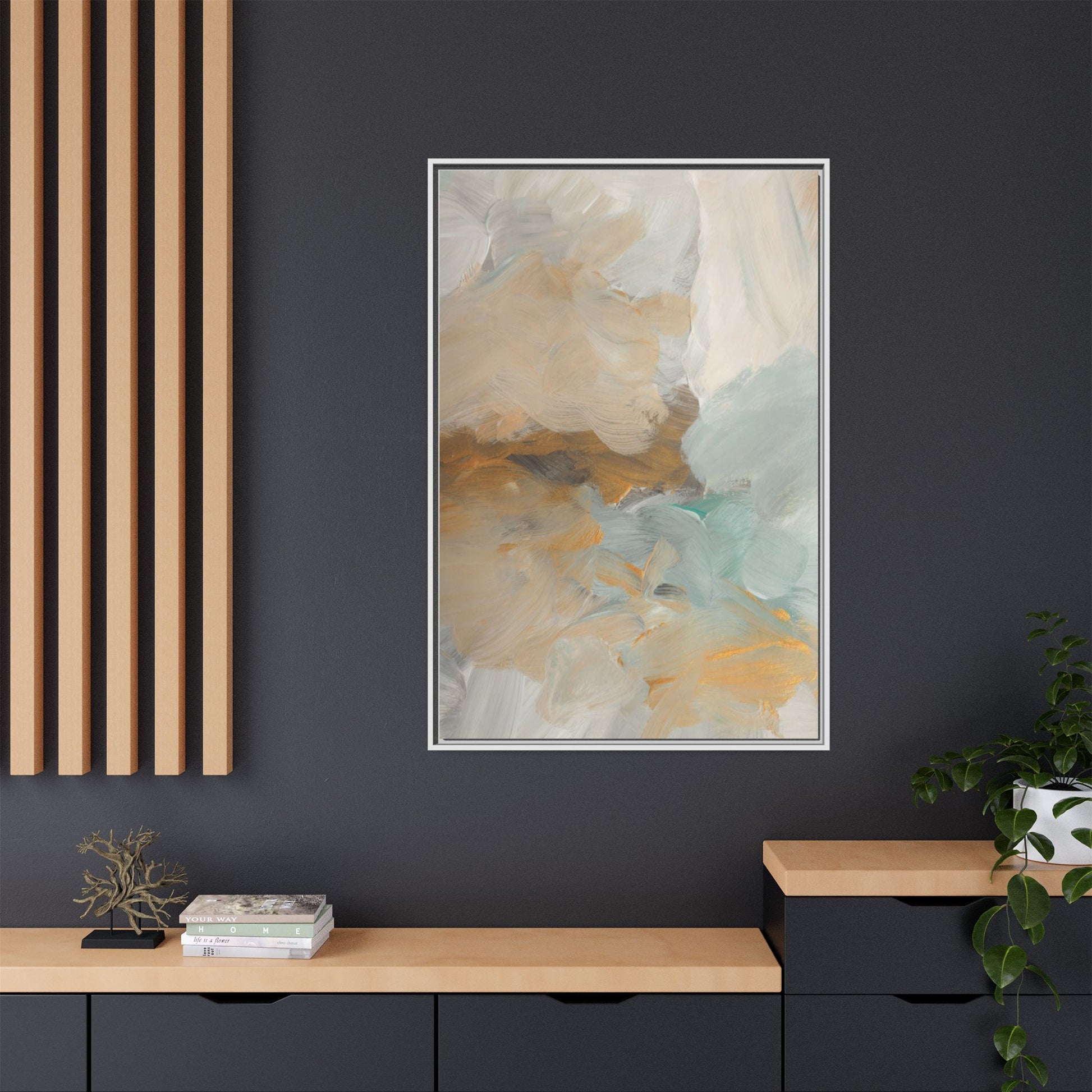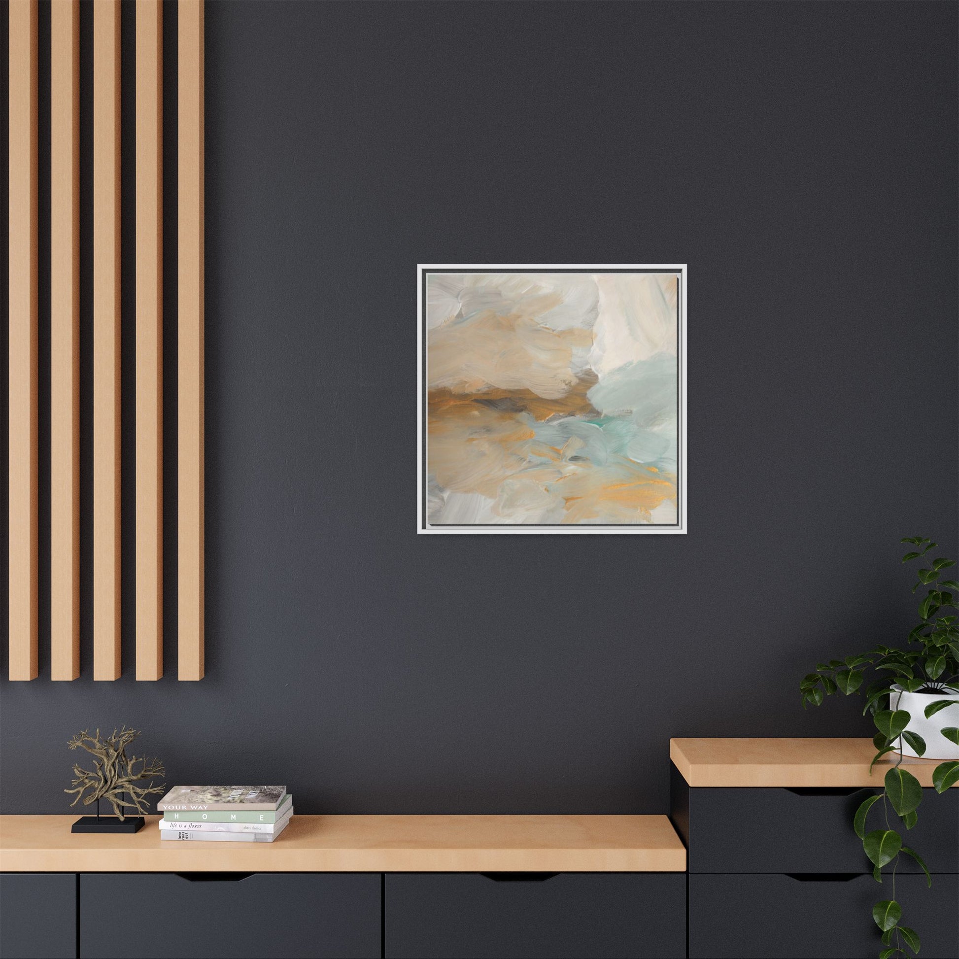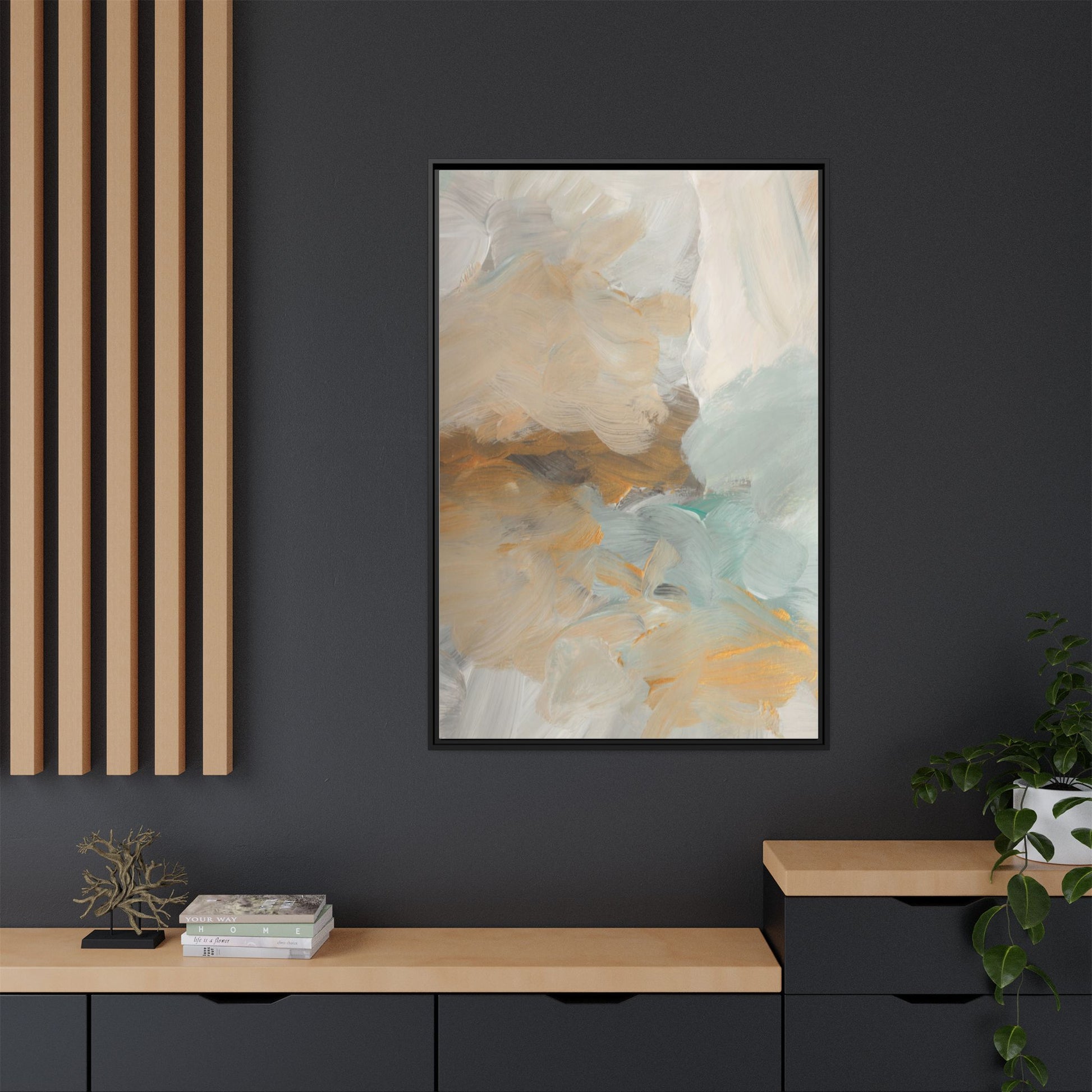 This abstract landscape painting showcases a serene and ethereal composition of soft, blended colors. Sweeping brushstrokes in muted tones of beige, white, golden yellow, and seafoam green create a dreamy, atmospheric effect reminiscent of a misty horizon or distant landscape. The painting's fluid technique allows colors to blend and flow into each other, creating subtle transitions and depth that evoke a sense of tranquility and natural movement. Textural brushwork adds dimension and visual interest, with each stroke revealing layers of color and creating a sense of organic, almost geological formation. The artwork's gentle color palette and abstract style invite viewers to interpret the scene through their own emotional and visual lens, suggesting a meditative and expansive landscape.