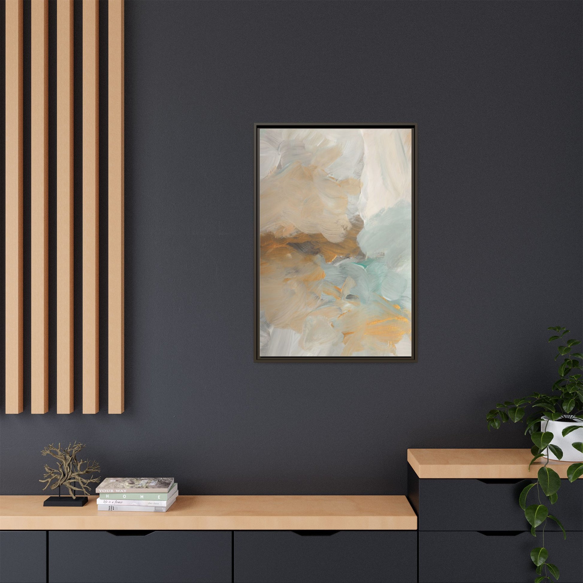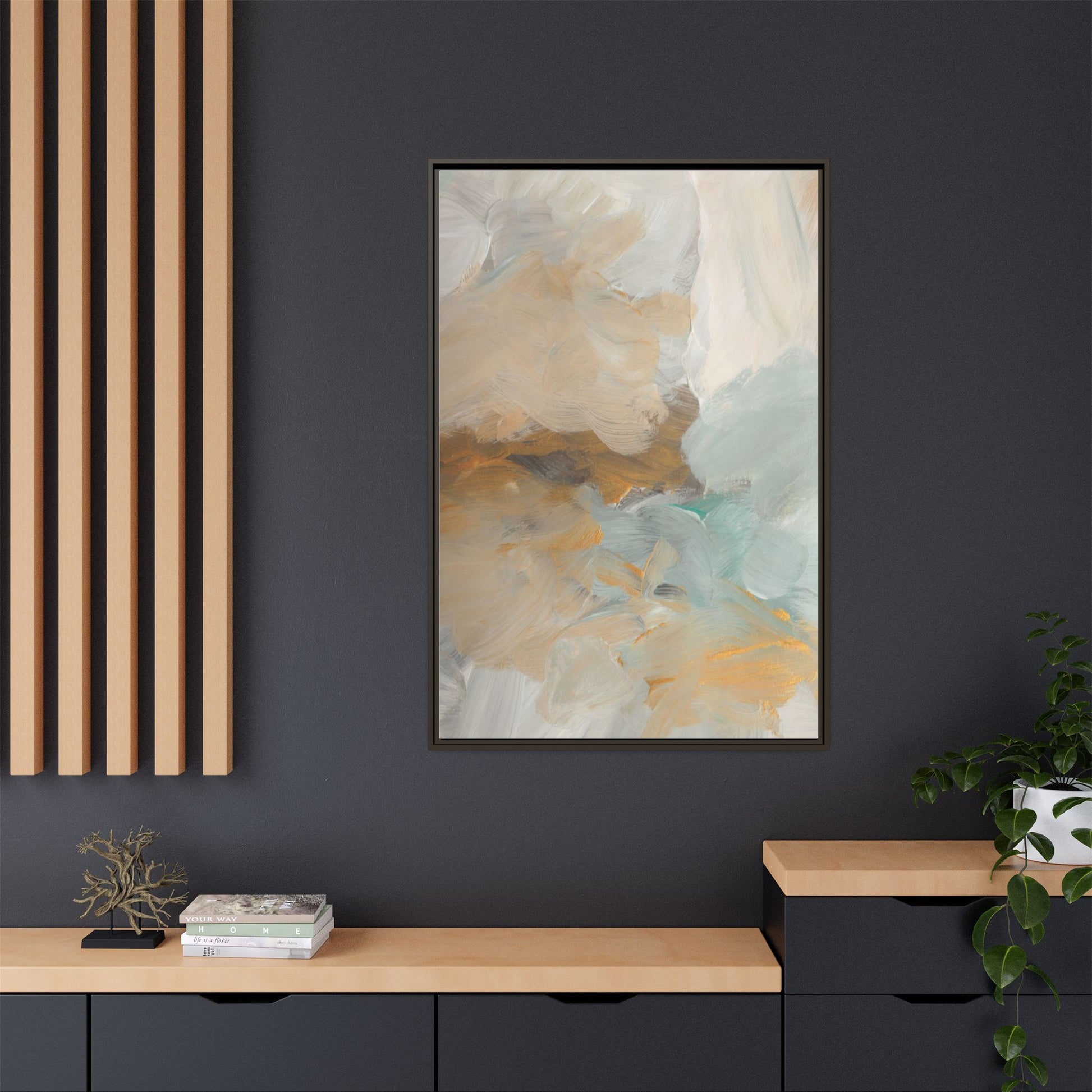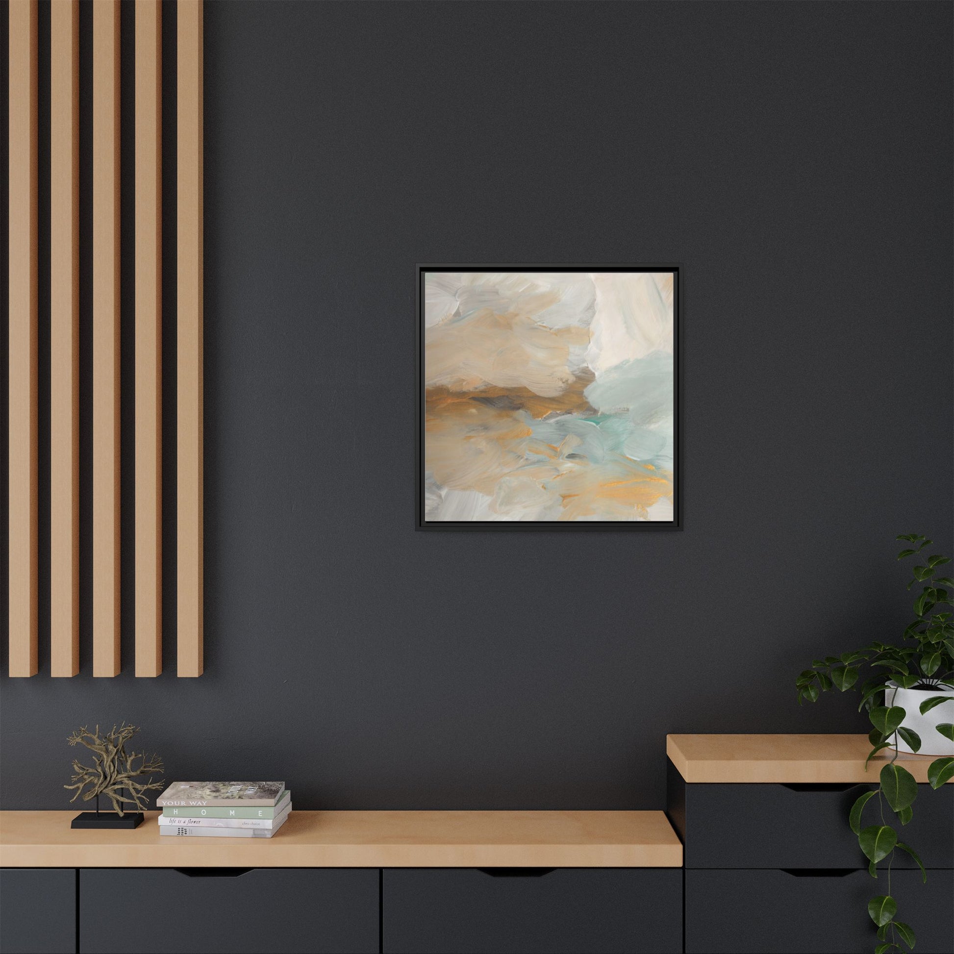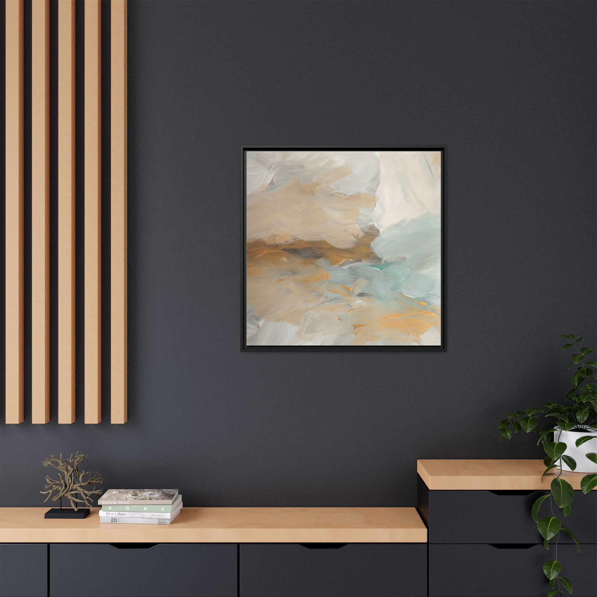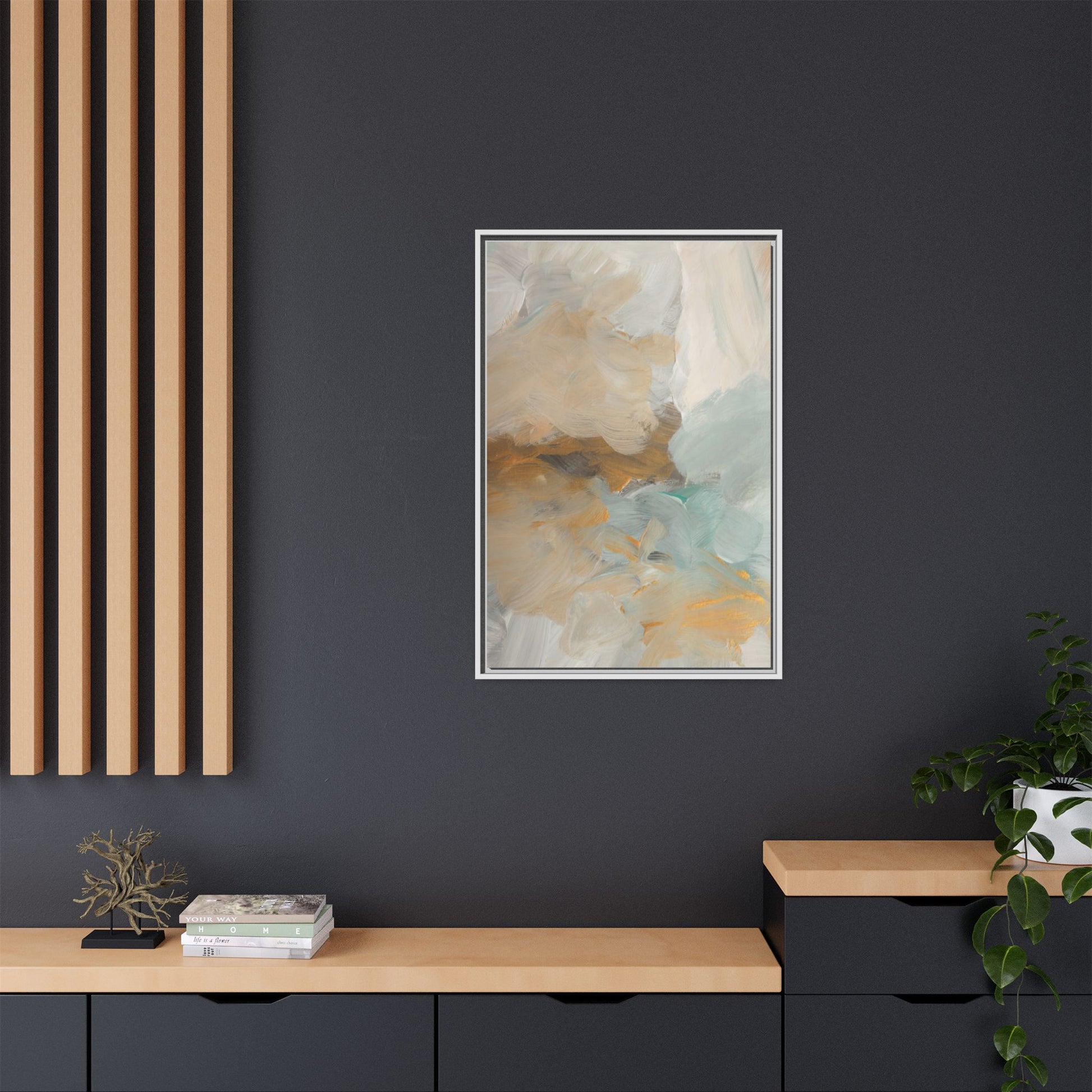 This abstract landscape painting showcases a serene and ethereal composition of soft, blended colors. Sweeping brushstrokes in muted tones of beige, white, golden yellow, and seafoam green create a dreamy, atmospheric effect reminiscent of a misty horizon or distant landscape. The painting's fluid technique allows colors to blend and flow into each other, creating subtle transitions and depth that evoke a sense of tranquility and natural movement. Textural brushwork adds dimension and visual interest, with each stroke revealing layers of color and creating a sense of organic, almost geological formation. The artwork's gentle color palette and abstract style invite viewers to interpret the scene through their own emotional and visual lens, suggesting a meditative and expansive landscape.