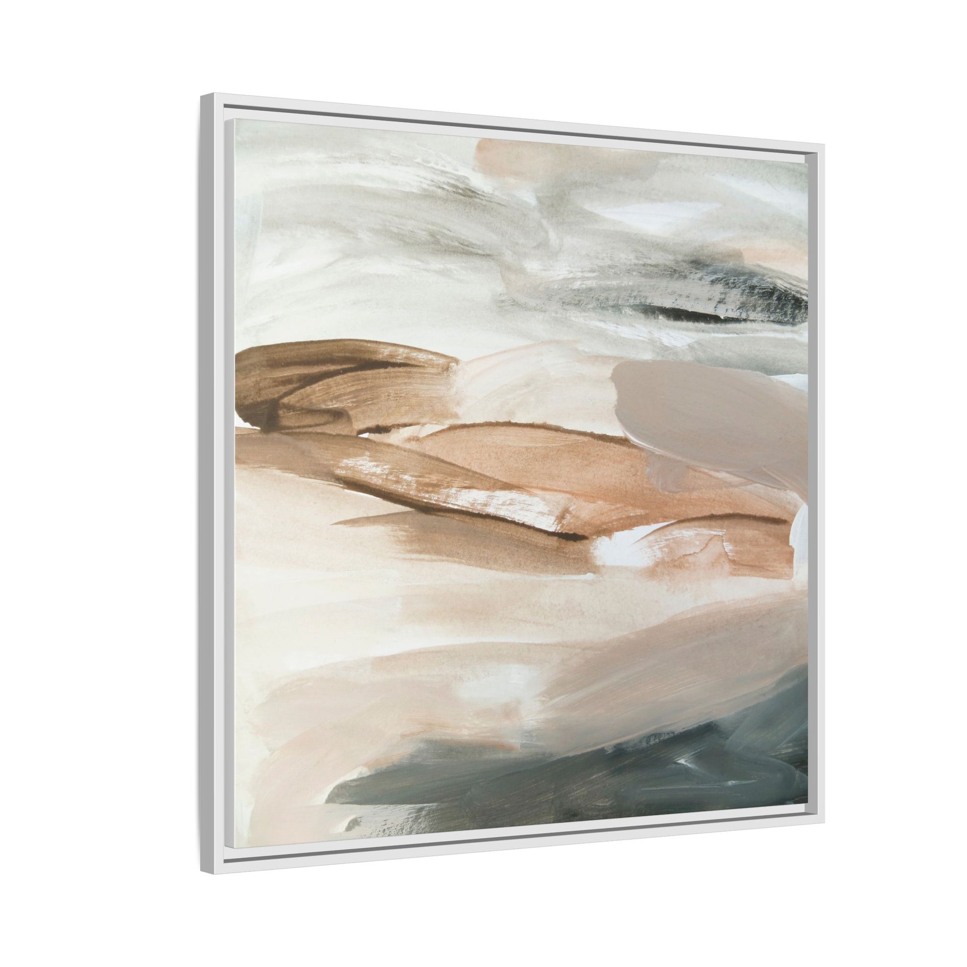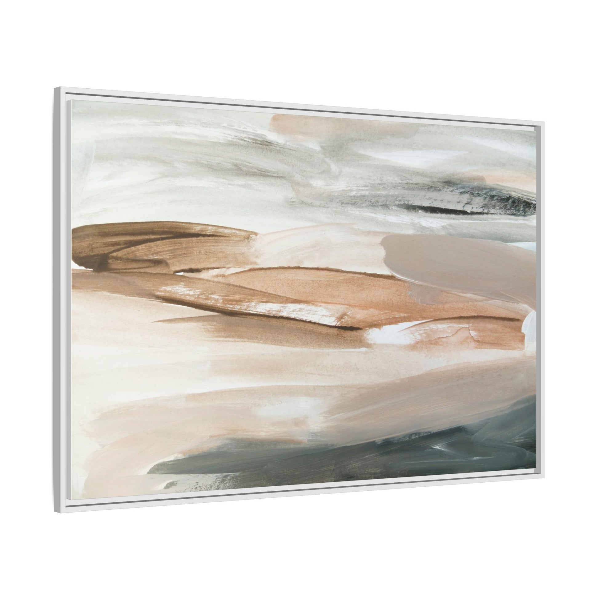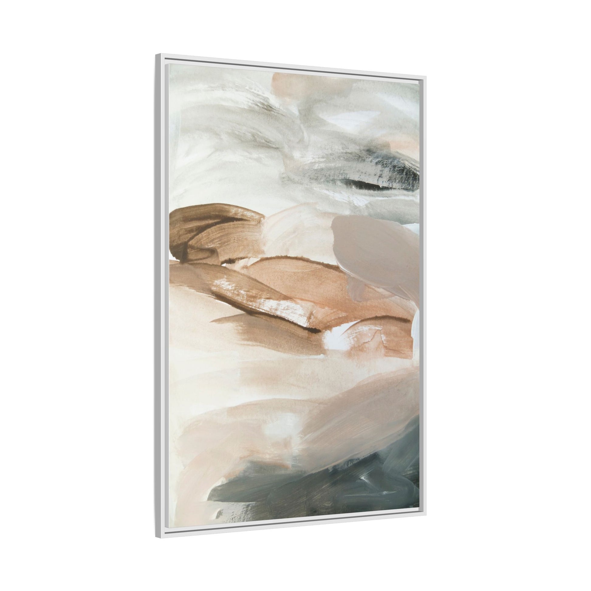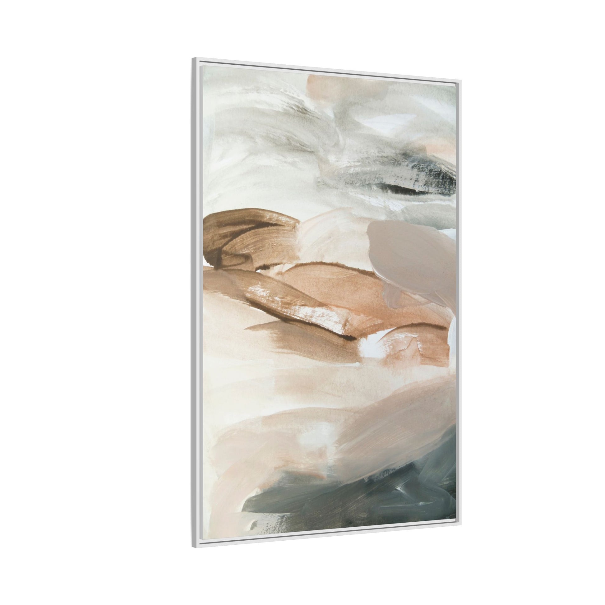 This abstract watercolor painting features a soft, ethereal landscape composed of muted earth tones and delicate brushstrokes. Layers of beige, white, and grayish-green blend seamlessly, creating a fluid and dreamy composition that evokes natural terrain or geological formations. The artwork displays gentle, sweeping movements and translucent washes that give the impression of landscapes viewed from a great distance or through a misty lens. Subtle variations in color and texture create depth and movement, with lighter hues of cream and tan contrasting against deeper green and brown undertones. The painting's minimalist style and serene color palette suggest a sense of tranquility and contemplative beauty, inviting viewers to interpret the abstract forms through their own emotional lens.
