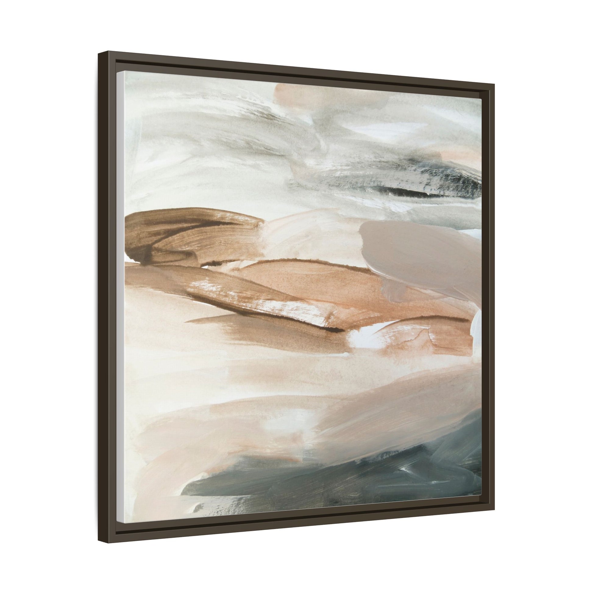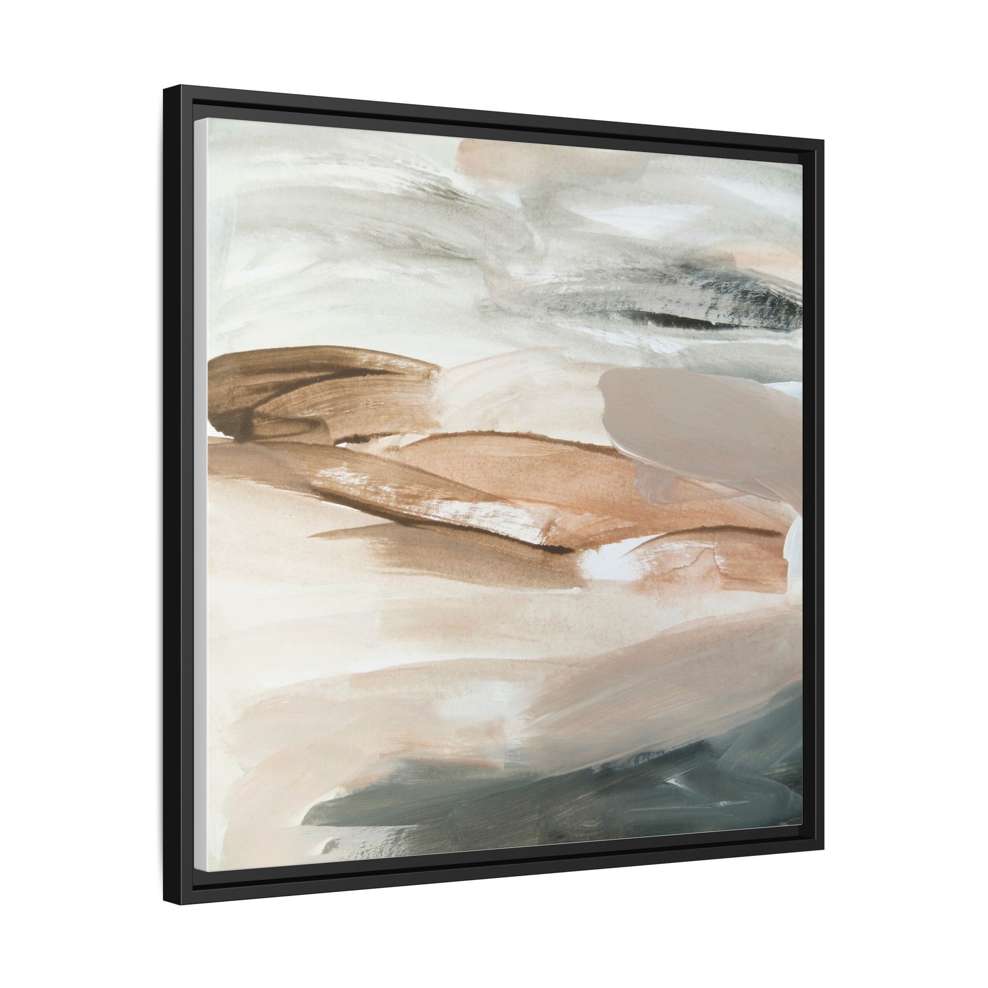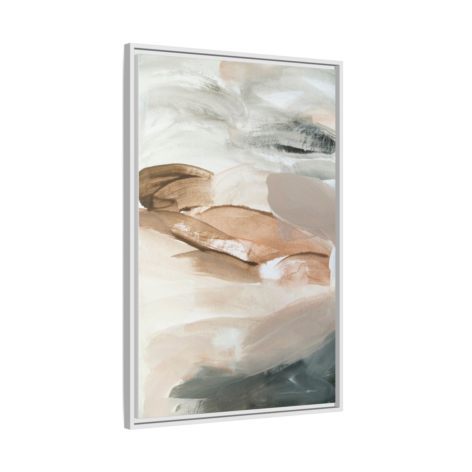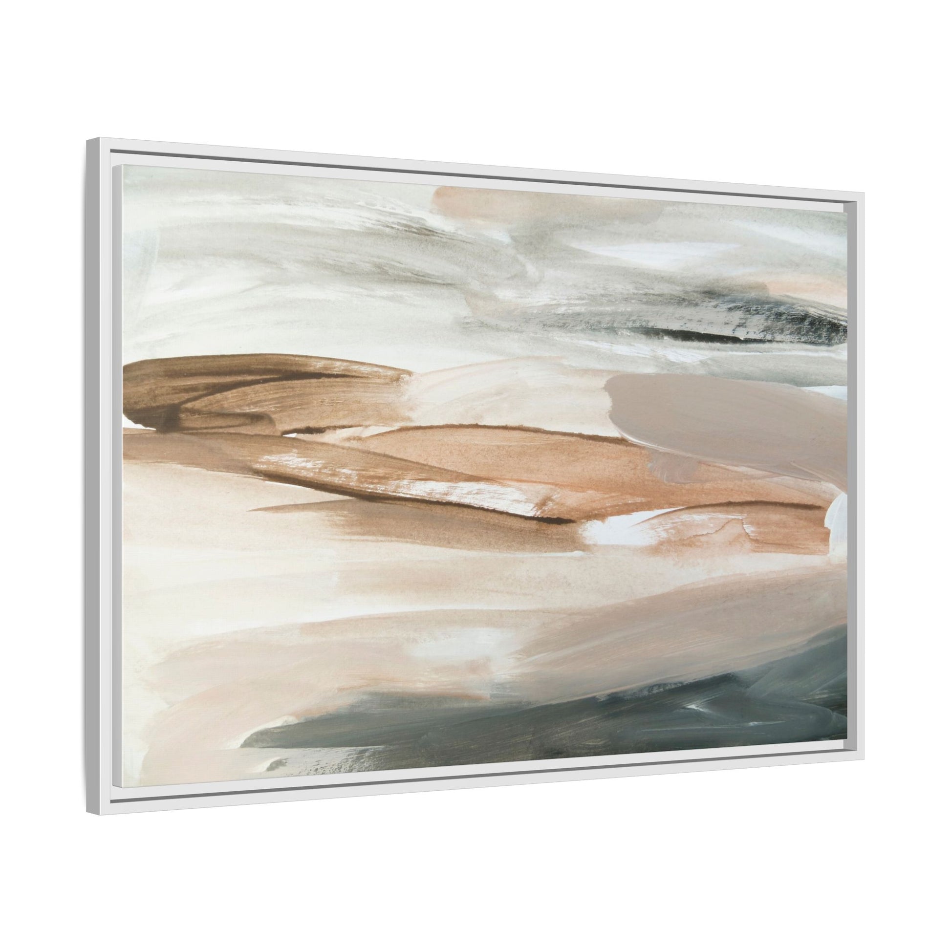 This abstract watercolor painting features a soft, ethereal landscape composed of muted earth tones and delicate brushstrokes. Layers of beige, white, and grayish-green blend seamlessly, creating a fluid and dreamy composition that evokes natural terrain or geological formations. The artwork displays gentle, sweeping movements and translucent washes that give the impression of landscapes viewed from a great distance or through a misty lens. Subtle variations in color and texture create depth and movement, with lighter hues of cream and tan contrasting against deeper green and brown undertones. The painting's minimalist style and serene color palette suggest a sense of tranquility and contemplative beauty, inviting viewers to interpret the abstract forms through their own emotional lens.