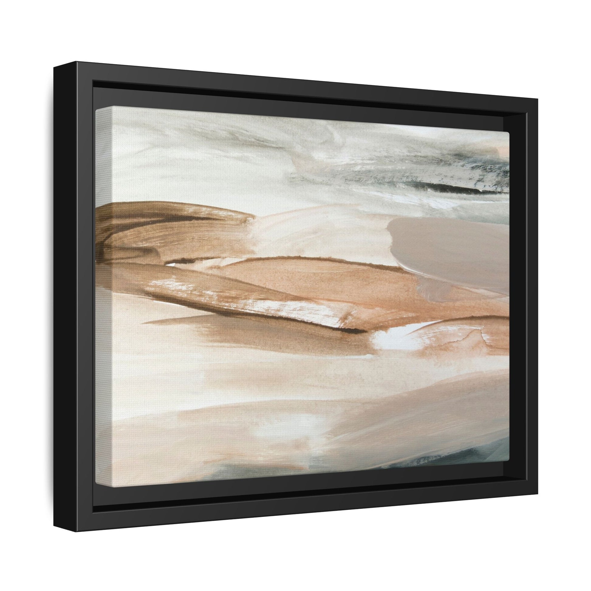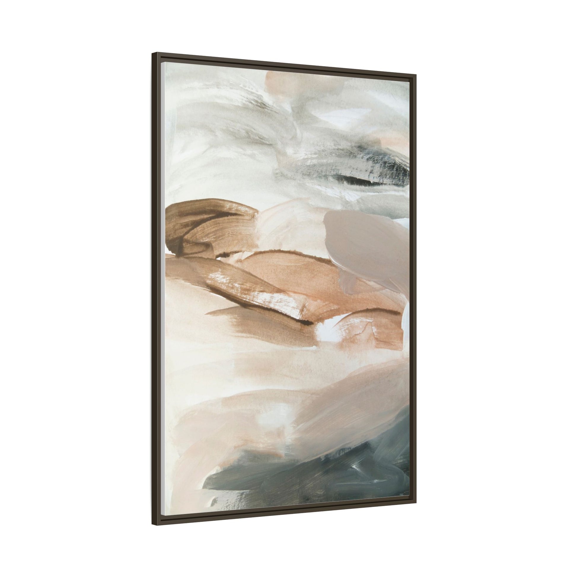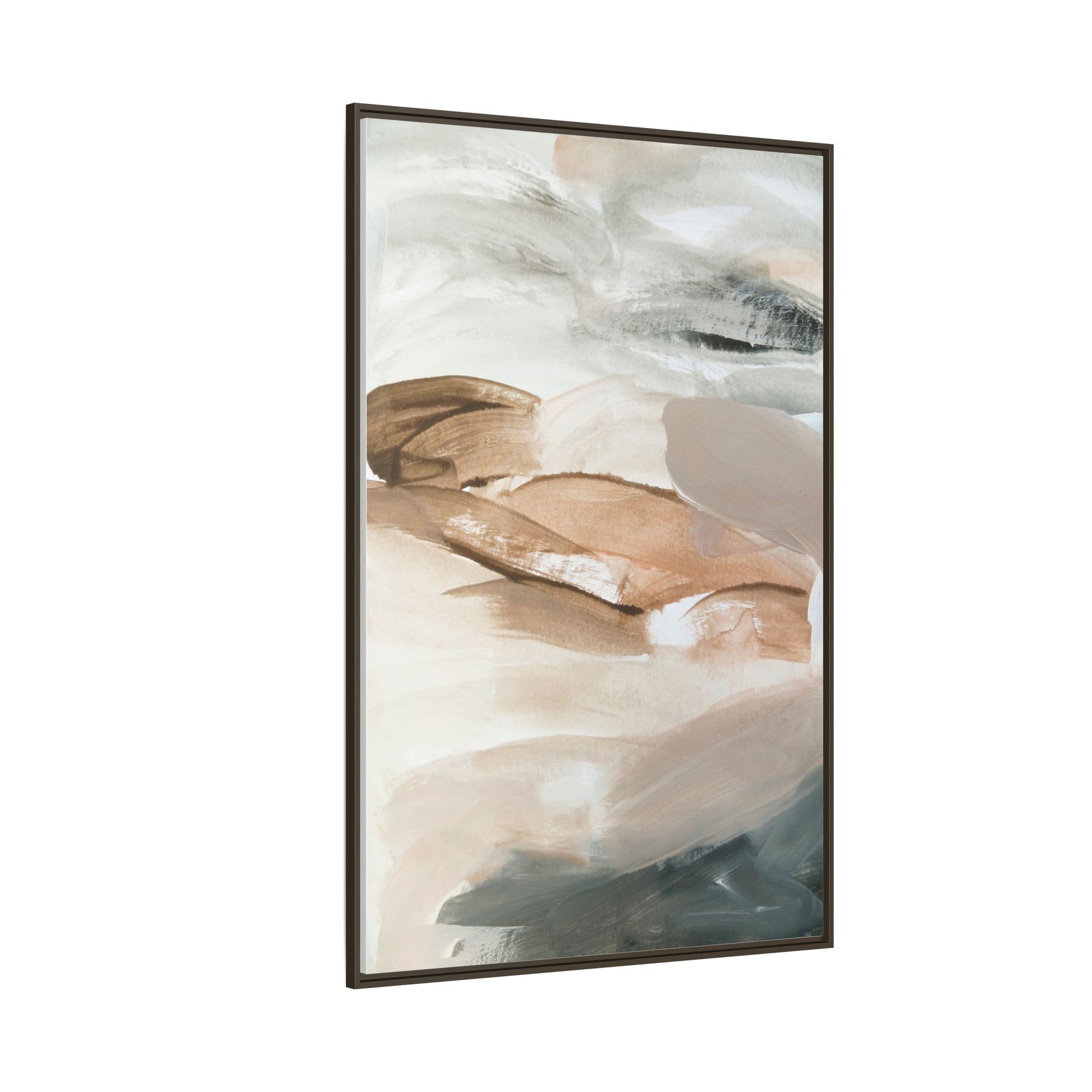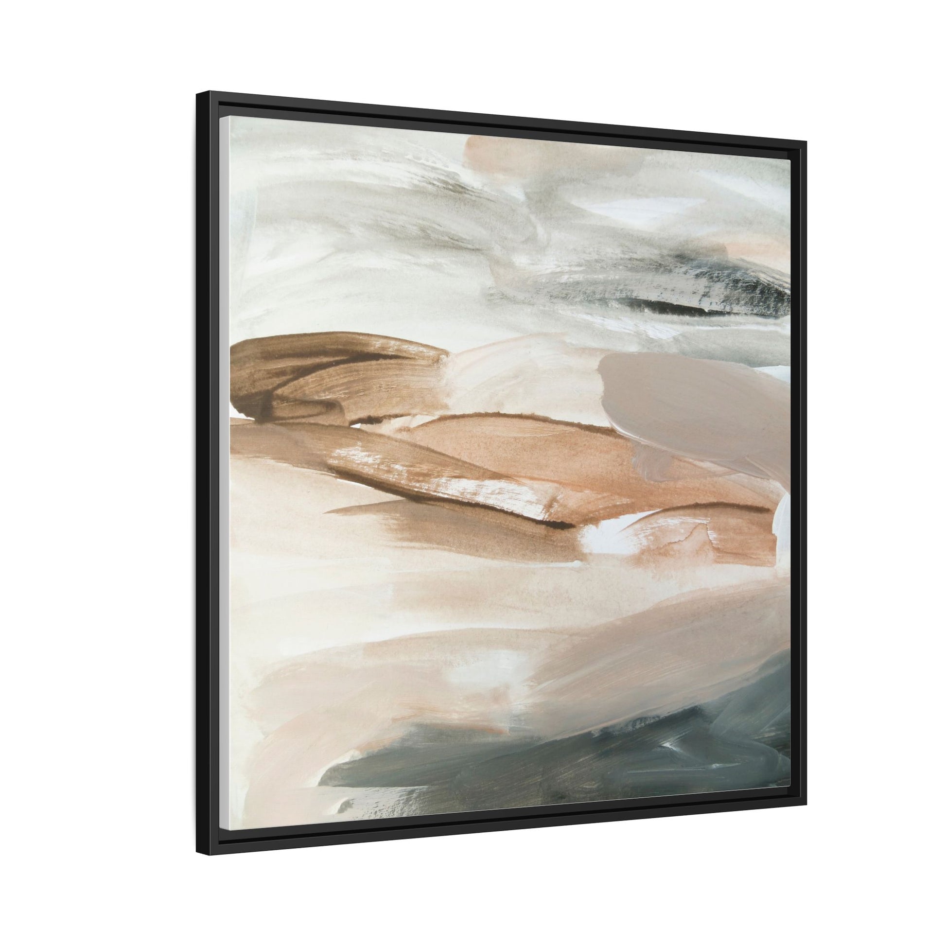This abstract watercolor painting features a soft, ethereal landscape composed of muted earth tones and delicate brushstrokes. Layers of beige, white, and grayish-green blend seamlessly, creating a fluid and dreamy composition that evokes natural terrain or geological formations. The artwork displays gentle, sweeping movements and translucent washes that give the impression of landscapes viewed from a great distance or through a misty lens. Subtle variations in color and texture create depth and movement, with lighter hues of cream and tan contrasting against deeper green and brown undertones. The painting's minimalist style and serene color palette suggest a sense of tranquility and contemplative beauty, inviting viewers to interpret the abstract forms through their own emotional lens.