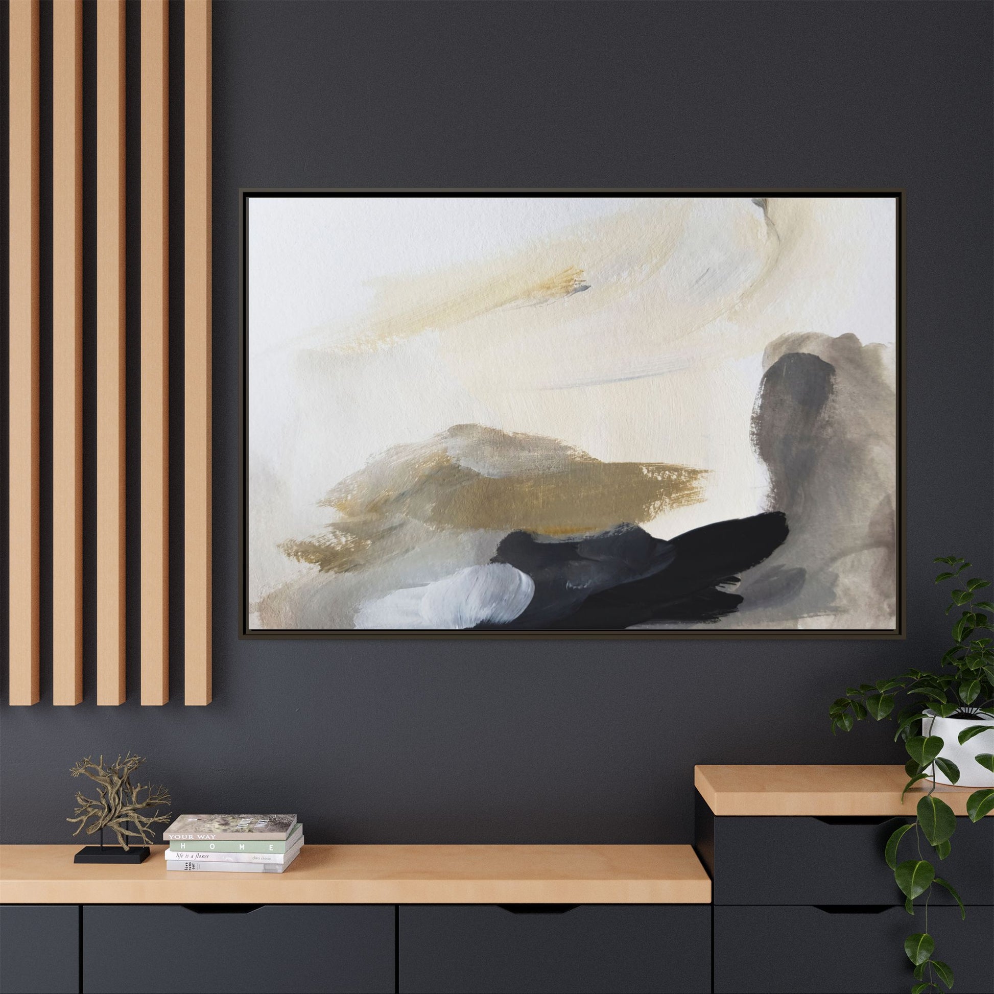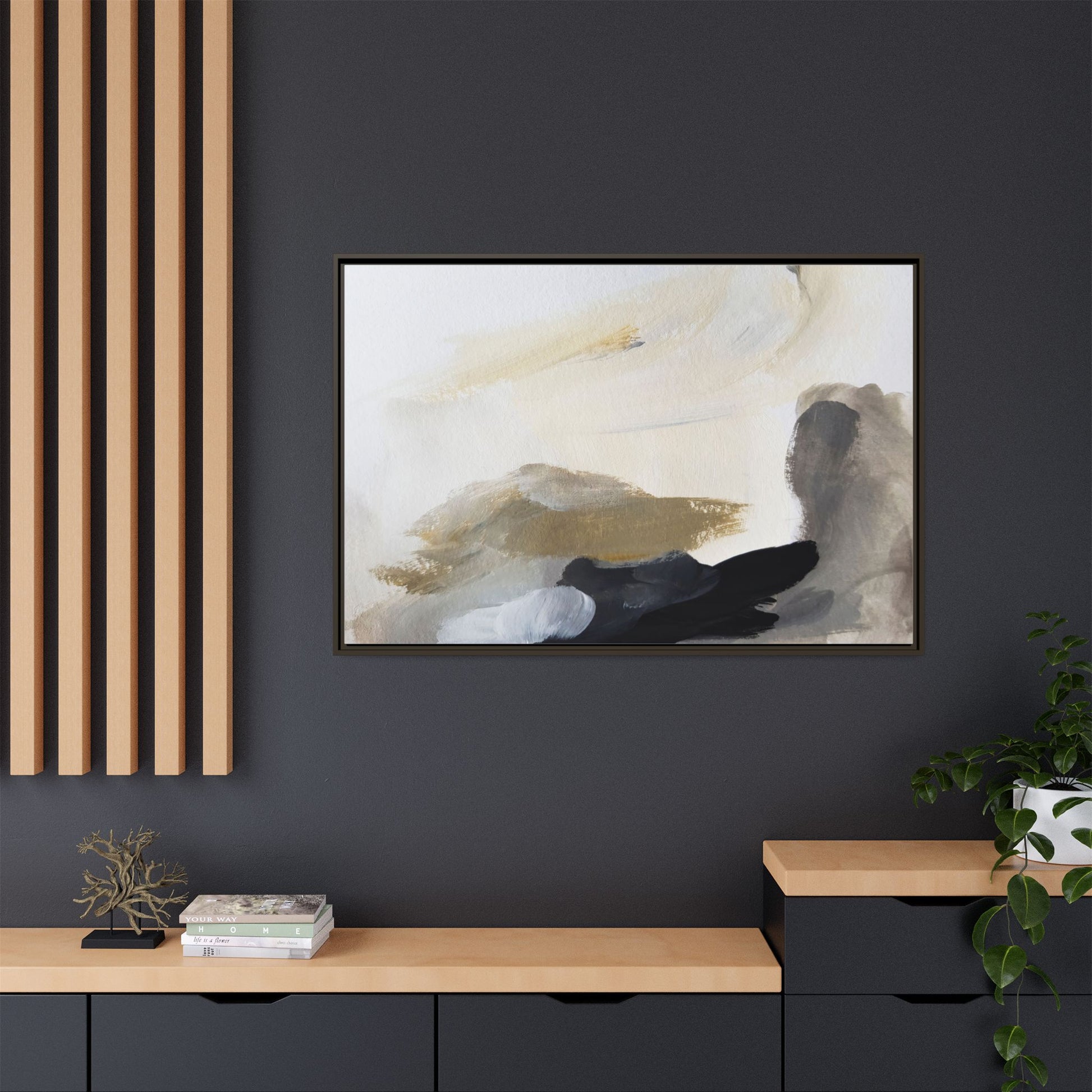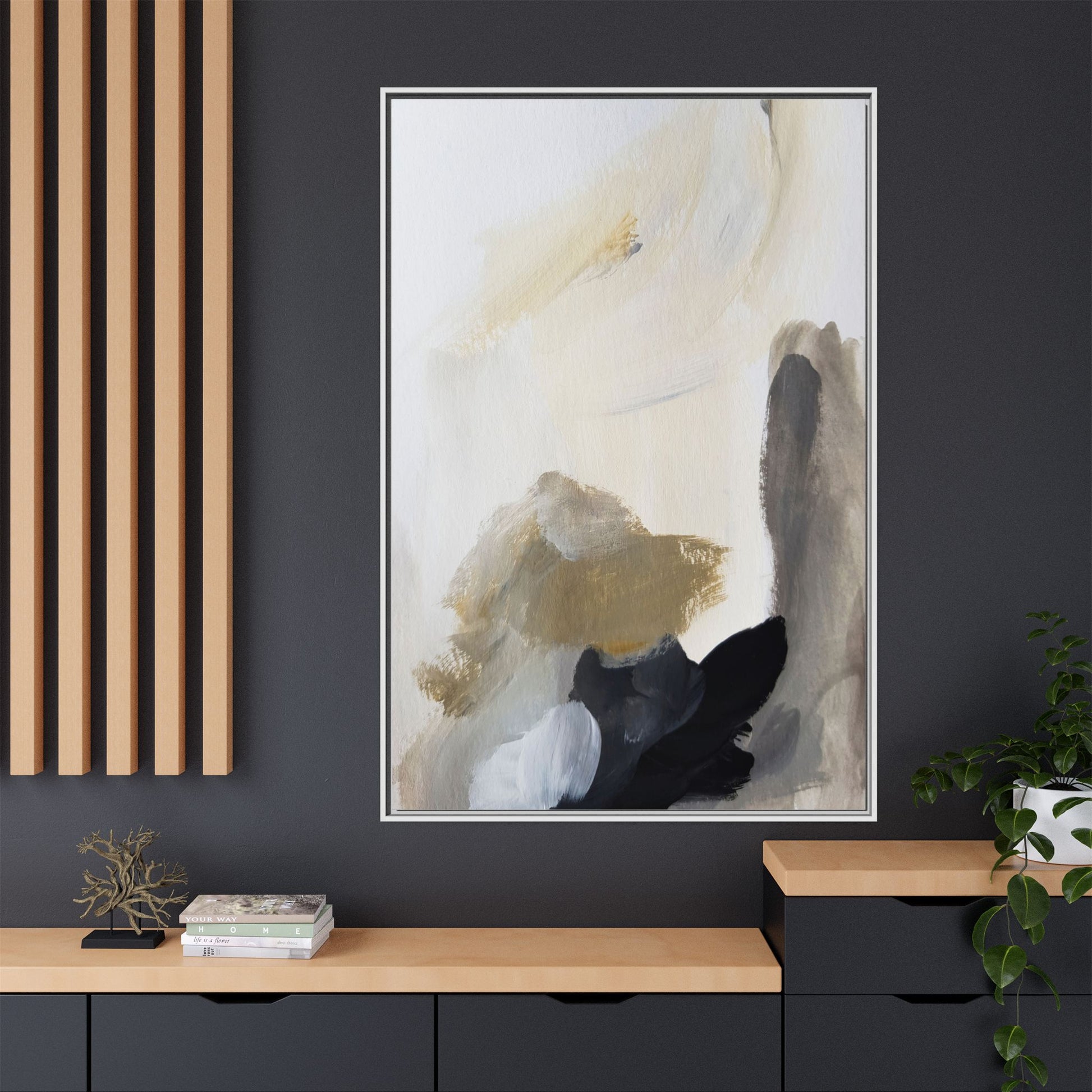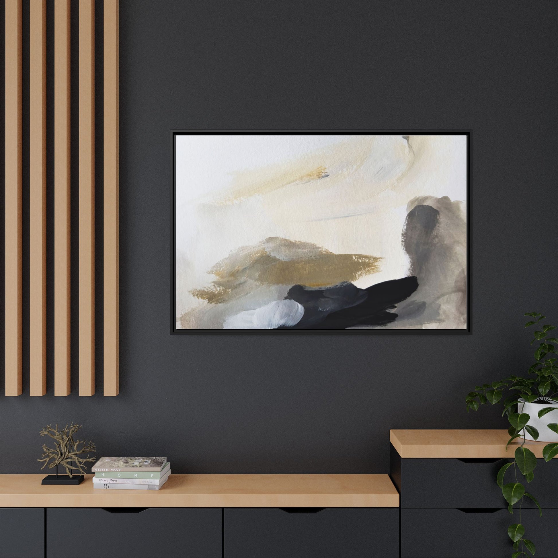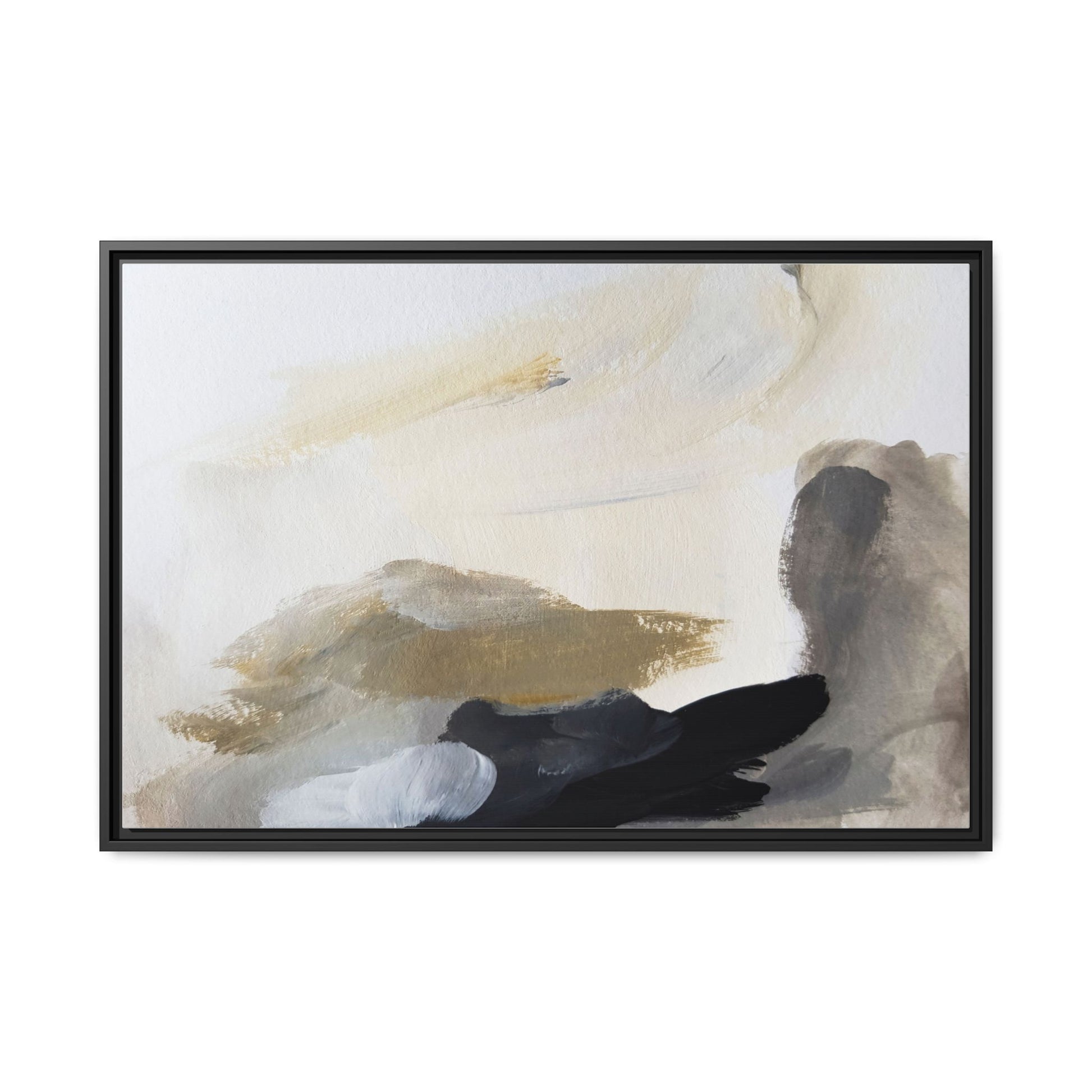 This abstract watercolor painting features a minimalist composition with soft, muted tones of white, beige, gray, and black. Delicate brushstrokes create organic, fluid shapes that seem to float and blend into one another across the canvas. The color palette is subdued and neutral, giving the artwork a sense of tranquility and subtle depth. Lighter areas with golden and cream-colored highlights contrast against darker charcoal and black elements, creating visual interest and movement. The painting's style suggests a contemplative, modern approach to abstract expressionism, with an emphasis on gentle transitions and ethereal forms.