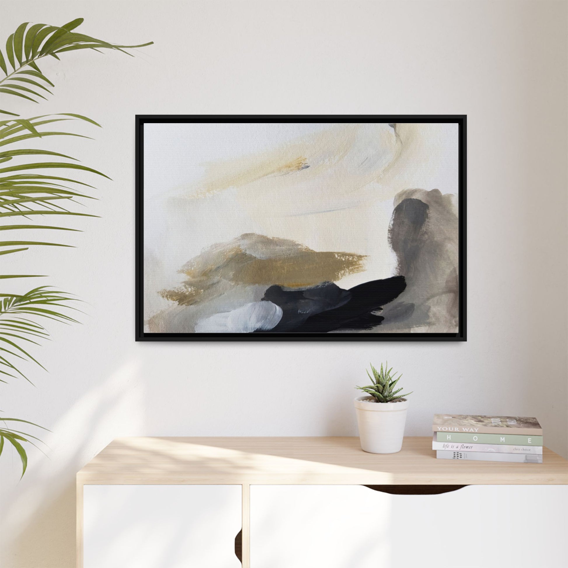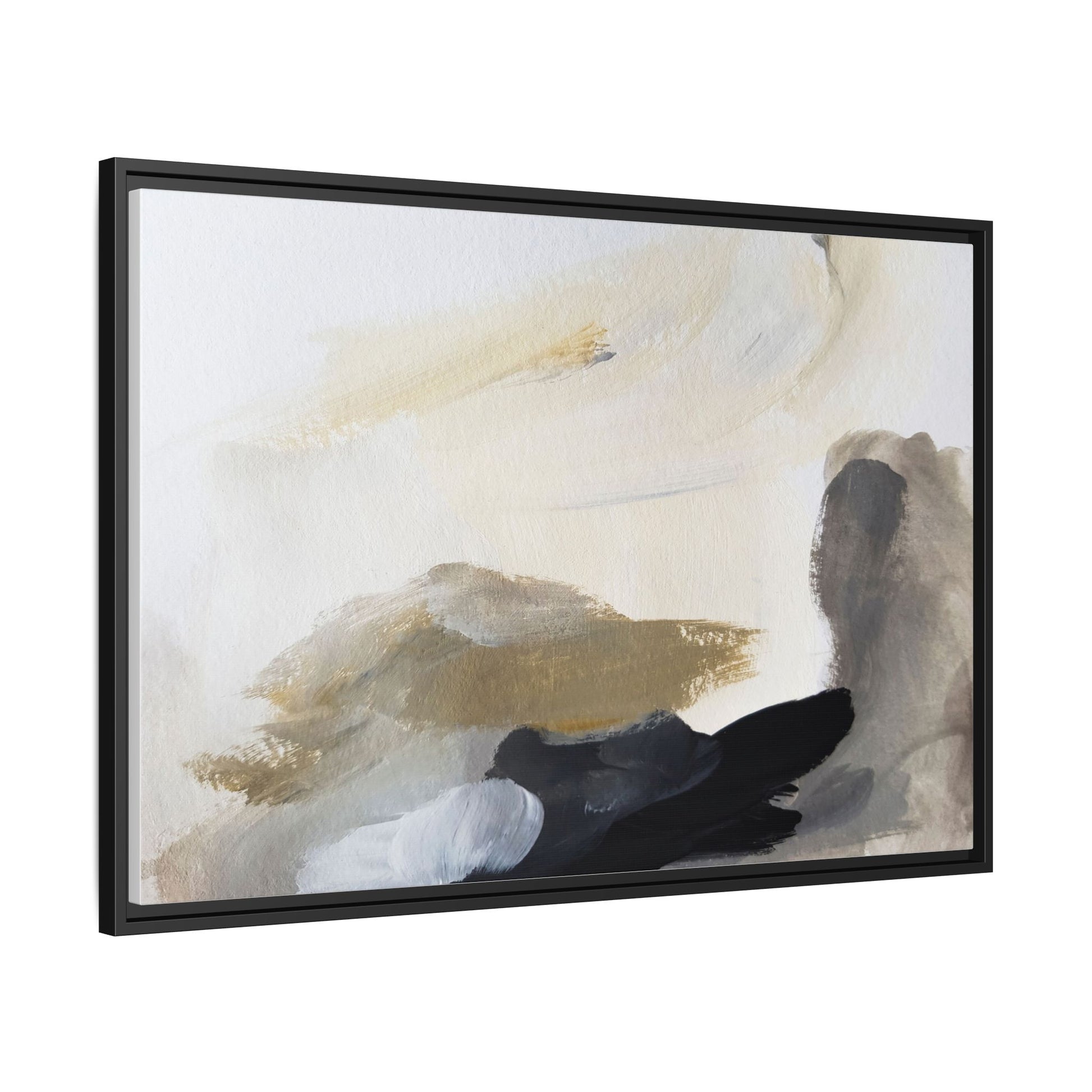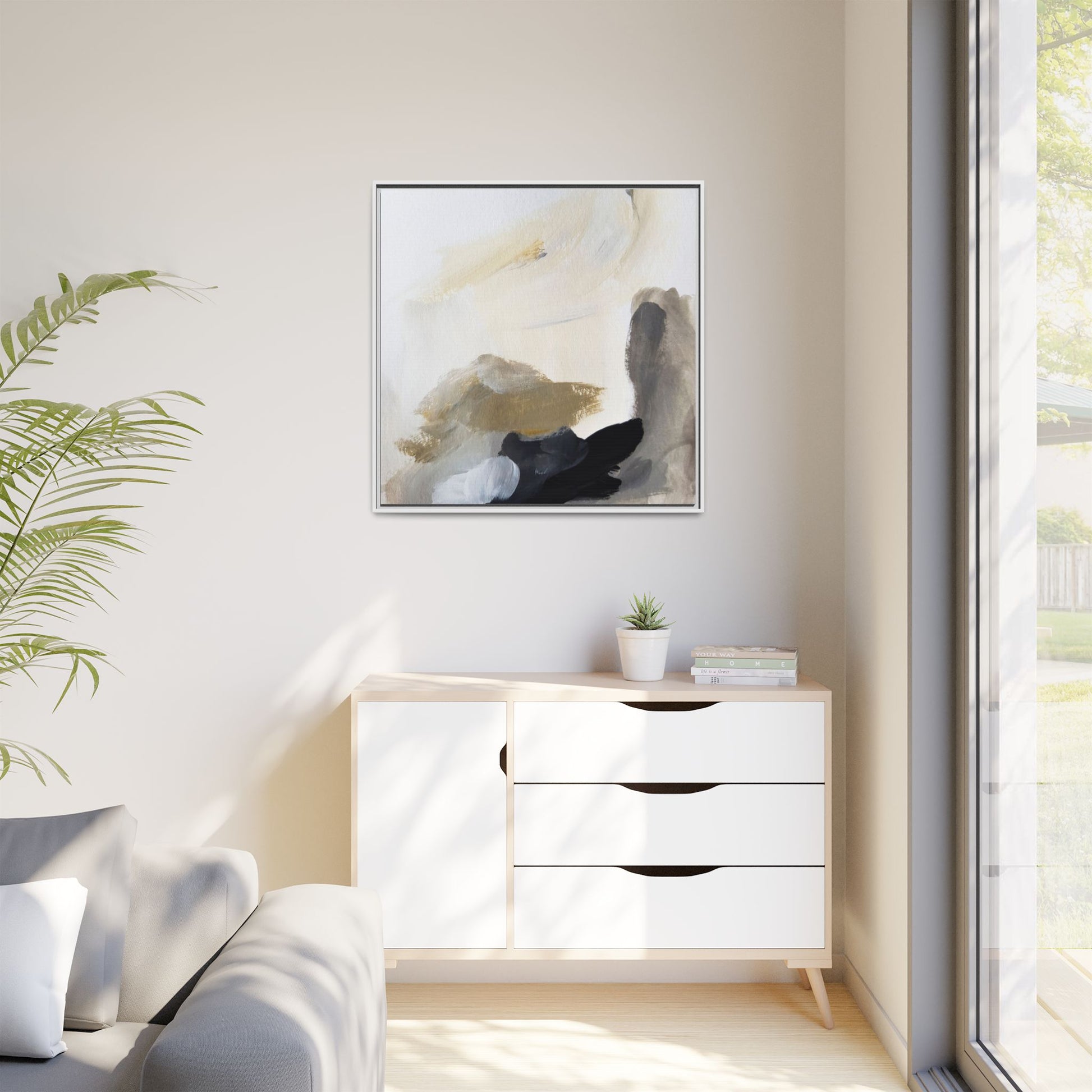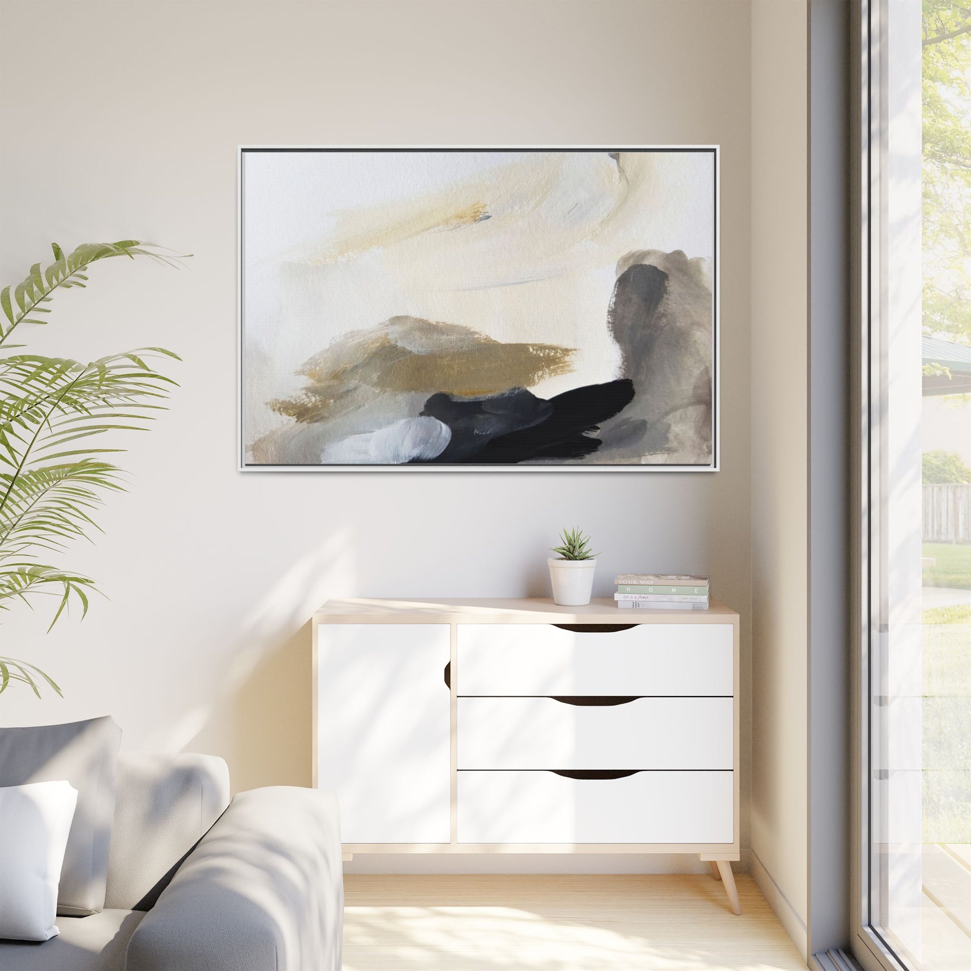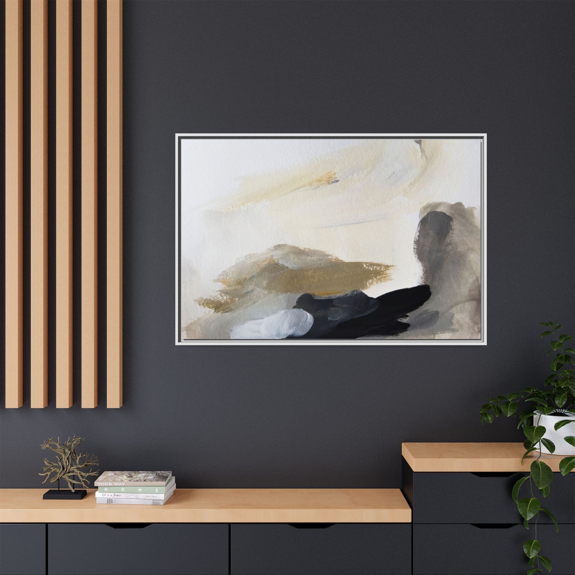 This abstract watercolor painting features a minimalist composition with soft, muted tones of white, beige, gray, and black. Delicate brushstrokes create organic, fluid shapes that seem to float and blend into one another across the canvas. The color palette is subdued and neutral, giving the artwork a sense of tranquility and subtle depth. Lighter areas with golden and cream-colored highlights contrast against darker charcoal and black elements, creating visual interest and movement. The painting's style suggests a contemplative, modern approach to abstract expressionism, with an emphasis on gentle transitions and ethereal forms.