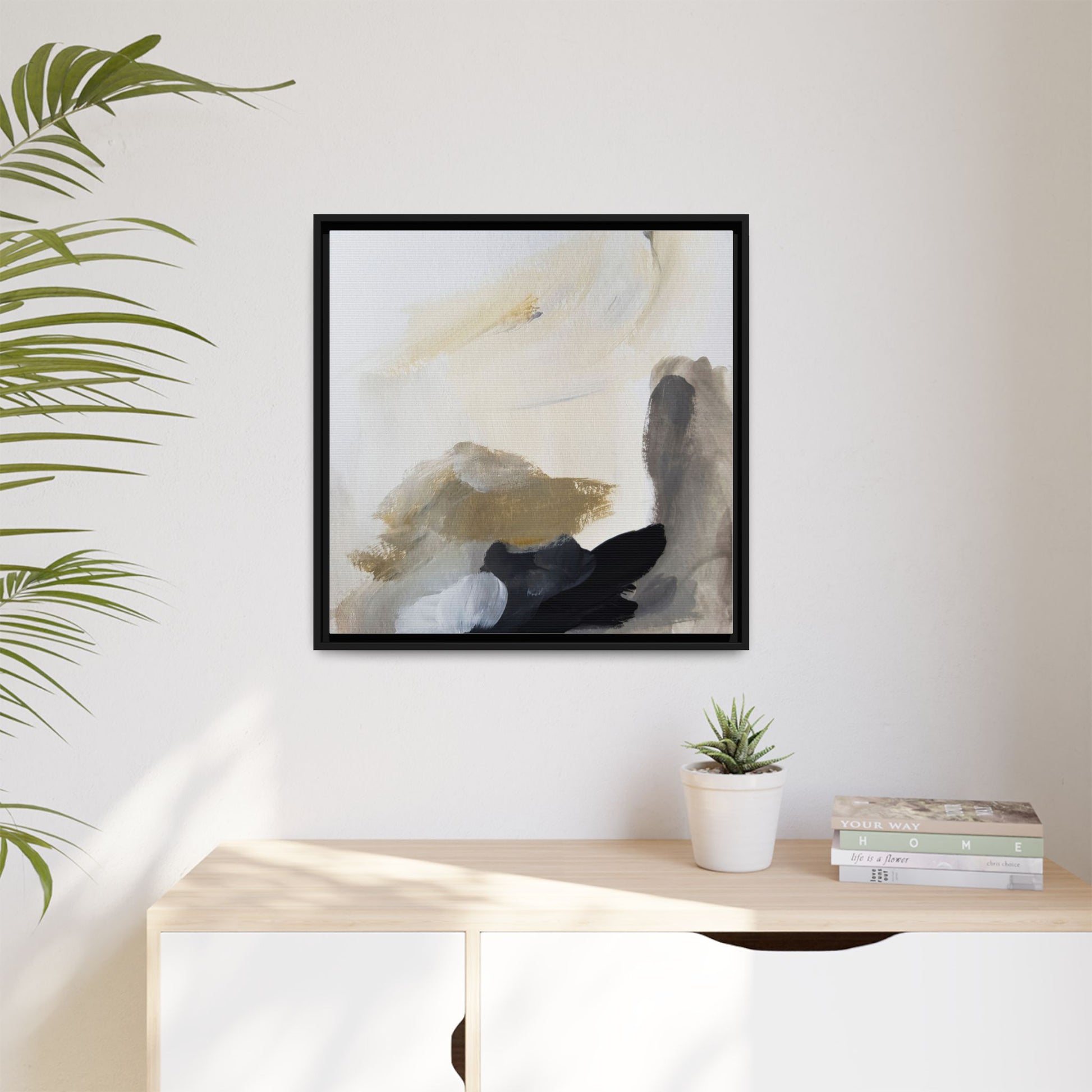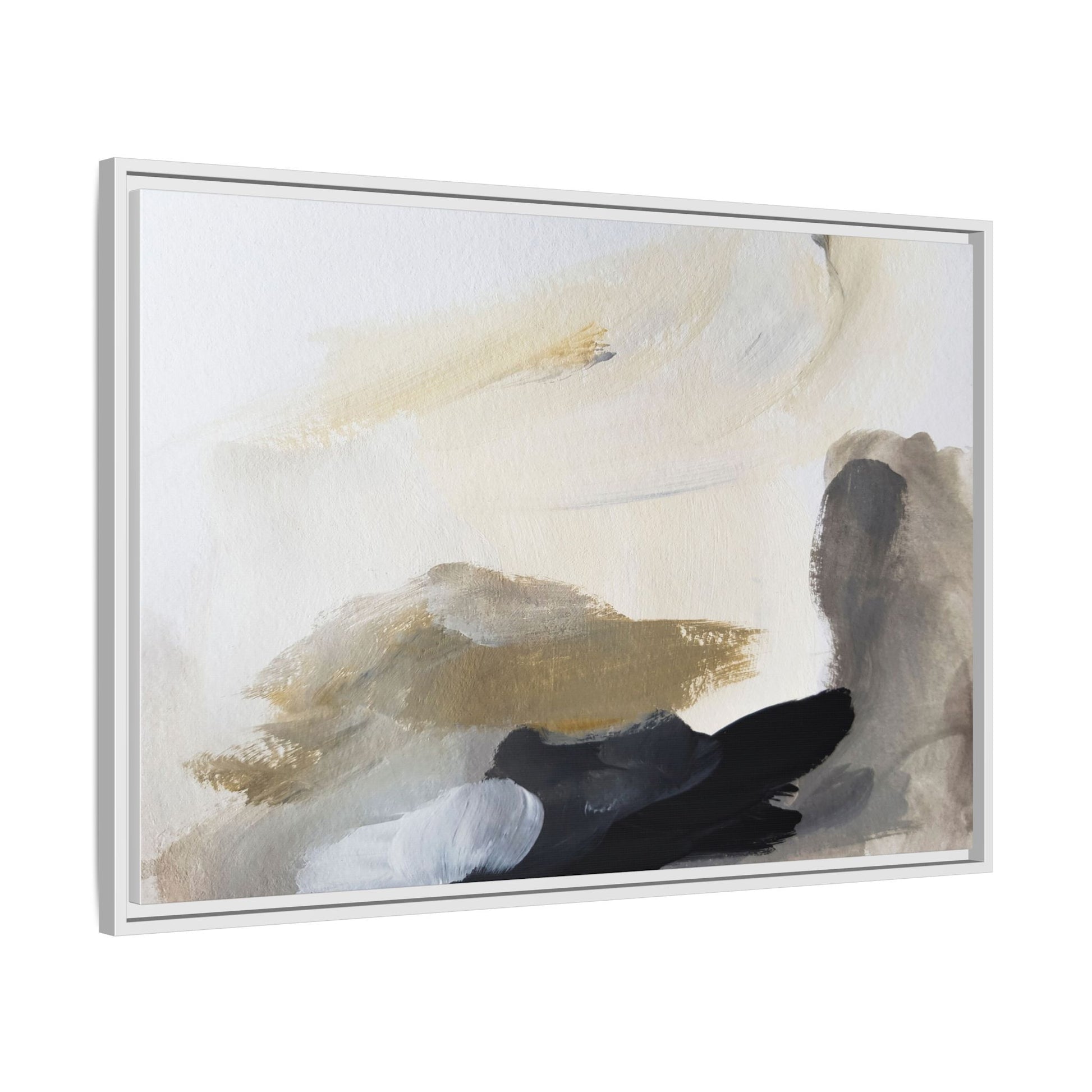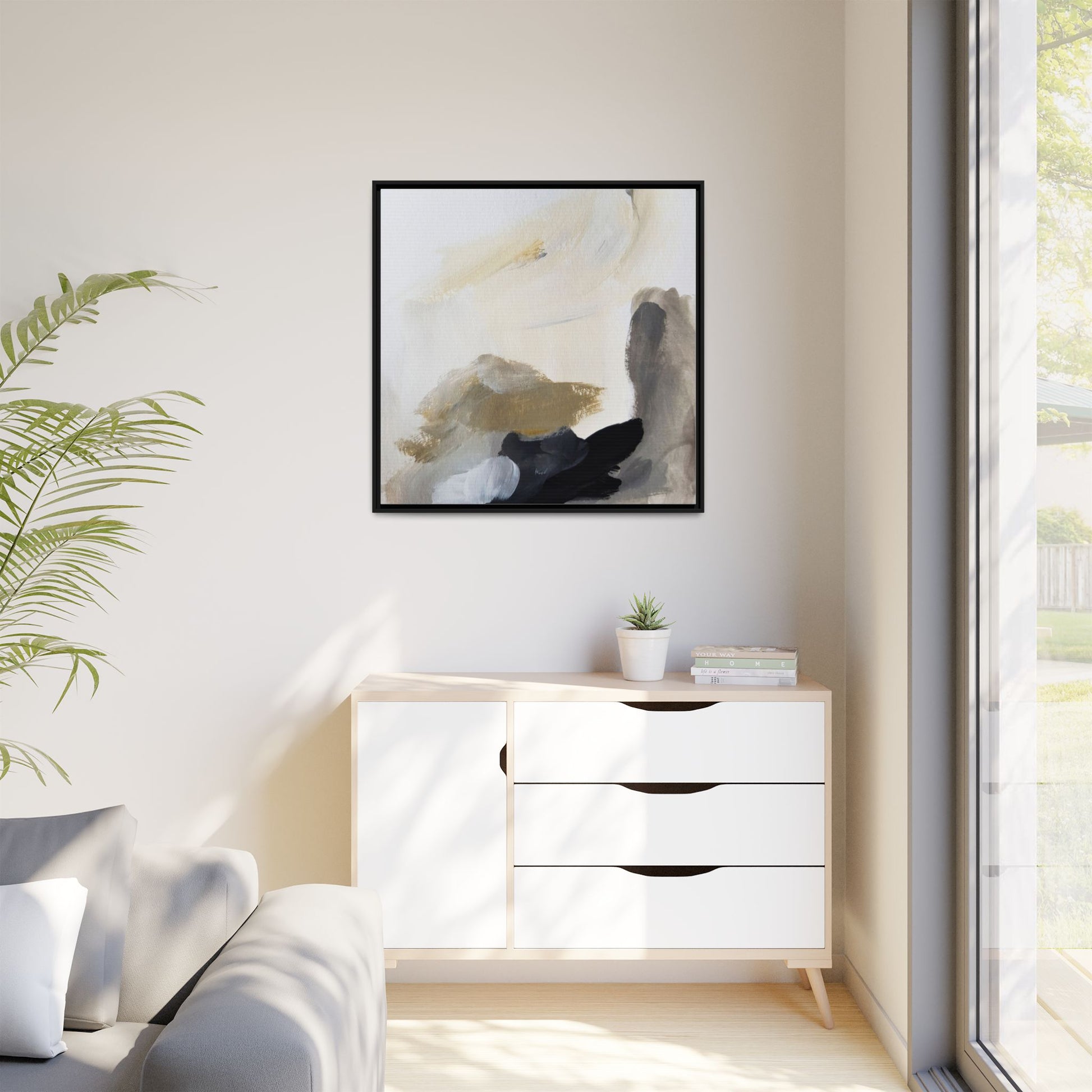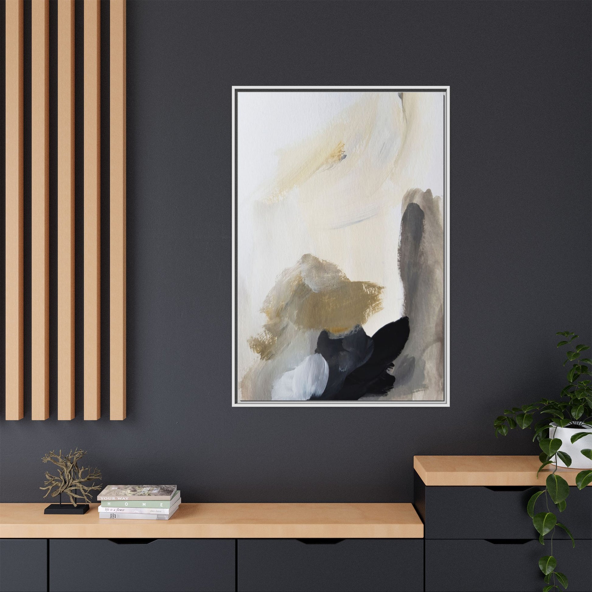 This abstract watercolor painting features a minimalist composition with soft, muted tones of white, beige, gray, and black. Delicate brushstrokes create organic, fluid shapes that seem to float and blend into one another across the canvas. The color palette is subdued and neutral, giving the artwork a sense of tranquility and subtle depth. Lighter areas with golden and cream-colored highlights contrast against darker charcoal and black elements, creating visual interest and movement. The painting's style suggests a contemplative, modern approach to abstract expressionism, with an emphasis on gentle transitions and ethereal forms.