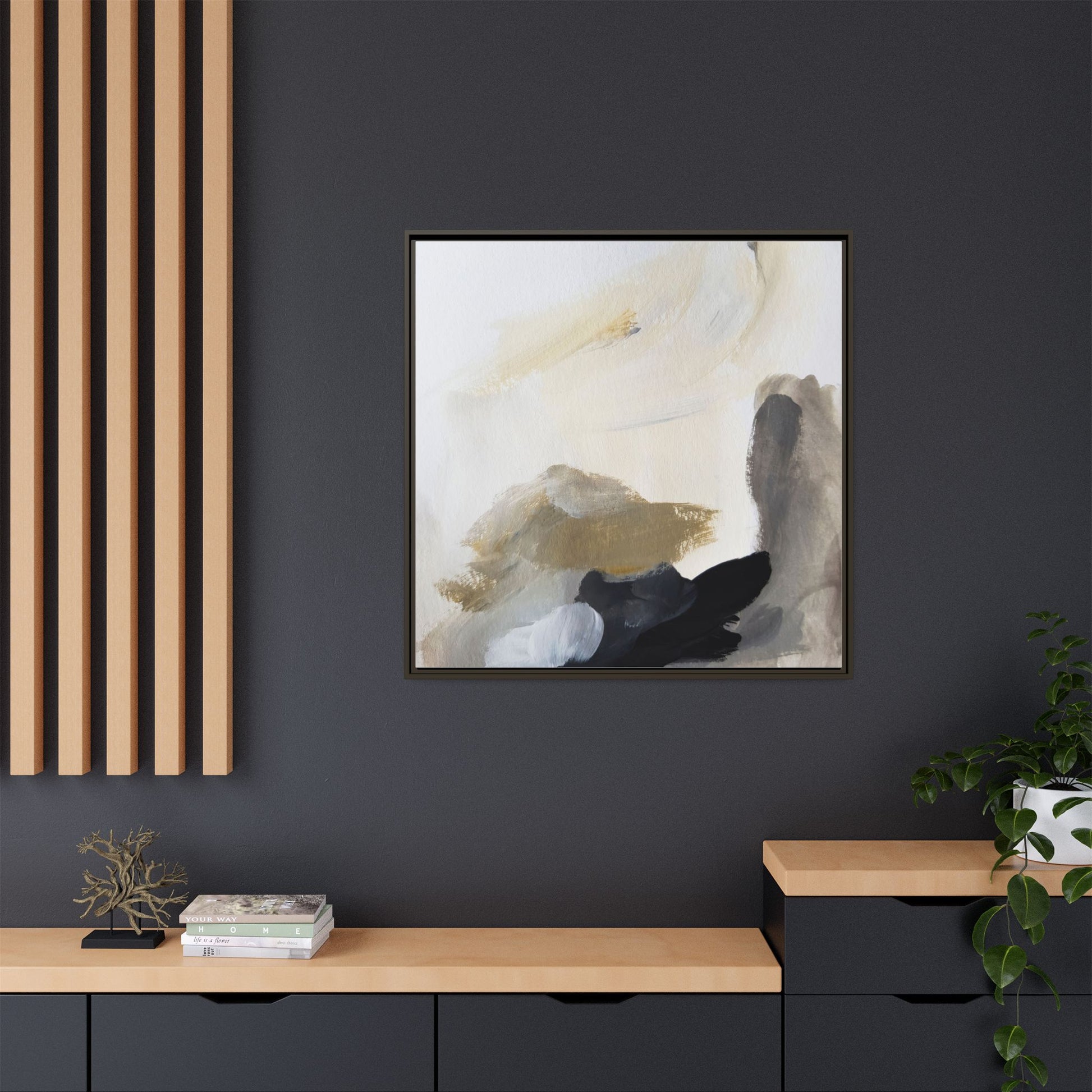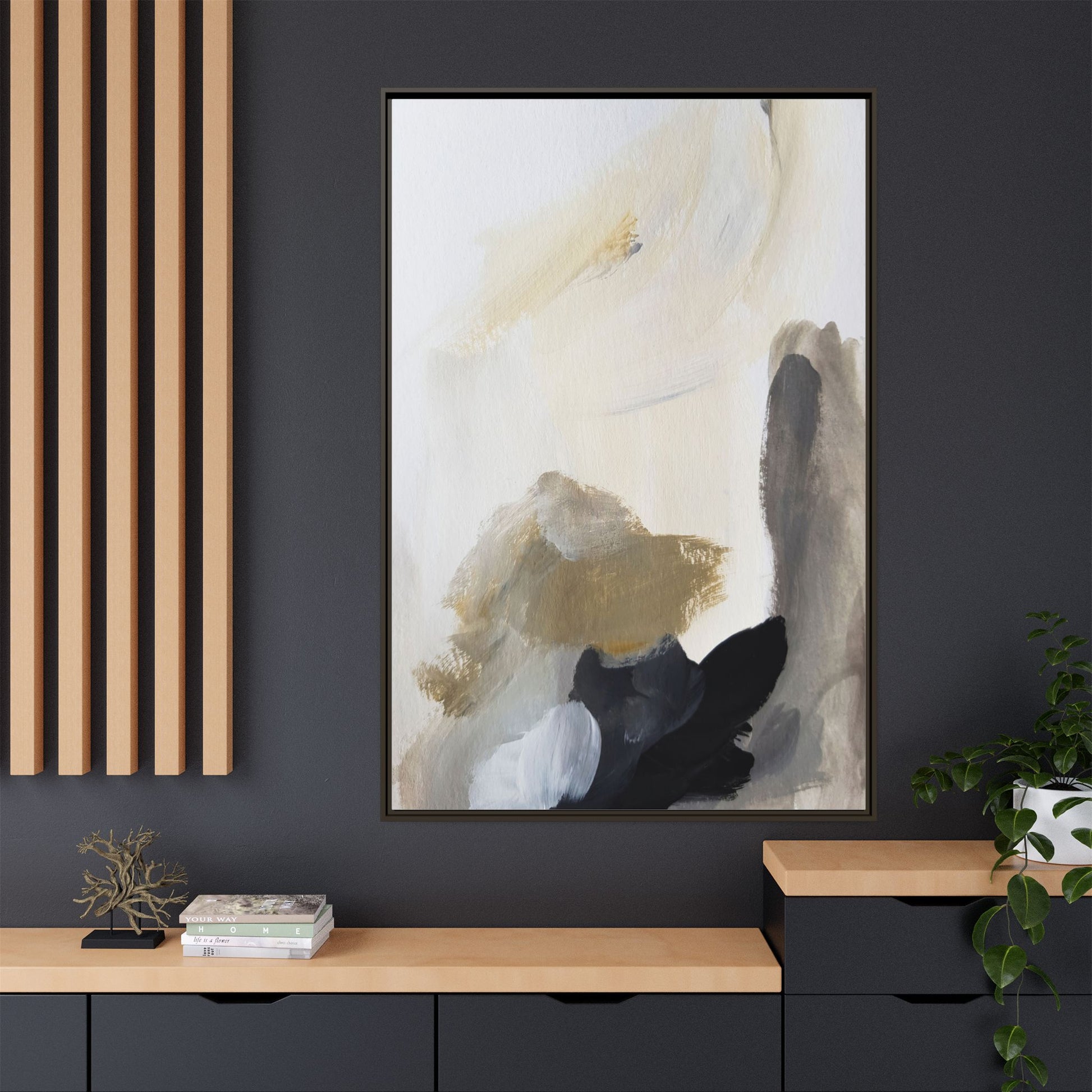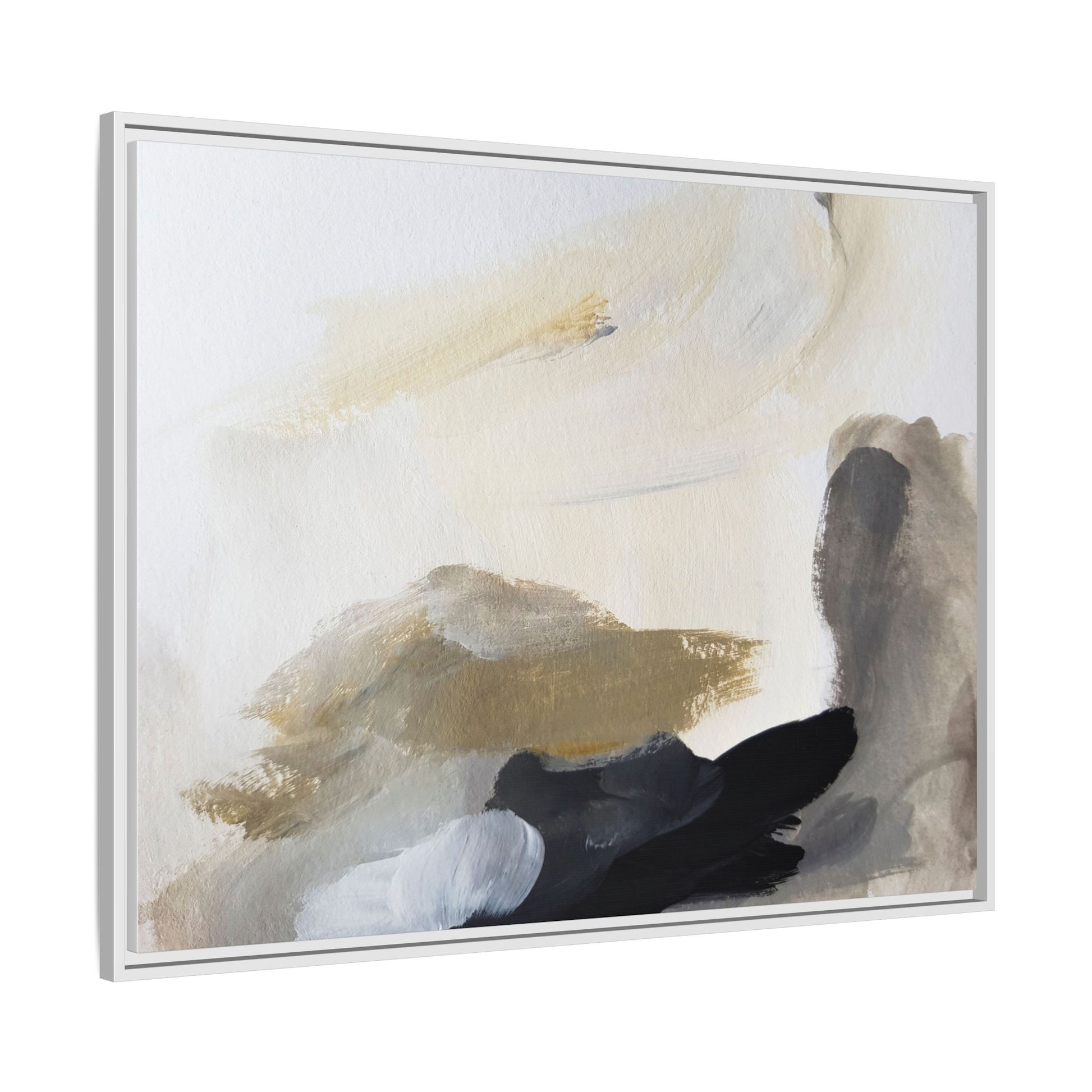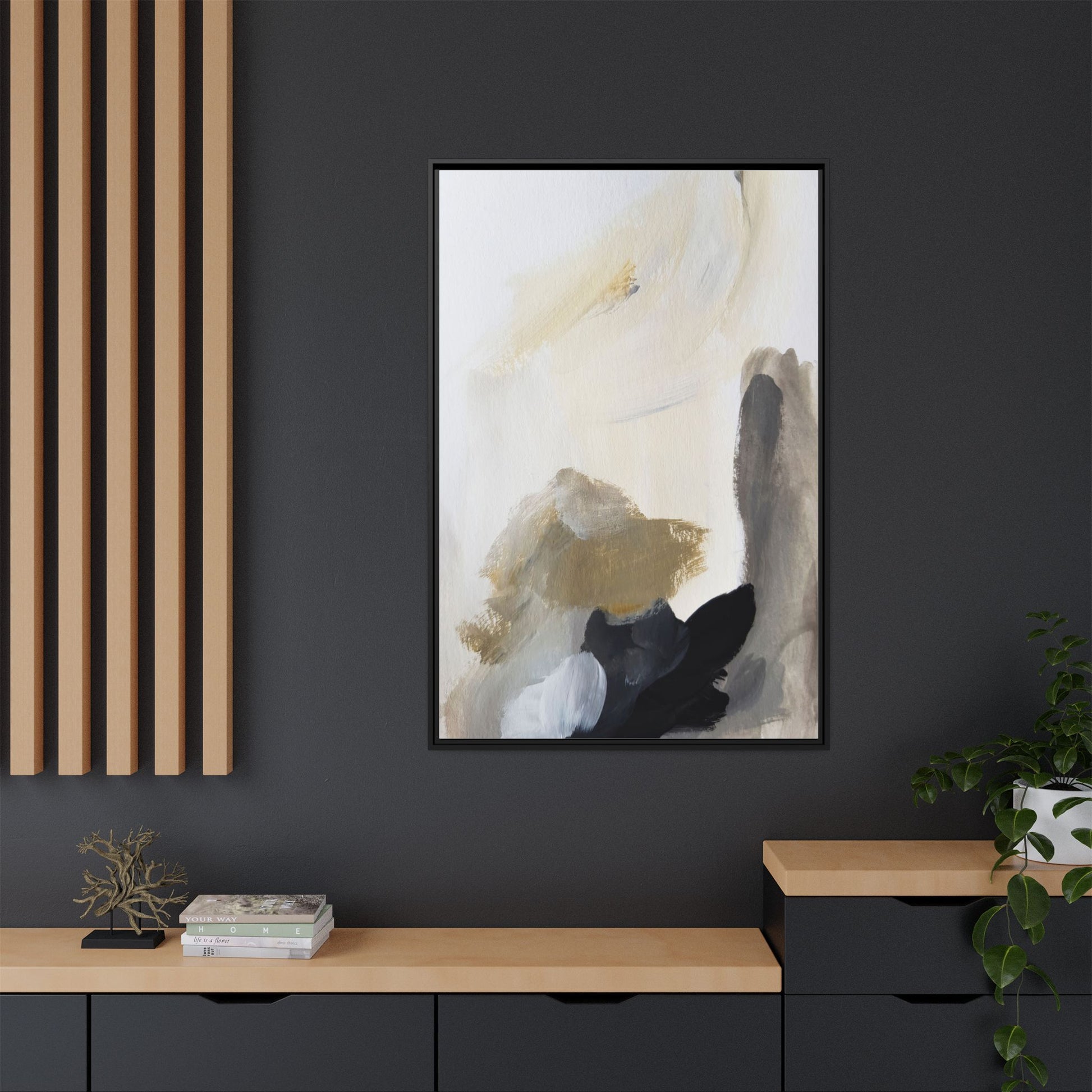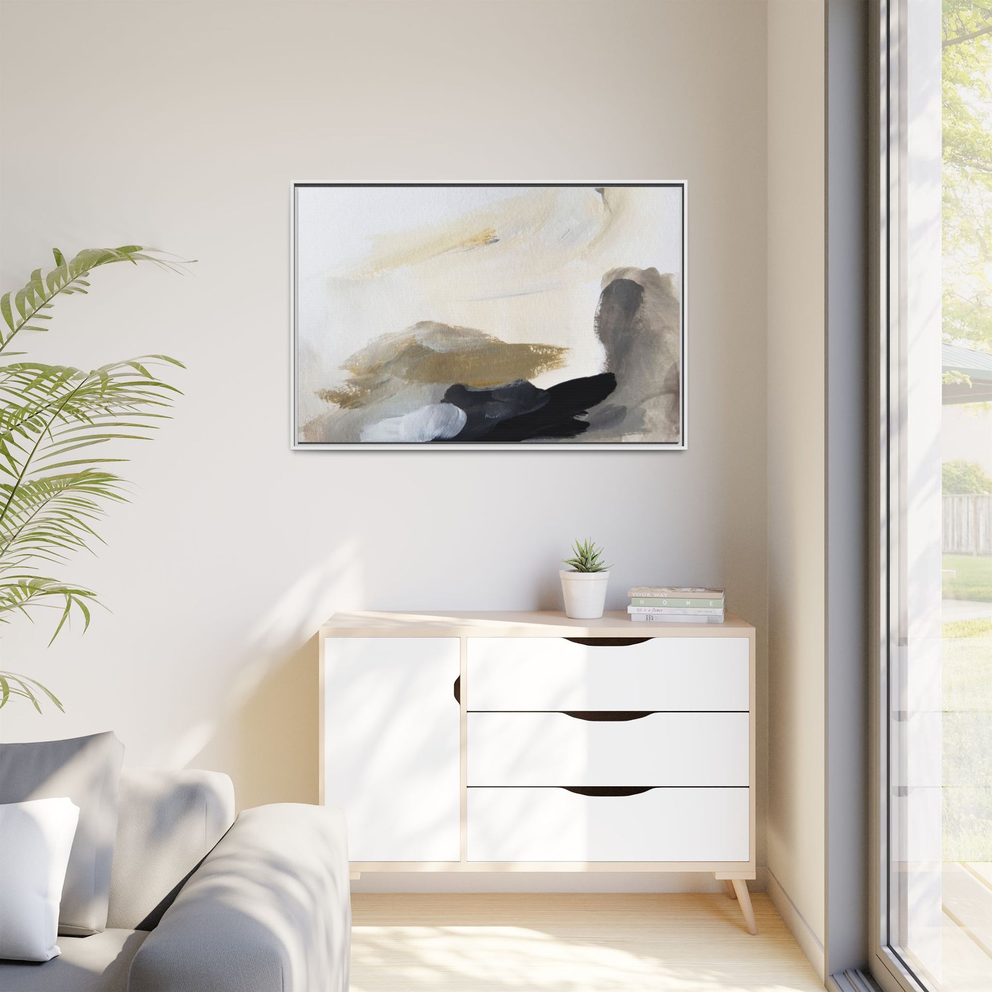 This abstract watercolor painting features a minimalist composition with soft, muted tones of white, beige, gray, and black. Delicate brushstrokes create organic, fluid shapes that seem to float and blend into one another across the canvas. The color palette is subdued and neutral, giving the artwork a sense of tranquility and subtle depth. Lighter areas with golden and cream-colored highlights contrast against darker charcoal and black elements, creating visual interest and movement. The painting's style suggests a contemplative, modern approach to abstract expressionism, with an emphasis on gentle transitions and ethereal forms.