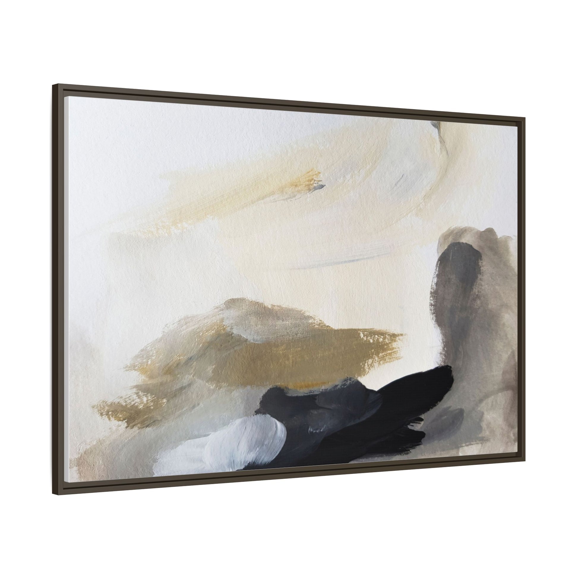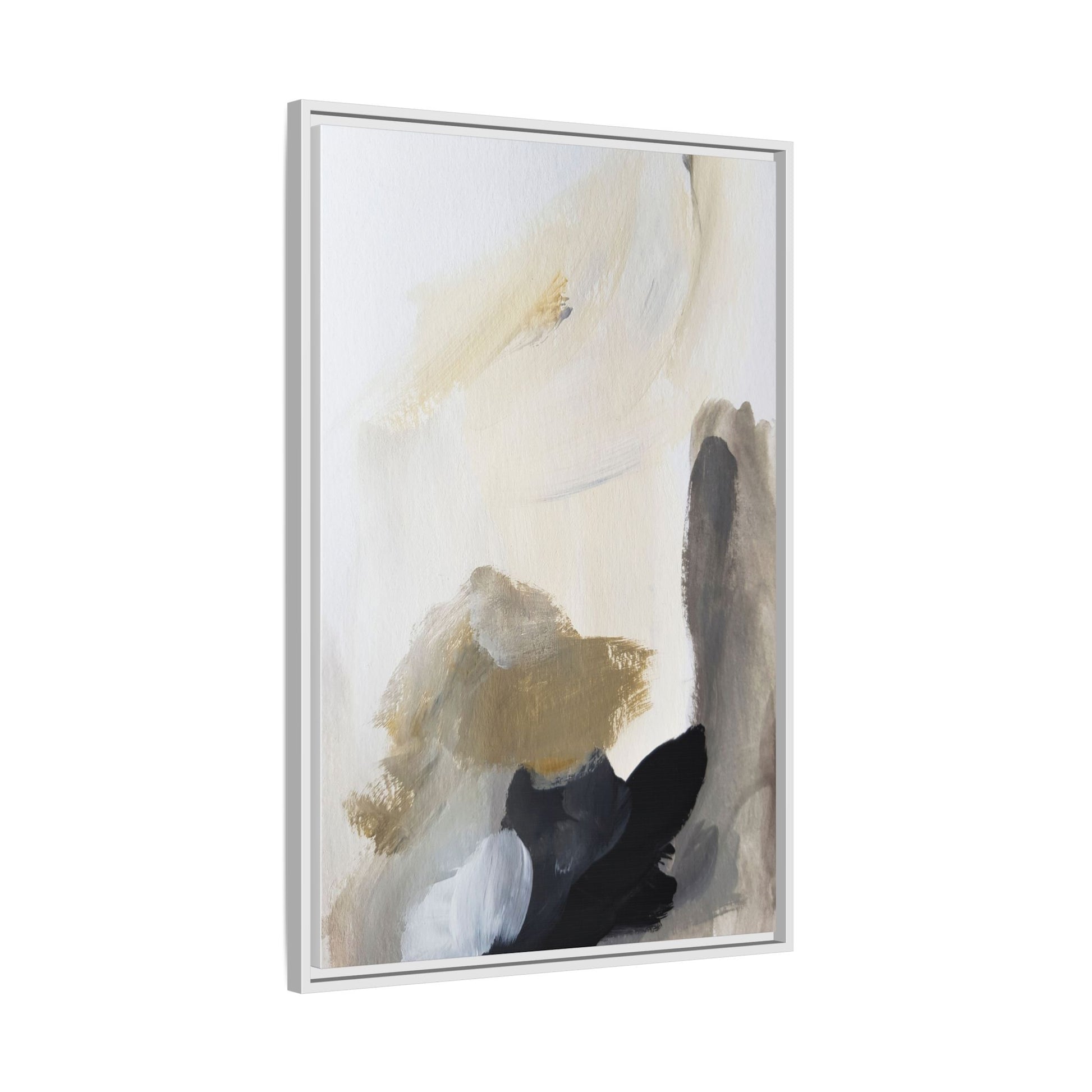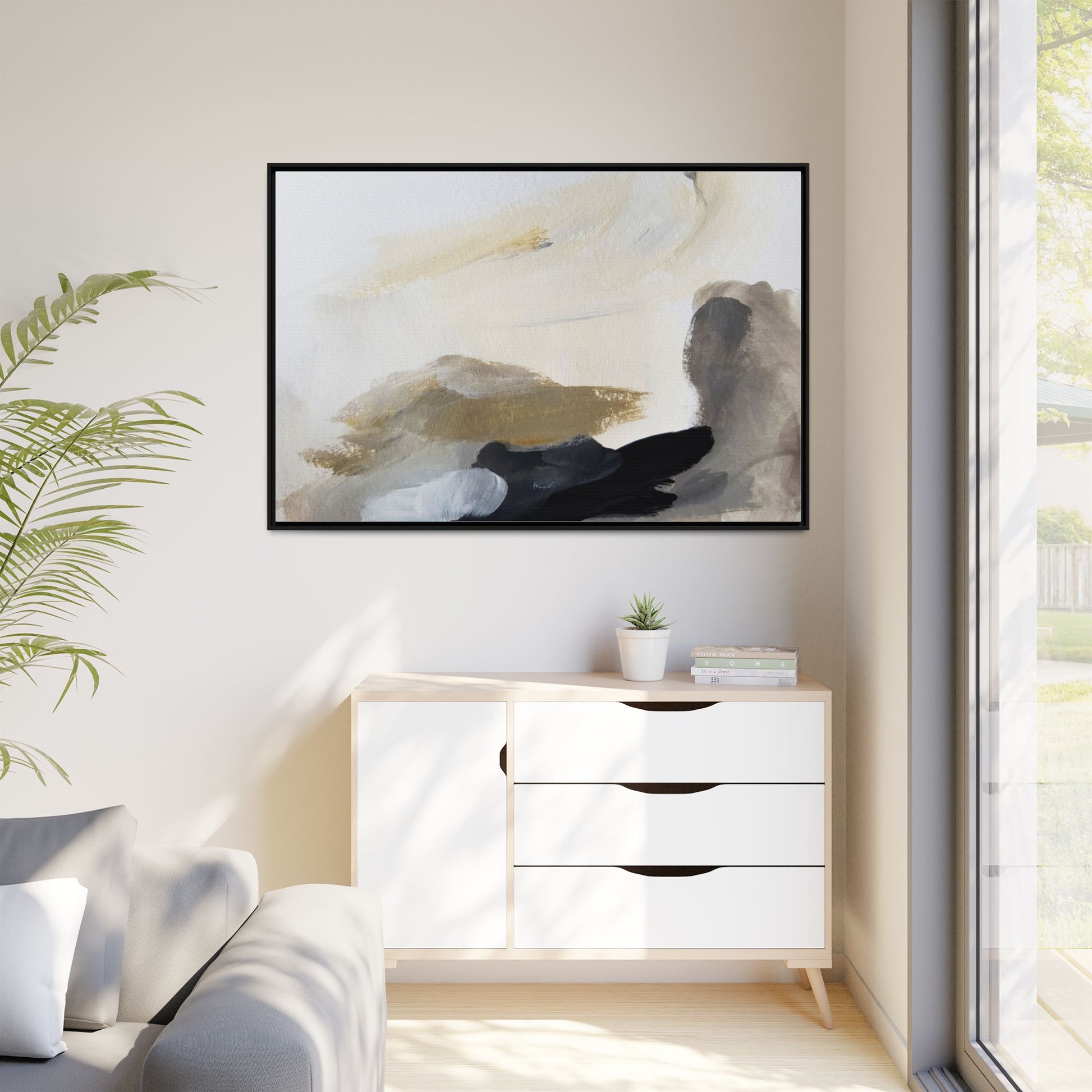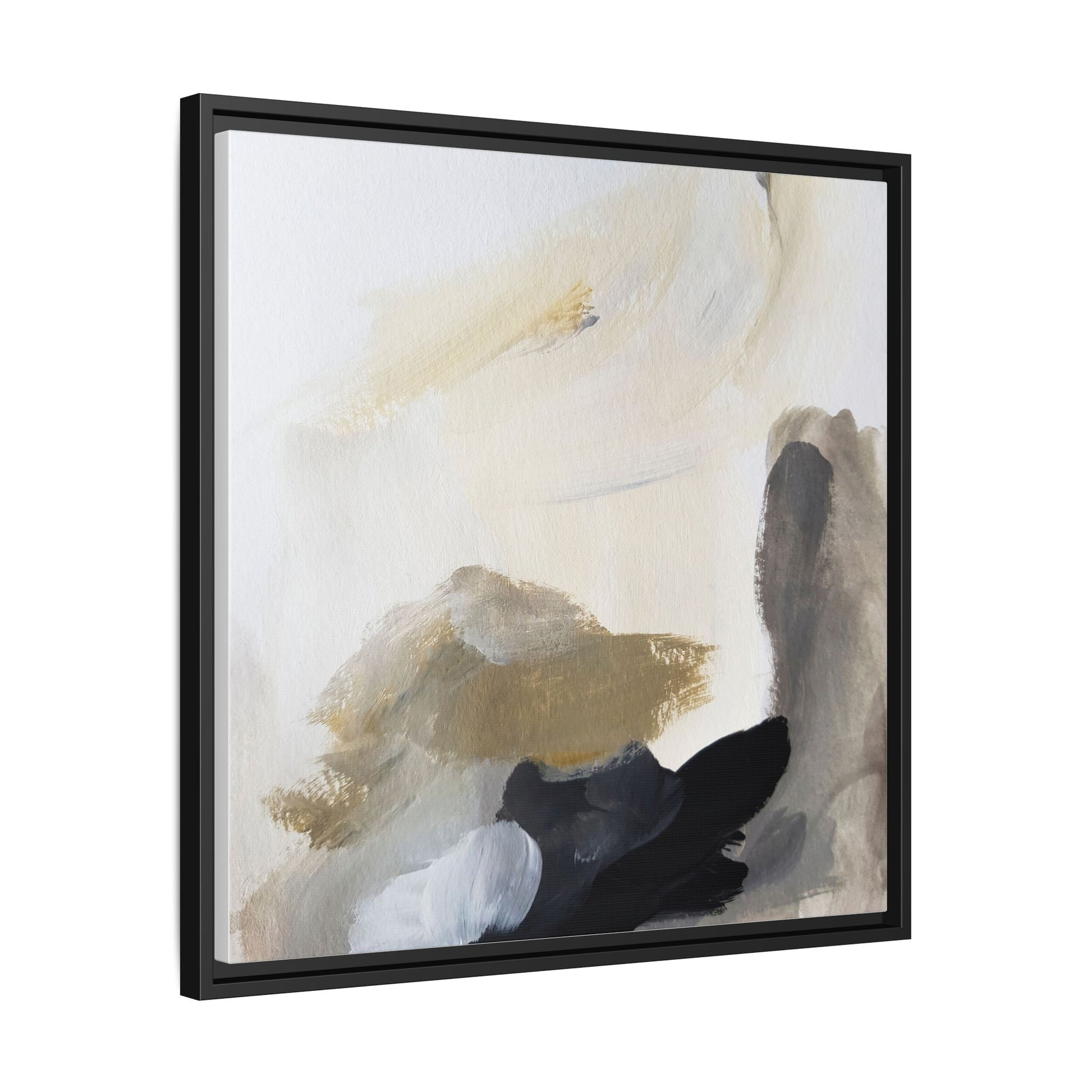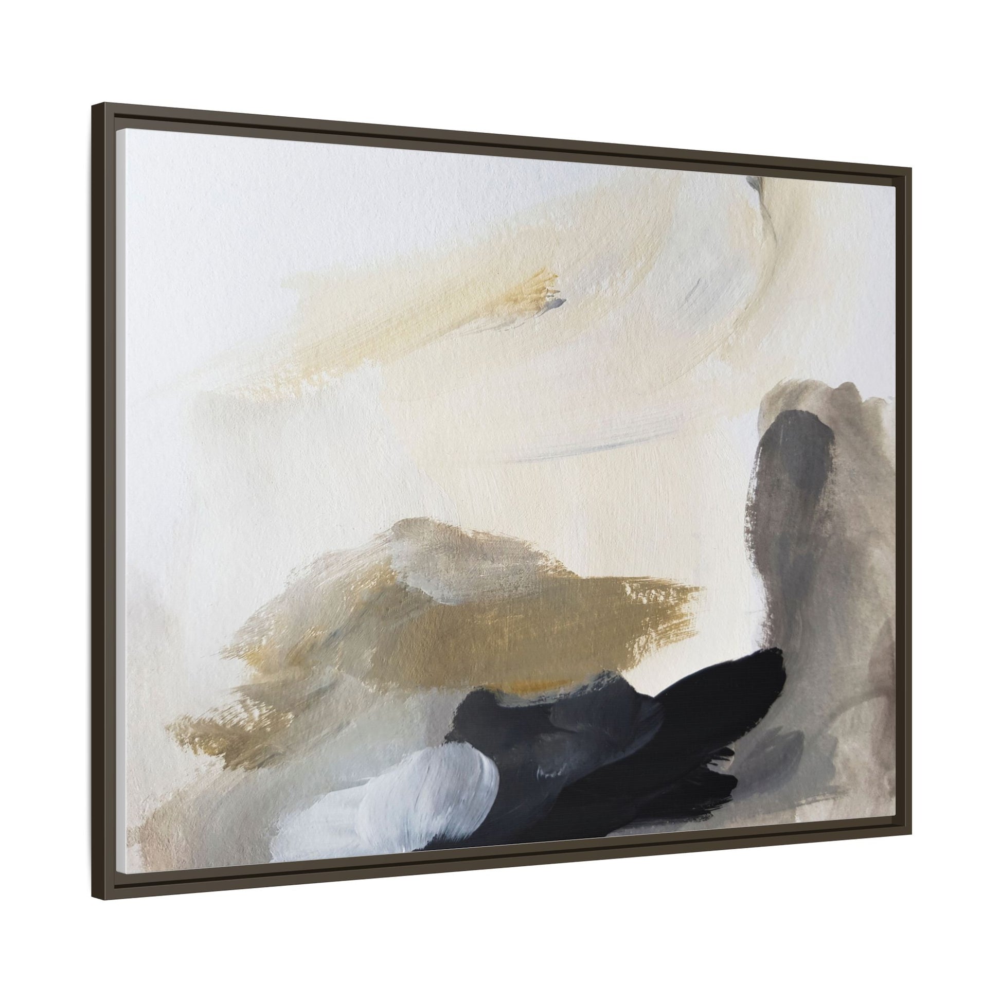 This abstract watercolor painting features a minimalist composition with soft, muted tones of white, beige, gray, and black. Delicate brushstrokes create organic, fluid shapes that seem to float and blend into one another across the canvas. The color palette is subdued and neutral, giving the artwork a sense of tranquility and subtle depth. Lighter areas with golden and cream-colored highlights contrast against darker charcoal and black elements, creating visual interest and movement. The painting's style suggests a contemplative, modern approach to abstract expressionism, with an emphasis on gentle transitions and ethereal forms.