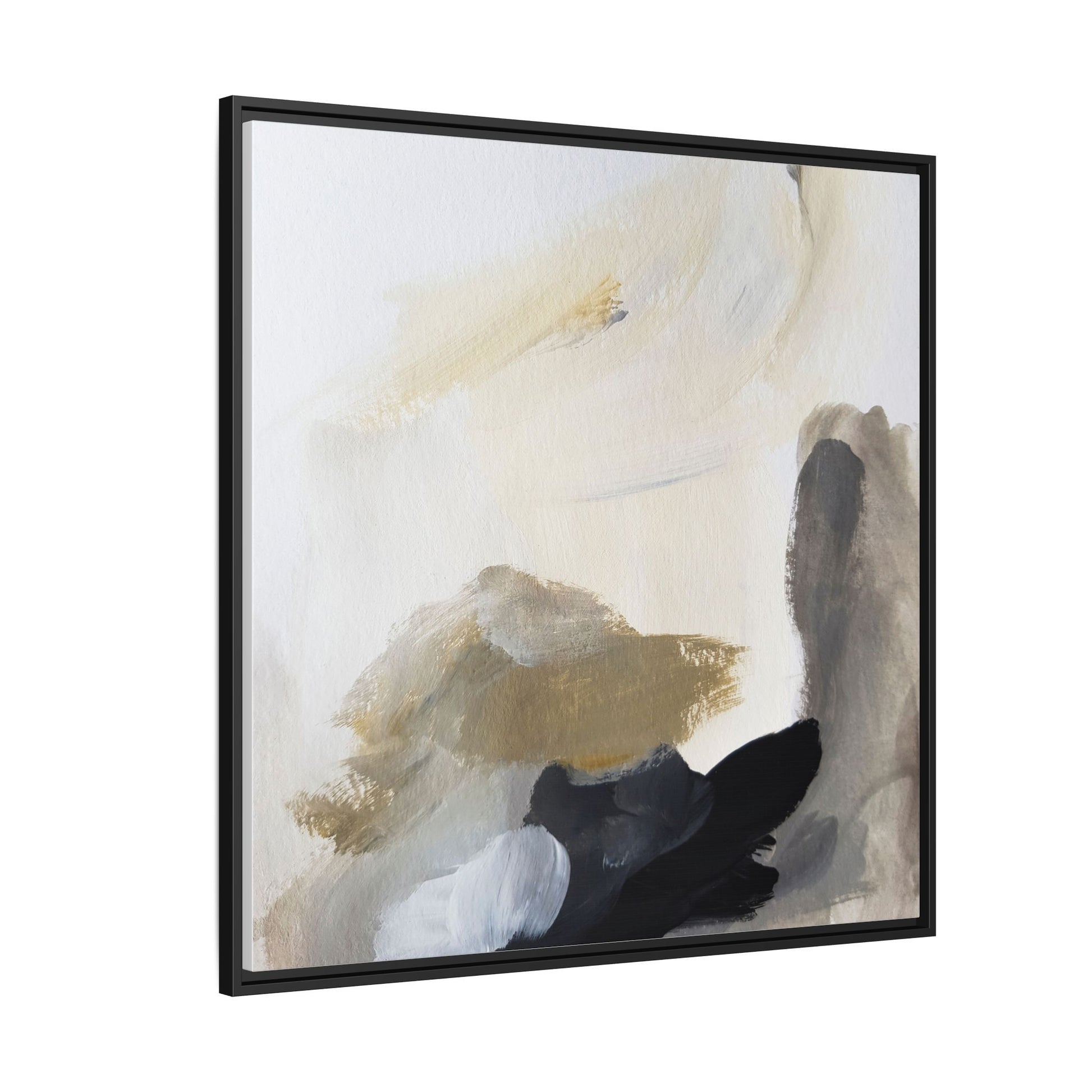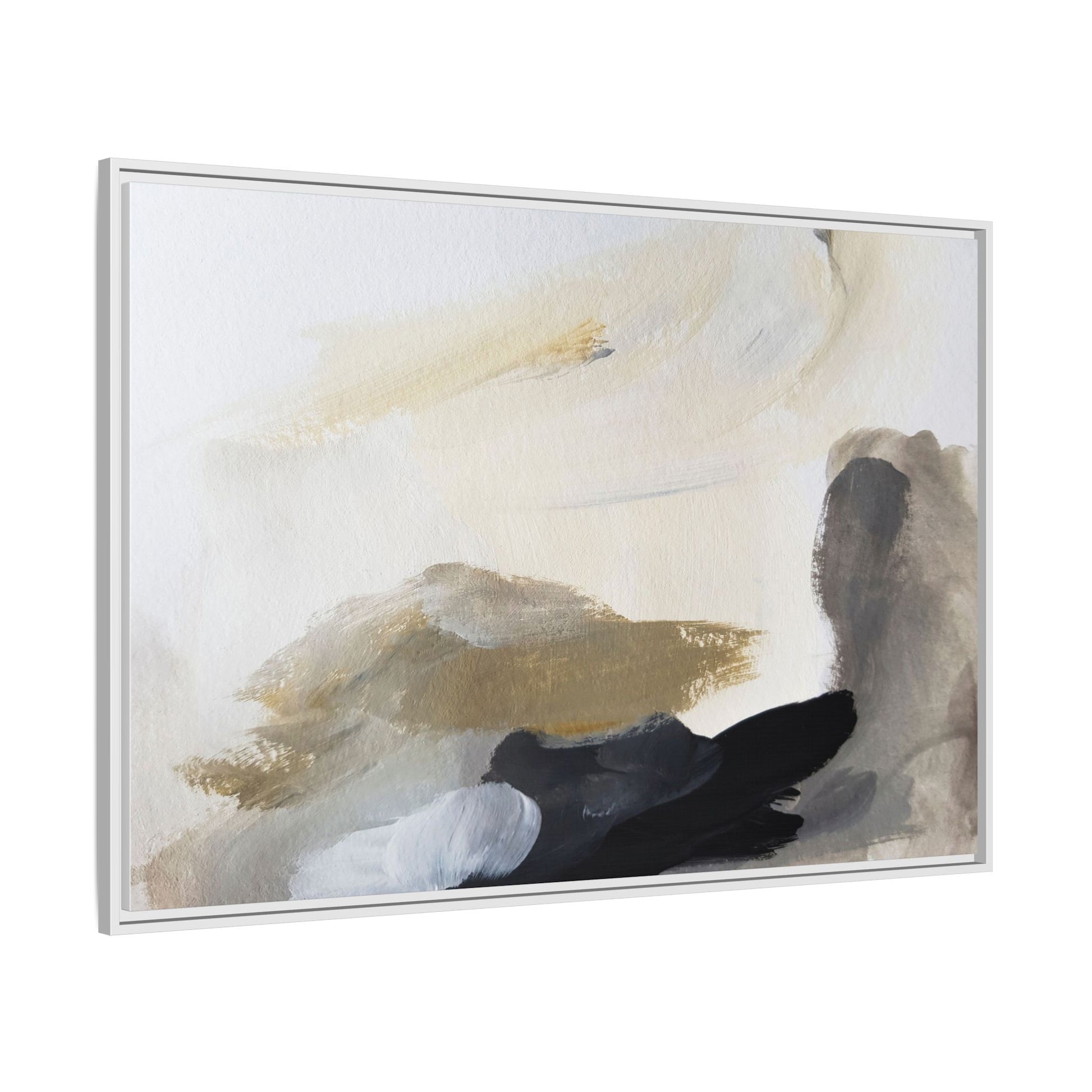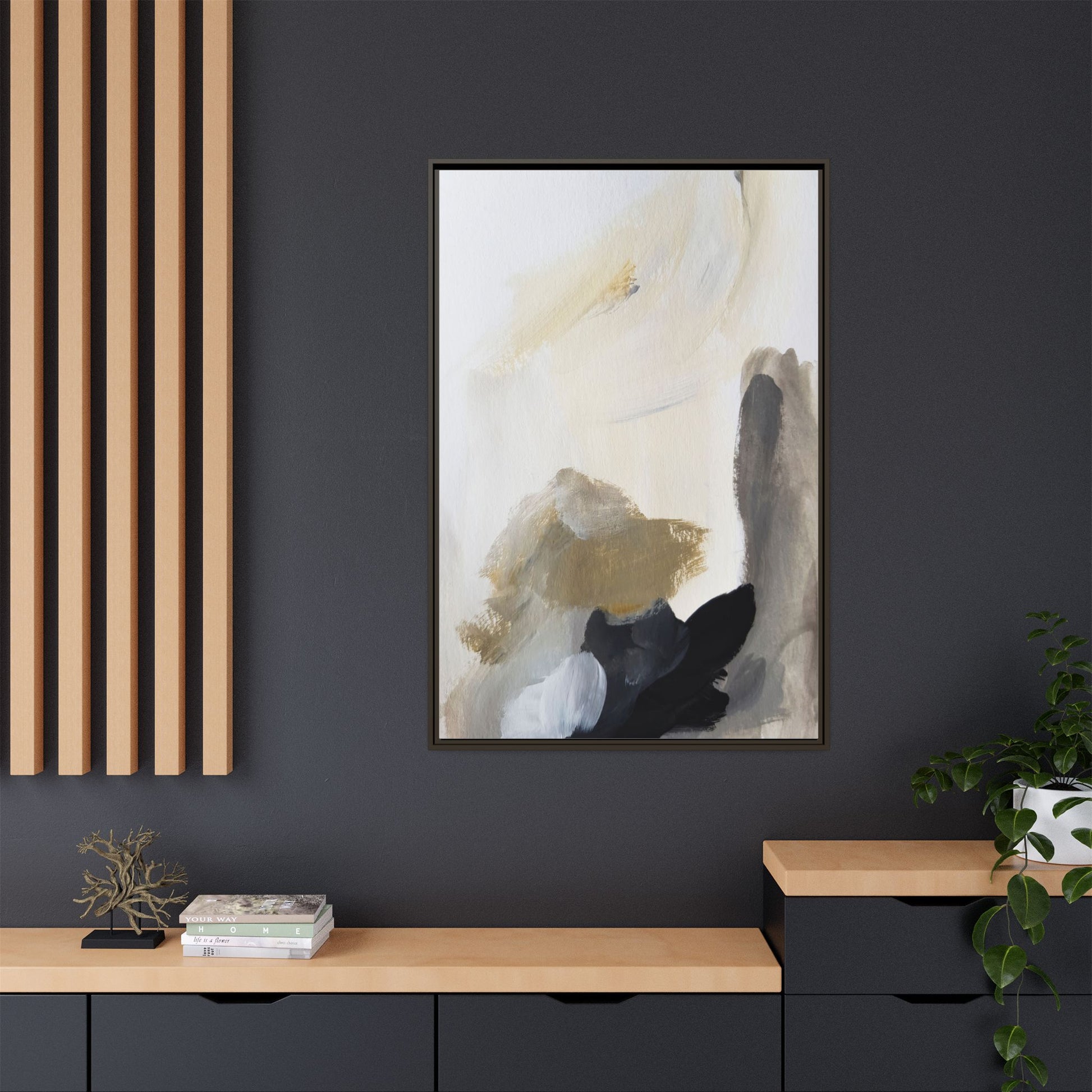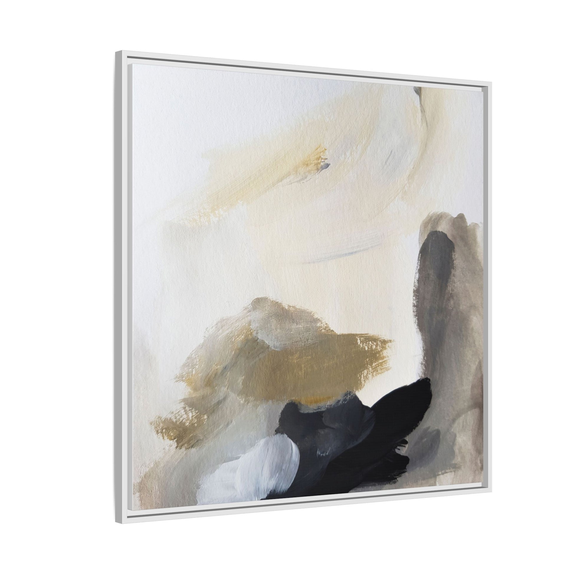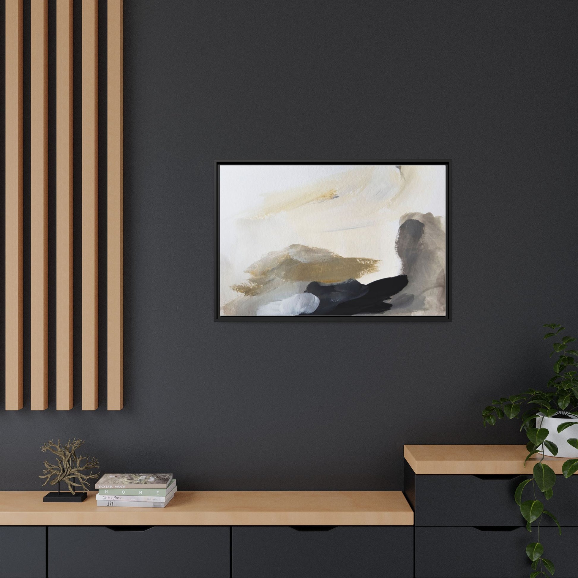 This abstract watercolor painting features a minimalist composition with soft, muted tones of white, beige, gray, and black. Delicate brushstrokes create organic, fluid shapes that seem to float and blend into one another across the canvas. The color palette is subdued and neutral, giving the artwork a sense of tranquility and subtle depth. Lighter areas with golden and cream-colored highlights contrast against darker charcoal and black elements, creating visual interest and movement. The painting's style suggests a contemplative, modern approach to abstract expressionism, with an emphasis on gentle transitions and ethereal forms.