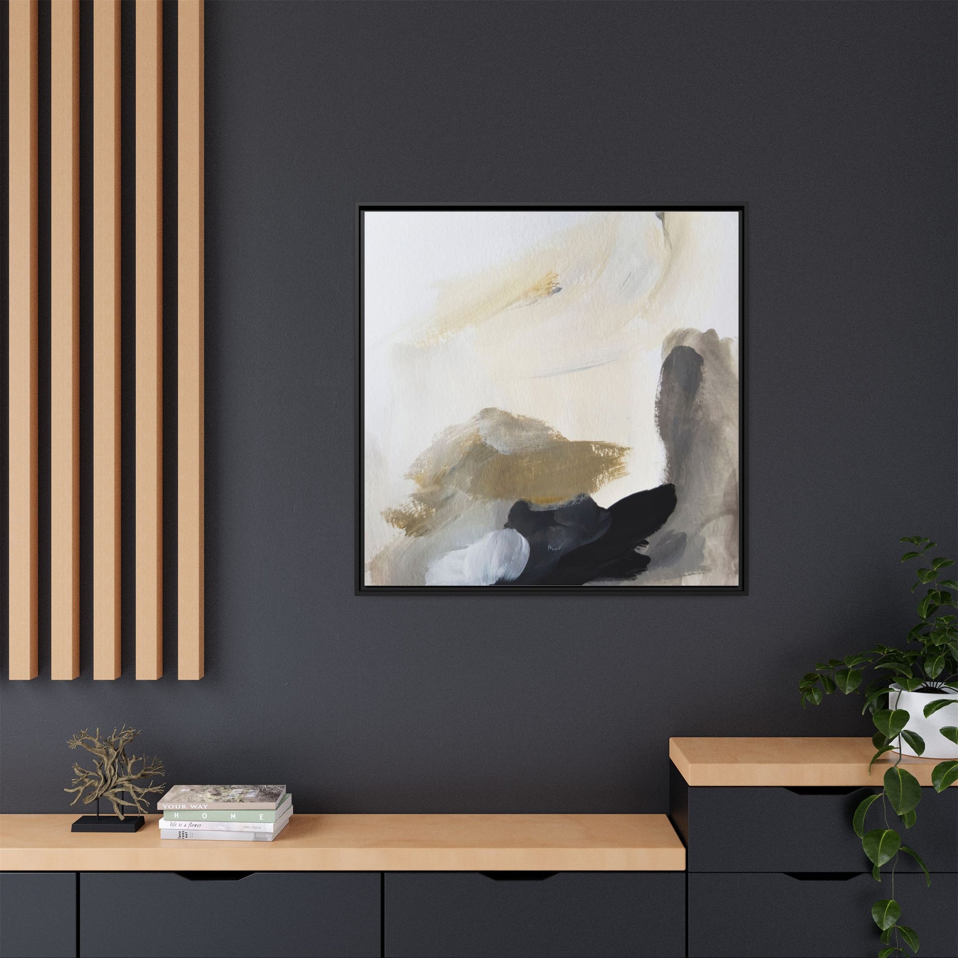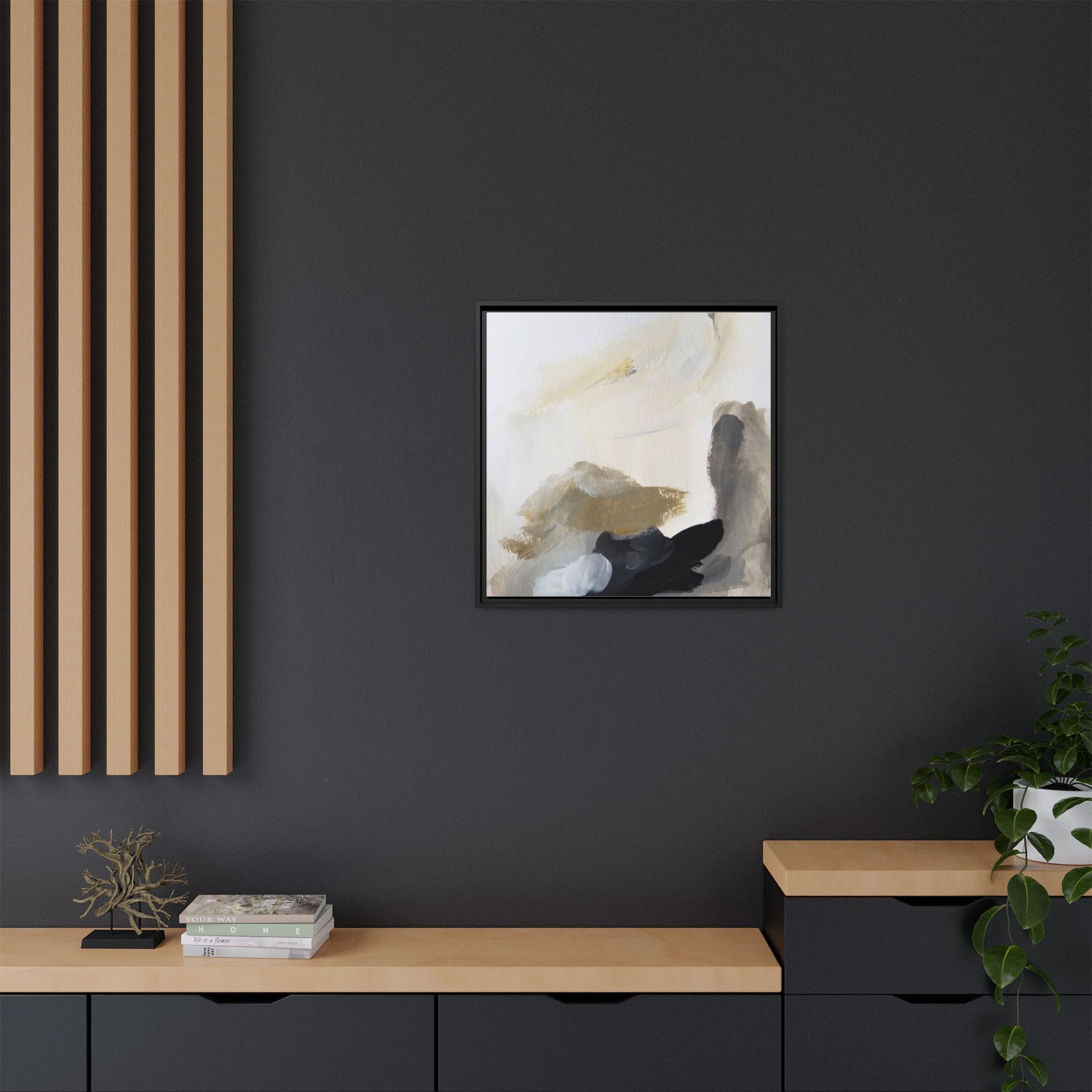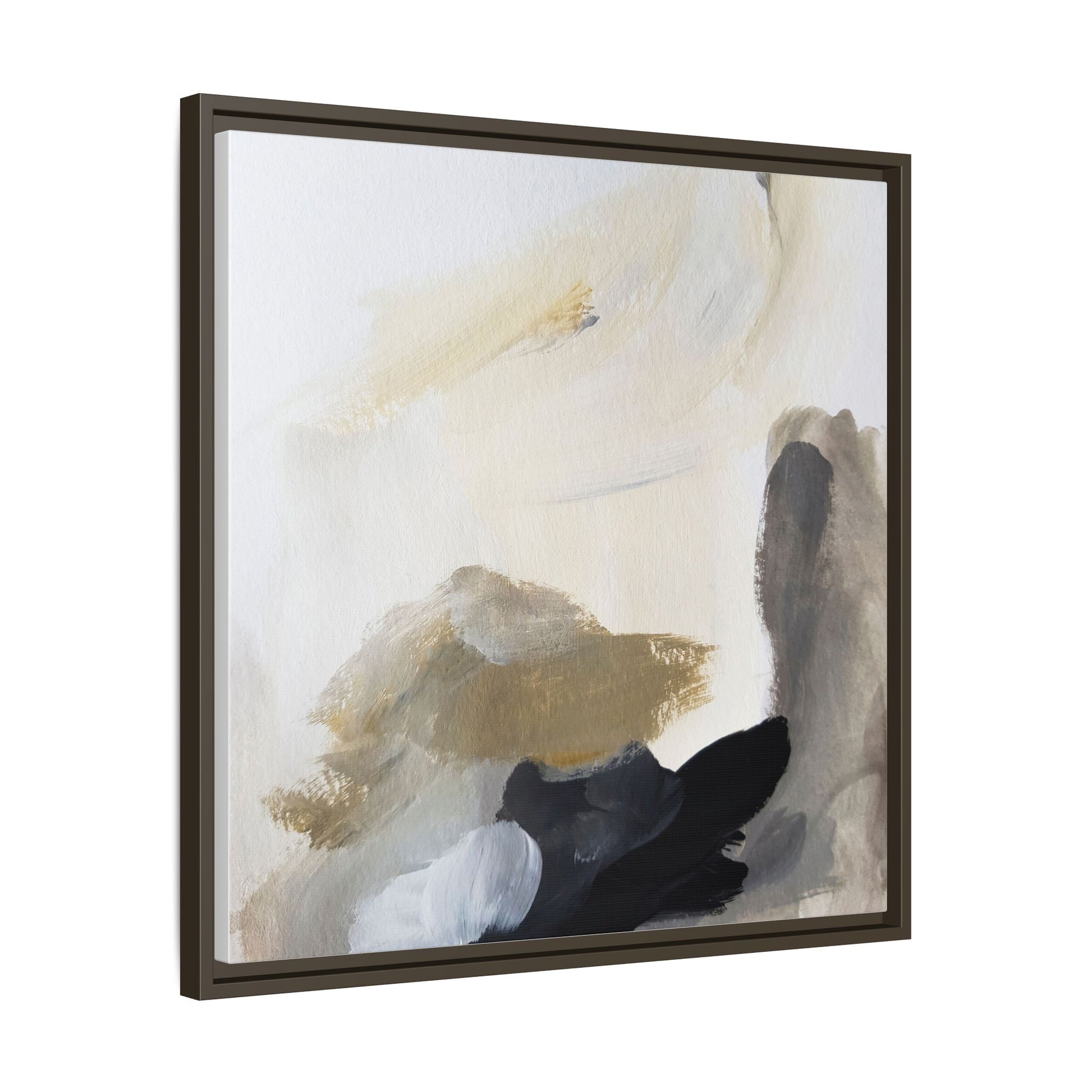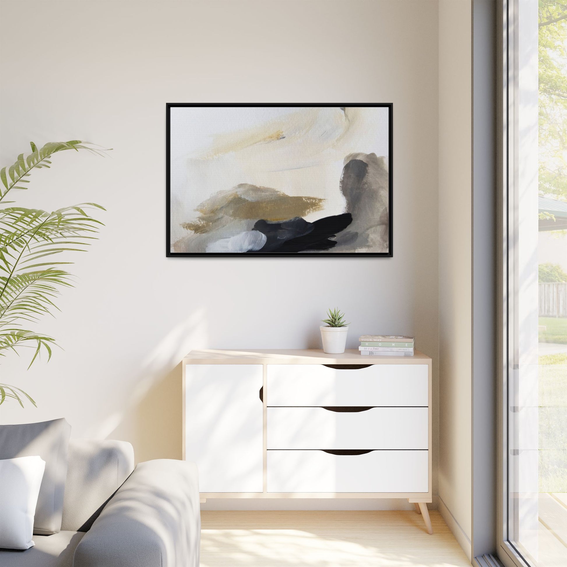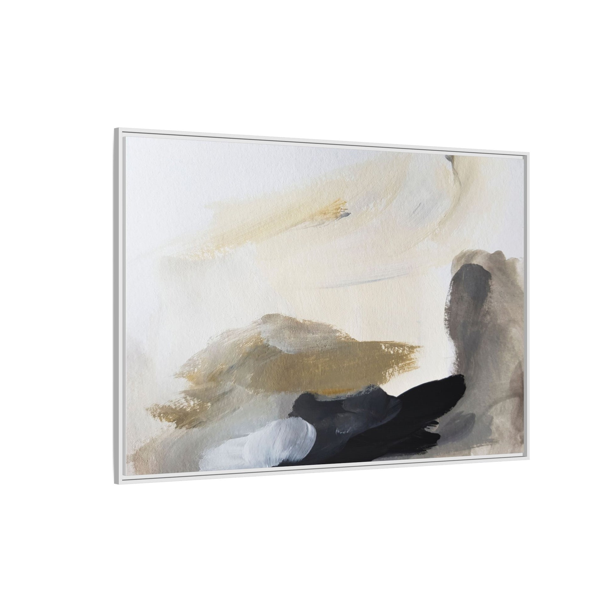 This abstract watercolor painting features a minimalist composition with soft, muted tones of white, beige, gray, and black. Delicate brushstrokes create organic, fluid shapes that seem to float and blend into one another across the canvas. The color palette is subdued and neutral, giving the artwork a sense of tranquility and subtle depth. Lighter areas with golden and cream-colored highlights contrast against darker charcoal and black elements, creating visual interest and movement. The painting's style suggests a contemplative, modern approach to abstract expressionism, with an emphasis on gentle transitions and ethereal forms.