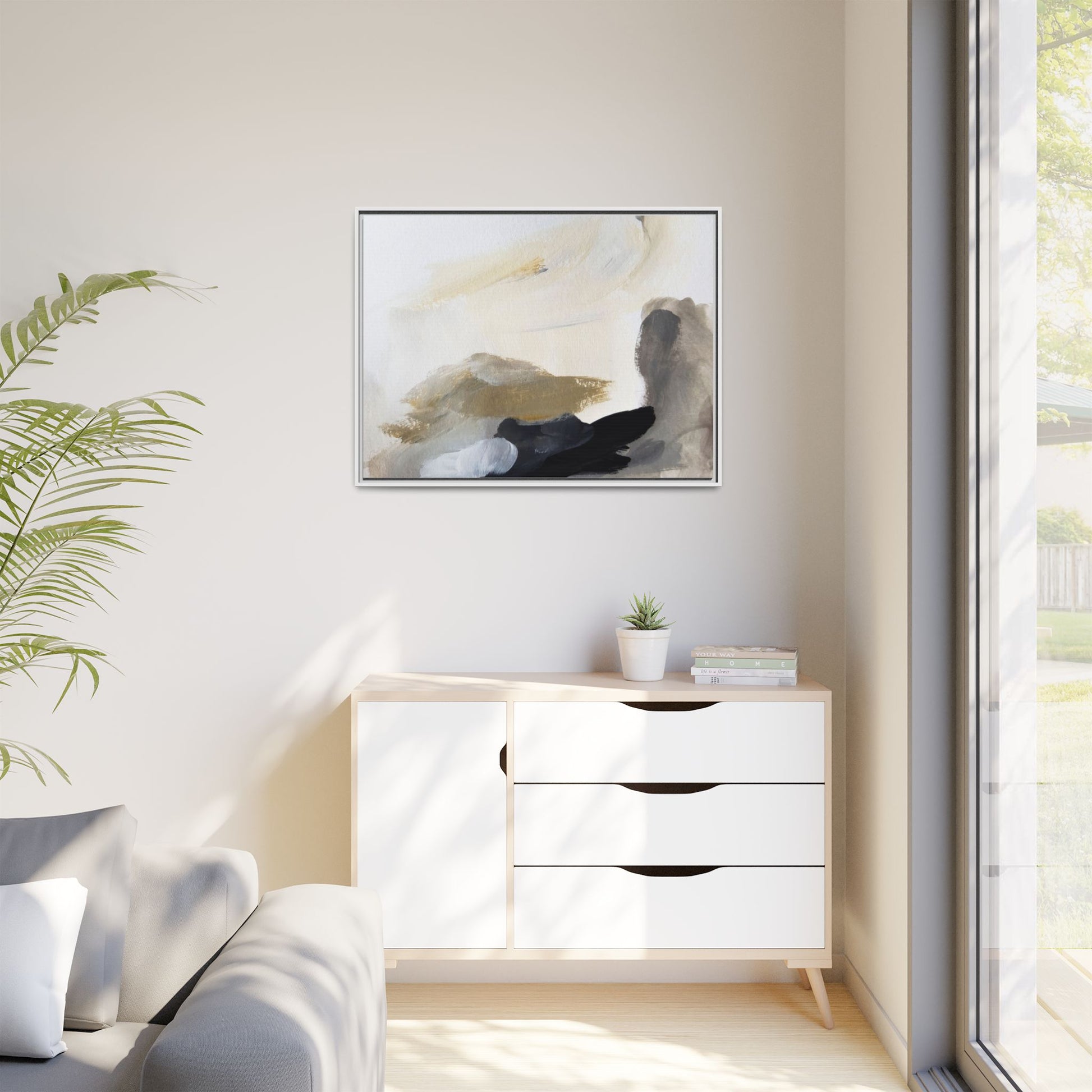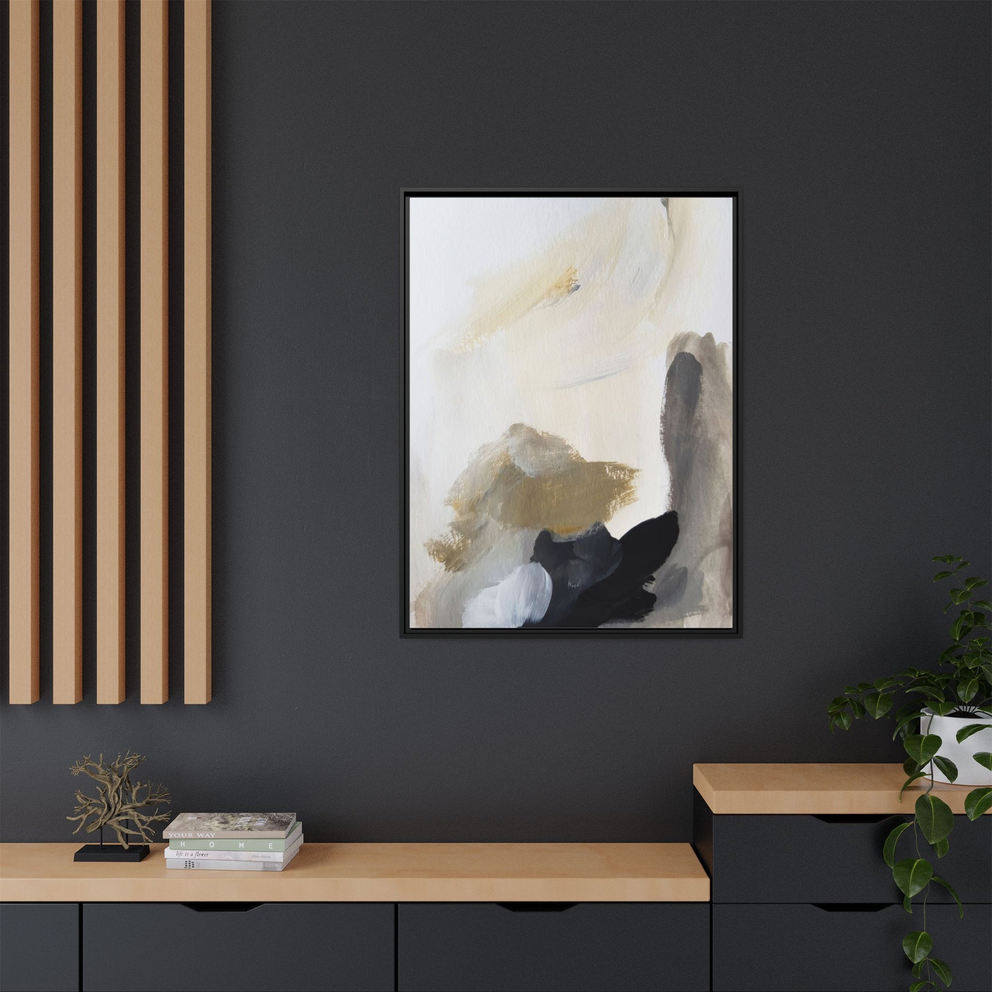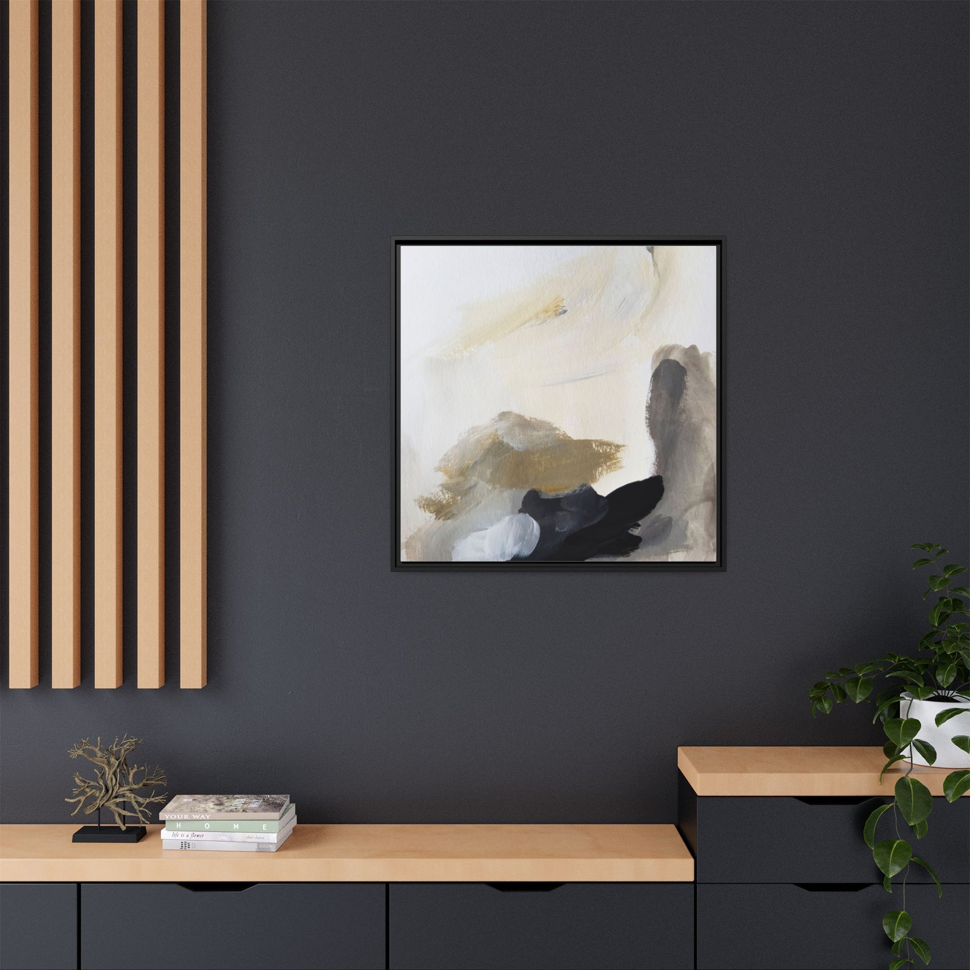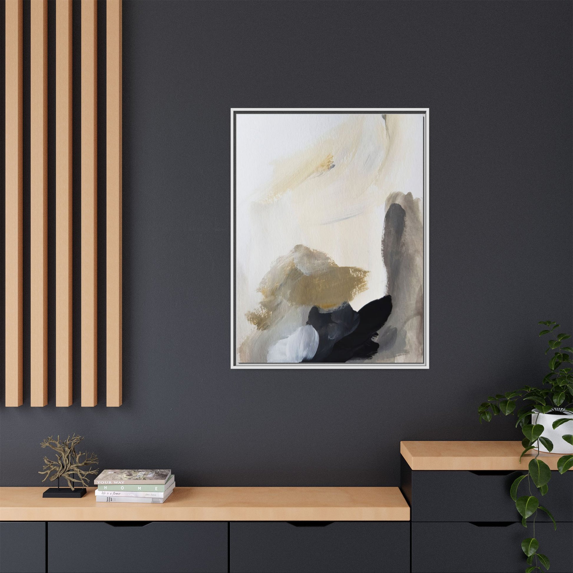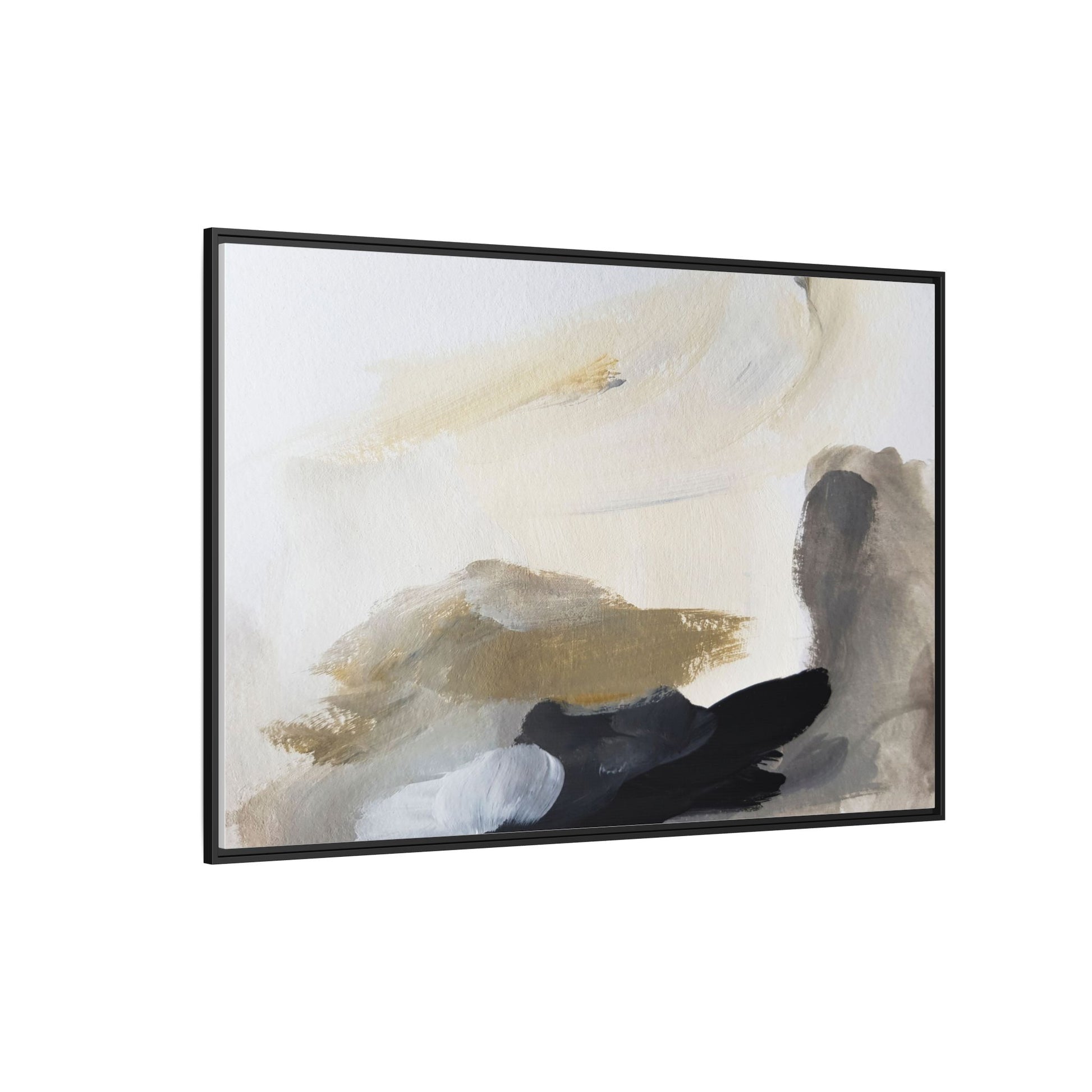 This abstract watercolor painting features a minimalist composition with soft, muted tones of white, beige, gray, and black. Delicate brushstrokes create organic, fluid shapes that seem to float and blend into one another across the canvas. The color palette is subdued and neutral, giving the artwork a sense of tranquility and subtle depth. Lighter areas with golden and cream-colored highlights contrast against darker charcoal and black elements, creating visual interest and movement. The painting's style suggests a contemplative, modern approach to abstract expressionism, with an emphasis on gentle transitions and ethereal forms.