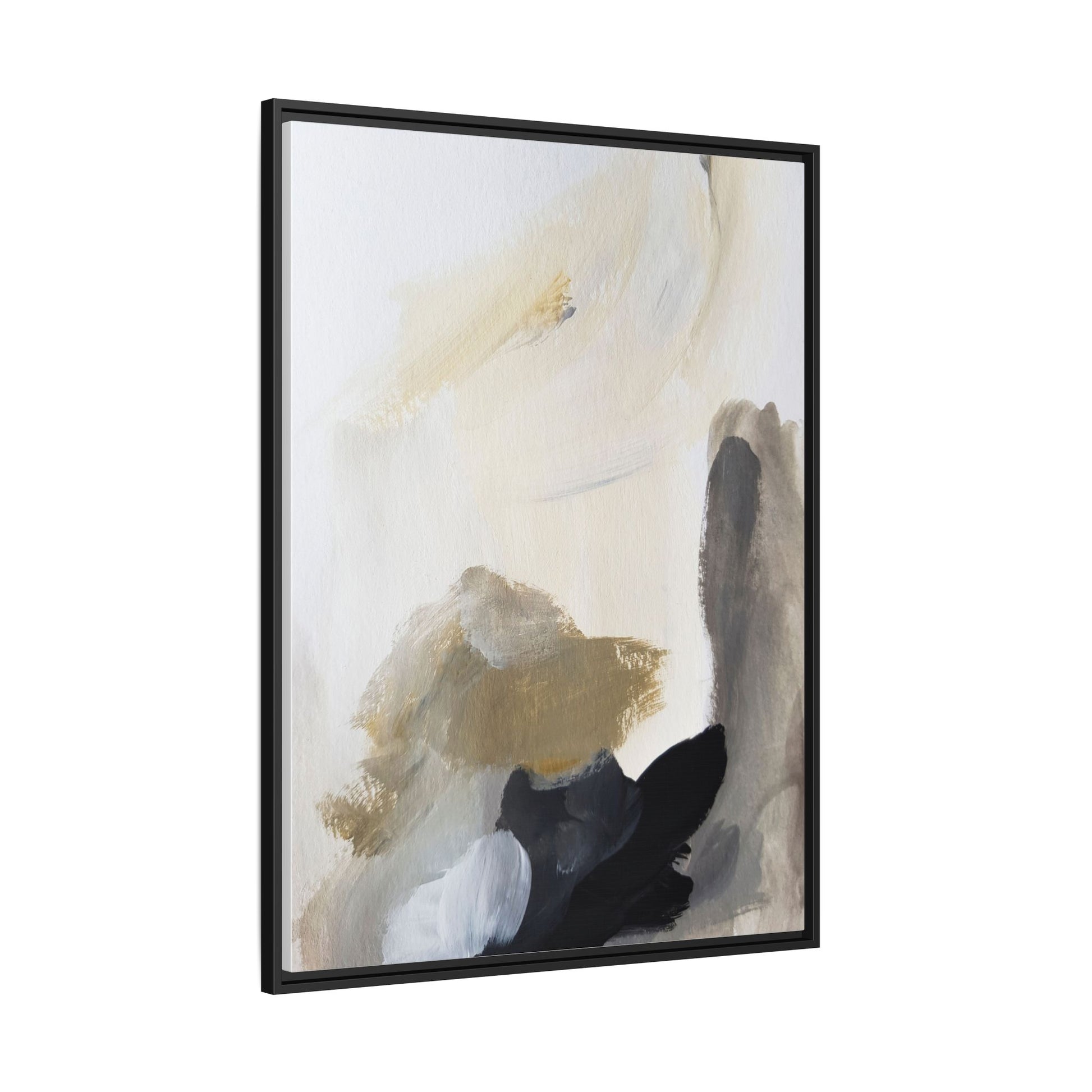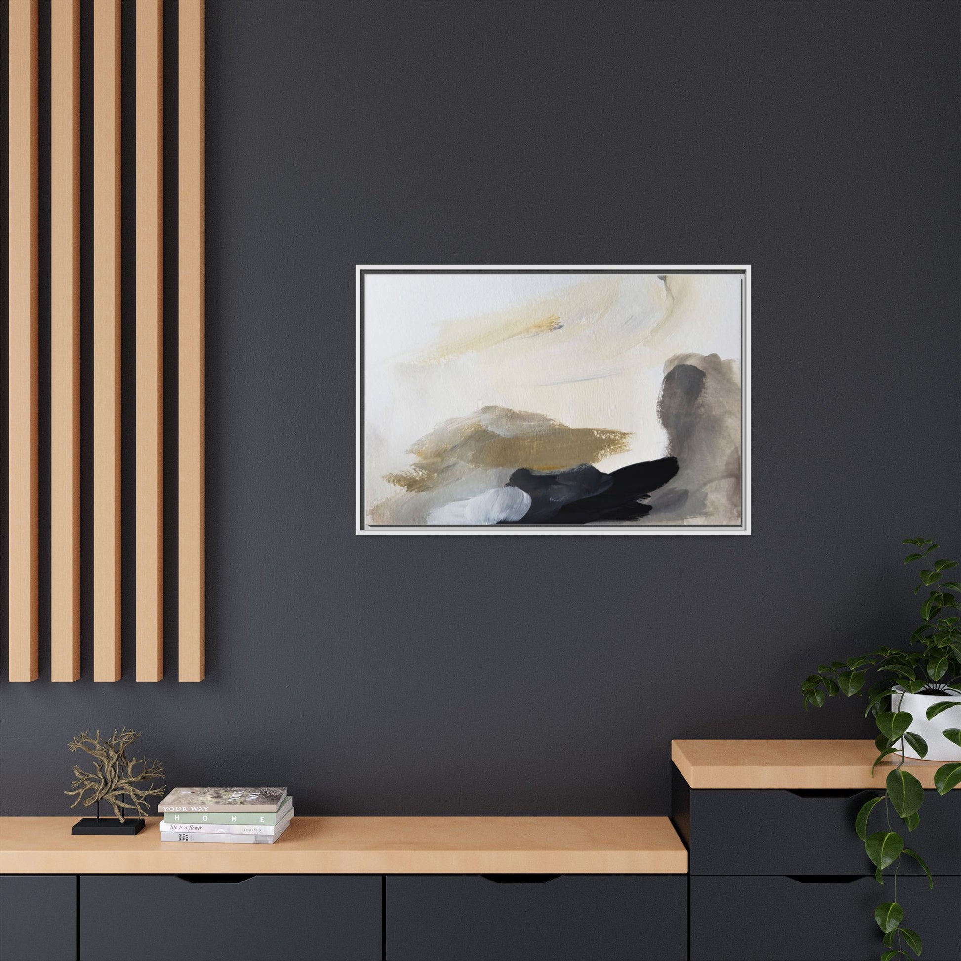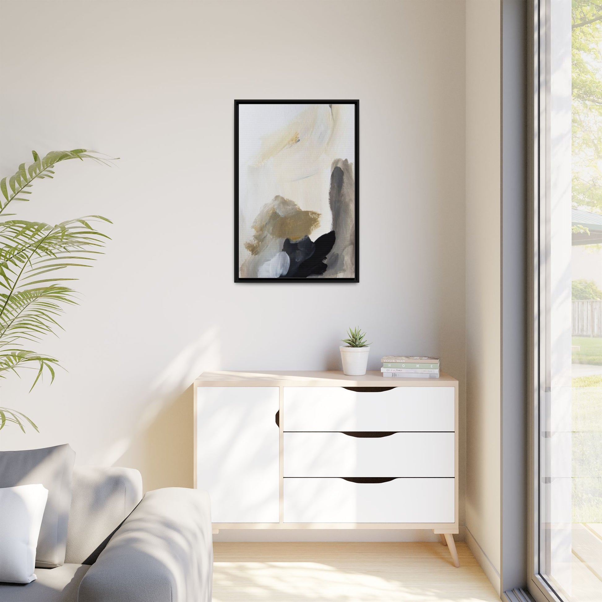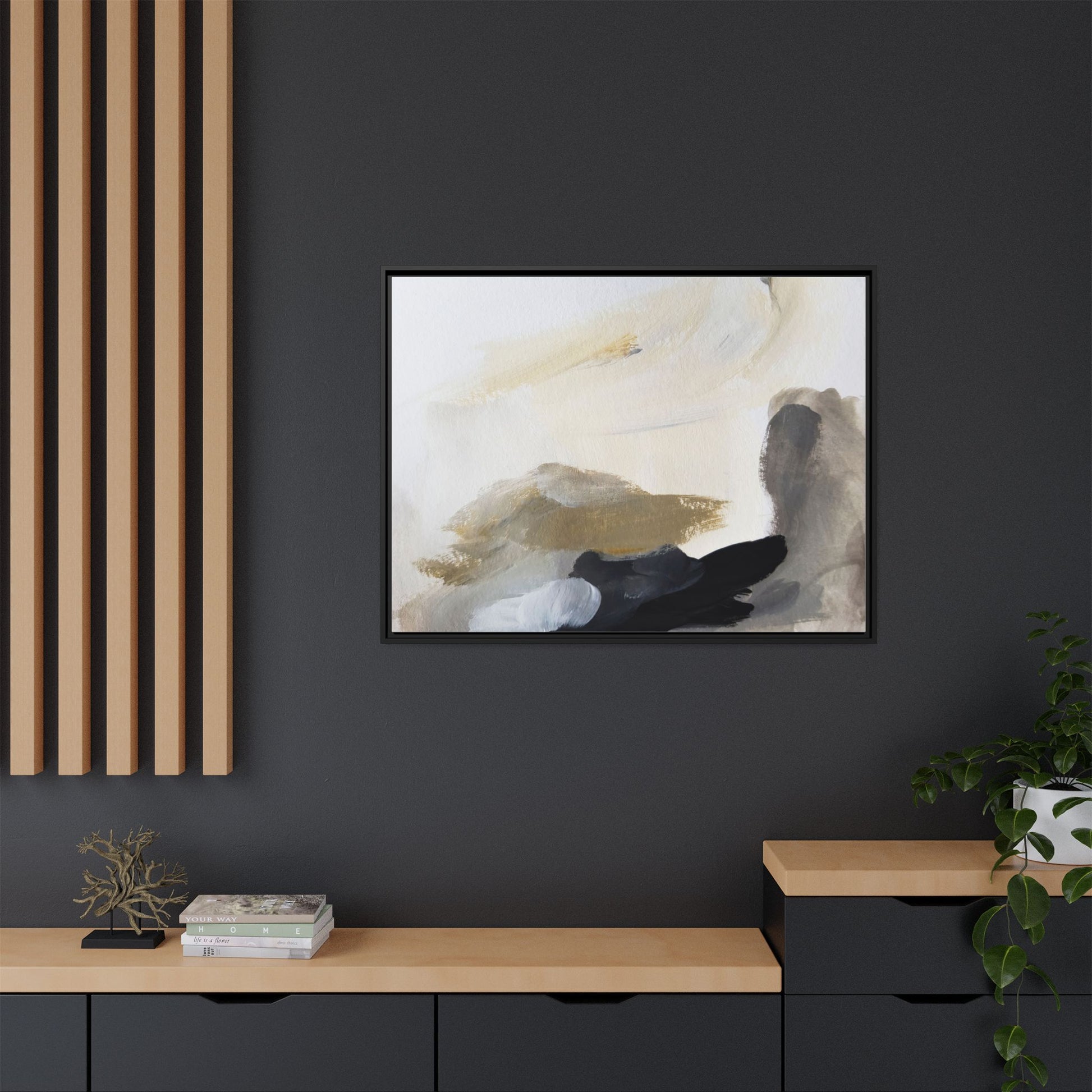 This abstract watercolor painting features a minimalist composition with soft, muted tones of white, beige, gray, and black. Delicate brushstrokes create organic, fluid shapes that seem to float and blend into one another across the canvas. The color palette is subdued and neutral, giving the artwork a sense of tranquility and subtle depth. Lighter areas with golden and cream-colored highlights contrast against darker charcoal and black elements, creating visual interest and movement. The painting's style suggests a contemplative, modern approach to abstract expressionism, with an emphasis on gentle transitions and ethereal forms.