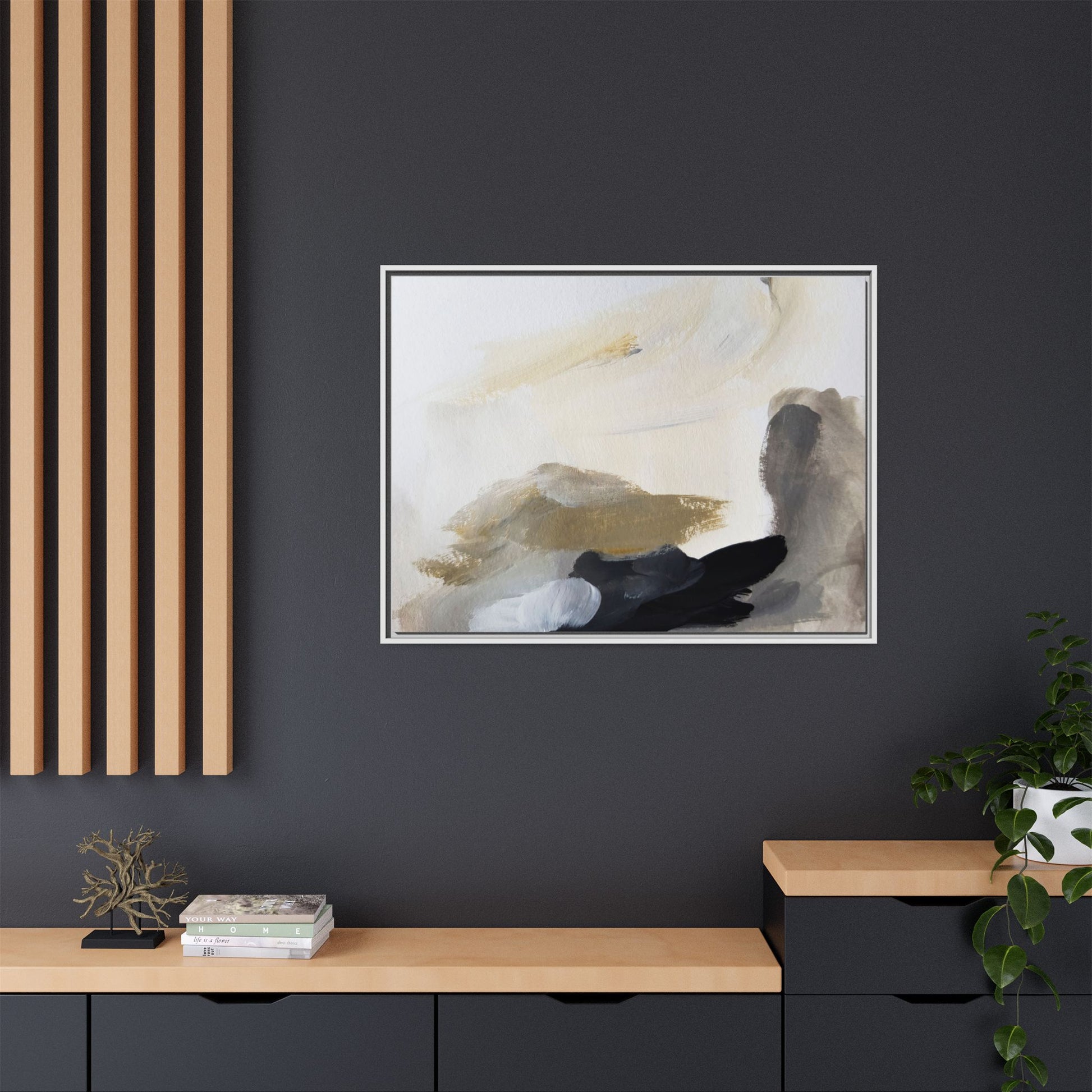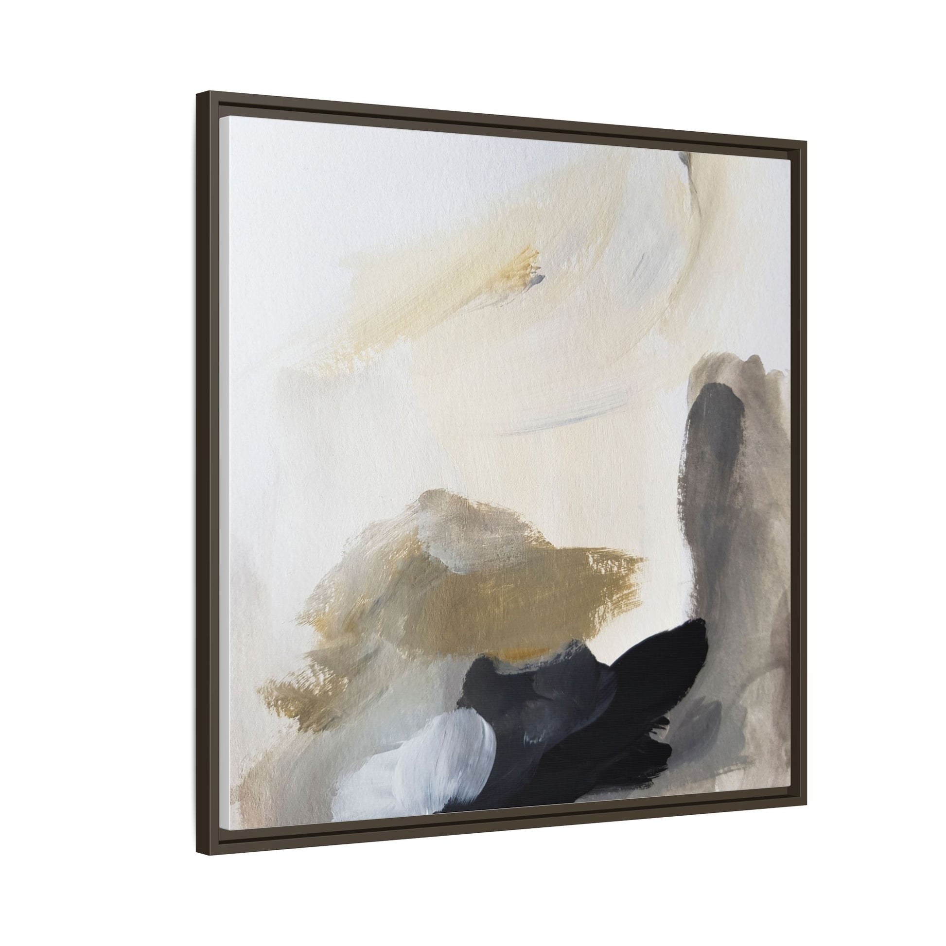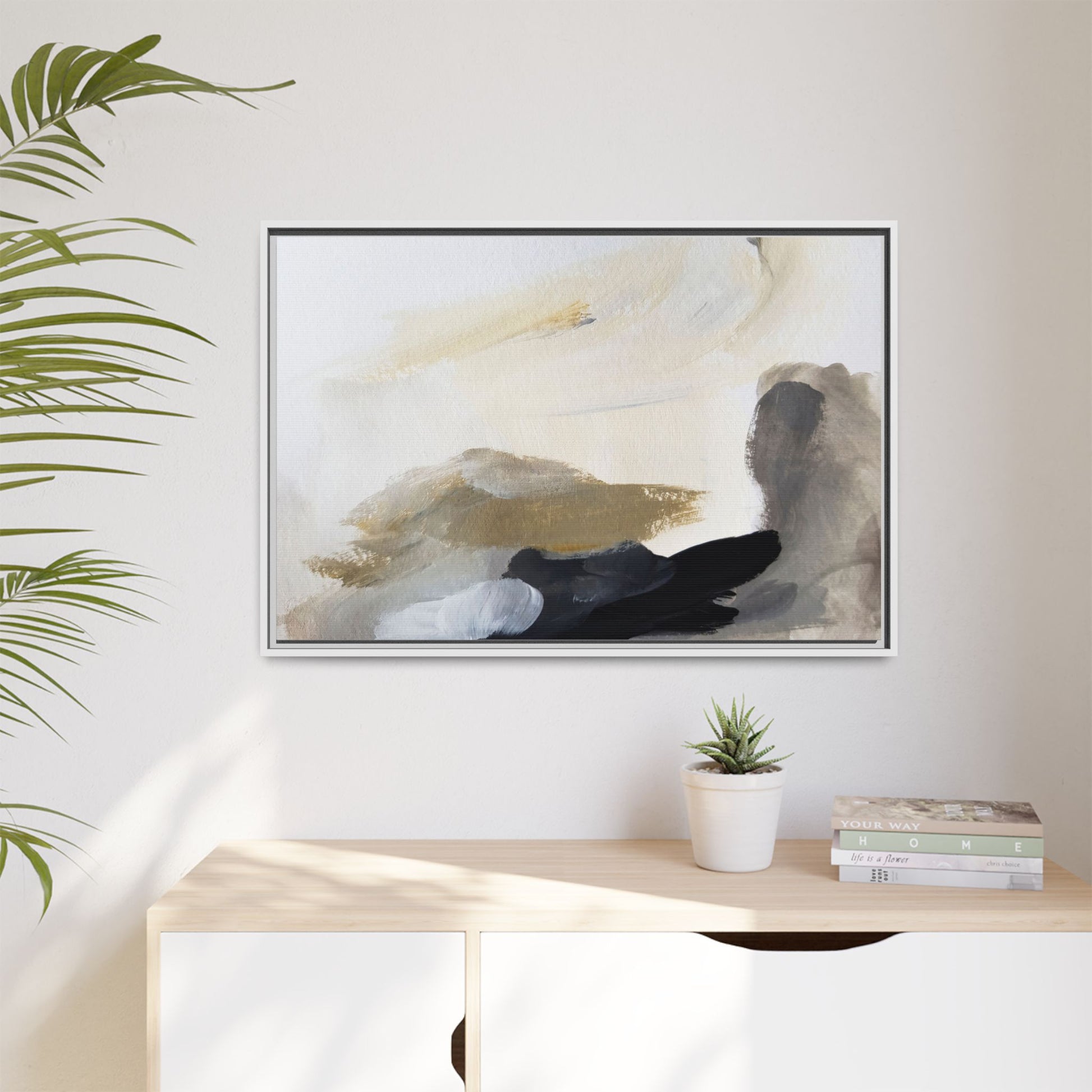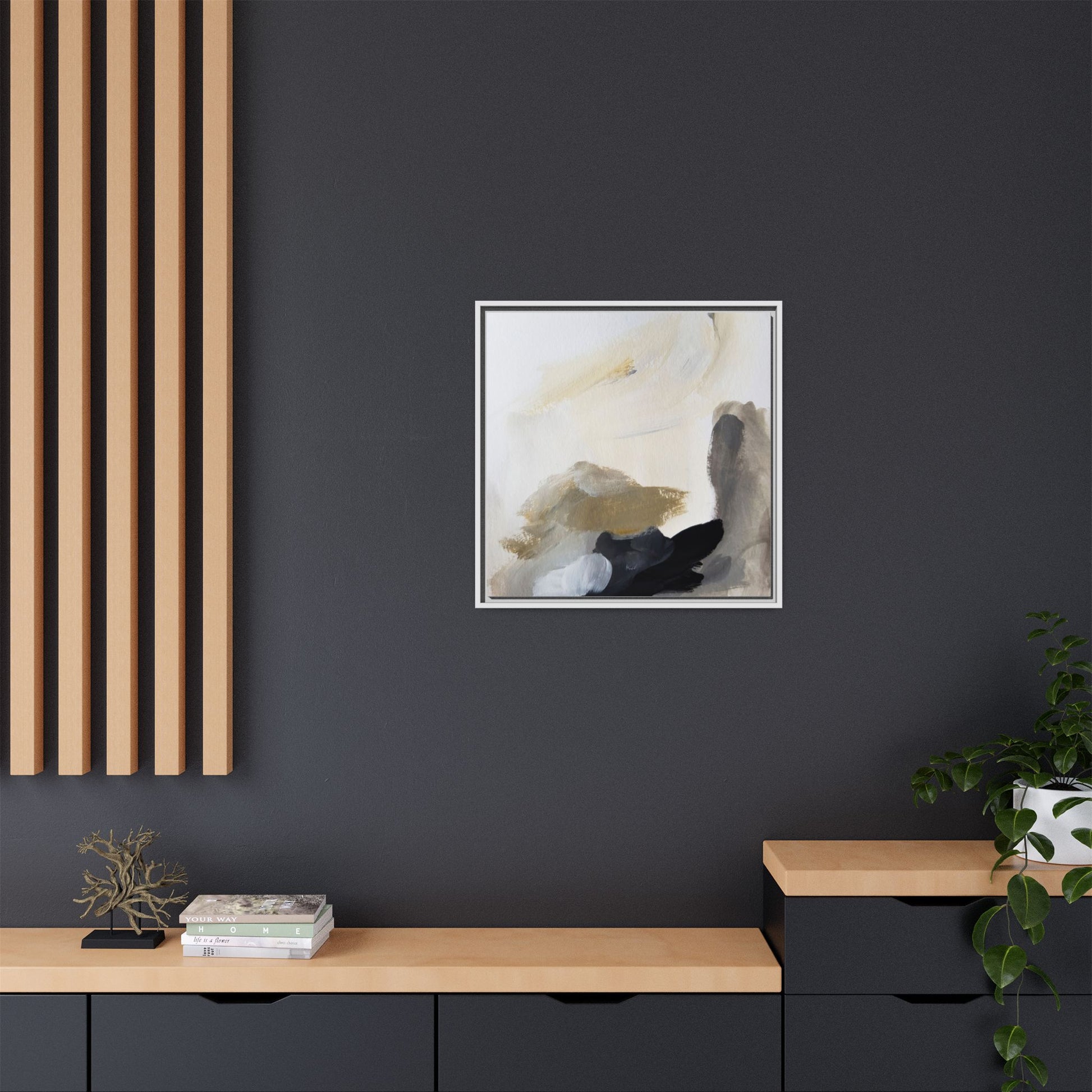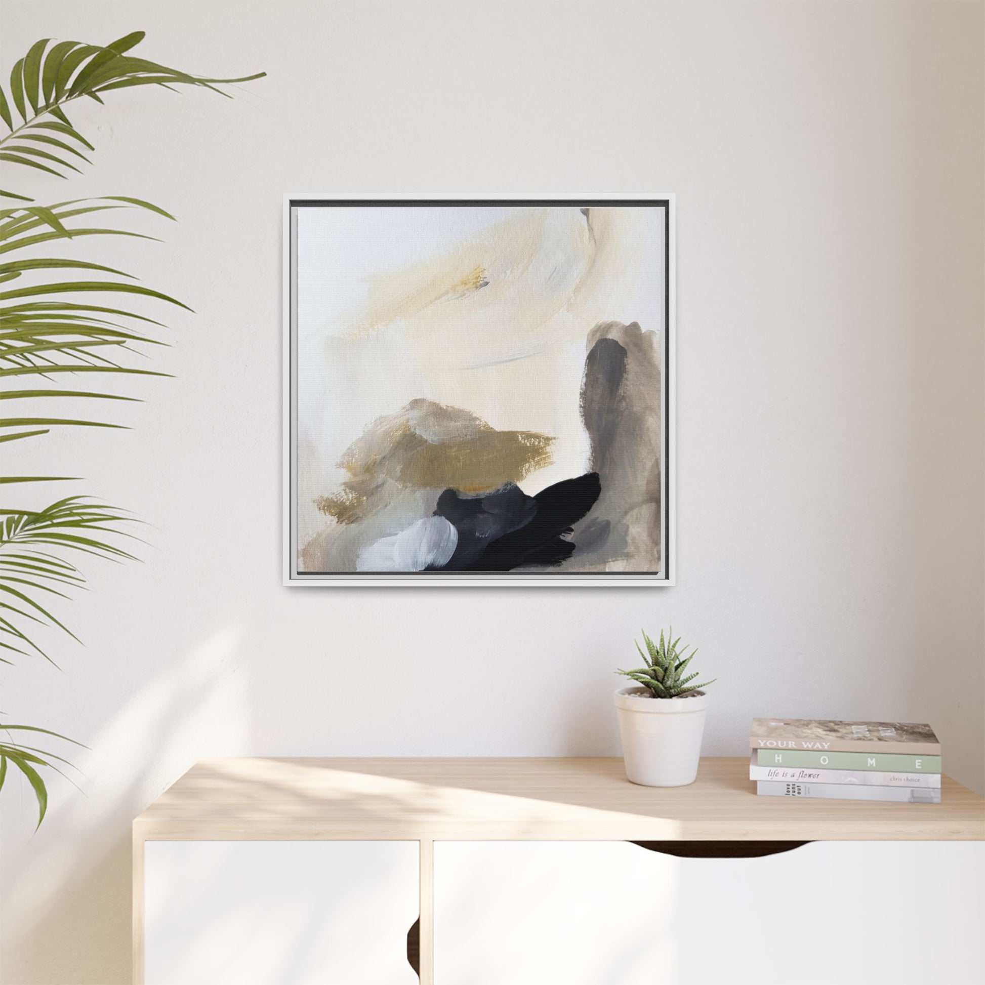 This abstract watercolor painting features a minimalist composition with soft, muted tones of white, beige, gray, and black. Delicate brushstrokes create organic, fluid shapes that seem to float and blend into one another across the canvas. The color palette is subdued and neutral, giving the artwork a sense of tranquility and subtle depth. Lighter areas with golden and cream-colored highlights contrast against darker charcoal and black elements, creating visual interest and movement. The painting's style suggests a contemplative, modern approach to abstract expressionism, with an emphasis on gentle transitions and ethereal forms.