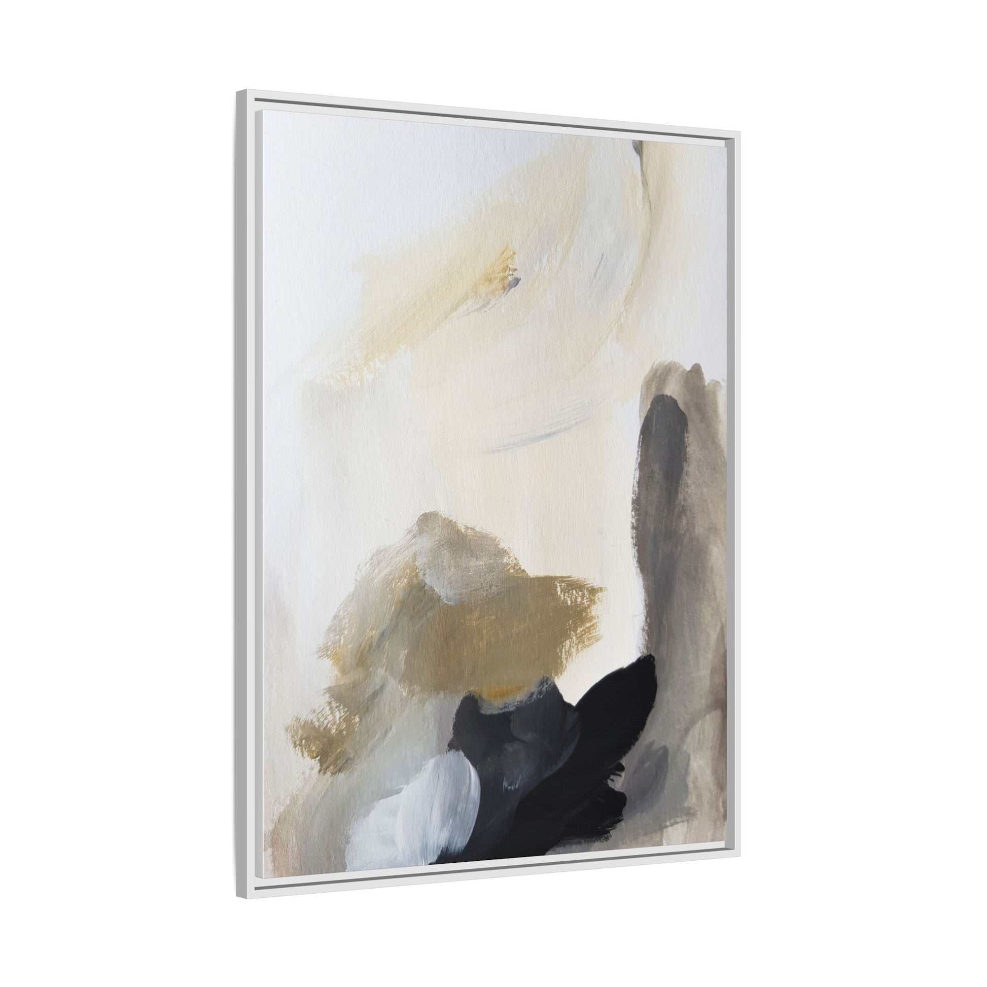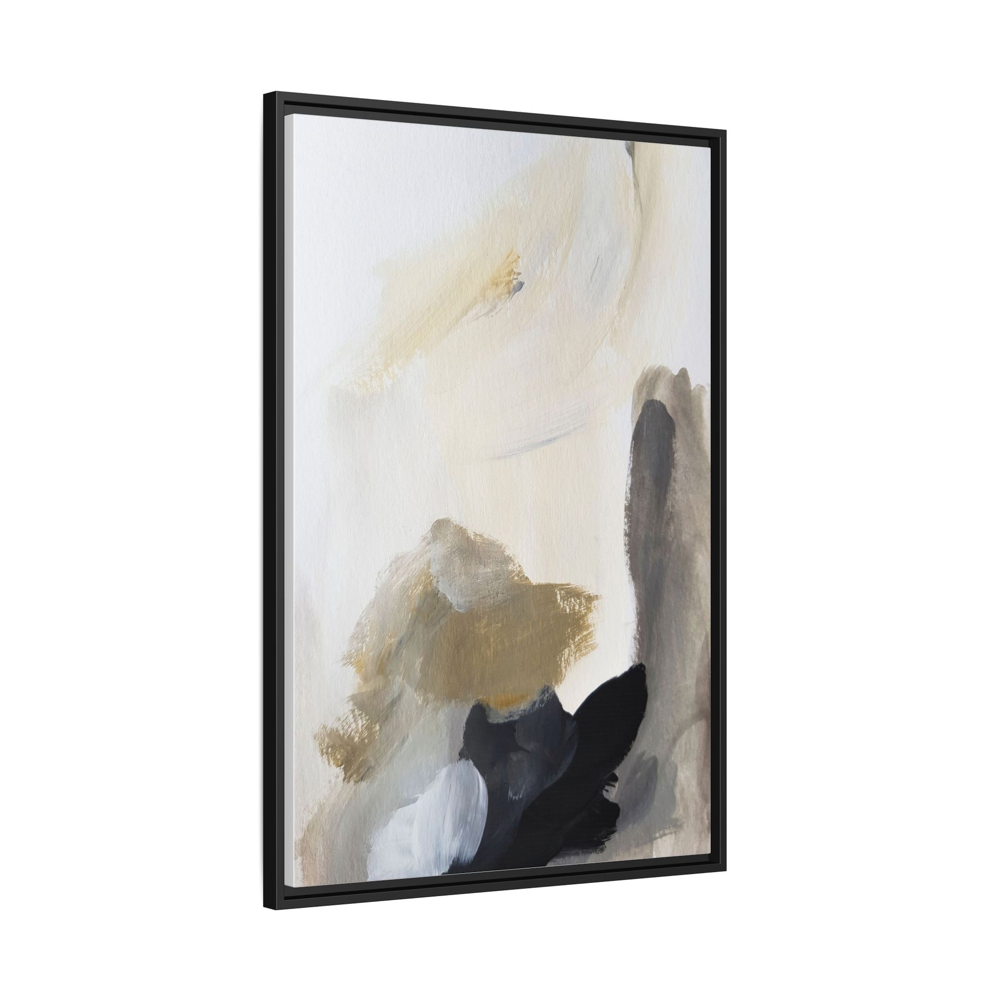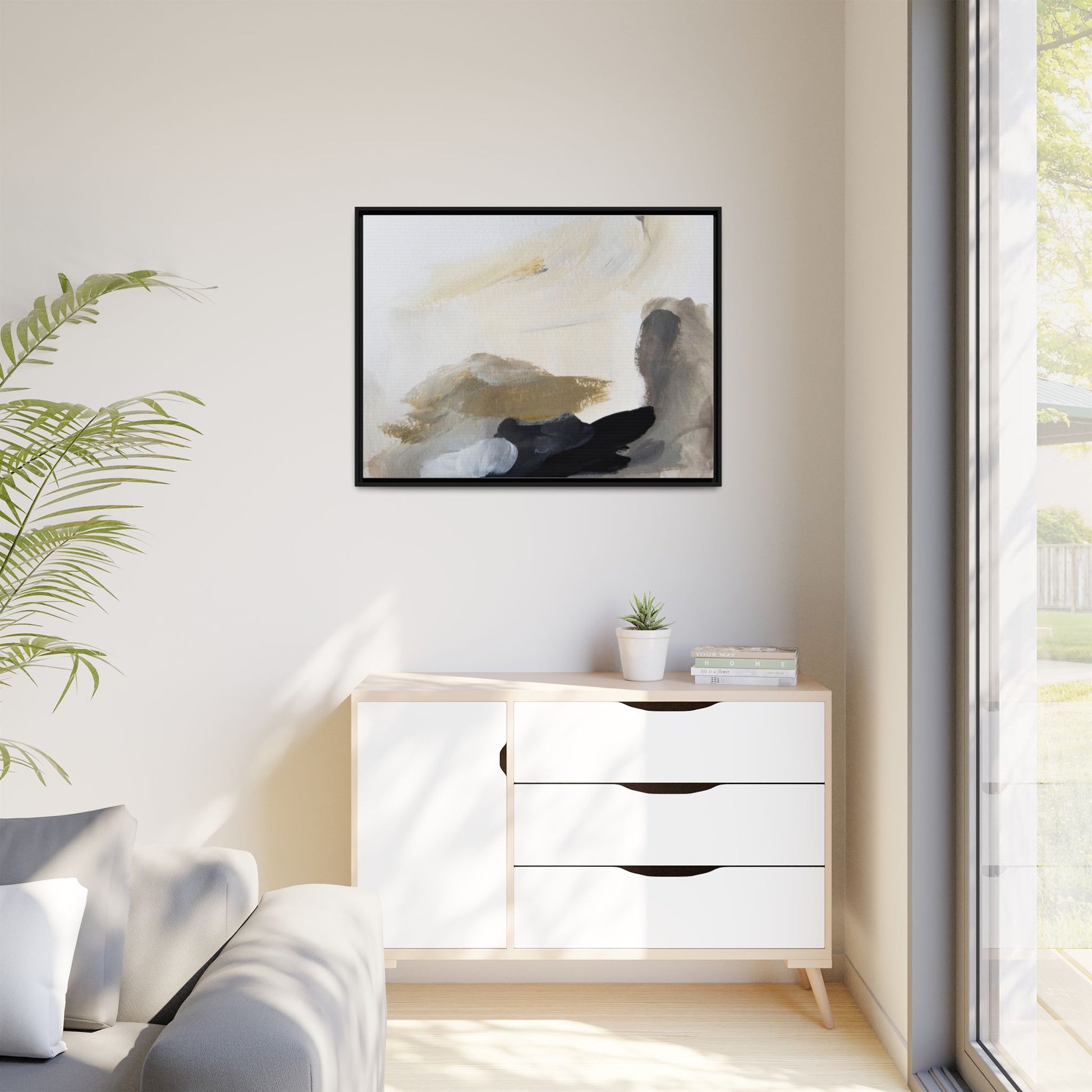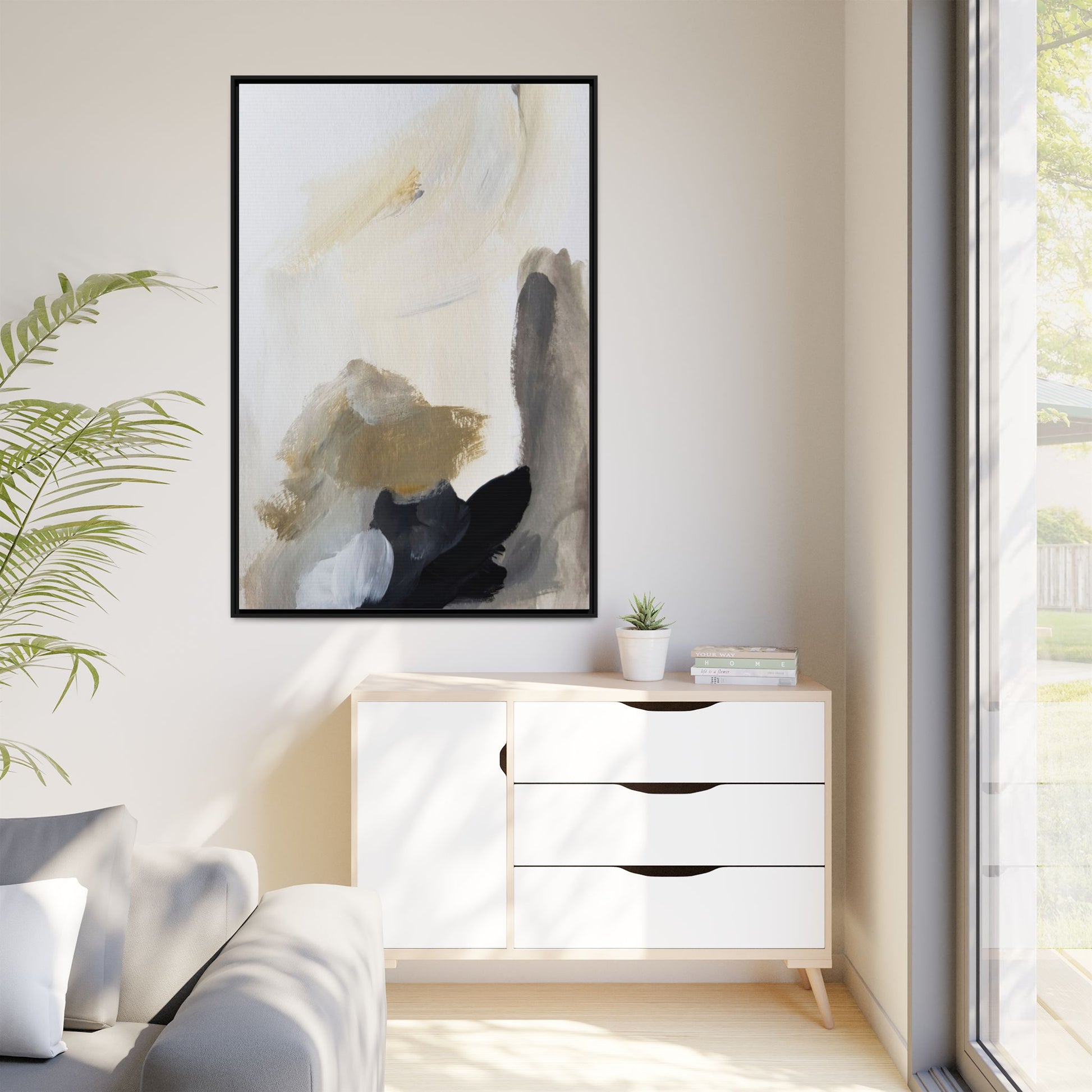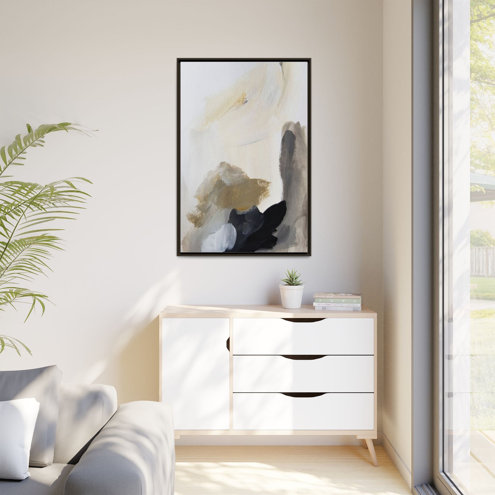 This abstract watercolor painting features a minimalist composition with soft, muted tones of white, beige, gray, and black. Delicate brushstrokes create organic, fluid shapes that seem to float and blend into one another across the canvas. The color palette is subdued and neutral, giving the artwork a sense of tranquility and subtle depth. Lighter areas with golden and cream-colored highlights contrast against darker charcoal and black elements, creating visual interest and movement. The painting's style suggests a contemplative, modern approach to abstract expressionism, with an emphasis on gentle transitions and ethereal forms.