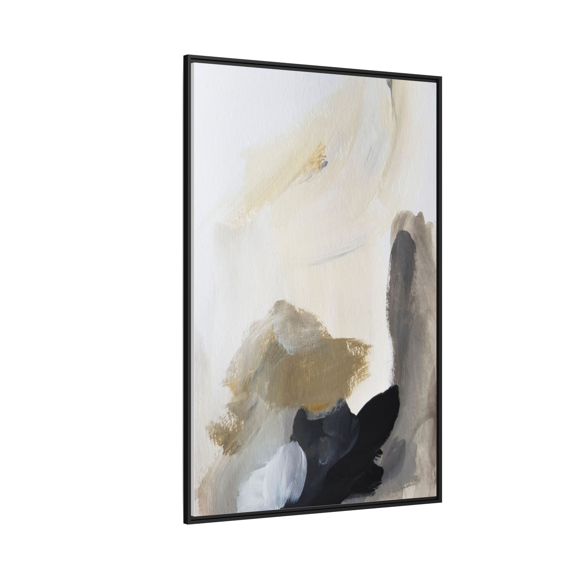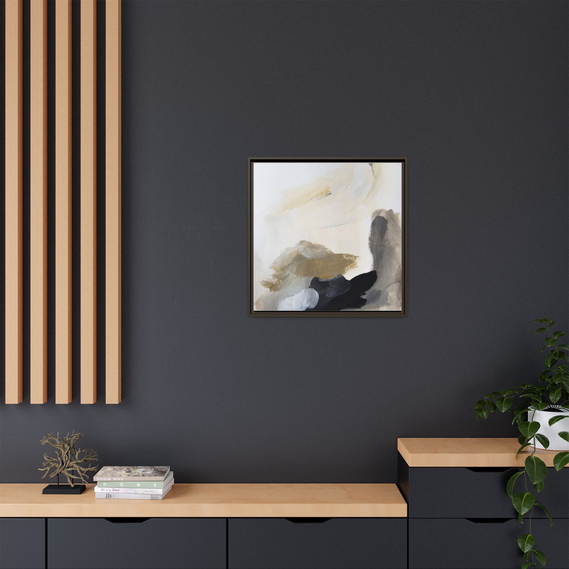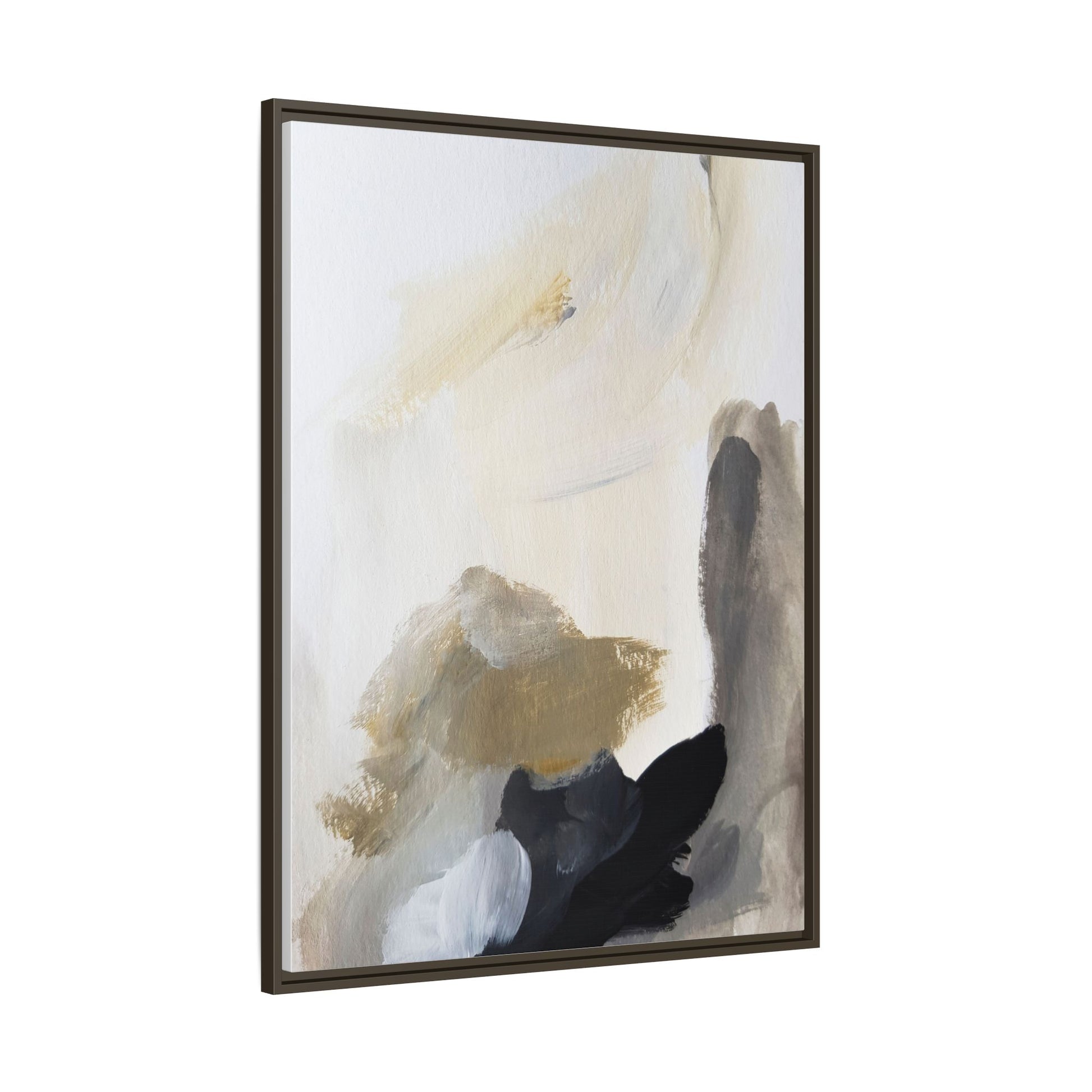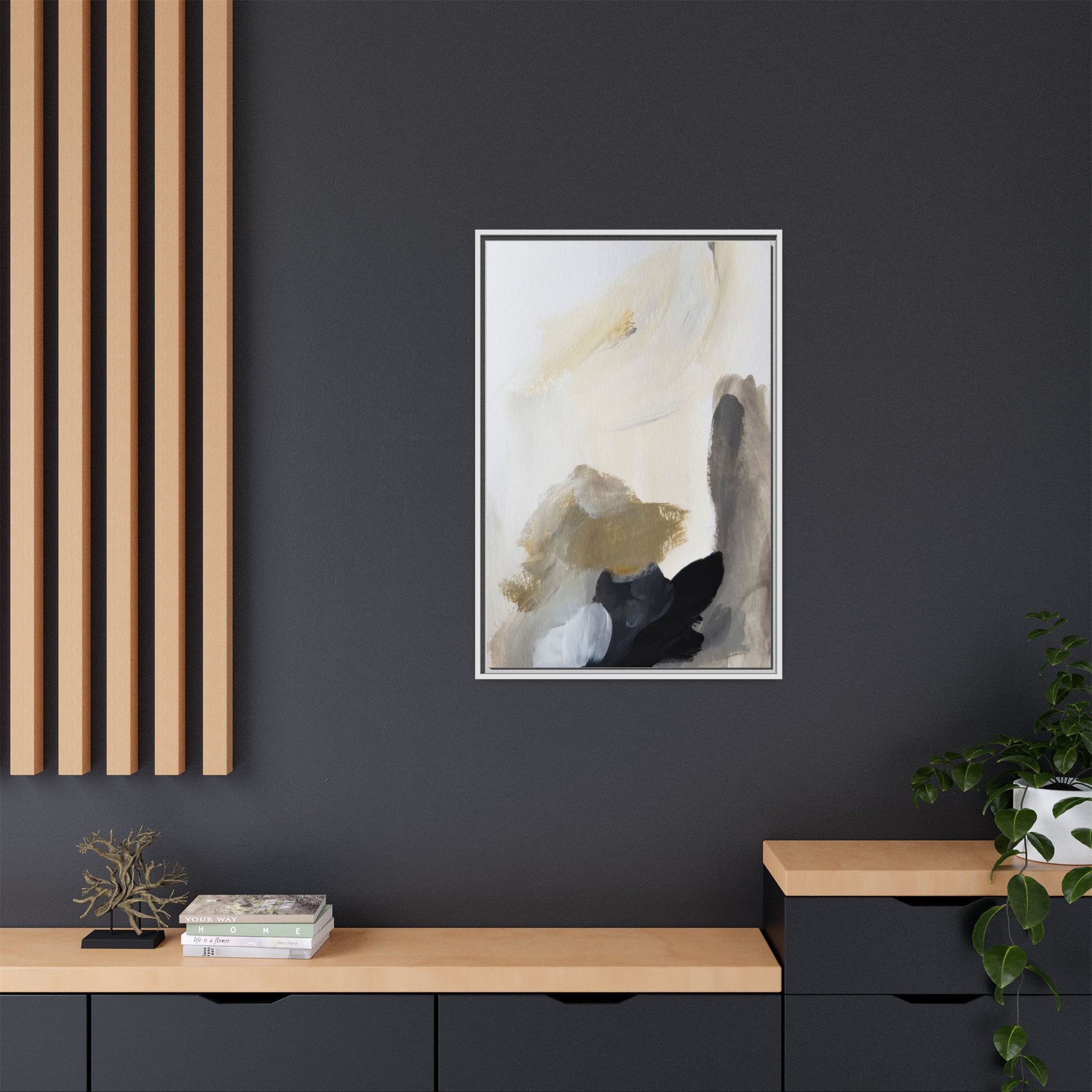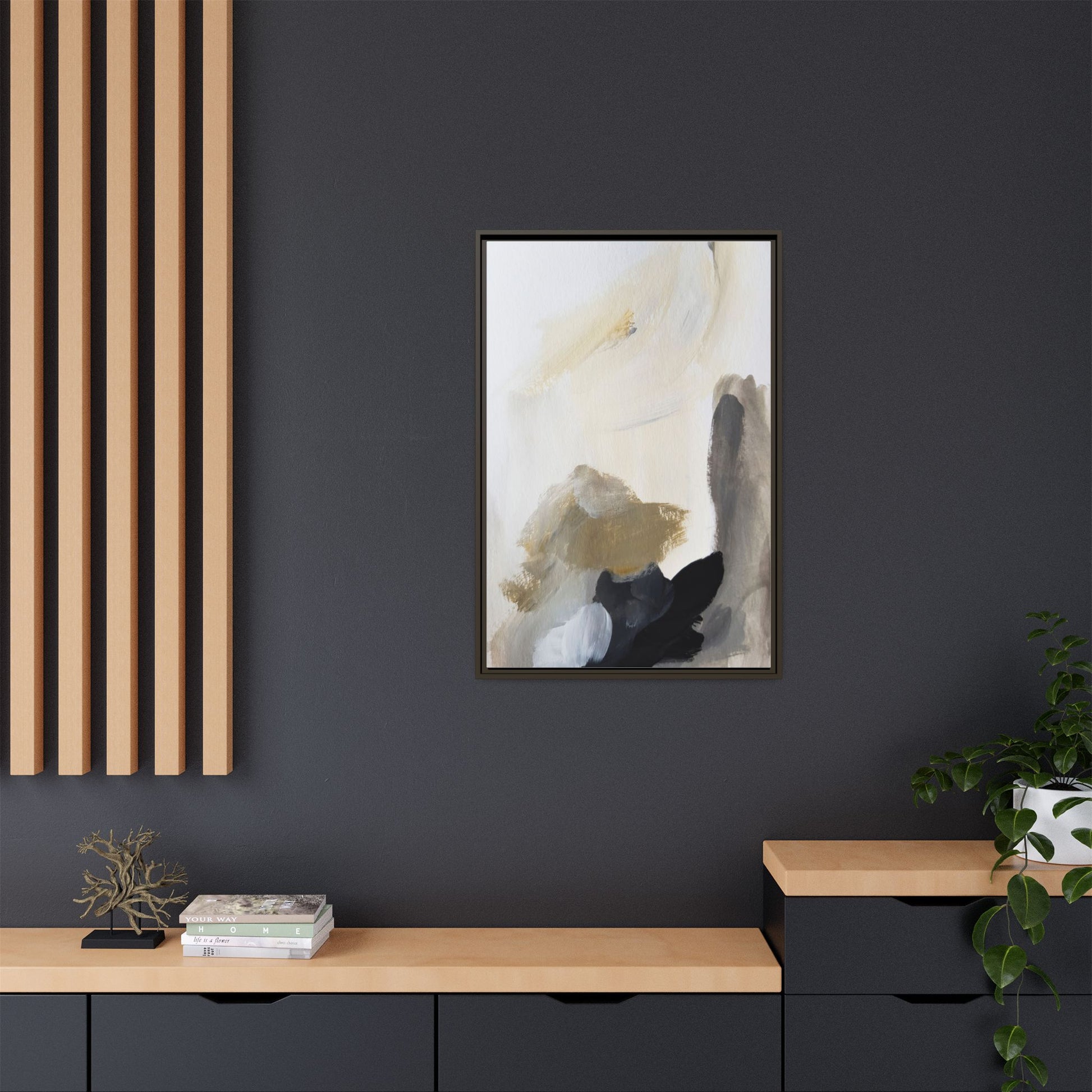 This abstract watercolor painting features a minimalist composition with soft, muted tones of white, beige, gray, and black. Delicate brushstrokes create organic, fluid shapes that seem to float and blend into one another across the canvas. The color palette is subdued and neutral, giving the artwork a sense of tranquility and subtle depth. Lighter areas with golden and cream-colored highlights contrast against darker charcoal and black elements, creating visual interest and movement. The painting's style suggests a contemplative, modern approach to abstract expressionism, with an emphasis on gentle transitions and ethereal forms.