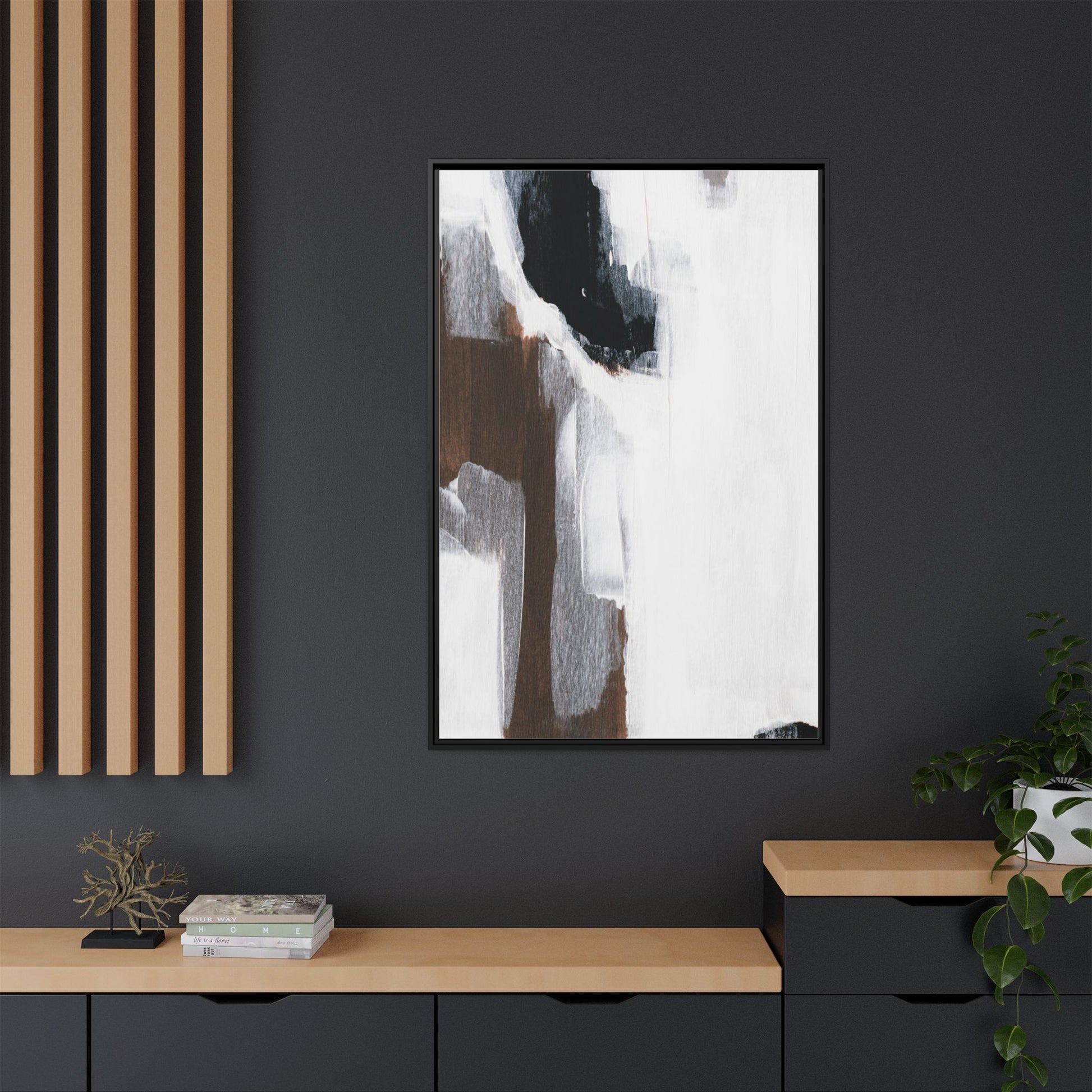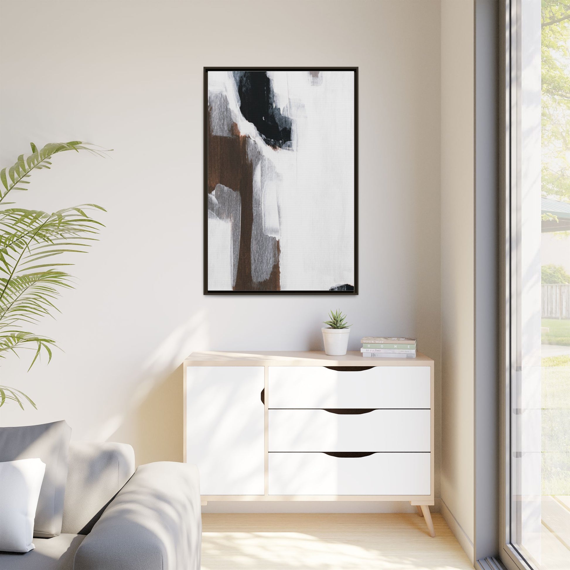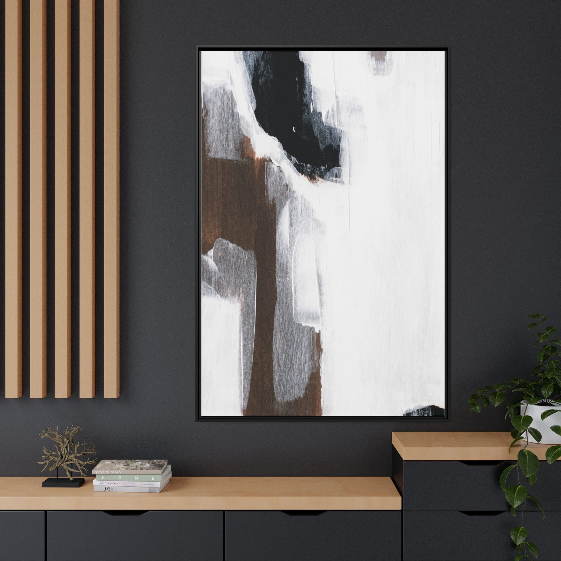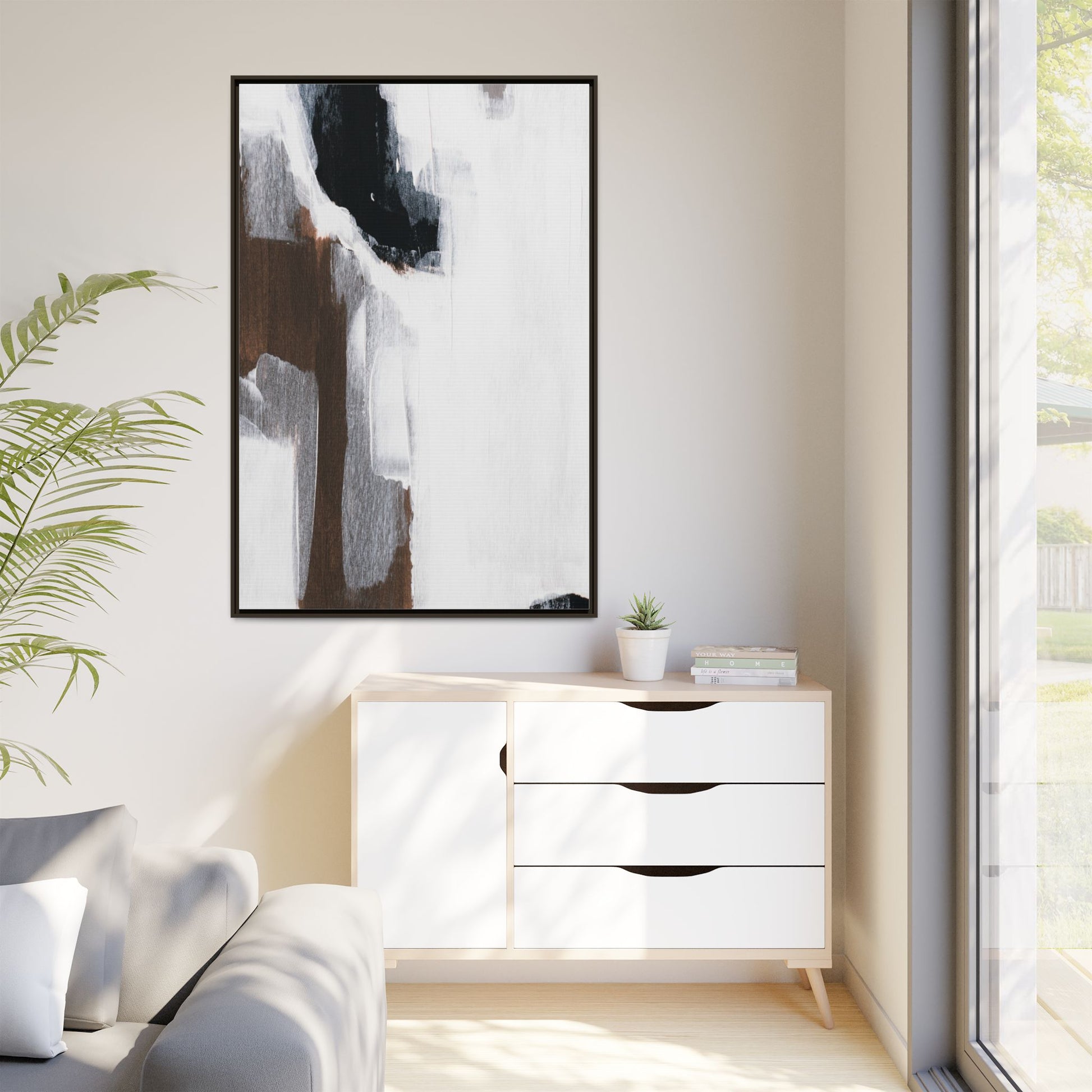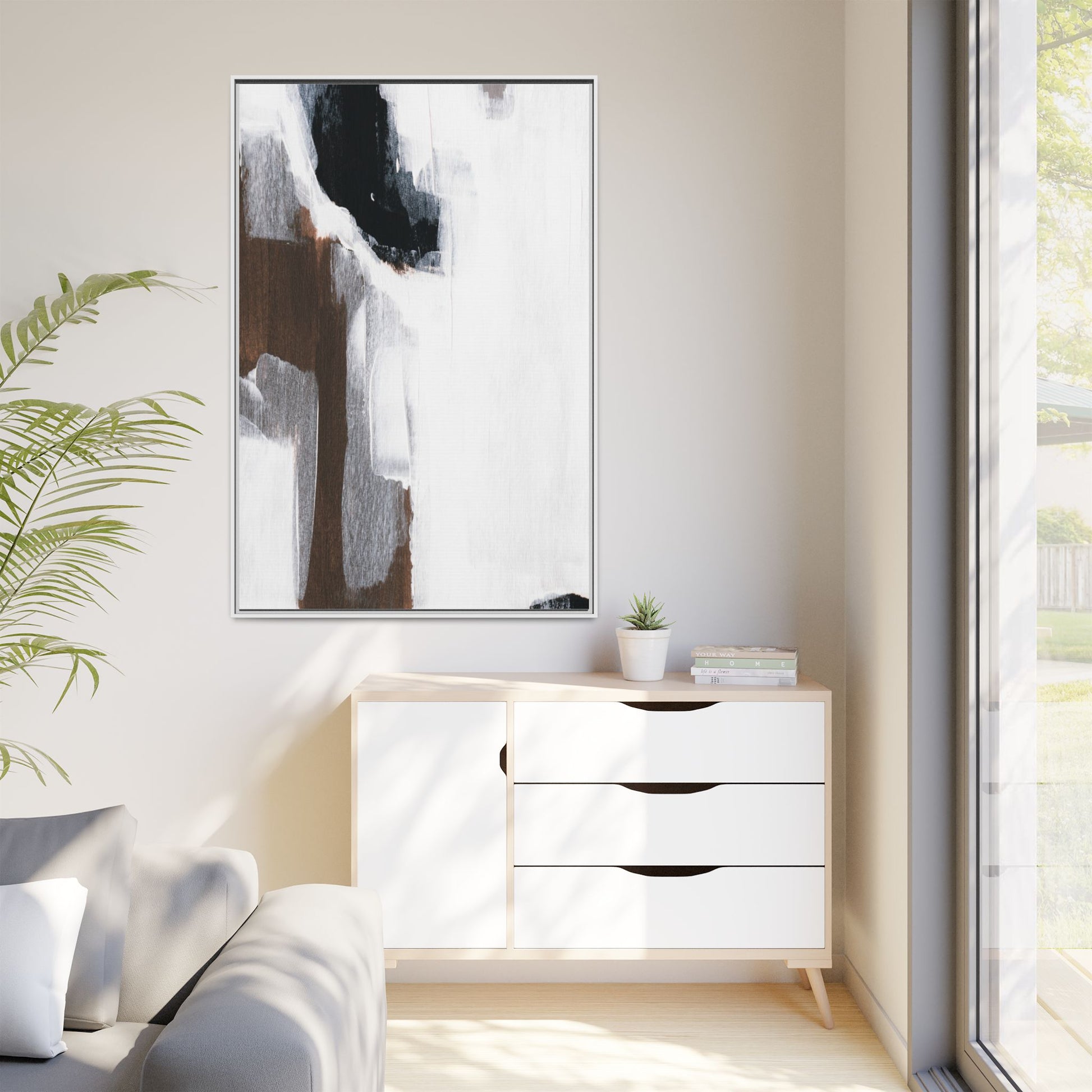 This captivating abstract artwork showcases a minimalist composition featuring a harmonious blend of neutral tones and organic shapes. The image is dominated by soft whites, muted grays, and rich brown hues, creating a sense of depth and visual intrigue. Textured brushstrokes and watercolor-like techniques give the piece a fluid, almost ethereal quality, with layered elements that seem to blend and overlap. A striking black vertical element cuts through the composition, providing a bold contrast against the softer surrounding colors and forms. The painting evokes a sense of tranquility and balance, inviting viewers to explore its subtle nuances and interpretive landscape of shapes.