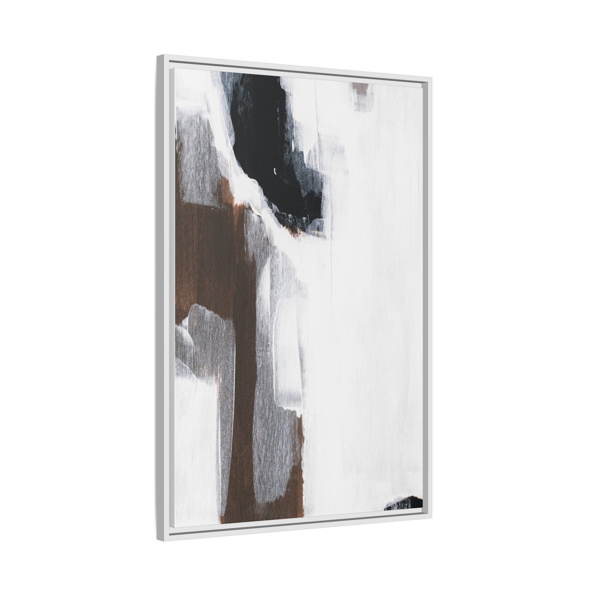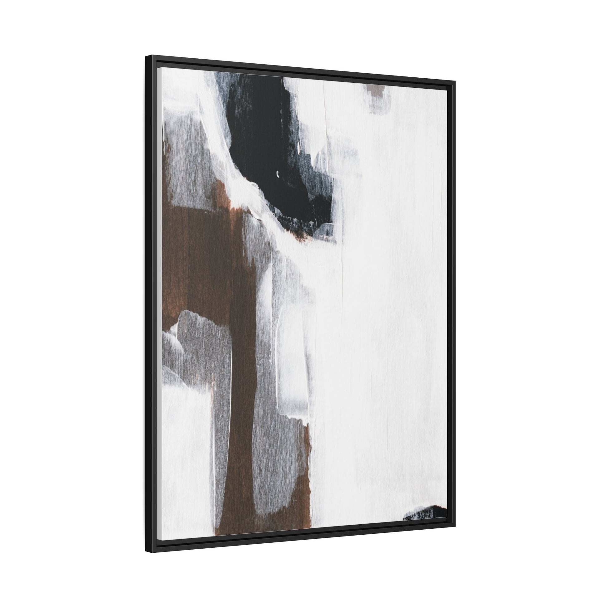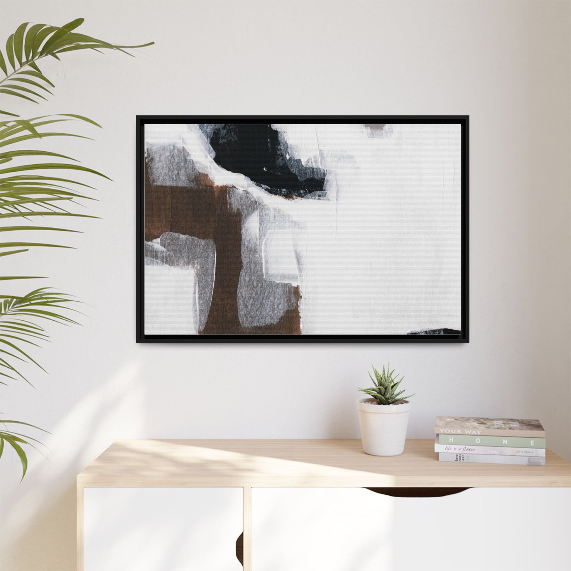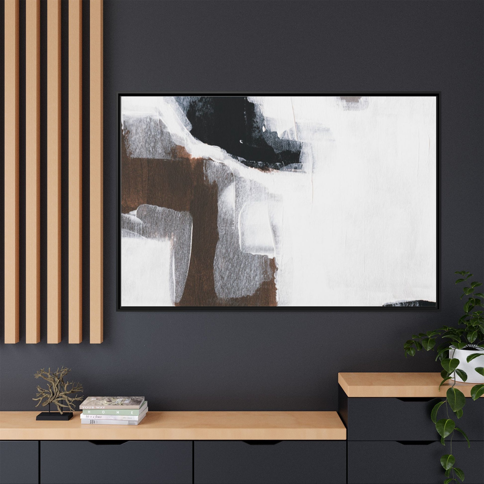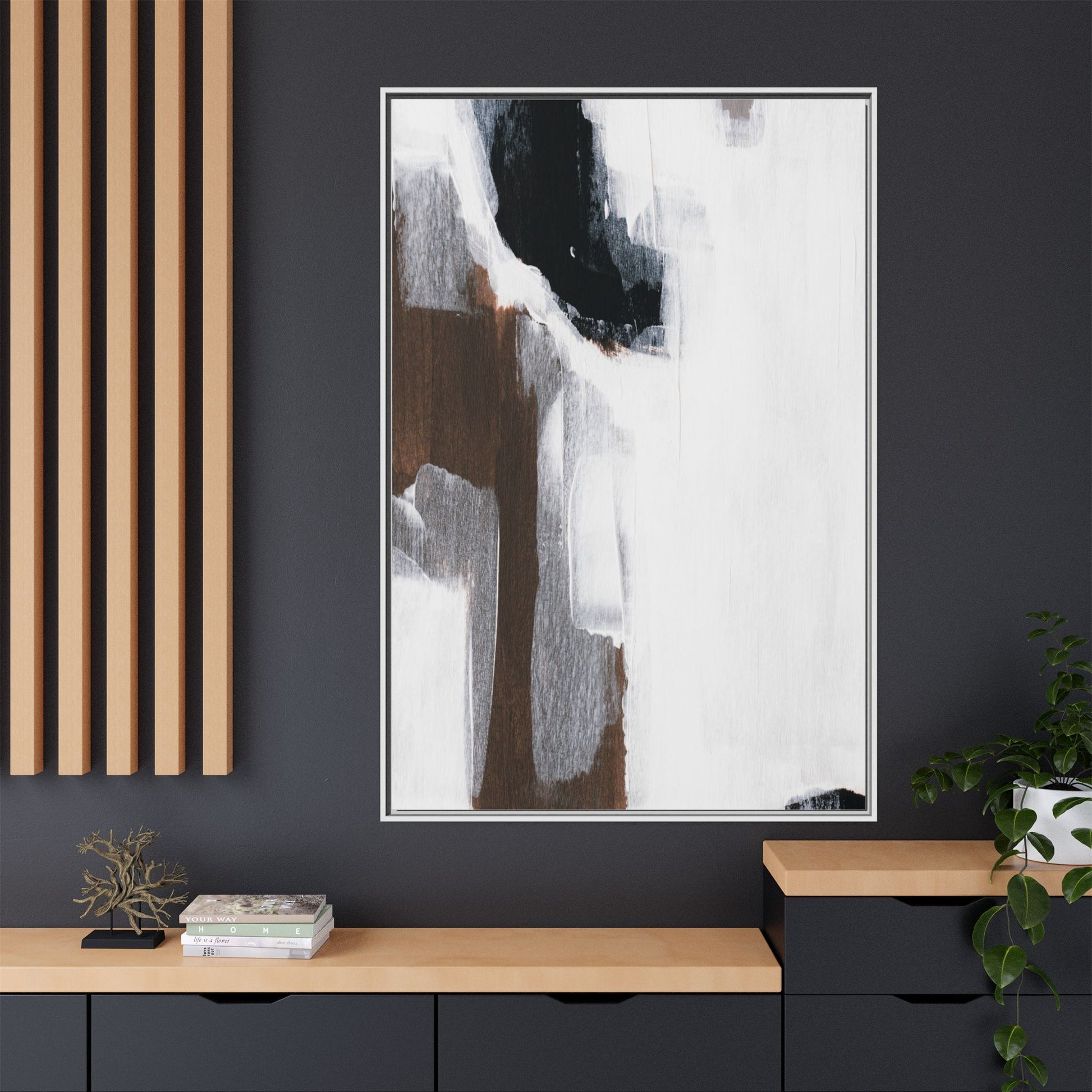 This captivating abstract artwork showcases a minimalist composition featuring a harmonious blend of neutral tones and organic shapes. The image is dominated by soft whites, muted grays, and rich brown hues, creating a sense of depth and visual intrigue. Textured brushstrokes and watercolor-like techniques give the piece a fluid, almost ethereal quality, with layered elements that seem to blend and overlap. A striking black vertical element cuts through the composition, providing a bold contrast against the softer surrounding colors and forms. The painting evokes a sense of tranquility and balance, inviting viewers to explore its subtle nuances and interpretive landscape of shapes.